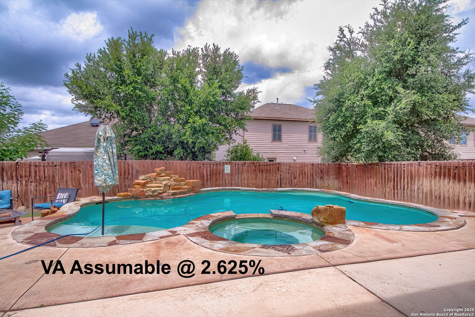 VA ASSUMABLE LOAN @ 2.625** Welcome to this spacious 5-bedroom, 3.5-bath home designed for comfort and entertaining! The downstairs primary suite features a large walk-in closet, double vanity and separate tub and shower. Upstairs, you'll find a generous game room, four additional spacious bedrooms, and two full baths-perfect for family and guests. Step outside to your private backyard oasis complete with a custom spa, sparkling pool, and stunning waterfall-ideal for outdoor living year-round. The island kitchen has granite countertops and upgraded pull-out cabinets. Solar screens and solar panels for added efficiency. Located in the highly desirable Mission Del Lago community, enjoy access to walking trails, parks, playground, clubhouse, pool, and golf course amenities. Don't miss out on this energy-efficient home with resort-style outdoor living!
