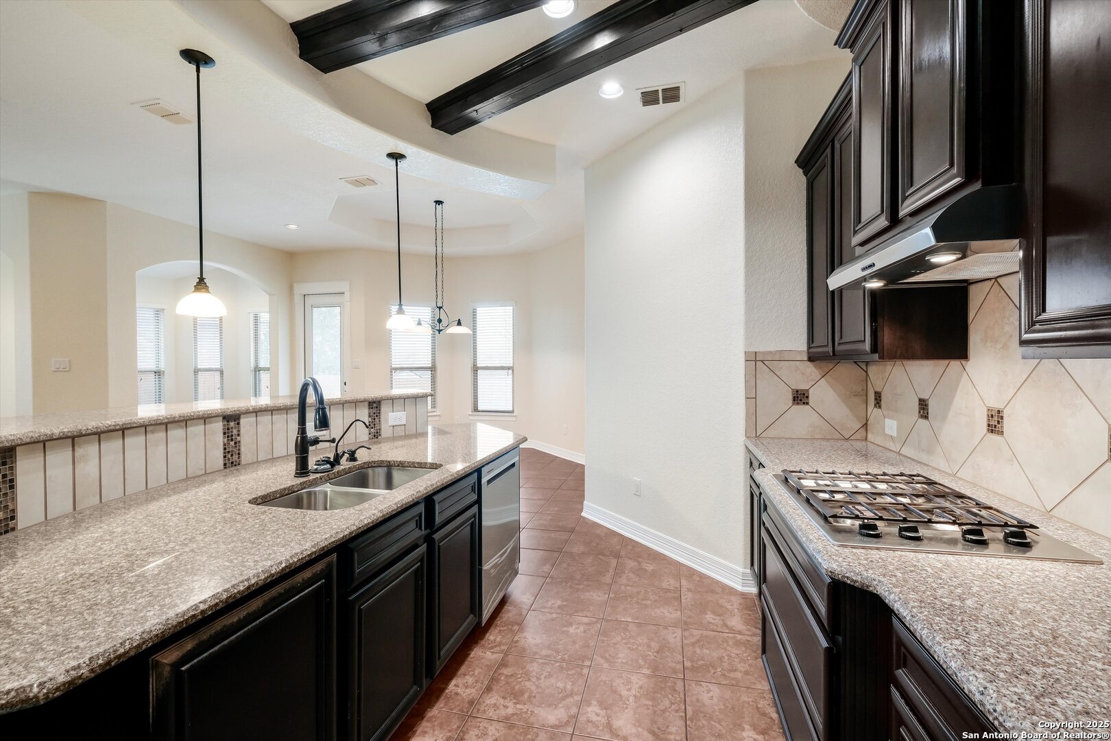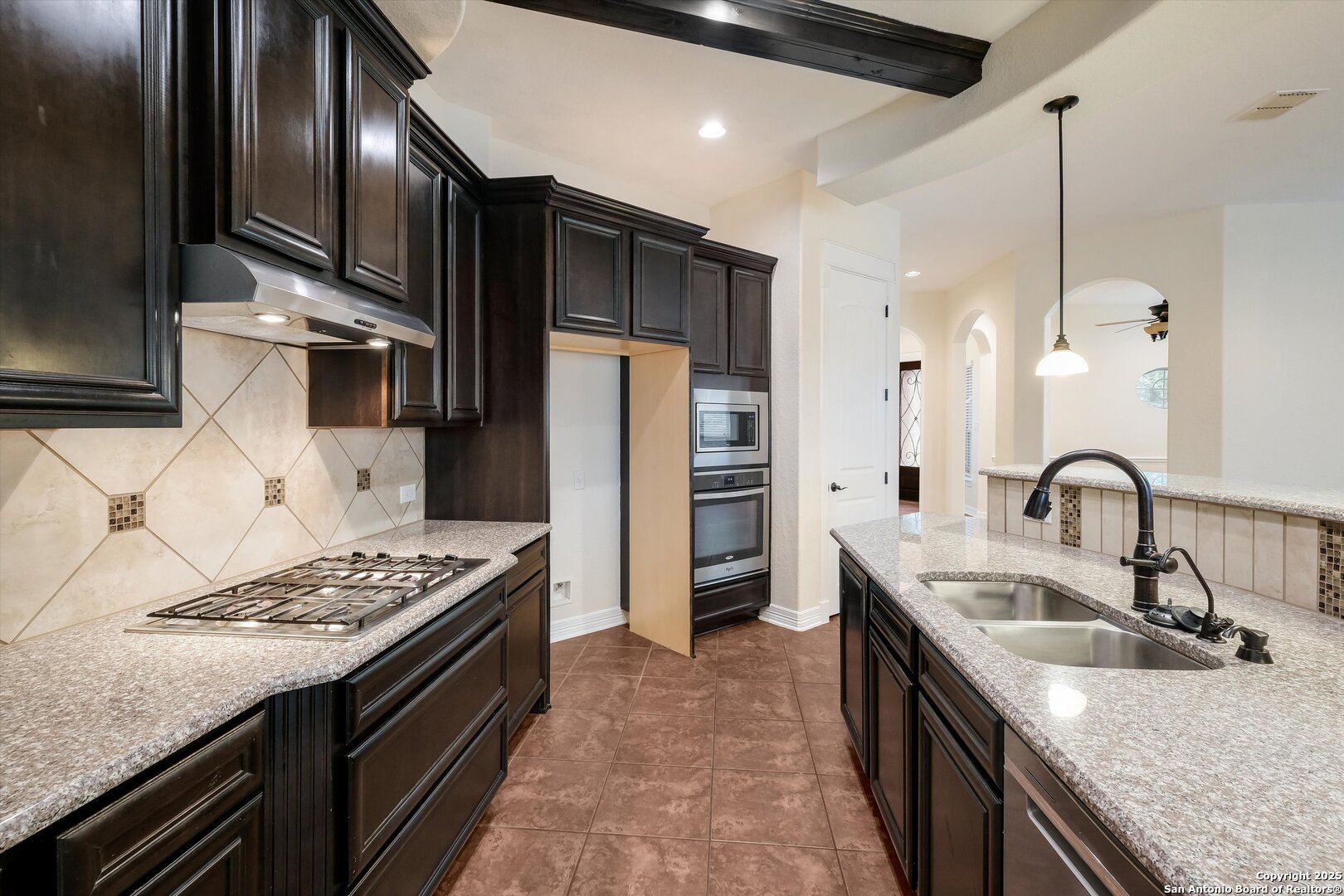 WOW! Highly sought-after single-story home in West Pointe Gardens, offering timeless finishes and thoughtful design throughout. This well-appointed 3-bedroom, 2-bath residence features rich tile flooring across the main living areas and a bright, open layout ideal for both everyday living and entertaining. The chef-inspired kitchen showcases dark custom cabinetry, granite countertops, stainless steel appliances, a gas cooktop, built-in oven and microwave, decorative tile backsplash, and a spacious island with additional seating. The private primary suite is a true retreat, highlighted by a luxurious oversized walk-in shower with floor-to-ceiling tile, built-in bench seating, glass block accents, and dual vanities with ample counter space and storage. Architectural arches, tray ceilings, and abundant natural light add character and warmth throughout the home. Enjoy outdoor living on the covered patio, perfect for relaxing or entertaining. Conveniently located minutes from Lackland Air Force Base, Alamo Ranch, and Fort Sam Houston-this home offers comfort, style, and an excellent location. Schedule your tour today!