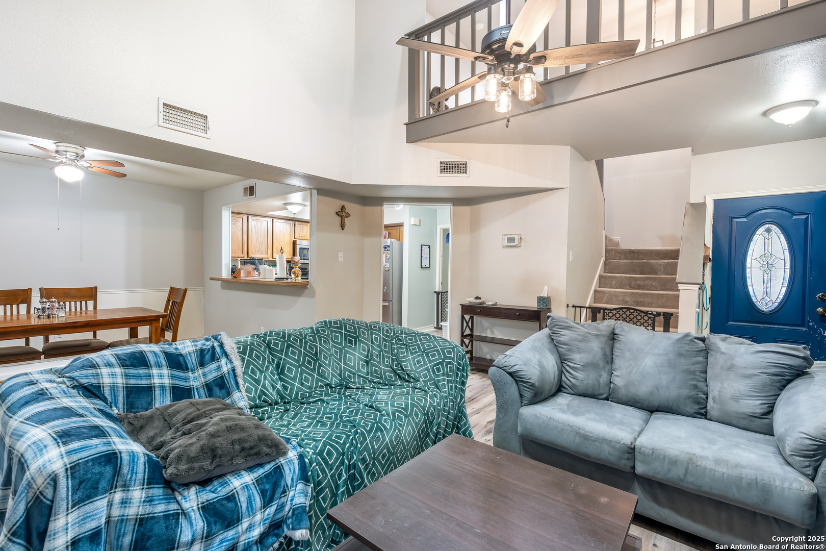Welcome to this beautiful, move in ready two story home tucked away at the end of a private cul-de-sac, just minutes from Lackland AFB. Step inside to an inviting open floor plan featuring vaulted ceilings, a cozy fireplace, upgraded flooring, and a spacious living and dining area perfect for gatherings. The kitchen offers ample counter space, stainless steel appliances, and an open layout ideal for everyday living and entertaining. Upstairs you'll find 3 bedrooms and a versatile loft. The converted garage provides additional flexibility to accommodate your lifestyle needs. Enjoy a spacious backyard designed for outdoor living, relaxation, and entertaining. Conveniently located near shopping centers, restaurants, and major conveniences, this home offers the perfect blend of comfort and accessibility. Don't miss your chance to make it yours!