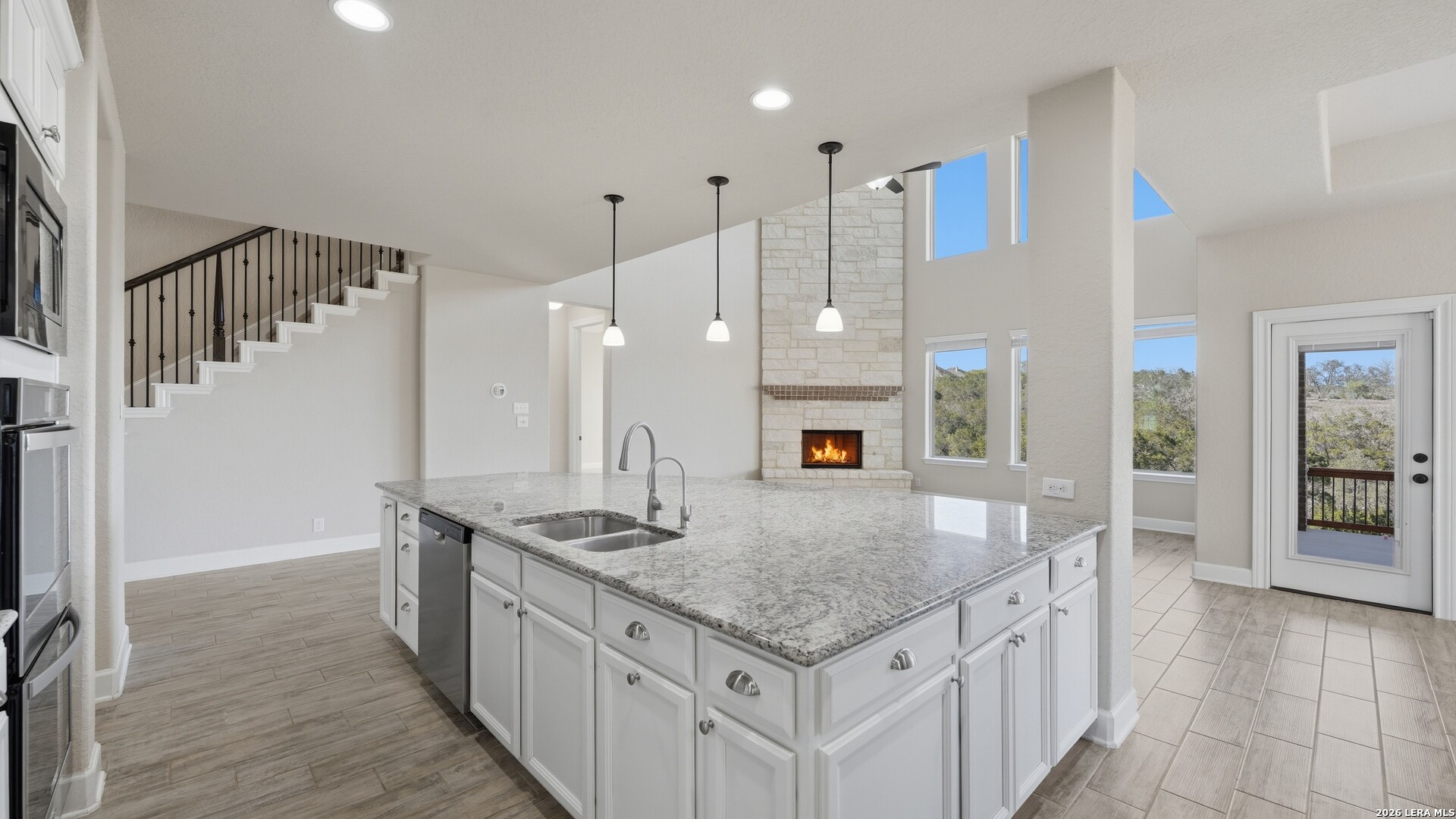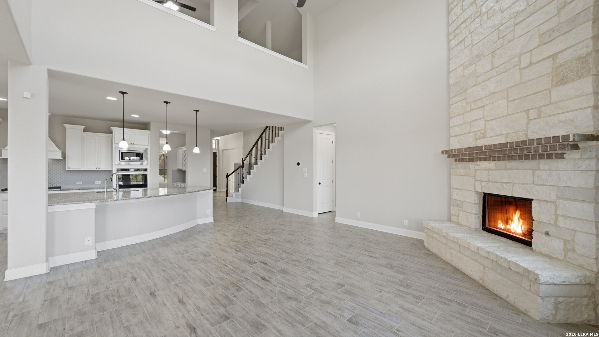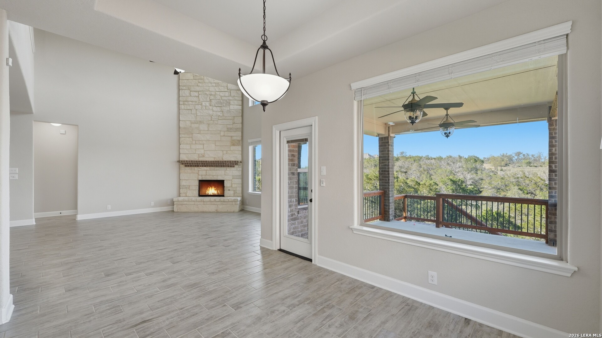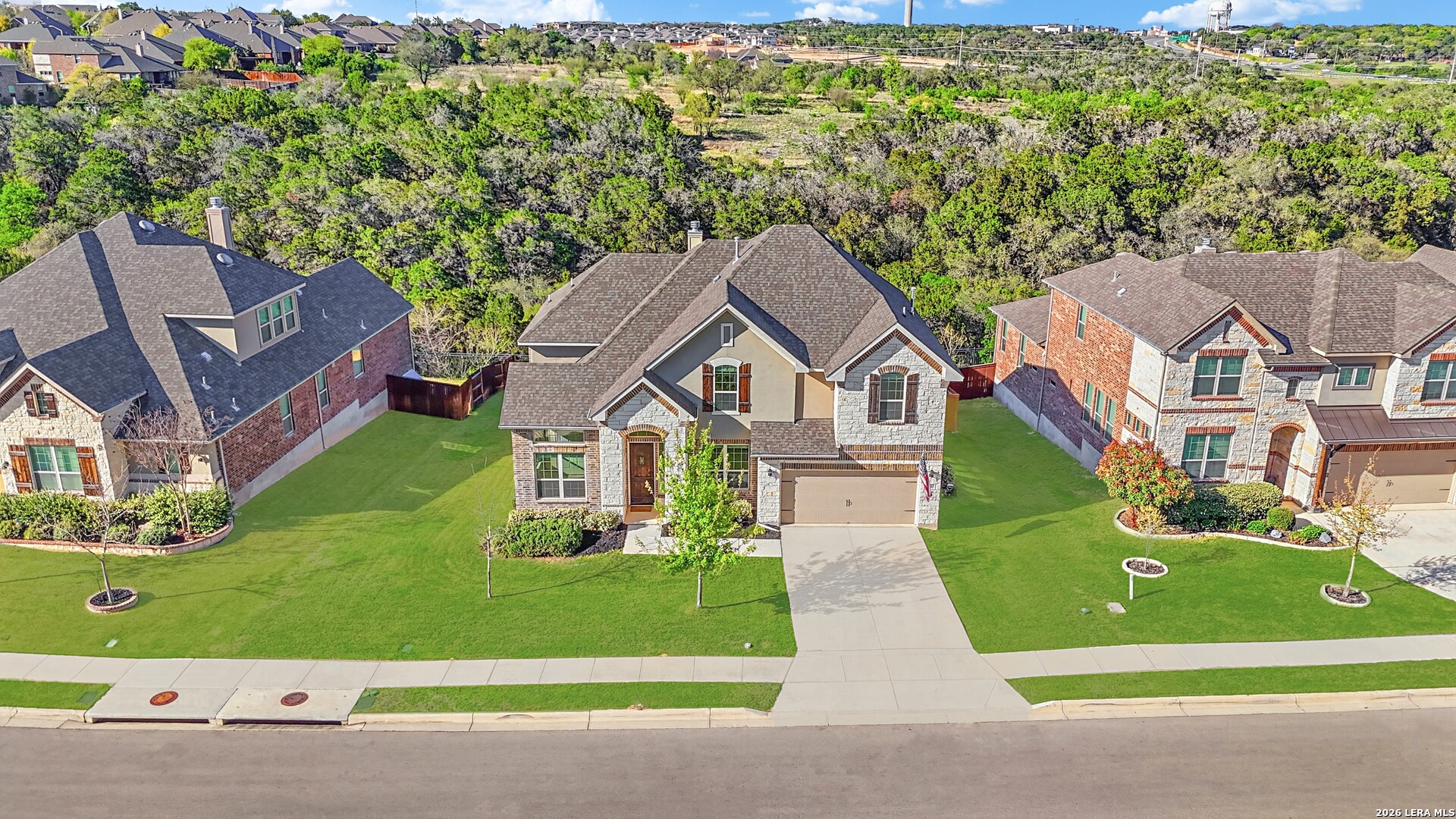 Roaring Falls Overlook is positioned in the sought-after Estates at Stone Crossing, a beautifully designed Ashton Woods home capturing sweeping Hill Country views with no rear neighbors, creating a private and peaceful backdrop that is increasingly rare in New Braunfels. From the moment you step inside, soaring ceilings, expansive windows, and an open-concept layout showcase the natural beauty beyond the home while filling the interior with abundant natural light. The thoughtfully designed floor plan offers both functionality and flexibility with multiple living and dining areas, ideal for everyday living and entertaining. The spacious living room is anchored by a stunning floor-to-ceiling stone gas fireplace and framed by dramatic windows that highlight the elevated views. The open kitchen is designed for both everyday living and entertaining, featuring custom cabinetry, double ovens, gas cooking, generous counter space, and an oversized breakfast bar with additional seating. A walk-through butler's pantry connects the dining room to the kitchen, adding both convenience and additional storage. The primary suite is conveniently located on the main level and offers a private retreat with large windows overlooking the serene landscape. A secondary bedroom with its own bathroom is also located downstairs, providing an ideal setup for guests, multigenerational living, or a private home office. Upstairs, additional living space includes a media room and flexible space for a game room, study, or secondary lounge. Designed to maximize the scenery, the home opens to a covered outdoor living area where you can enjoy panoramic views of New Braunfels and the surrounding Hill Country with no homes directly behind you. Whether hosting gatherings or enjoying quiet mornings, the outdoor space offers both privacy and tranquility. With its elevated setting, versatile layout, and rare combination of privacy, views, and convenience, Roaring Falls Overlook offers a refined Hill Country lifestyle in one of New Braunfels' desirable communities.