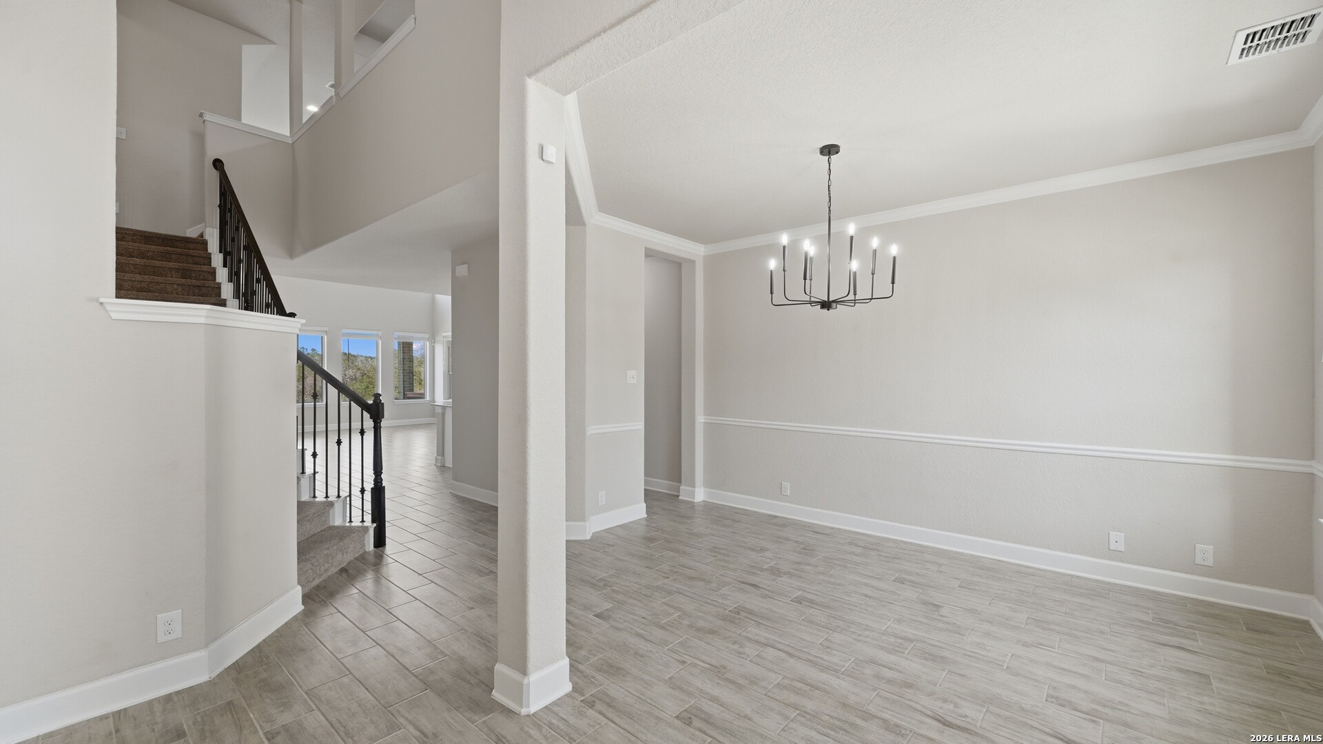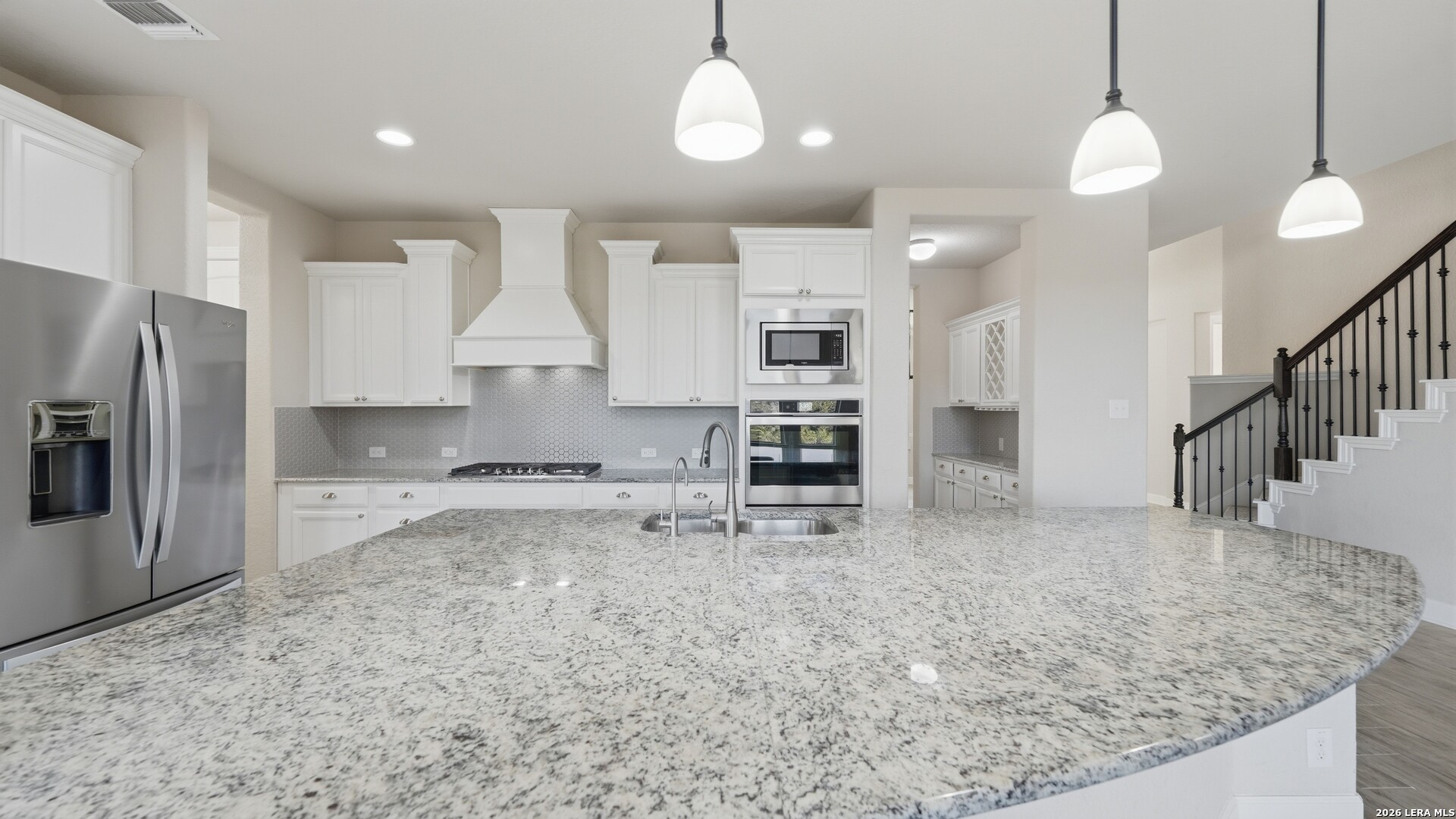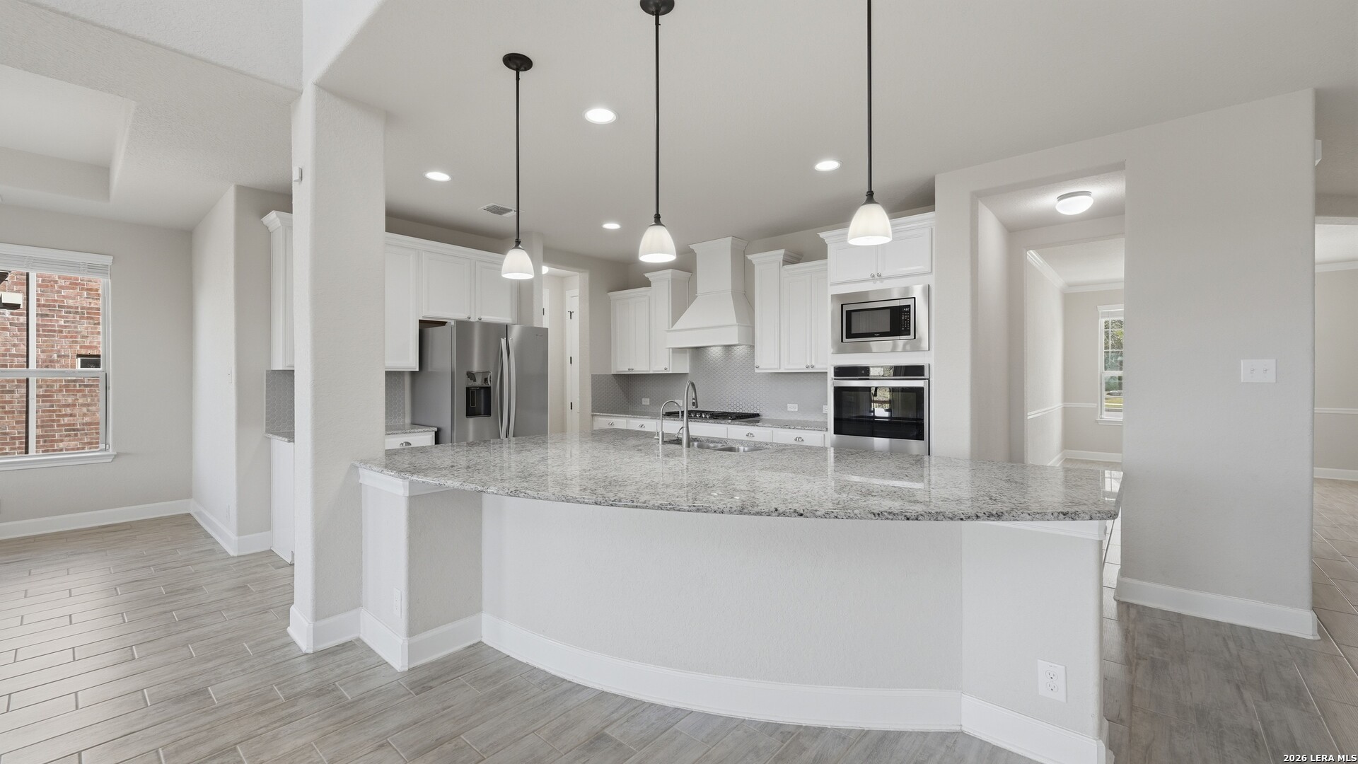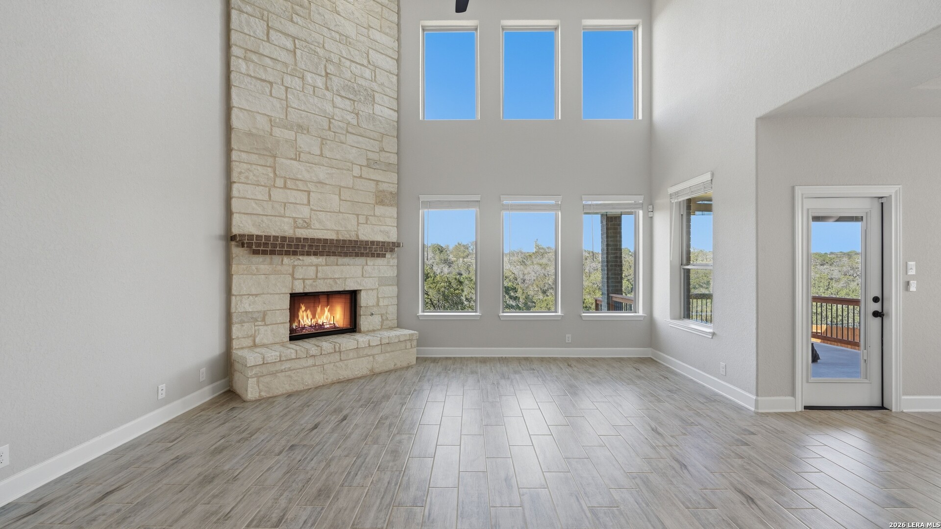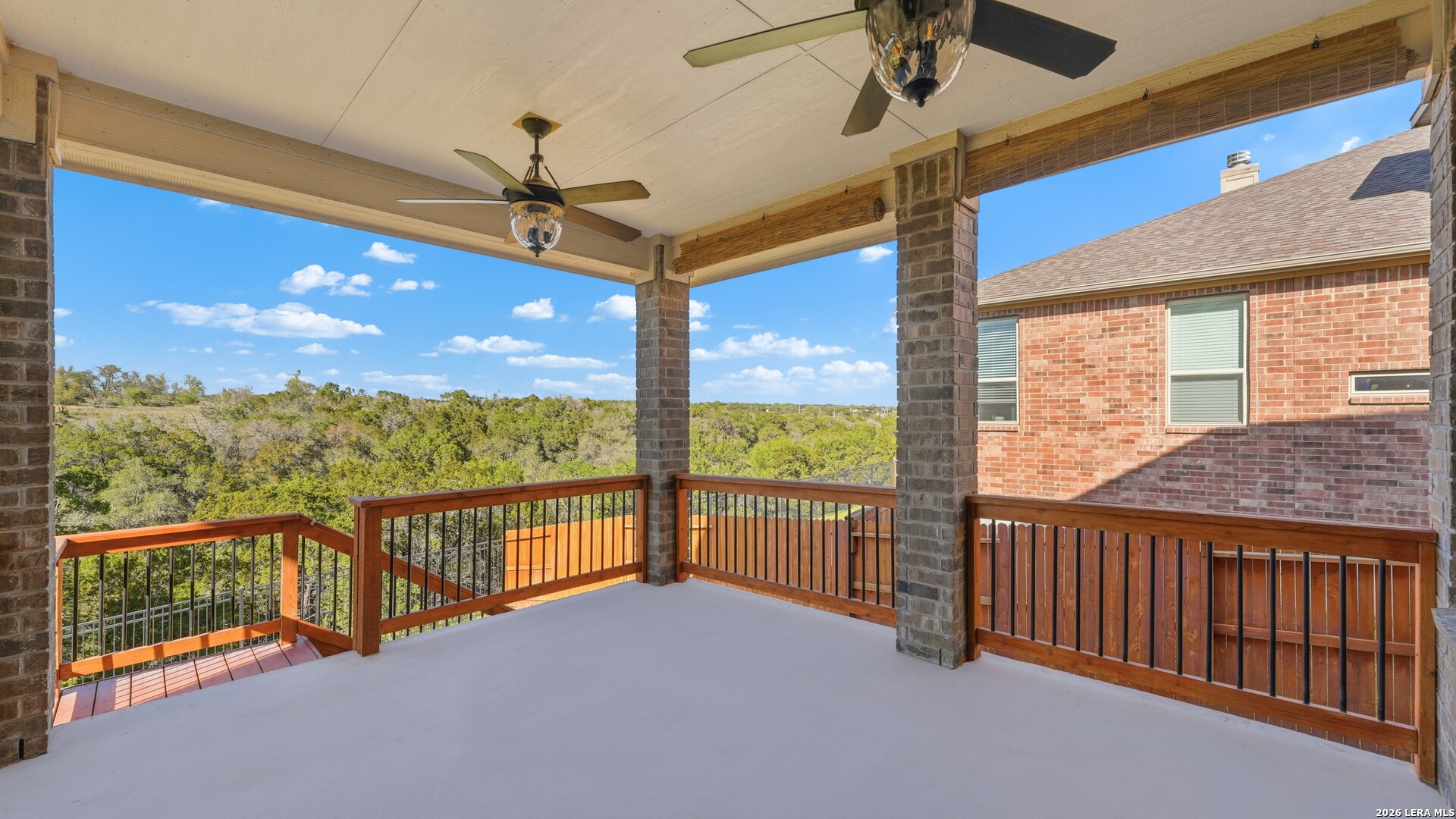 Roaring Falls Overlook is positioned in the sought-after Estates at Stone Crossing, a beautifully designed Ashton Woods home capturing sweeping Hill Country views with no rear neighbors, creating a private and peaceful backdrop that is increasingly rare in New Braunfels. From the moment you step inside, soaring ceilings, expansive windows, and an open-concept layout showcase the natural beauty beyond the home while filling the interior with abundant natural light. The thoughtfully designed floor plan offers both functionality and flexibility with multiple living and dining areas, ideal for everyday living and entertaining. The spacious living room is anchored by a stunning floor-to-ceiling stone gas fireplace and framed by dramatic windows that highlight the elevated views. The open kitchen is designed for both everyday living and entertaining, featuring custom cabinetry, double ovens, gas cooking, generous counter space, and an oversized breakfast bar with additional seating. A walk-through butler's pantry connects the dining room to the kitchen, adding both convenience and additional storage. The primary suite is conveniently located on the main level and offers a private retreat with large windows overlooking the serene landscape. A secondary bedroom with its own bathroom is also located downstairs, providing an ideal setup for guests, multigenerational living, or a private home office. Upstairs, additional living space includes a media room and flexible space for a game room, study, or secondary lounge. Designed to maximize the scenery, the home opens to a covered outdoor living area where you can enjoy panoramic views of New Braunfels and the surrounding Hill Country with no homes directly behind you. Whether hosting gatherings or enjoying quiet mornings, the outdoor space offers both privacy and tranquility. With its elevated setting, versatile layout, and rare combination of privacy, views, and convenience, Roaring Falls Overlook offers a refined Hill Country lifestyle in one of New Braunfels' desirable communities.