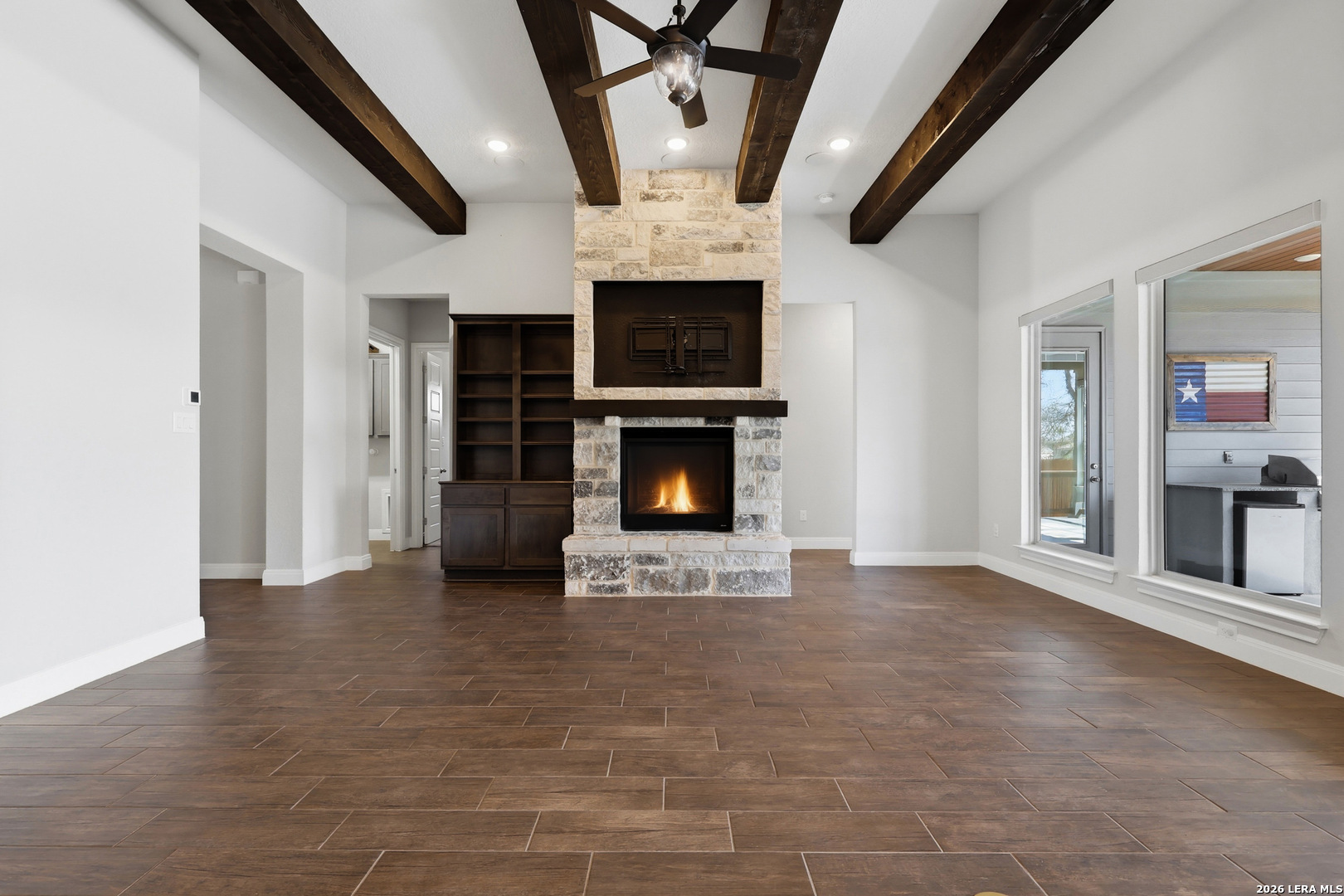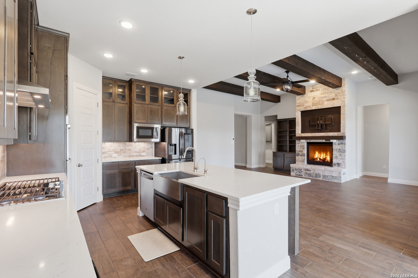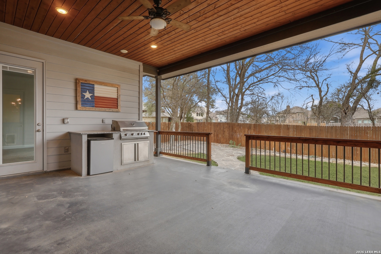 Beautifully upgraded single-story home featuring 3 bedrooms, 2.5 baths, plus a dedicated office, flex room, and extra storage space. Backing to a serene green space this property offers privacy in a highly desirable location. The gourmet kitchen showcases quartz countertops, double ovens, smart appliances, reverse osmosis system, and a built-in wine fridge - perfect for entertaining. The open-concept living area is enhanced with wood beams, a cozy fireplace, built-in shelving, and surround sound for elevated everyday living. Additional highlights include automatic blinds and blackout blinds in one bedrooms. Step outside to a spacious covered patio with an outdoor kitchen. Nestled near Gruene's boutique shops, live music venues, and the Guadalupe River, this home offers both charm and convenience just a golf cart ride away. With easy access to downtown New Braunfels, top-rated schools, and Hill Country attractions, it perfectly combines modern comfort with an exceptional location.