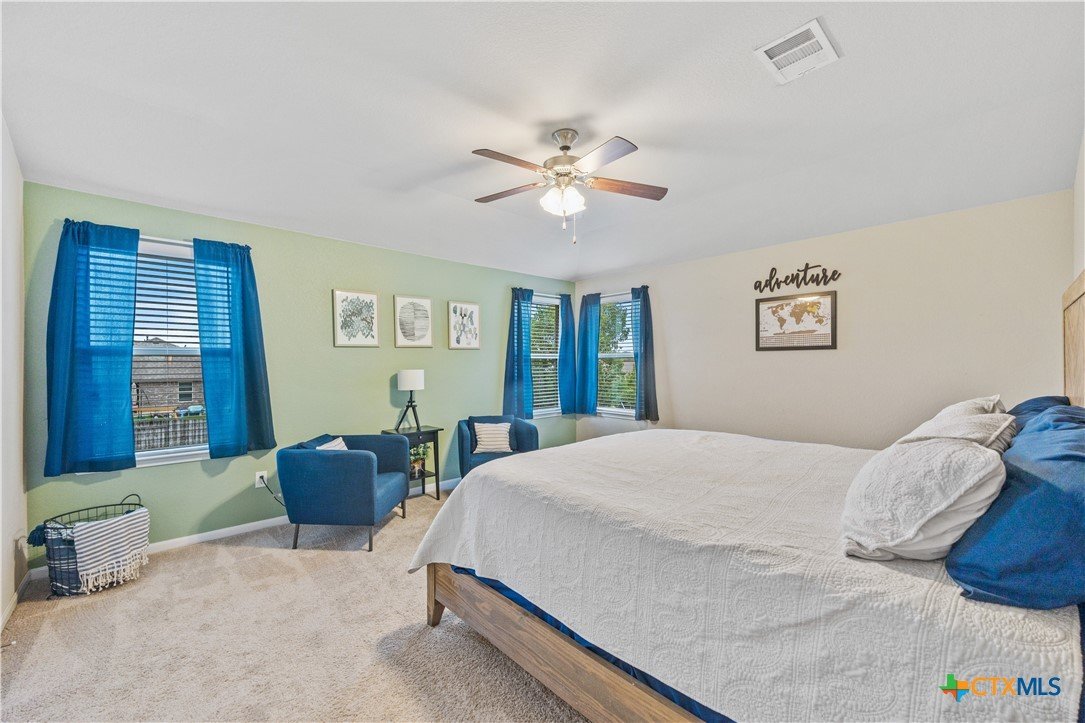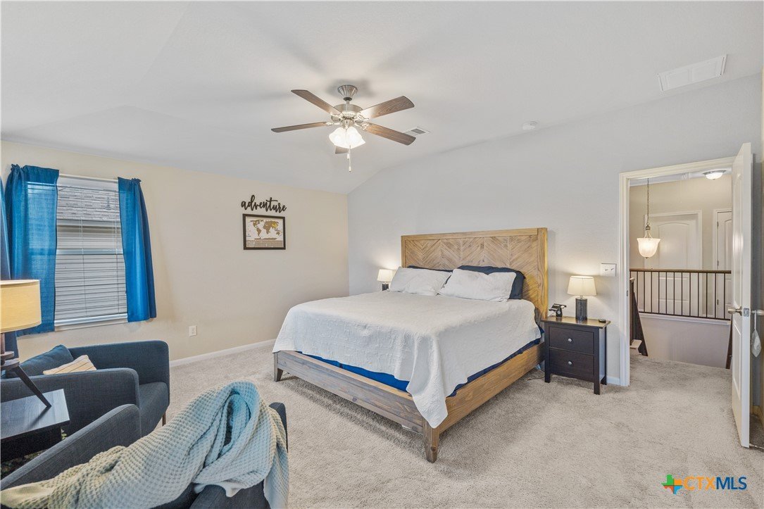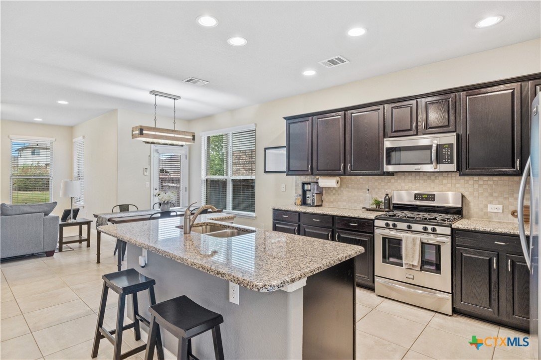 Step inside this beautifully updated 5-bed, 3-bath home on a peaceful cul-de-sac in coveted Teravista — offering room for work, play, and everyday life with vibe and flow buyers crave. Bright, open living spaces welcome you home, anchored by a kitchen built for connection — from weekday breakfasts to weekend gatherings. Sleek granite counters, gas cooking, rich espresso cabinetry, and a large center island make meal prep effortless while keeping the chef in view of the living and dining spaces. A main-level bedroom + dedicated office delivers ultimate flexibility — ideal for guests, multigenerational living, or work-from-home needs. Upstairs, an expansive loft/game room expands your living options for media nights, fitness, or play, while the private primary suite offers a peaceful retreat with sitting area, dual vanities, walk-in shower, and generous closet space. Outdoors, discover a large, versatile backyard — perfect for a pool, playscape, garden, or alfresco living — with a covered patio already in place to enjoy morning coffee or evening sunsets. Located minutes from IH-35 for easy commutes, top schools in Georgetown ISD, parks, trails, shopping, restaurants, and Teravista Golf Club — this home blends space, style, and convenience in one of Williamson County’s most desirable communities.
