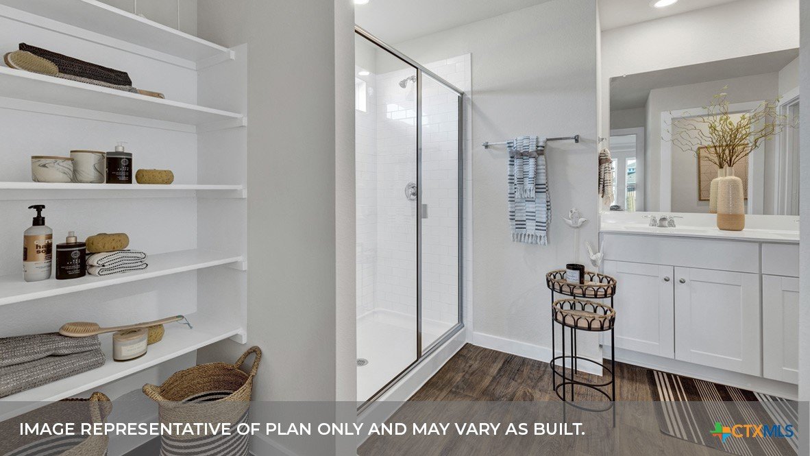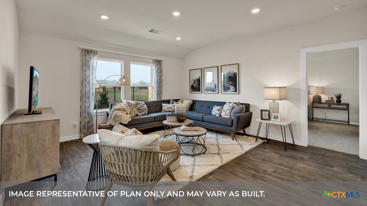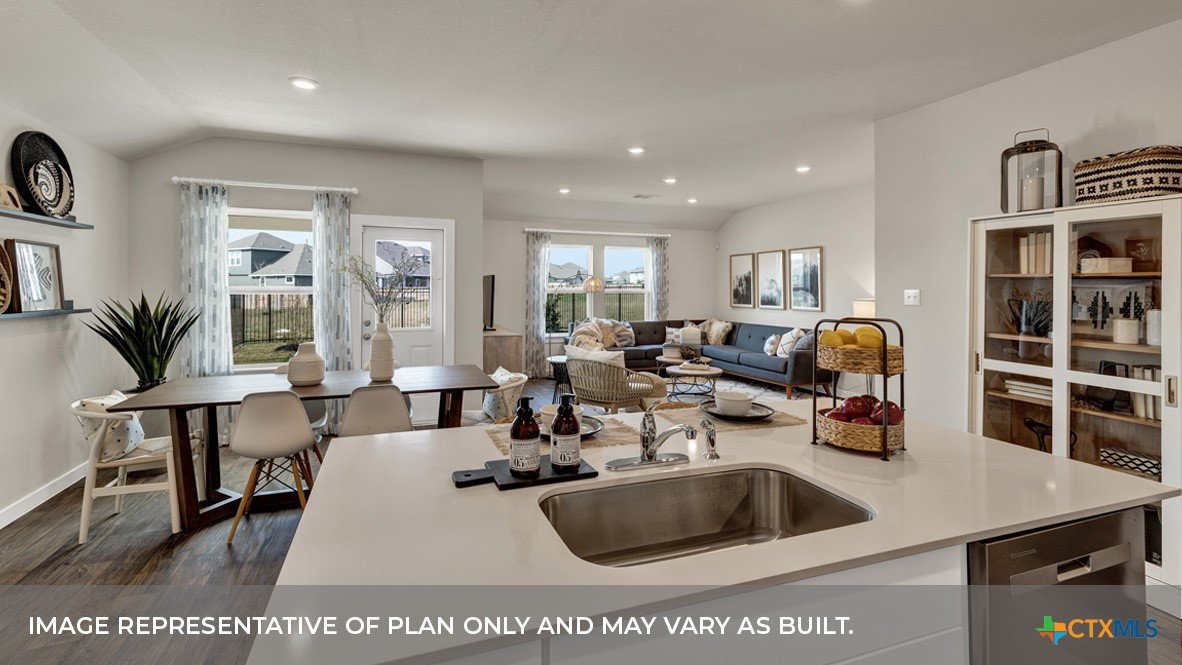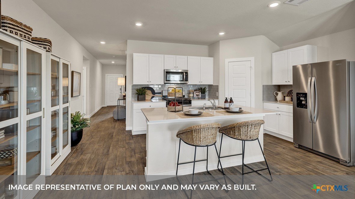 MARCH/APRIL ESTIMATED COMPLETIN. LOTS OF COMMUNITY AMENITIES AND ELEMENTARY SCHOOL IS IN THE COMMUNITY. The Irvine is one of our one-story floorplans offered at Trace in San Marcos, Texas. This 4-bedroom, 2-bathroom home includes a 2-car garage within its 1,788 square feet of comfortable living space. Our homes in Trace feature farmhouse exteriors. Step into this home from the covered entryway and make your way down the hall to the main living space. The open kitchen looks out to your dining area and family room, allowing for conversations to easily flow from all spaces. The L-shaped kitchen includes quartz countertops, a large island with an undermount sink, a corner pantry closet, stainless-steel appliances and 36’’ upper cabinets. Off the family room is the primary bedroom, with its own private bathroom. This relaxing bathroom space features a 5’ walk in shower, vanity, private toilet area with a door, and an oversized walk-in closet. At the front of the house, you will find bedroom 2 and 3, with the secondary bathroom conveniently located between the rooms. Bathroom 2 includes a tub/shower combination and open shelving for extra storage or décor. Across the foyer and down a short hall is the utility room and bedroom 4. Whether you use these rooms as an office, child’s room or guest room, there is enough space for work, sleep and play. The Irvine includes vinyl flooring throughout the common areas of the home, and carpet in the bedrooms. All our new homes feature a covered back patio, full sod, an irrigation system in the front and back yard, and a 6’ privacy fence around the back yard. This home features our America’s Smart Home base package, which includes the Video Front Doorbell, Front Door Deadbolt Lock, Home Hub, Thermostat.