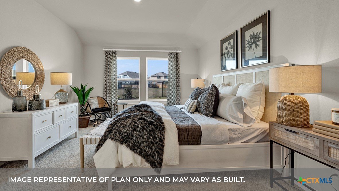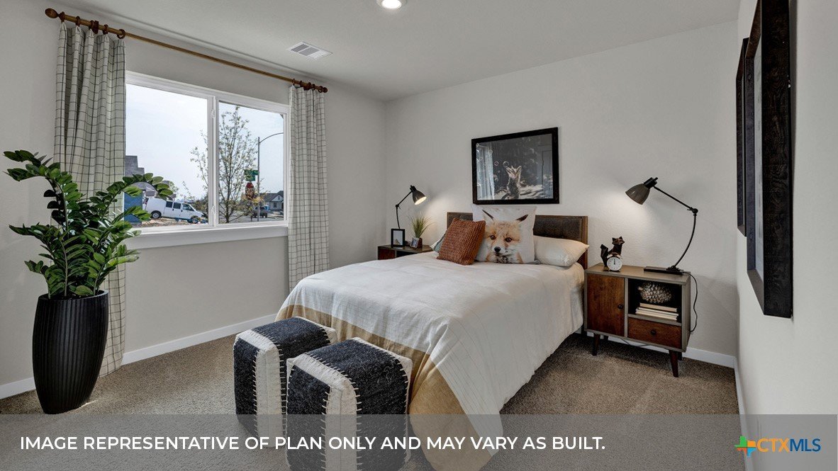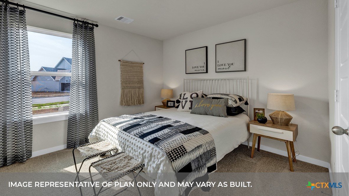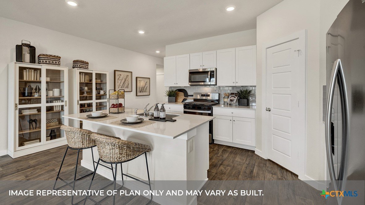 MARCH/APRIL ESTIMATED COMPLETIN. LOTS OF COMMUNITY AMENITIES AND ELEMENTARY SCHOOL IS IN THE COMMUNITY. The Irvine is one of our one-story floorplans offered at Trace in San Marcos, Texas. This 4-bedroom, 2-bathroom home includes a 2-car garage within its 1,788 square feet of comfortable living space. Our homes in Trace feature farmhouse exteriors. Step into this home from the covered entryway and make your way down the hall to the main living space. The open kitchen looks out to your dining area and family room, allowing for conversations to easily flow from all spaces. The L-shaped kitchen includes quartz countertops, a large island with an undermount sink, a corner pantry closet, stainless-steel appliances and 36’’ upper cabinets. Off the family room is the primary bedroom, with its own private bathroom. This relaxing bathroom space features a 5’ walk in shower, vanity, private toilet area with a door, and an oversized walk-in closet. At the front of the house, you will find bedroom 2 and 3, with the secondary bathroom conveniently located between the rooms. Bathroom 2 includes a tub/shower combination and open shelving for extra storage or décor. Across the foyer and down a short hall is the utility room and bedroom 4. Whether you use these rooms as an office, child’s room or guest room, there is enough space for work, sleep and play. The Irvine includes vinyl flooring throughout the common areas of the home, and carpet in the bedrooms. All our new homes feature a covered back patio, full sod, an irrigation system in the front and back yard, and a 6’ privacy fence around the back yard. This home features our America’s Smart Home base package, which includes the Video Front Doorbell, Front Door Deadbolt Lock, Home Hub, Thermostat.
