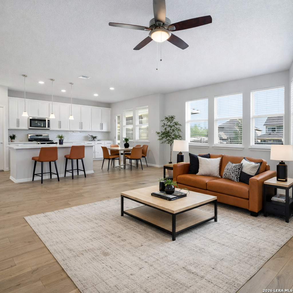 LOCATION + NO CARPET + ENERGY SAVINGS! Check out this beautifully maintained, move-in ready home in the highly desirable Harlach Farms community-located less than one mile from Hwy 90 for a fast commute to Lackland AFB (11 miles), Wells Fargo, USAA, Microsoft, and Fort Sam Houston. Ideal for relocations or first-time homebuyers, this home offers comfort, convenience, and outstanding energy efficiency. Plus, ask about options to lower your monthly payment! Inside, enjoy an open-concept layout with NO carpet downstairs or upstairs, perfect for low-maintenance living and pets. The upgraded kitchen features sleek cabinetry with modern hardware, quartz countertops, an extended bar for coffee or wine, stainless steel appliances, gas cooking, and a griddle burner. Energy-efficient features include spray-foam attic insulation and enhanced air filtration, helping reduce utility costs while supporting cleaner indoor air. The owner's suite provides a peaceful retreat with a generous walk-in closet and walk-in shower. Secondary bedrooms are well-sized, with one split from the others-ideal for guests, a gym, or home office. Upstairs, a spacious game room is perfect for entertaining, while downstairs offers a pocket office with built-in desk and additional storage under the stairs. Additional upgrades include a newer 14-SEER HVAC, 8-foot doors, extended backyard patio, water softener, EV charger, and added garage cabinetry. Refrigerator, washer, and dryer available to convey. Community amenities include a pool, park, and neighborhood events. With quick access to Hwy 90, Loop 1604, Costco, H-E-B, shopping, dining, and highly rated schools, this home delivers the ideal blend of efficiency, location, and lifestyle. Schedule your showing today!