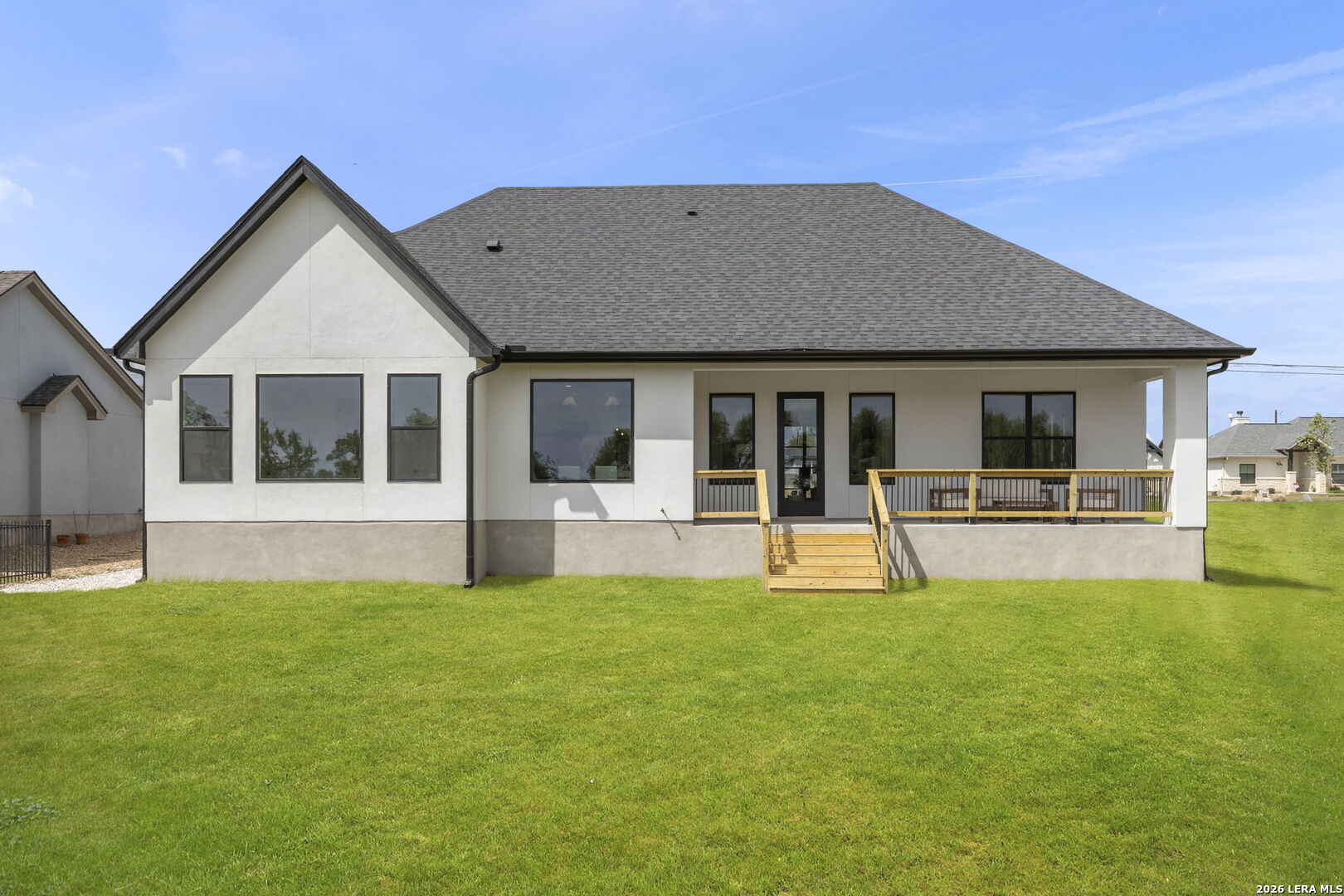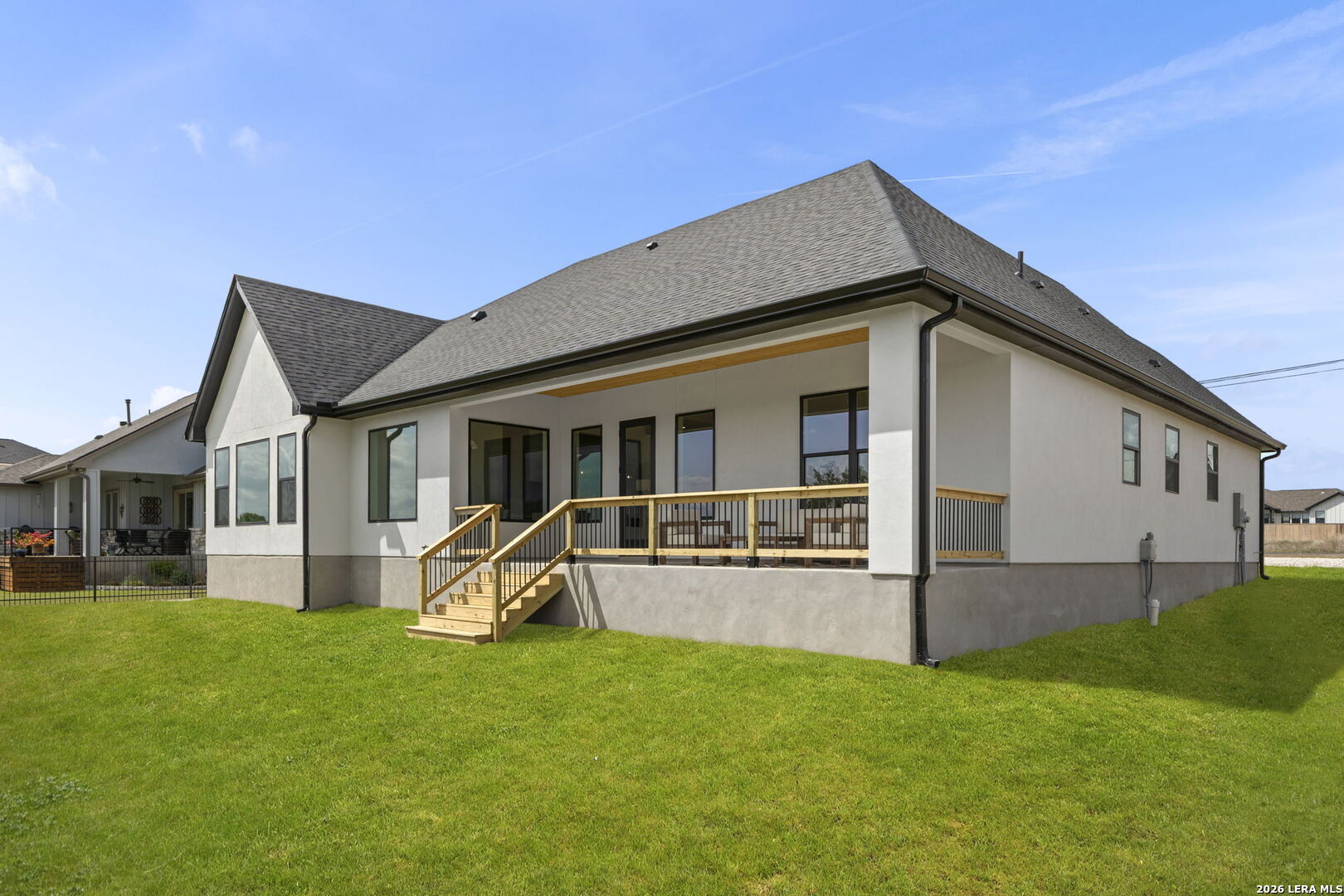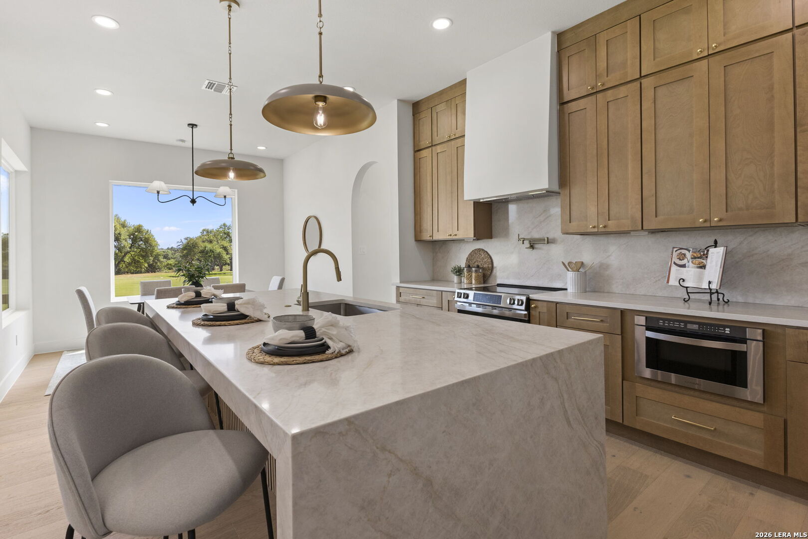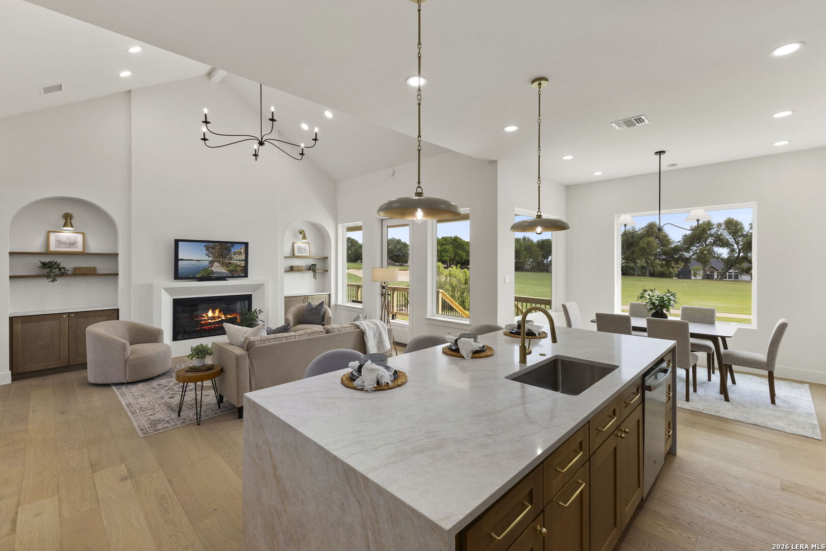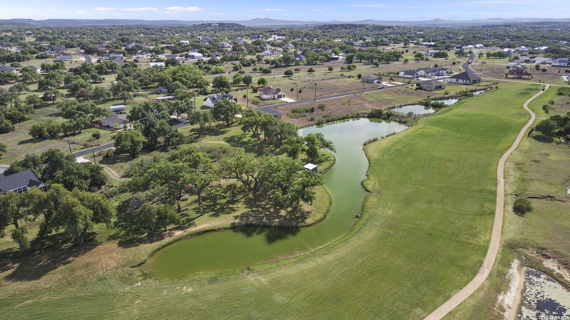 Welcome home to this beautifully crafted single-story custom residence located in the desirable Rockin' J Ranch community, offering scenic golf course views and elevated design throughout. Spanning approximately 2,224 square feet, this thoughtfully designed floor plan features 3 bedrooms, 3 full bathrooms, a half bath, and a dedicated office-perfectly blending comfort, functionality, and modern Hill Country style. The office, positioned near the front of the home, provides a quiet and productive workspace. At the heart of the home, the open-concept living area showcases soaring vaulted ceilings, creating a bright and inviting space ideal for both everyday living and entertaining. Large windows frame picturesque golf course views, seamlessly connecting indoor and outdoor living. The kitchen is a true centerpiece, featuring custom cabinetry, stylish finishes, and ample workspace designed for both cooking and gathering. The primary suite offers a private retreat with vaulted ceilings, a spa-like bathroom complete with a walk-in shower, separate garden tub, and a spacious layout designed for relaxation. Additional highlights include engineered hardwood flooring, upscale lighting fixtures, designer tile selections, and custom carpentry details throughout the home. Every finish has been carefully selected to deliver both quality and style. Step outside to the back patio and take in the peaceful golf course views-perfect for relaxing evenings or hosting guests. The exterior showcases a timeless blend of brick and stucco, enhancing both curb appeal and durability. The oversized garage offers added versatility, including a separate side-entry bay ideal for a golf cart or additional storage. Located within the highly sought-after Rockin' J Ranch community, residents enjoy access to premier amenities including golf, walking trails, and a vibrant neighborhood atmosphere-all just a short drive from Blanco and within reach of the greater Hill Country area. A rare opportunity to own a custom-built home with golf course views in one of the area's most desirable communities-this property is truly a must-see.
