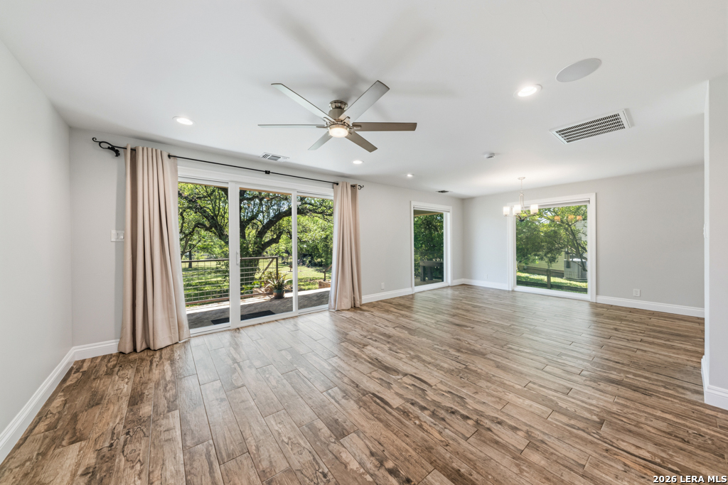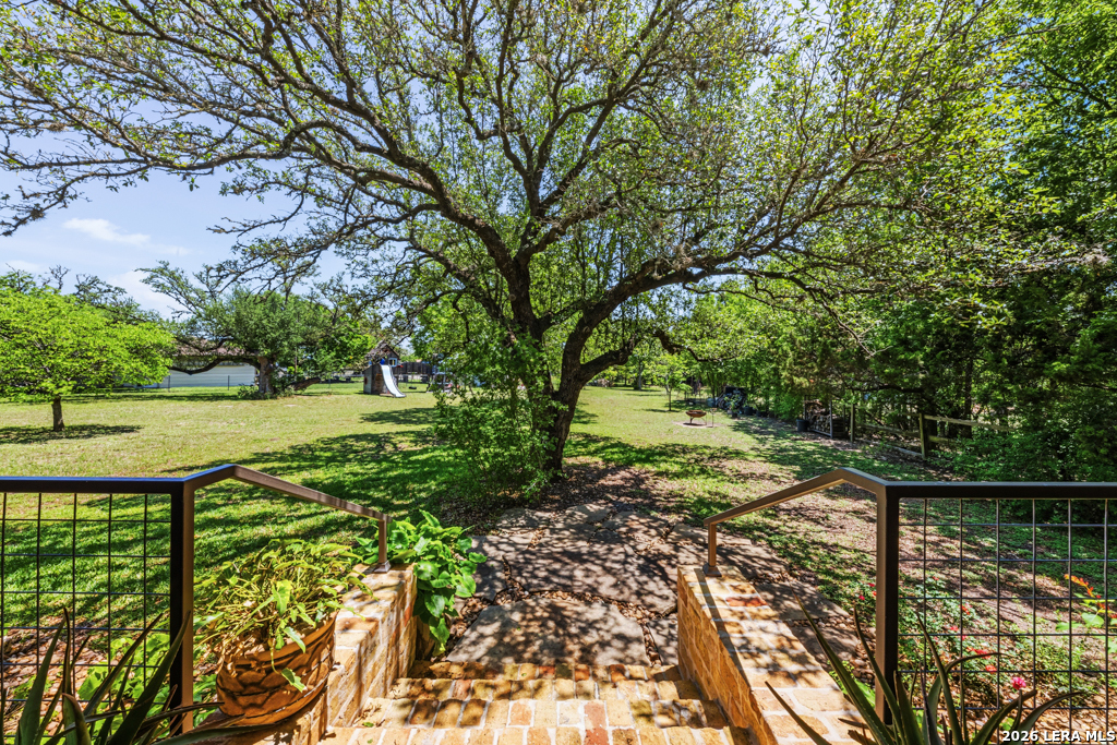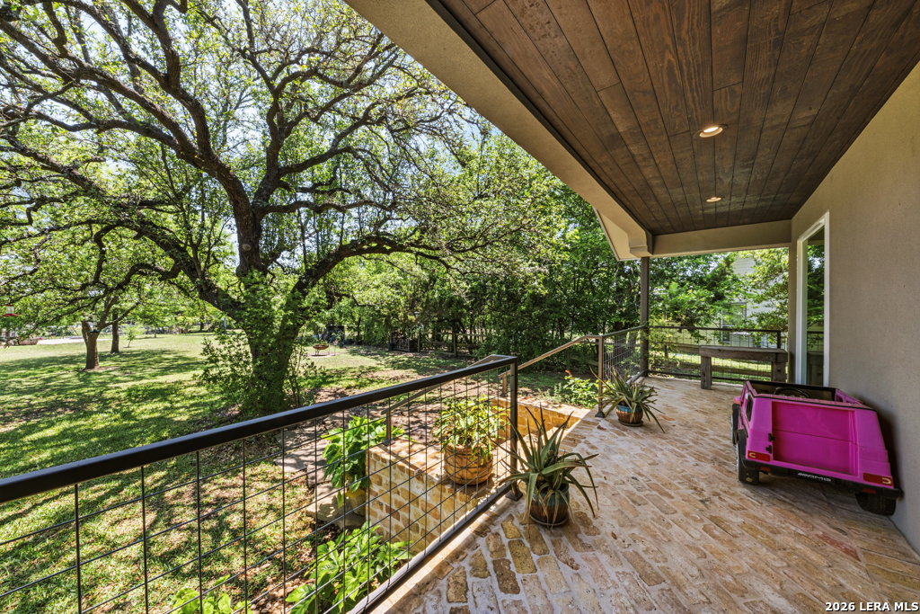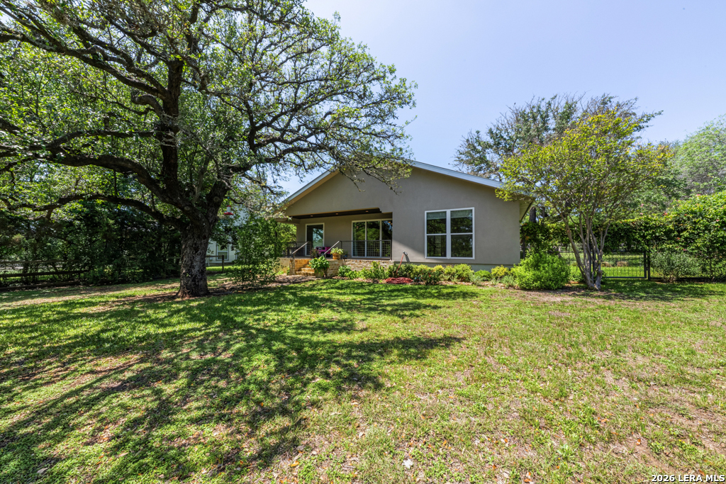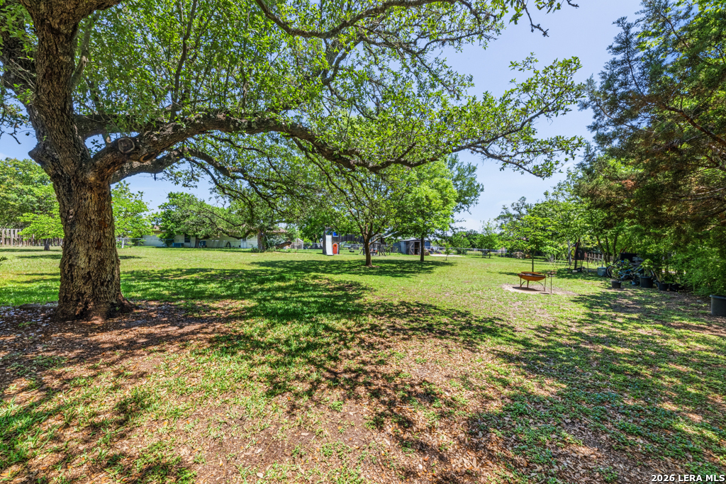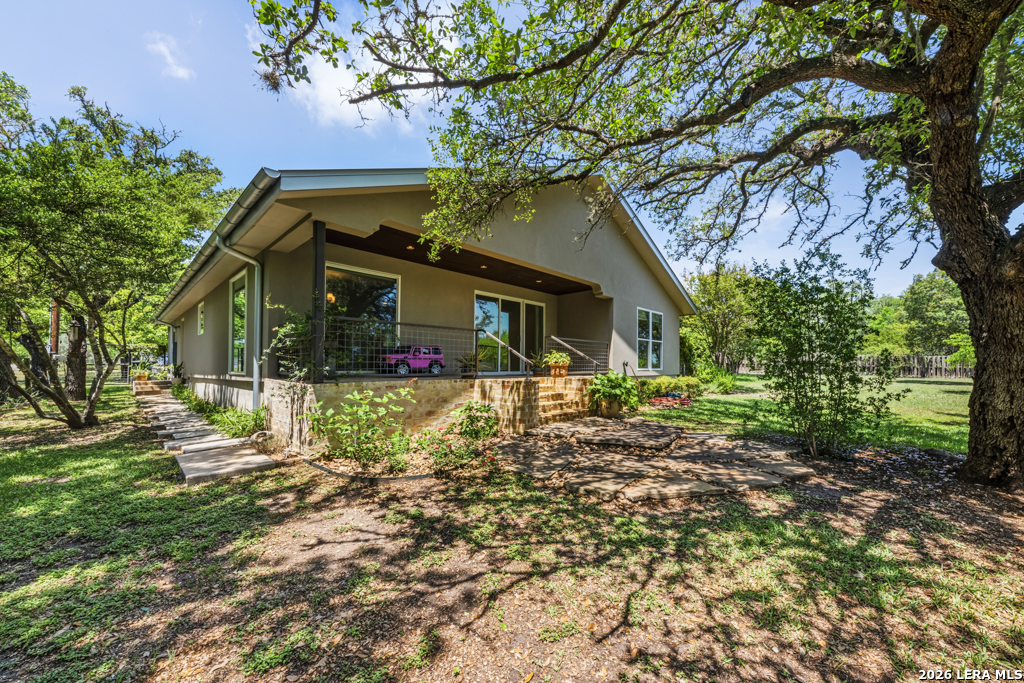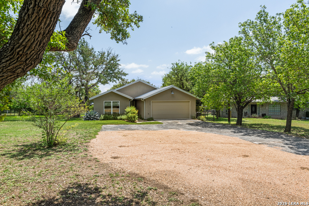 The home features a functional, ranch-style layout designed for efficiency and comfort. Living Spaces: The interior often features beautiful wood look tile. Common to this build style in the high ceilings in the main living area, providing a spring like vibe. The Kitchen: Includes a breakfast bar, maintaining an open feel toward the living quarters. The master bedroom includes an ensuite bathroom and is sized to accommodate standard suite furniture comfortably. The standout feature of this property is the expansive 0.78-acre lot. The property is heavily wooded with mature native trees, offering significant natural privacy from neighbors. Located on Woodland Blvd, the topography is characteristic of the Texas Hill Country-level to gently sloping with rocky, well-draining soil. The exterior is all stucco siding with a slab foundation and a Standing Seam Metal roof, blending into the natural environment of the Ranger Creek area.