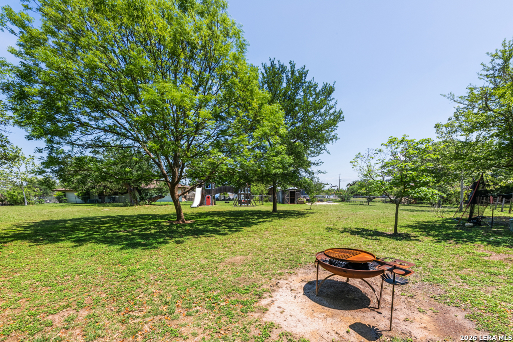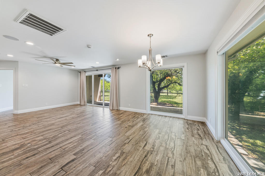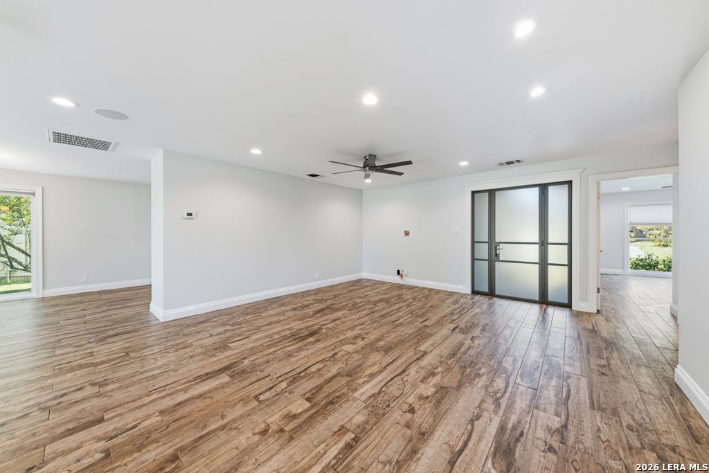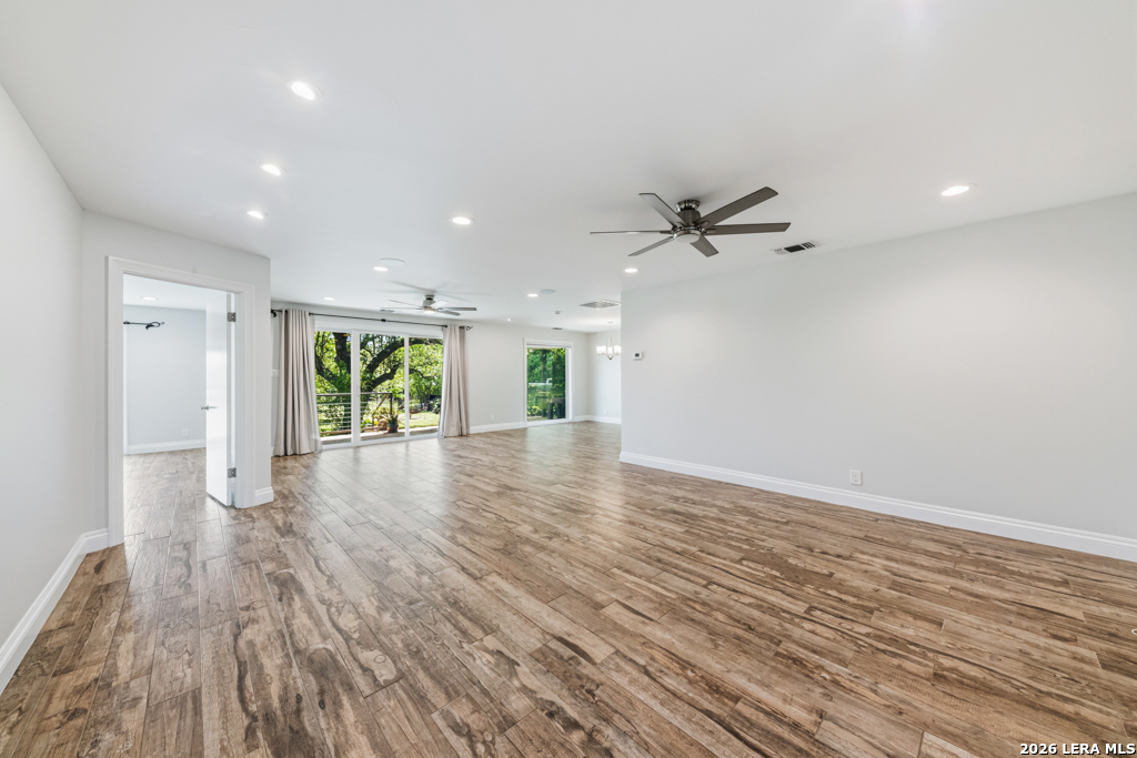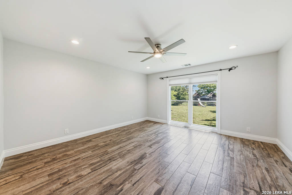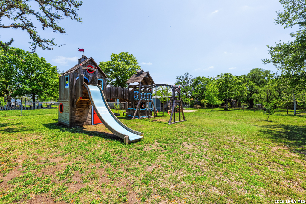 The home features a functional, ranch-style layout designed for efficiency and comfort. Living Spaces: The interior often features beautiful wood look tile. Common to this build style in the high ceilings in the main living area, providing a spring like vibe. The Kitchen: Includes a breakfast bar, maintaining an open feel toward the living quarters. The master bedroom includes an ensuite bathroom and is sized to accommodate standard suite furniture comfortably. The standout feature of this property is the expansive 0.78-acre lot. The property is heavily wooded with mature native trees, offering significant natural privacy from neighbors. Located on Woodland Blvd, the topography is characteristic of the Texas Hill Country-level to gently sloping with rocky, well-draining soil. The exterior is all stucco siding with a slab foundation and a Standing Seam Metal roof, blending into the natural environment of the Ranger Creek area.