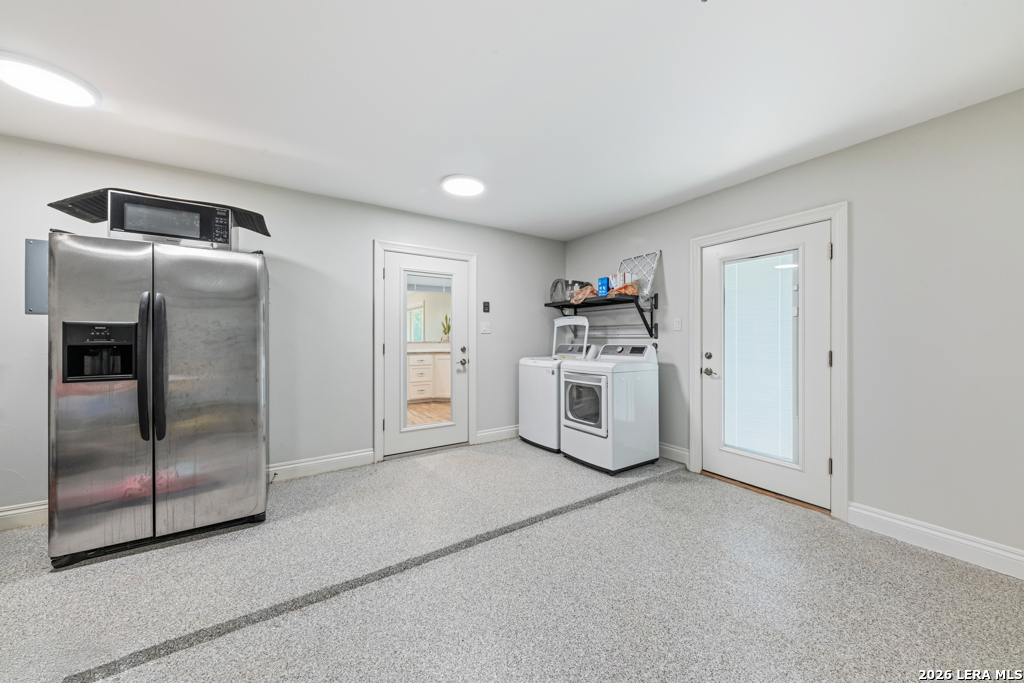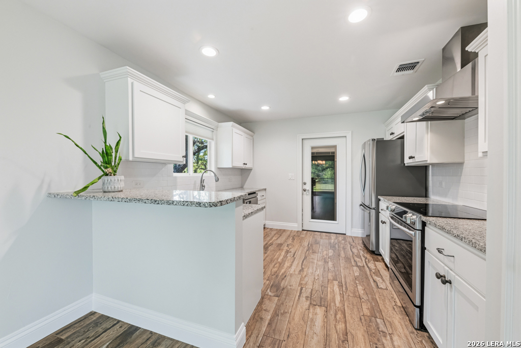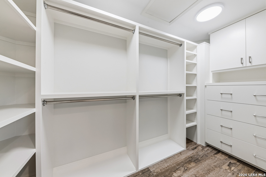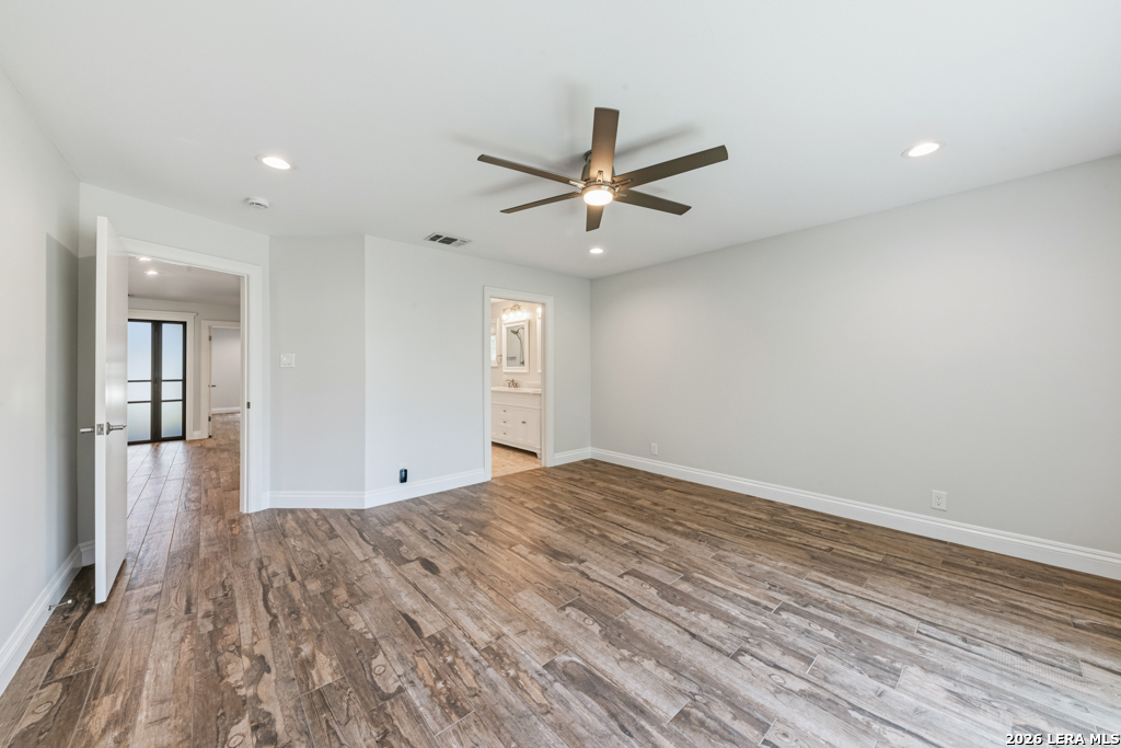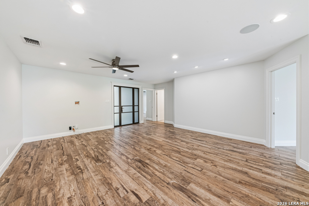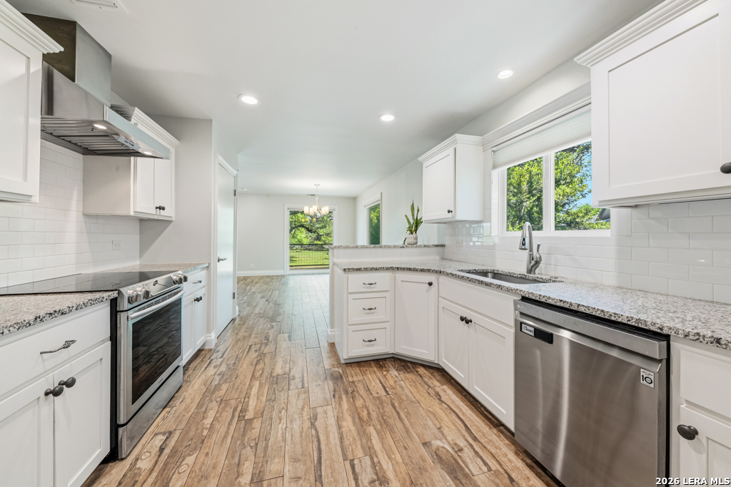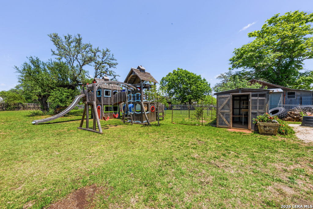 The home features a functional, ranch-style layout designed for efficiency and comfort. Living Spaces: The interior often features beautiful wood look tile. Common to this build style in the high ceilings in the main living area, providing a spring like vibe. The Kitchen: Includes a breakfast bar, maintaining an open feel toward the living quarters. The master bedroom includes an ensuite bathroom and is sized to accommodate standard suite furniture comfortably. The standout feature of this property is the expansive 0.78-acre lot. The property is heavily wooded with mature native trees, offering significant natural privacy from neighbors. Located on Woodland Blvd, the topography is characteristic of the Texas Hill Country-level to gently sloping with rocky, well-draining soil. The exterior is all stucco siding with a slab foundation and a Standing Seam Metal roof, blending into the natural environment of the Ranger Creek area.