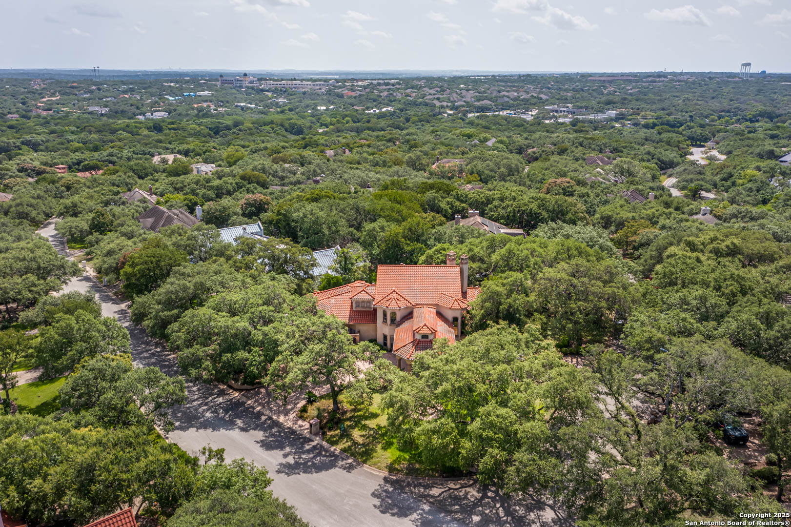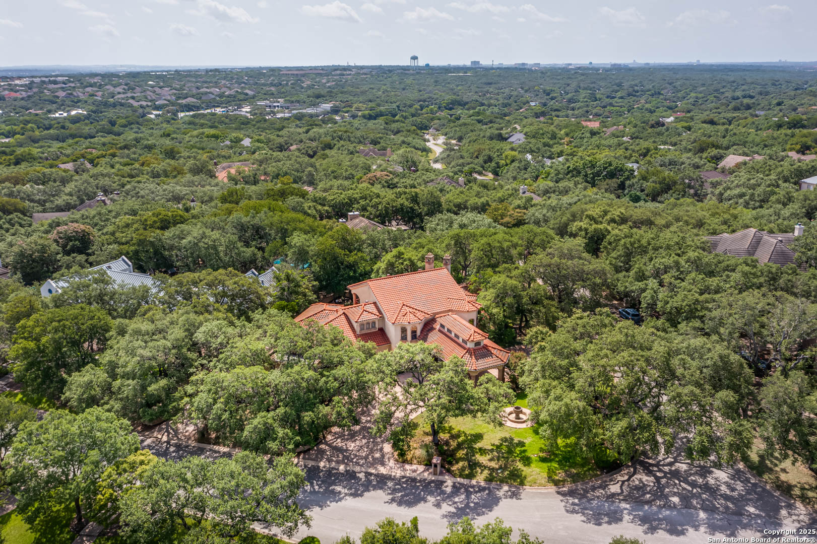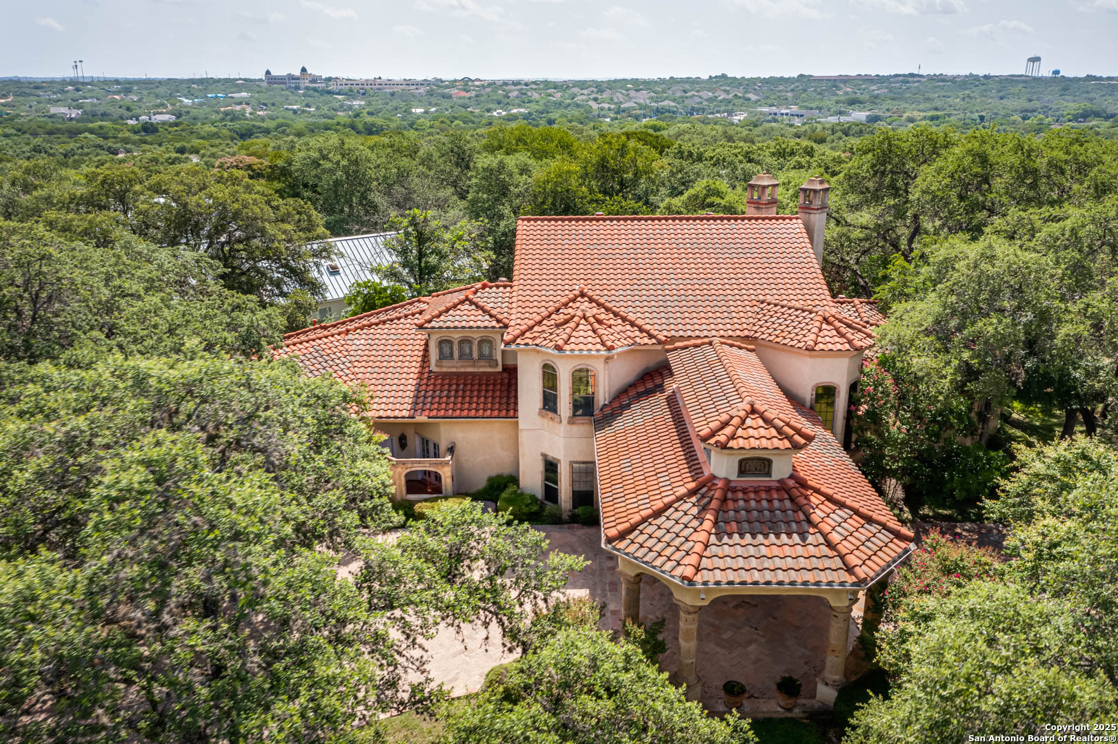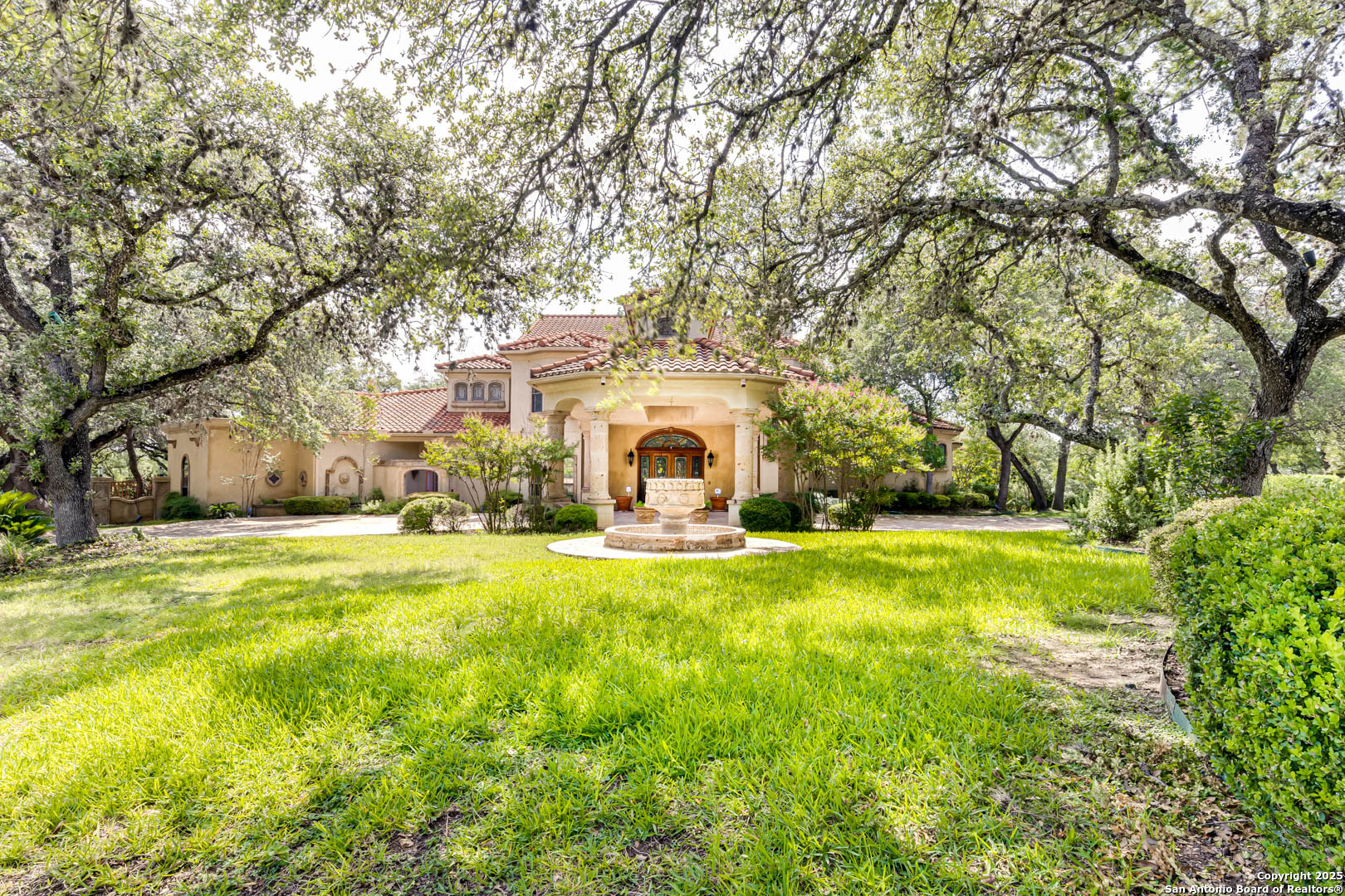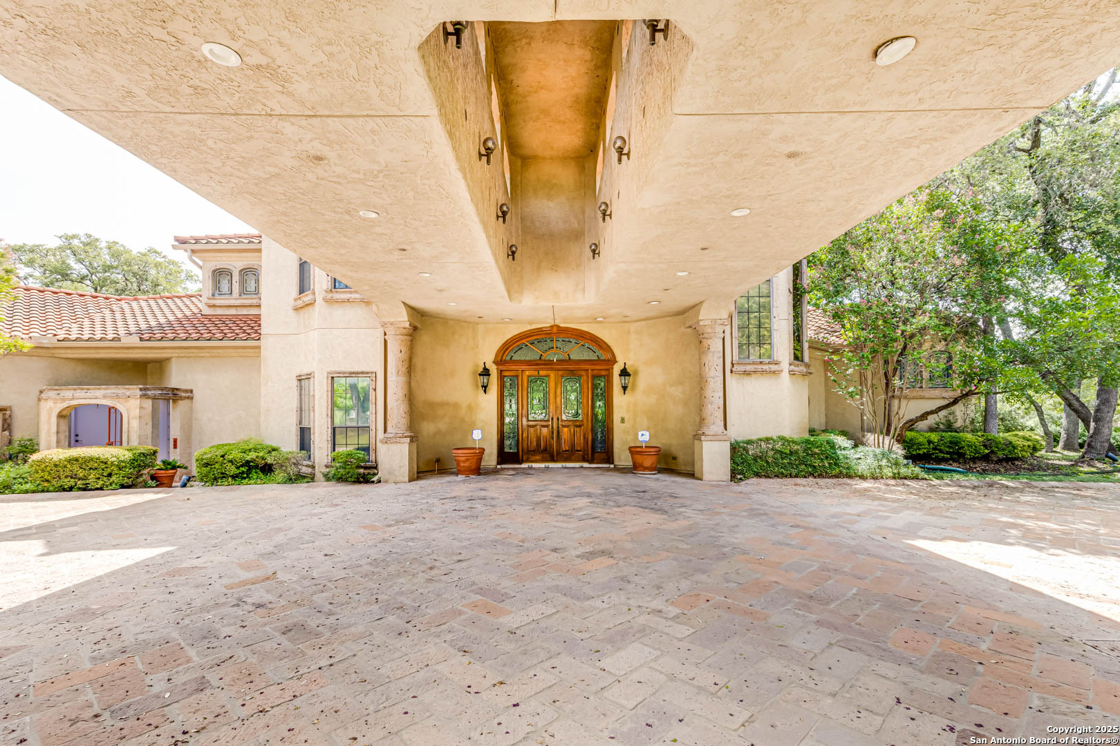 Set along one of Elm Creek's most distinguished streets, this extraordinary home offers a level of craftsmanship and architectural distinction that sets it apart. From the moment you arrive, the cantera stone driveway and dramatic port cochere make a lasting impression. Multiple cantera stone columns, both inside and out, add a timeless, grand feel throughout the property. Inside, a soaring two-story foyer welcomes you with rich marble floors, coffered ceilings, and detailed crown molding-setting the stage for elegant living and entertaining. The open-concept design includes a spectacular built-in bar and flows seamlessly into the living and dining areas-perfect for gatherings large or small. The chef's kitchen is a showstopper, featuring contrasting custom cabinetry, gleaming white countertops, and a full suite of stainless steel appliances designed for both beauty and function. Downstairs, you'll find three spacious en suite bedrooms, including a private primary suite with its own sitting area and access to the outdoors. The spa-like bath pampers with dual vanities and a deep soaking tub. Upstairs, a cozy game room with a fireplace opens to an oversized covered balcony-ideal for relaxing evenings. Tucked away on the second level is a hidden gem: an L-shaped cedar-lined closet with built-in gun shelving and ample storage, offering discreet, secure organization with a custom touch. Other highlights include a covered patio for outdoor entertaining, a spacious three-car garage, and thoughtful details throughout that reflect the care and artistry of true custom construction. This is more than a home-it's a rare opportunity to own a statement property in one of San Antonio's most established and sought-after neighborhoods.