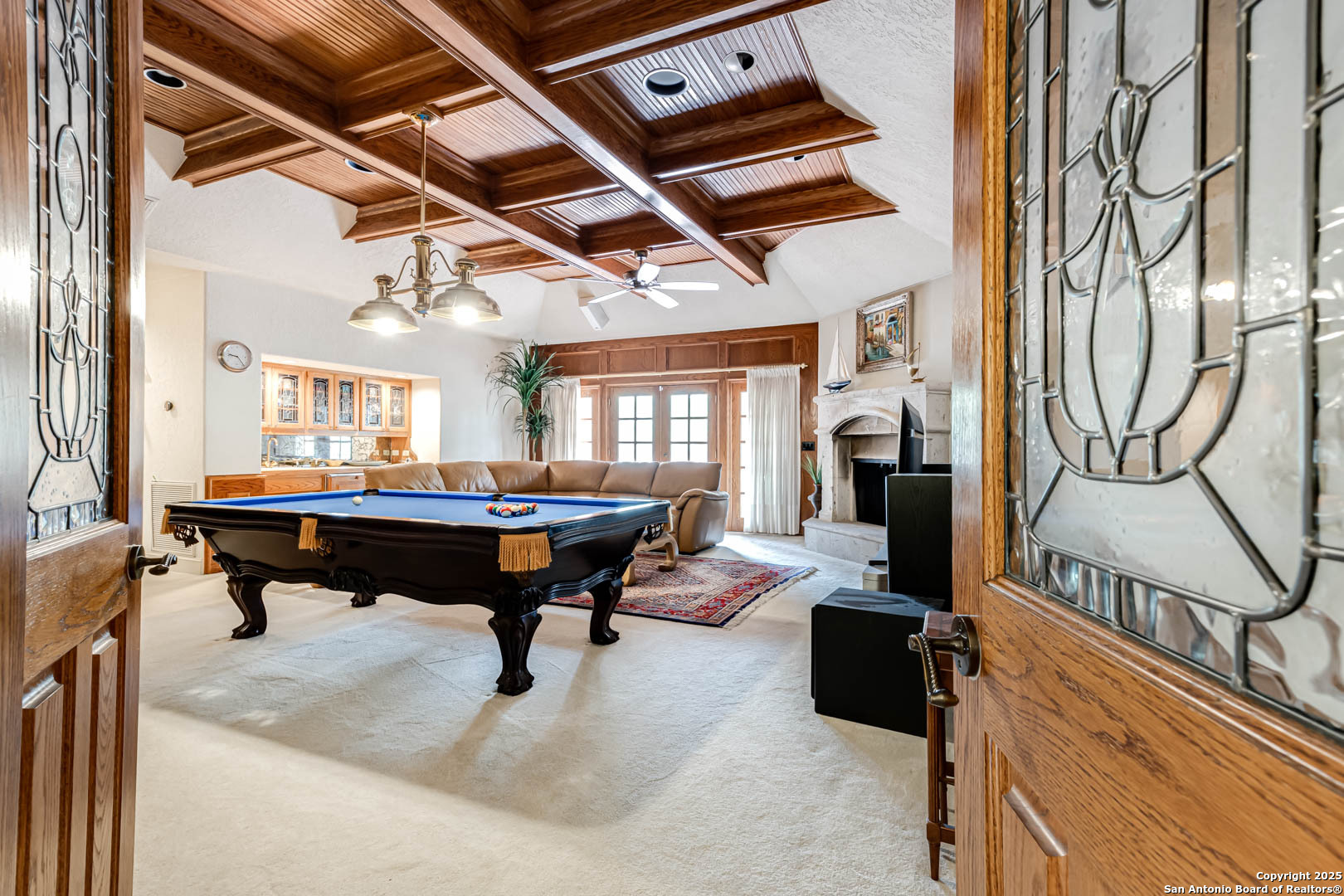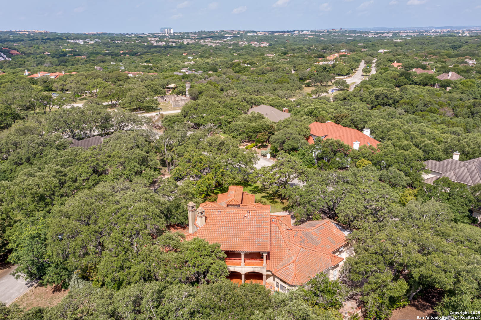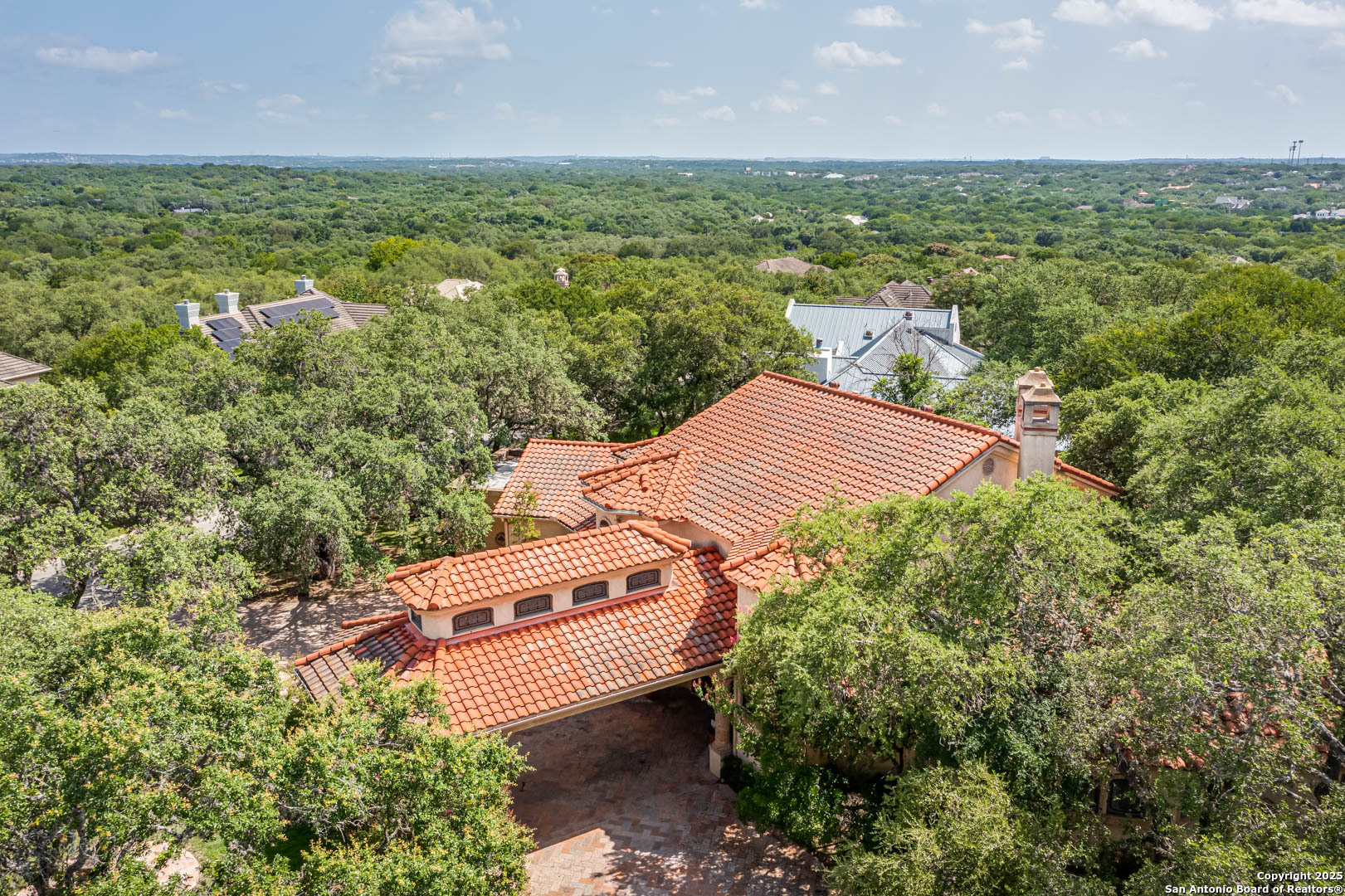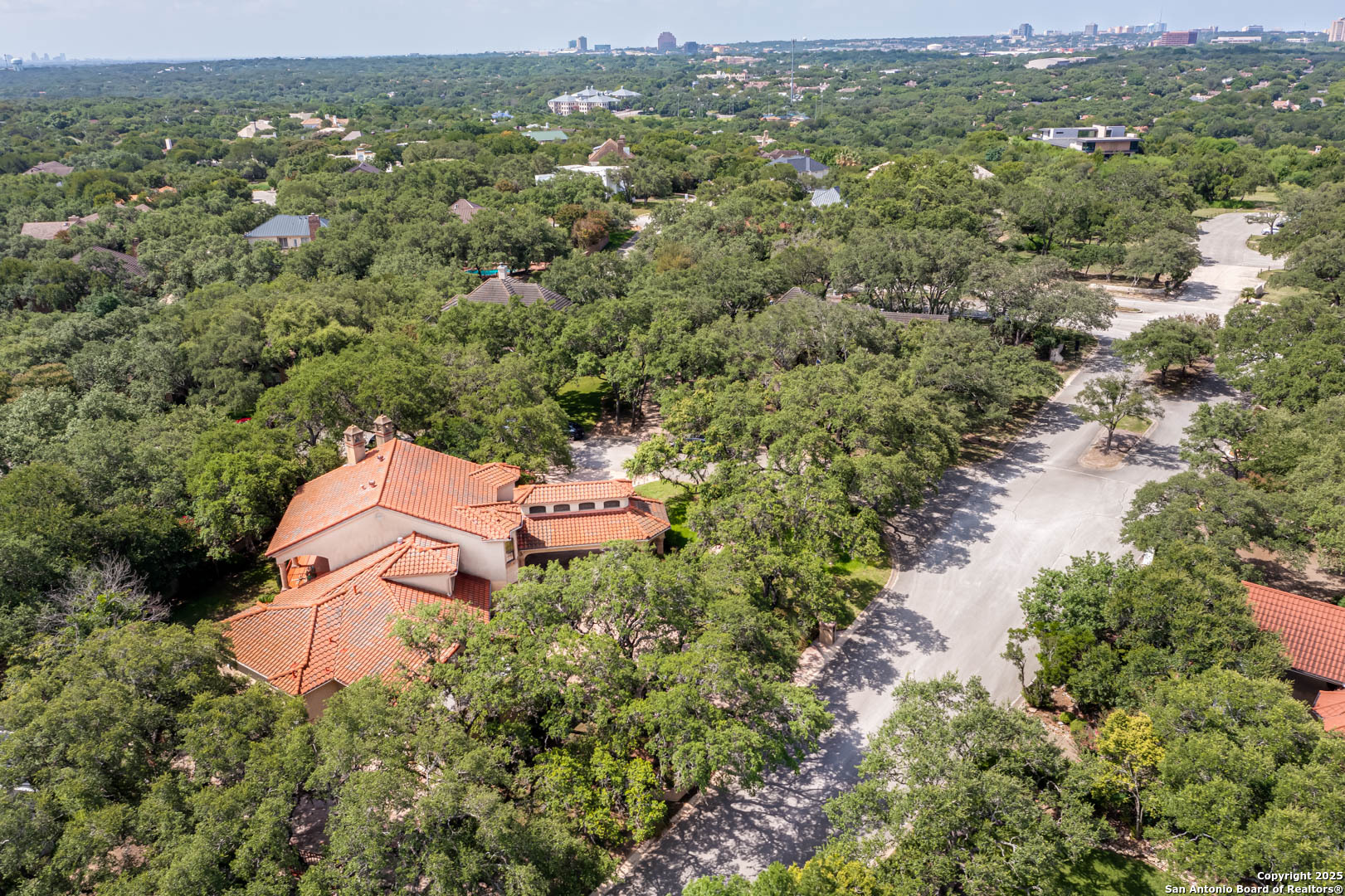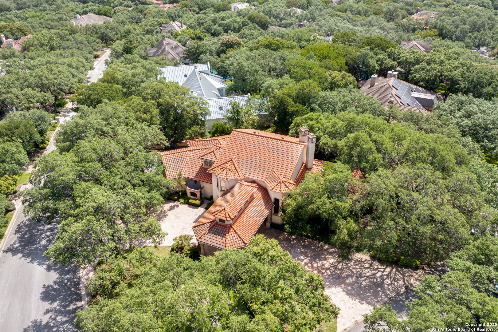 Set along one of Elm Creek's most distinguished streets, this extraordinary home offers a level of craftsmanship and architectural distinction that sets it apart. From the moment you arrive, the cantera stone driveway and dramatic port cochere make a lasting impression. Multiple cantera stone columns, both inside and out, add a timeless, grand feel throughout the property. Inside, a soaring two-story foyer welcomes you with rich marble floors, coffered ceilings, and detailed crown molding-setting the stage for elegant living and entertaining. The open-concept design includes a spectacular built-in bar and flows seamlessly into the living and dining areas-perfect for gatherings large or small. The chef's kitchen is a showstopper, featuring contrasting custom cabinetry, gleaming white countertops, and a full suite of stainless steel appliances designed for both beauty and function. Downstairs, you'll find three spacious en suite bedrooms, including a private primary suite with its own sitting area and access to the outdoors. The spa-like bath pampers with dual vanities and a deep soaking tub. Upstairs, a cozy game room with a fireplace opens to an oversized covered balcony-ideal for relaxing evenings. Tucked away on the second level is a hidden gem: an L-shaped cedar-lined closet with built-in gun shelving and ample storage, offering discreet, secure organization with a custom touch. Other highlights include a covered patio for outdoor entertaining, a spacious three-car garage, and thoughtful details throughout that reflect the care and artistry of true custom construction. This is more than a home-it's a rare opportunity to own a statement property in one of San Antonio's most established and sought-after neighborhoods.