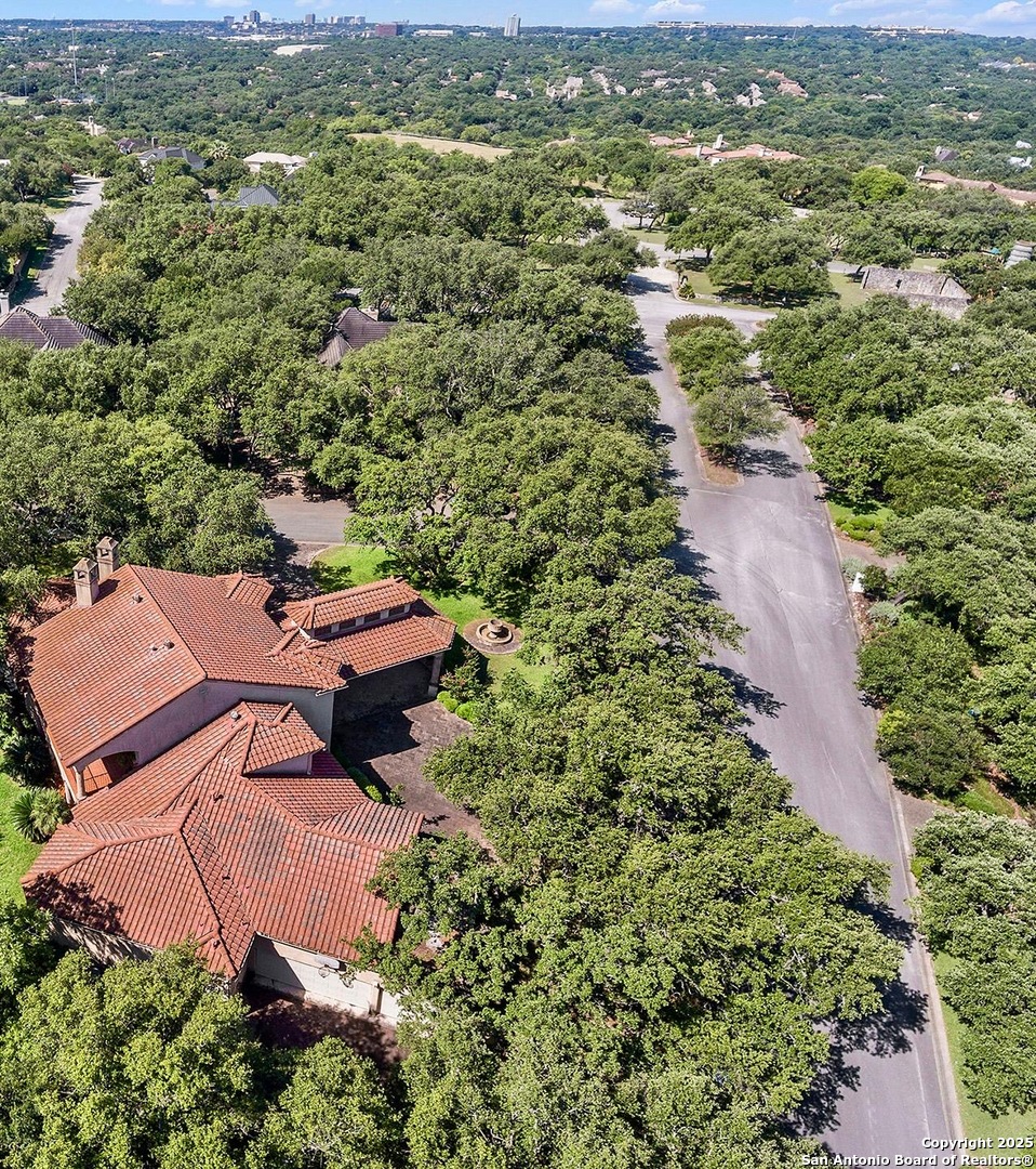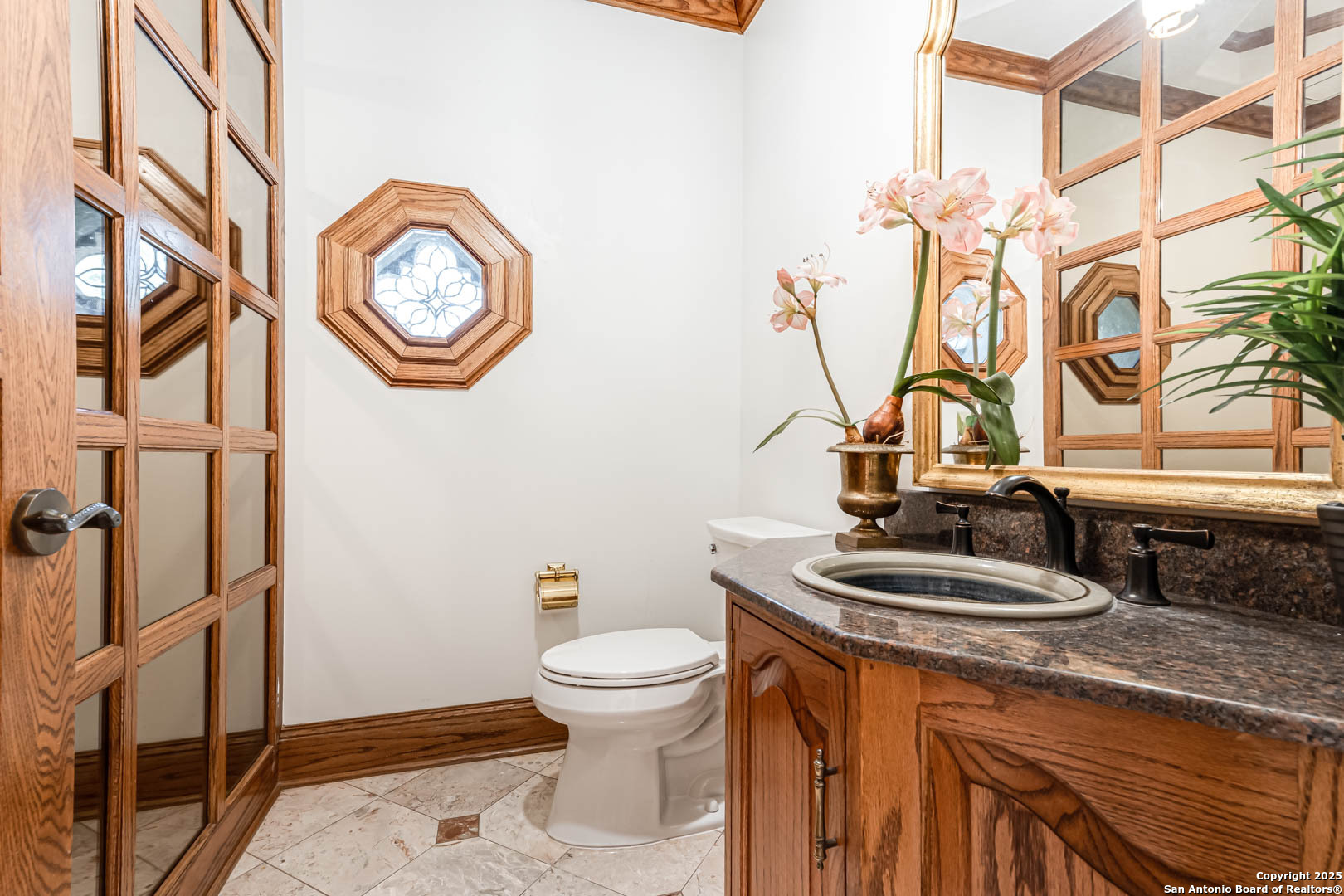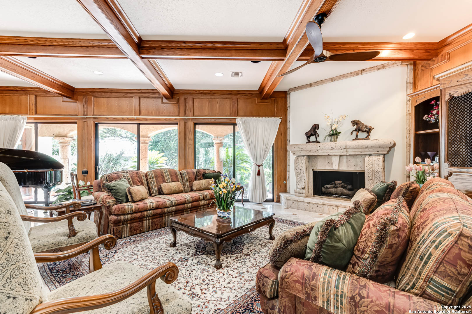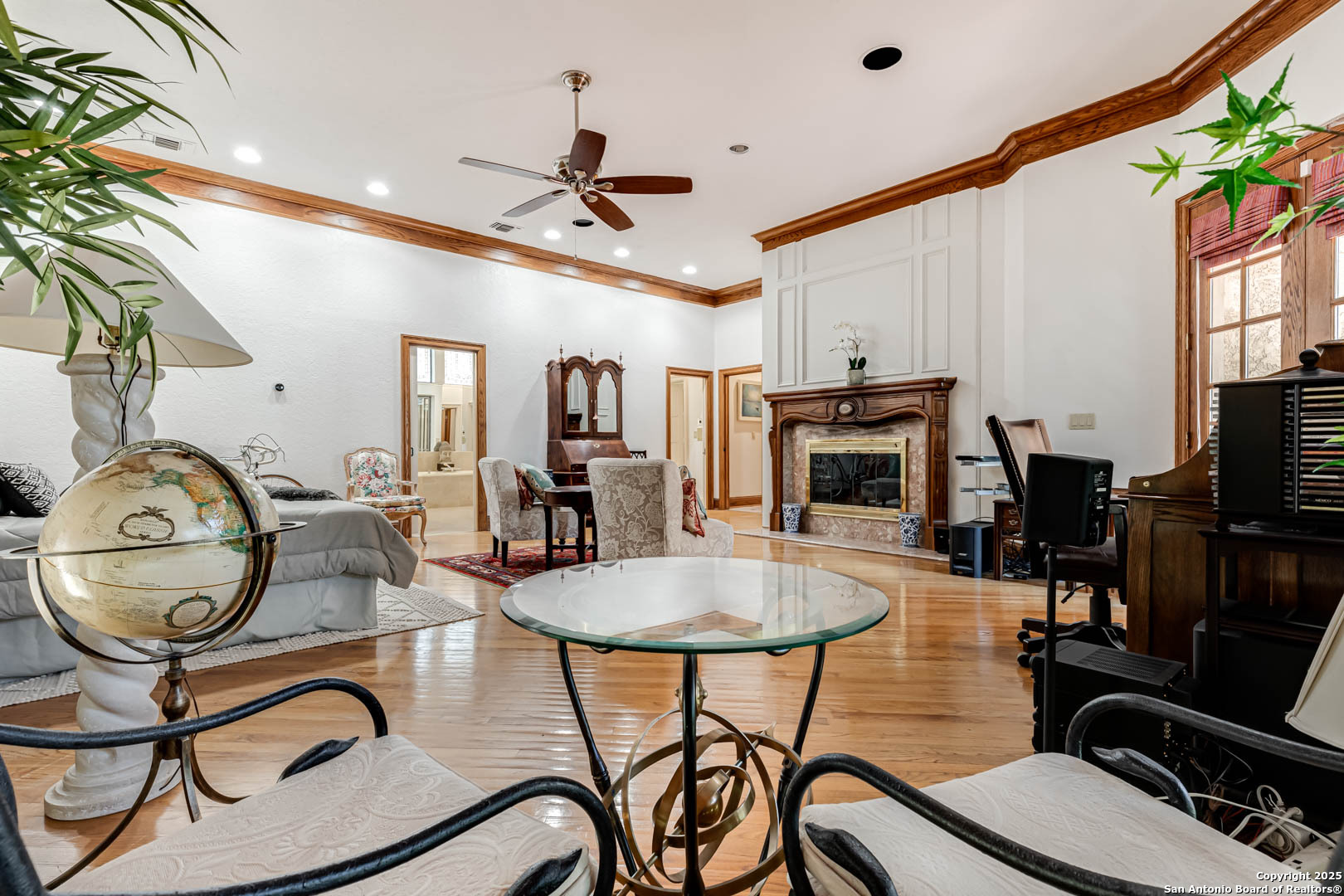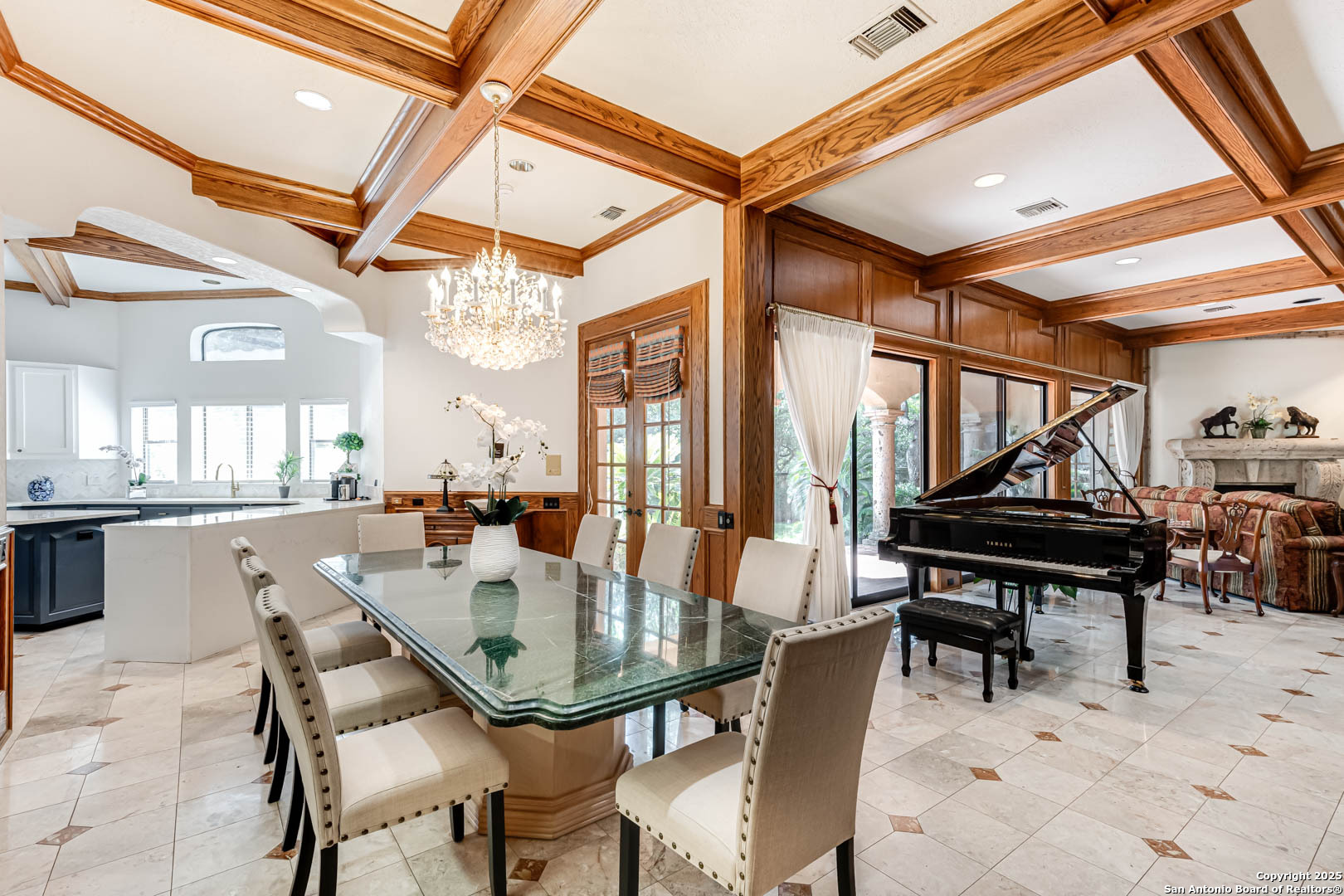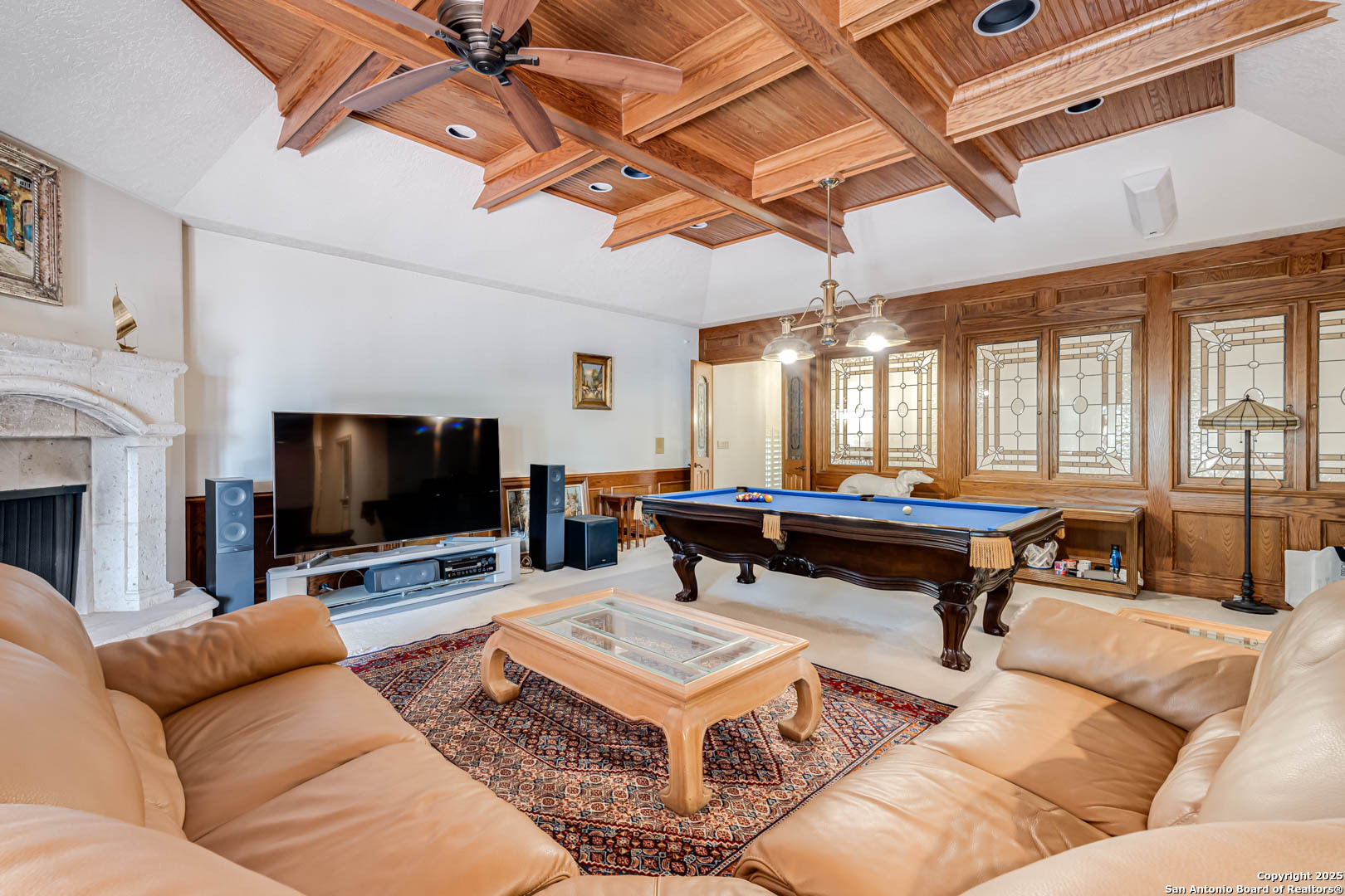 Set along one of Elm Creek's most distinguished streets, this extraordinary home offers a level of craftsmanship and architectural distinction that sets it apart. From the moment you arrive, the cantera stone driveway and dramatic port cochere make a lasting impression. Multiple cantera stone columns, both inside and out, add a timeless, grand feel throughout the property. Inside, a soaring two-story foyer welcomes you with rich marble floors, coffered ceilings, and detailed crown molding-setting the stage for elegant living and entertaining. The open-concept design includes a spectacular built-in bar and flows seamlessly into the living and dining areas-perfect for gatherings large or small. The chef's kitchen is a showstopper, featuring contrasting custom cabinetry, gleaming white countertops, and a full suite of stainless steel appliances designed for both beauty and function. Downstairs, you'll find three spacious en suite bedrooms, including a private primary suite with its own sitting area and access to the outdoors. The spa-like bath pampers with dual vanities and a deep soaking tub. Upstairs, a cozy game room with a fireplace opens to an oversized covered balcony-ideal for relaxing evenings. Tucked away on the second level is a hidden gem: an L-shaped cedar-lined closet with built-in gun shelving and ample storage, offering discreet, secure organization with a custom touch. Other highlights include a covered patio for outdoor entertaining, a spacious three-car garage, and thoughtful details throughout that reflect the care and artistry of true custom construction. This is more than a home-it's a rare opportunity to own a statement property in one of San Antonio's most established and sought-after neighborhoods.