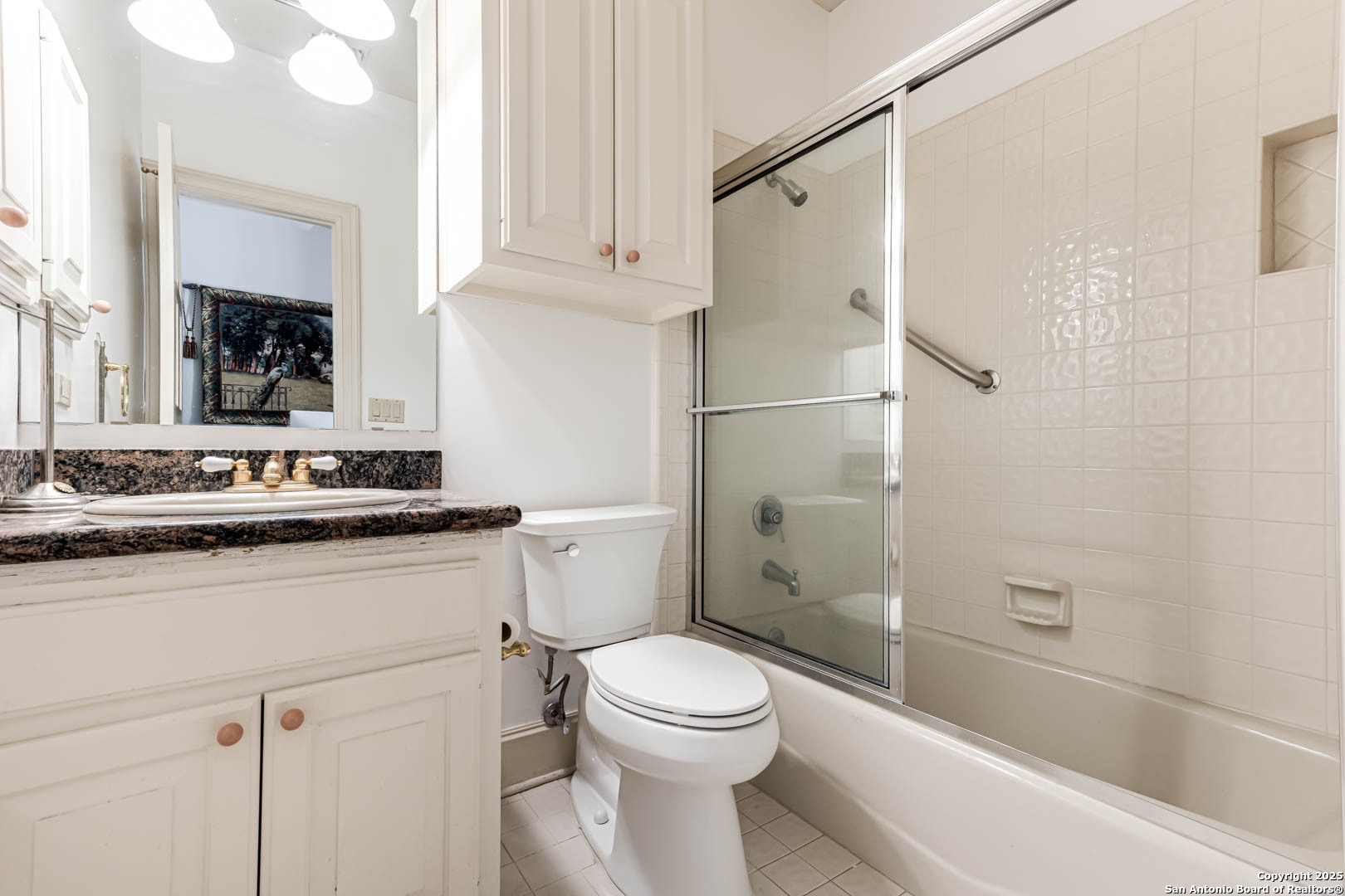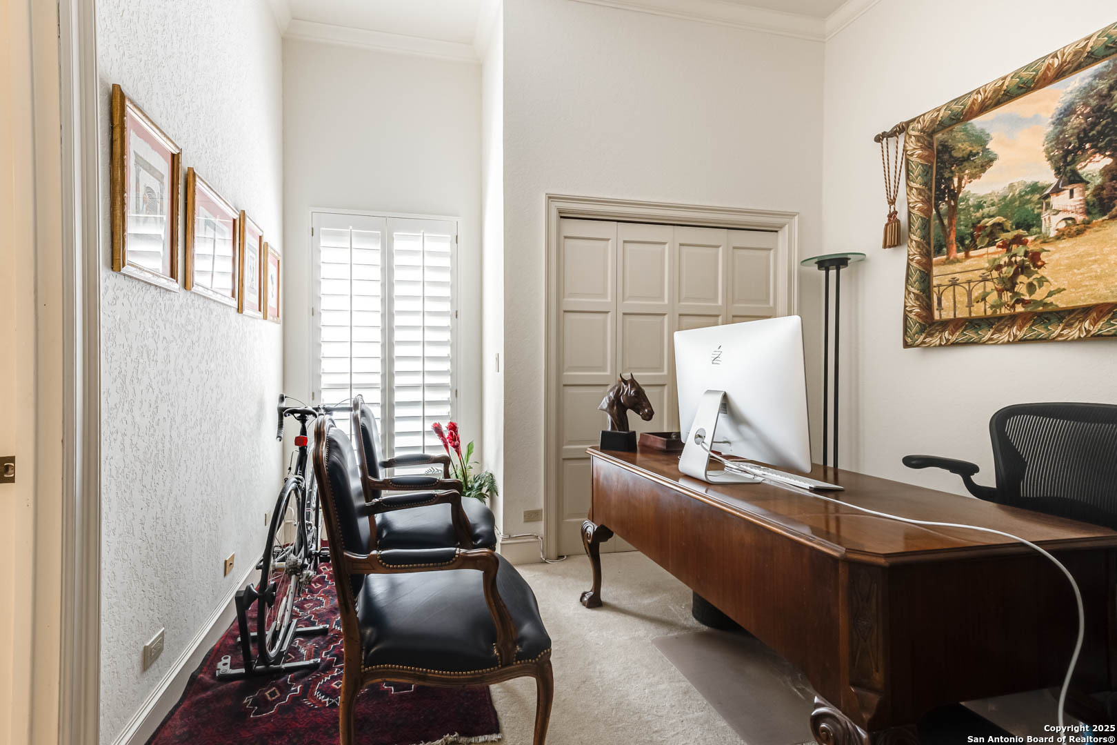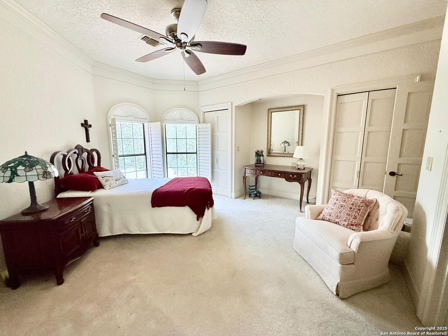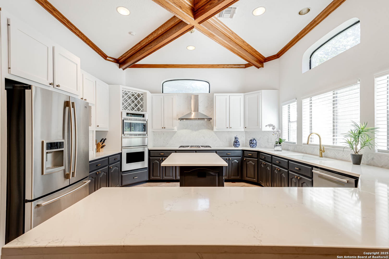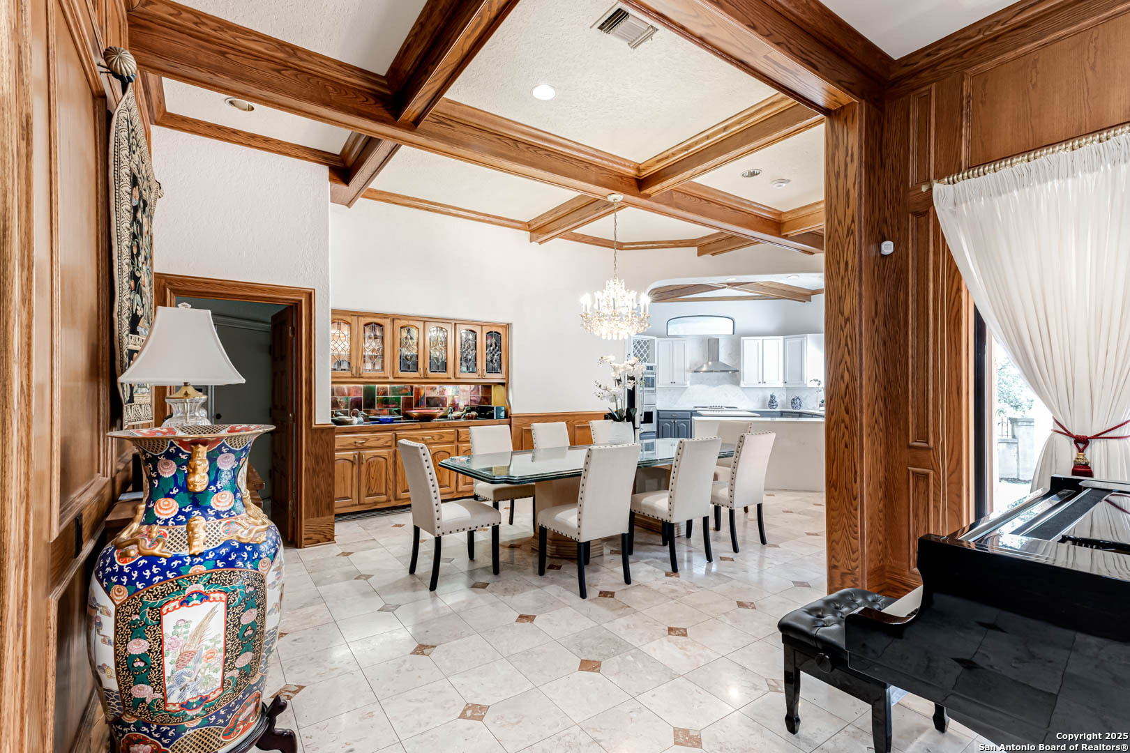 Set along one of Elm Creek's most distinguished streets, this extraordinary home offers a level of craftsmanship and architectural distinction that sets it apart. From the moment you arrive, the cantera stone driveway and dramatic port cochere make a lasting impression. Multiple cantera stone columns, both inside and out, add a timeless, grand feel throughout the property. Inside, a soaring two-story foyer welcomes you with rich marble floors, coffered ceilings, and detailed crown molding-setting the stage for elegant living and entertaining. The open-concept design includes a spectacular built-in bar and flows seamlessly into the living and dining areas-perfect for gatherings large or small. The chef's kitchen is a showstopper, featuring contrasting custom cabinetry, gleaming white countertops, and a full suite of stainless steel appliances designed for both beauty and function. Downstairs, you'll find three spacious en suite bedrooms, including a private primary suite with its own sitting area and access to the outdoors. The spa-like bath pampers with dual vanities and a deep soaking tub. Upstairs, a cozy game room with a fireplace opens to an oversized covered balcony-ideal for relaxing evenings. Tucked away on the second level is a hidden gem: an L-shaped cedar-lined closet with built-in gun shelving and ample storage, offering discreet, secure organization with a custom touch. Other highlights include a covered patio for outdoor entertaining, a spacious three-car garage, and thoughtful details throughout that reflect the care and artistry of true custom construction. This is more than a home-it's a rare opportunity to own a statement property in one of San Antonio's most established and sought-after neighborhoods.