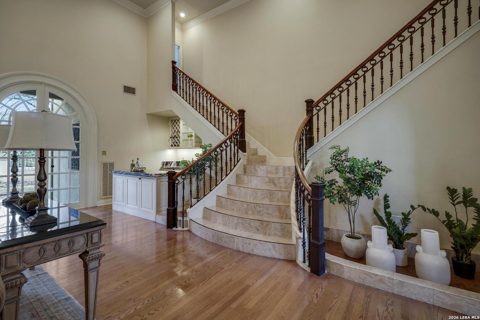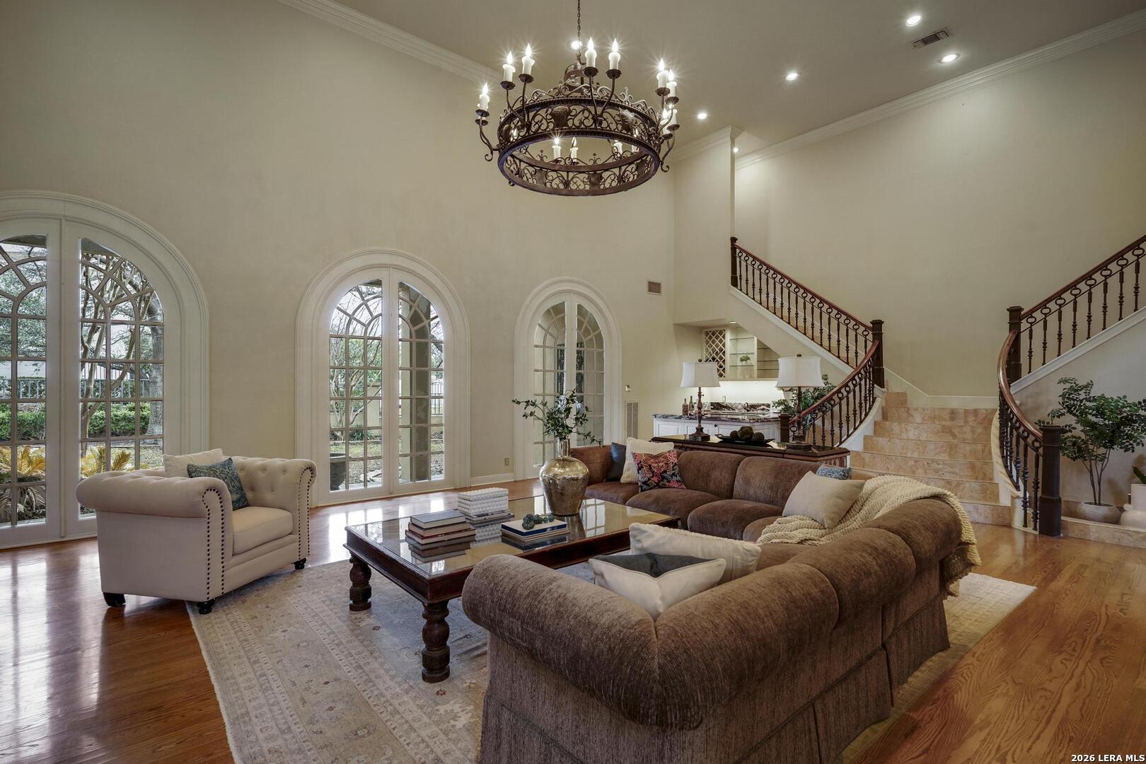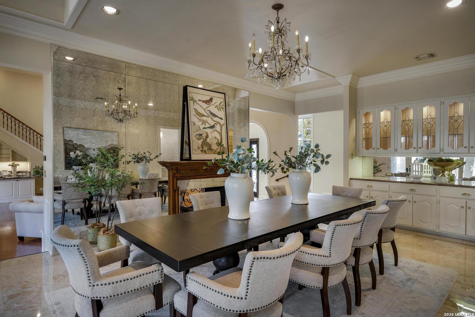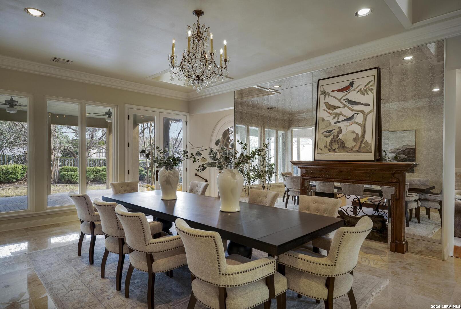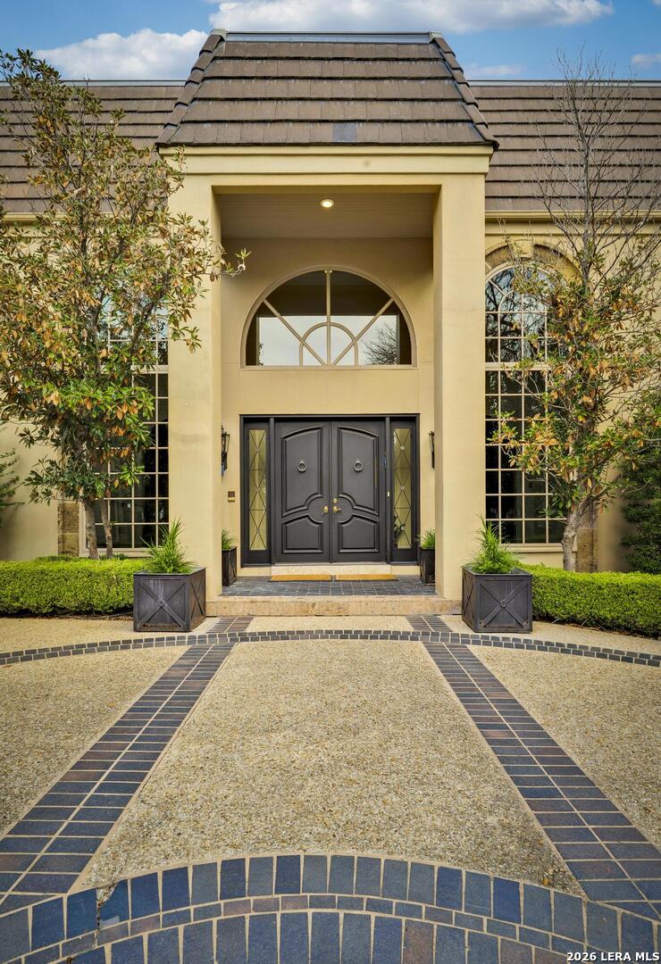 Experience elevated living in this elegant four-bedroom, five-bathroom luxury estate, featuring an architecturally French-inspired design. Nestled in the exclusive and secure neighborhood of Elm Creek, this immaculate residence is thoughtfully crafted with both sophistication and comfort in mind. A stunning, climate-controlled indoor pool stretching 63 feet in length provides a private oasis for relaxation and recreation year-round. Grand living spaces are adorned with top-tier finishes, creating a perfect blend of elegance and tranquility throughout the residence. Each of the opulent bedrooms and designer bathrooms exudes serene luxury. The gourmet chef's kitchen is appointed with custom cabinetry and luxury appliances, ideal for preparing exceptional meals. Adjacent to the kitchen, the banquet-sized dining room is enhanced by a lovely passthrough fireplace, offering a warm and inviting ambiance for gatherings. The great room is filled with ambient light and features soaring ceilings, creating an open and airy atmosphere. A beautiful view of the tiled, expansive covered patio can be enjoyed from this space, making it perfect for outdoor entertainment in comfort and style. The regal master suite on the first floor is appointed with a spa-inspired en-suite bathroom, providing a true retreat. The first floor also features a gracious guest bedroom with a private bath next door, along with a comfortable, airy office that gives a quiet space for work or relaxation. A flexible bonus space was created above the office which can be used as a workout room, craft room or additional bedroom. Ascending the magnificent stairway to the second level, you are greeted by two additional generously sized bedrooms and a spacious game room, perfect for recreation and entertainment.
