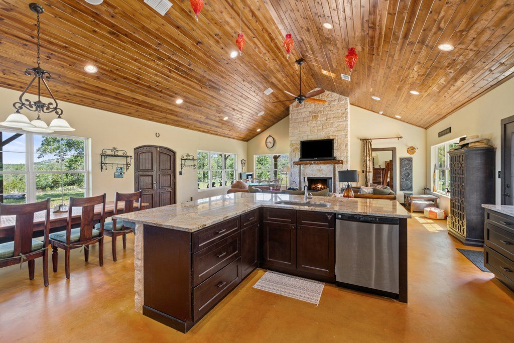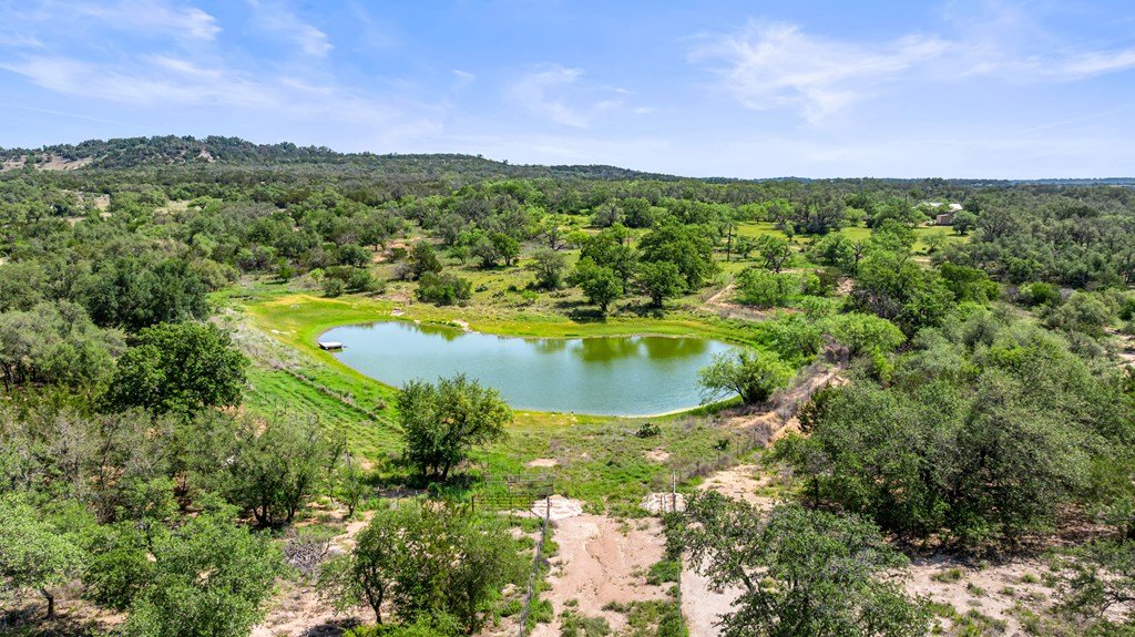 Discover the perfect blend of rustic charm and modern living on this stunning 60 acre unrestricted ranch, ideally situated just minutes from Johnson City in the heart of the Texas Hill Country. This property offers a rare opportunity to enjoy peaceful country living with the convenience of nearby amenities and attractions. The main residence is a beautifully designed dog-run style home featuring 4 spacious bedrooms, 2.5 bathrooms, and rich stained concrete floors throughout. The open-concept kitchen is perfect for entertaining, with stylish finishes and ample space for gatherings. Step out onto the expansive front porch and take in breathtaking views of the rolling Hill Country landscape. There is also a nice sized storage shed close to main home. A large pond attracts abundant wildlife, offering excellent opportunities for nature watching or recreational hunting. Additional improvements include a well-appointed barn with a 2-bedroom, 1-bath apartment ideal for guest quarters, a rental opportunity, or ranch staff.