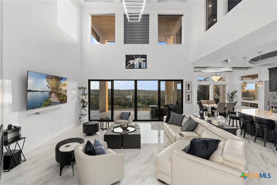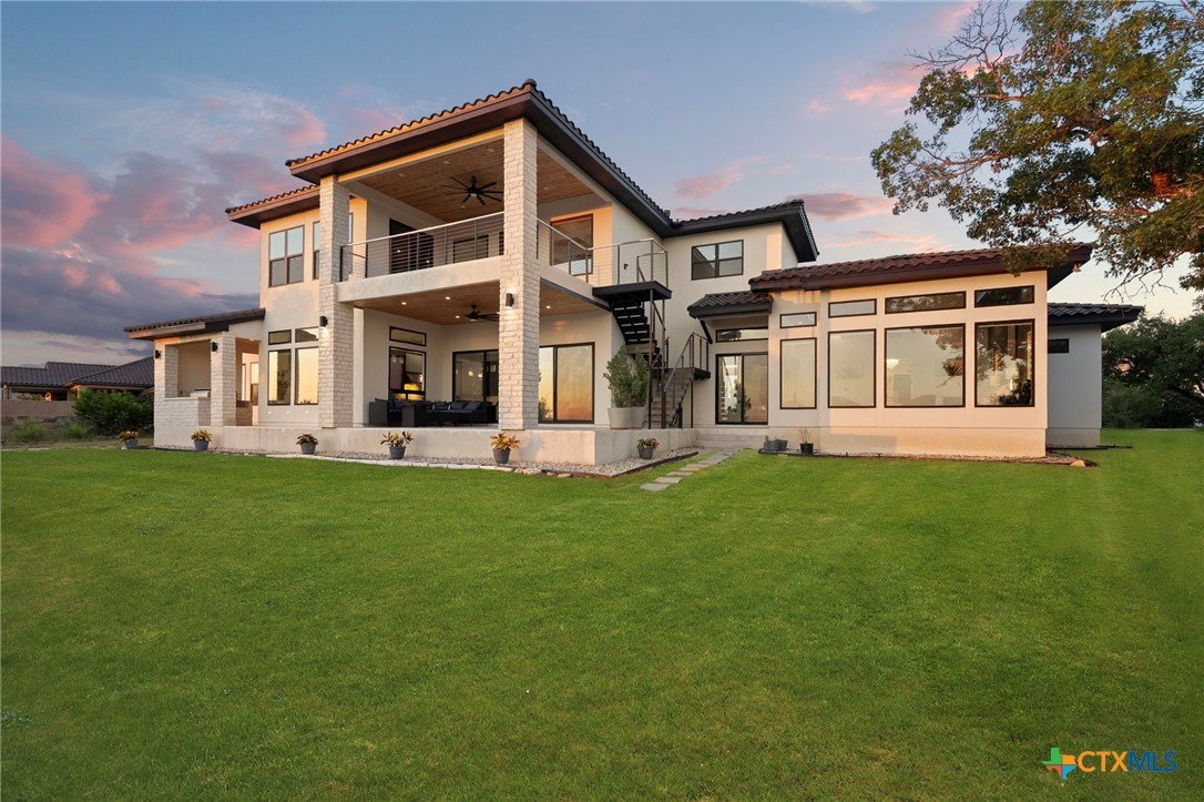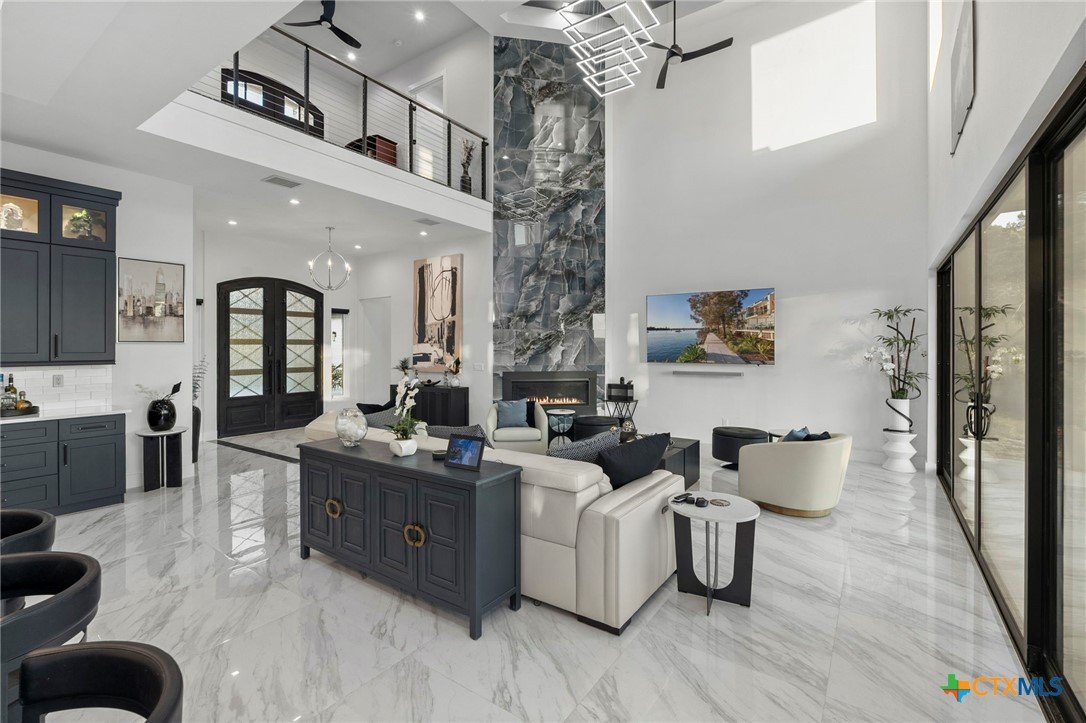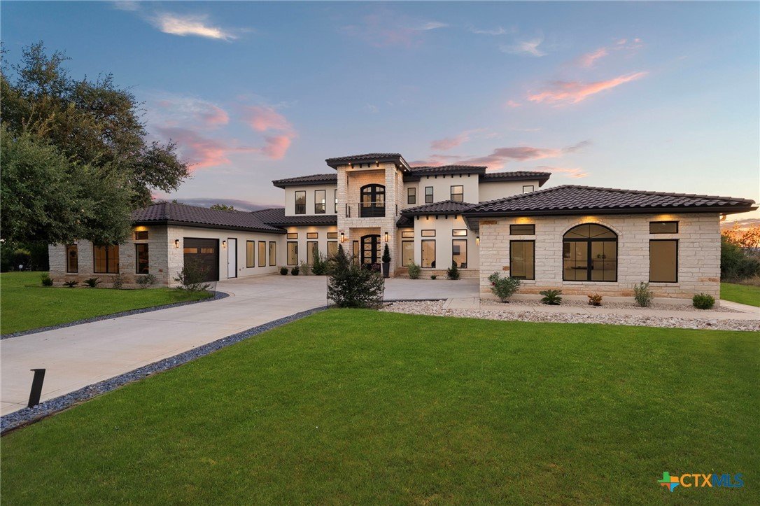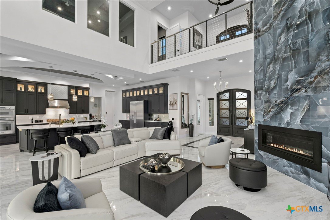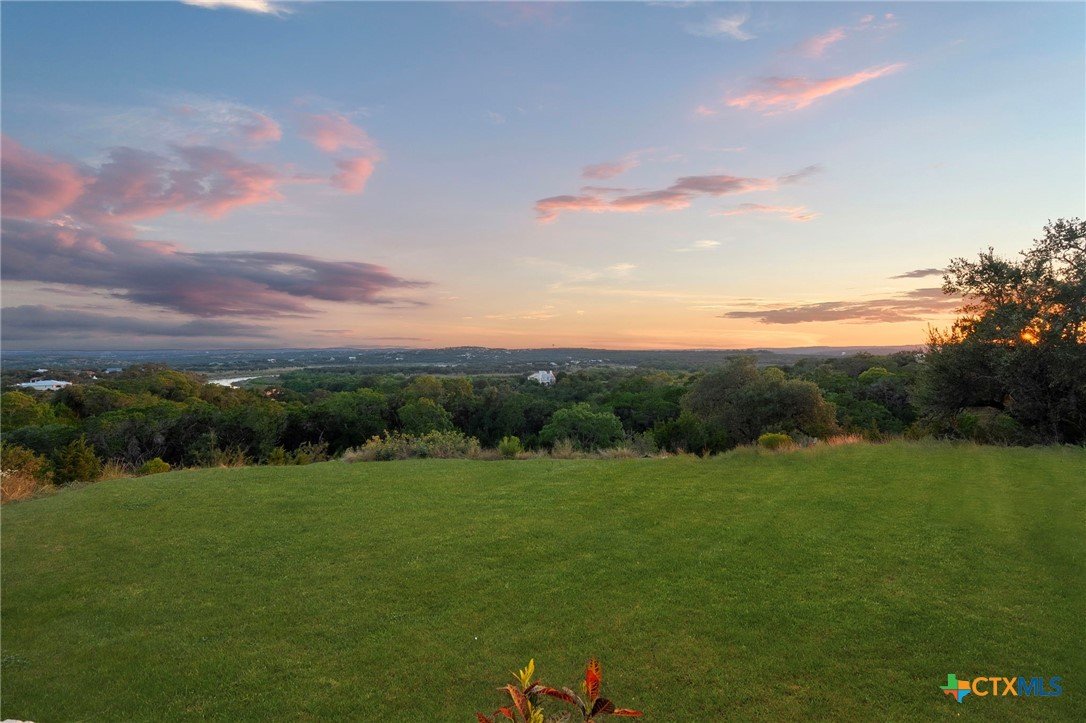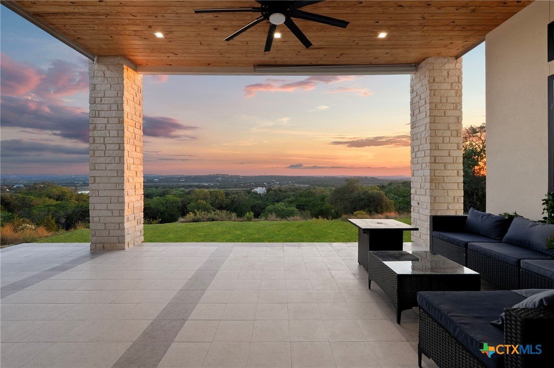Experience the pinnacle of Hill Country luxury in this breathtaking custom residence, located in the prestigious gated community of The Peninsula at Mystic Shores. Set atop a private 3.62-acre hilltop lot, this immaculate two-story home offers stunning panoramic views of the Hill Country and Guadalupe River. Step through a grand 9-foot double iron door into an open-concept floor plan designed to impress. The living room features a striking 22 foot floor-to-ceiling porcelain tile fireplace, adding a sleek and sophisticated focal point to the heart of the home. Custom ceiling designs throughout the home further elevate the architectural detail and aesthetic appeal. Perfect for entertaining, the gourmet kitchen boasts a massive center island, high-end Thermador stainless steel appliances-including a professional gas cooktop and vent hood-custom cabinetry with ample storage, quartz countertops, a large pantry, and an undermount sink. The luxurious primary suite offers oversized picture windows that frame daily sunsets and breathtaking views. The en-suite bathroom features an expansive walk-in shower with dual rain showerheads, 12 body jets, floor-to-ceiling porcelain tile, and a stand-alone soaking tub separated by a tiled pony wall. Dual vanities, a dedicated makeup station, and a generous walk-in closet complete this elegant retreat. Four additional bedrooms each include walk-in closets and private en-suite bathrooms. A dedicated office space opens to the patio via a sleek sliding glass door, while the upstairs loft and media room provide additional room for relaxation or entertainment. Enjoy outdoor living with both a covered patio and upper balcony offering uninterrupted Hill Country views. The full outdoor kitchen is ideal for dining and entertaining. Additional features include a spacious 3-car garage, high-end water softener system, a WiFi-controlled irrigation system, and tankless water heater providing endless hot water.