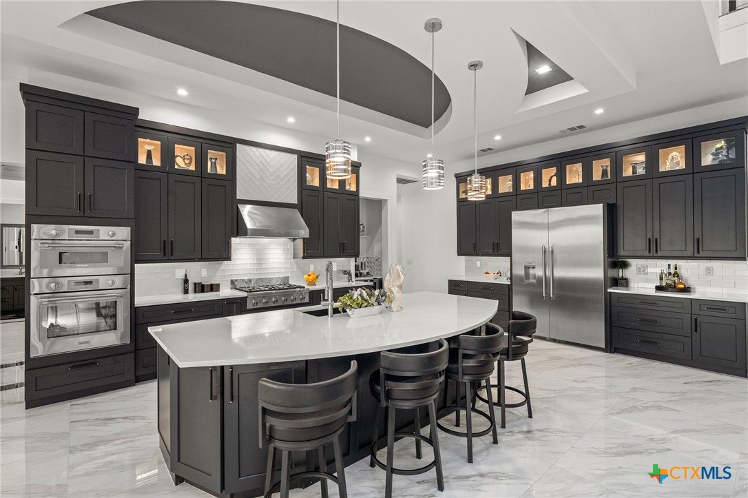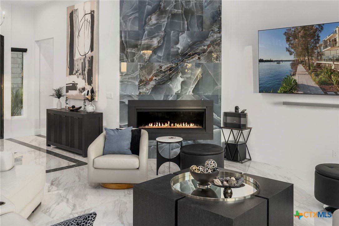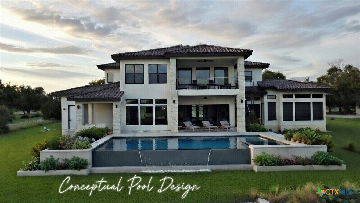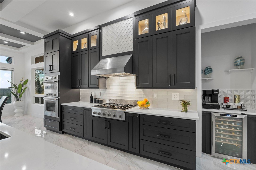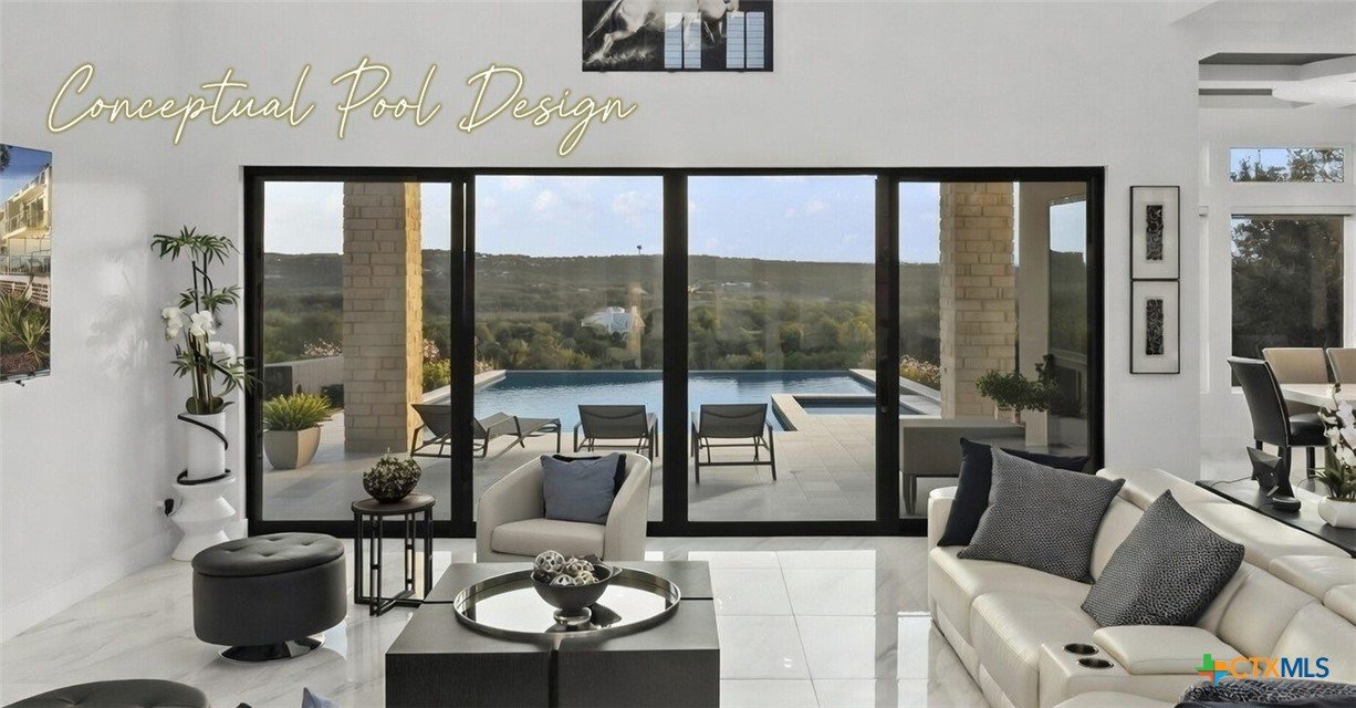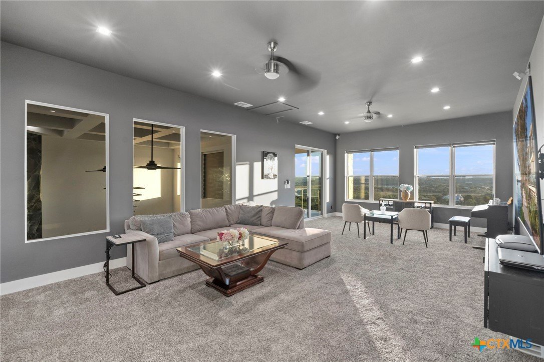 Experience the pinnacle of Hill Country luxury in this breathtaking custom residence, located in the prestigious gated community of The Peninsula at Mystic Shores. Set atop a private 3.62-acre hilltop lot, this immaculate two-story home offers stunning panoramic views of the Hill Country and Guadalupe River. Step through a grand 9-foot double iron door into an open-concept floor plan designed to impress. The living room features a striking 22 foot floor-to-ceiling porcelain tile fireplace, adding a sleek and sophisticated focal point to the heart of the home. Custom ceiling designs throughout the home further elevate the architectural detail and aesthetic appeal. Perfect for entertaining, the gourmet kitchen boasts a massive center island, high-end Thermador stainless steel appliances-including a professional gas cooktop and vent hood-custom cabinetry with ample storage, quartz countertops, a large pantry, and an undermount sink. The luxurious primary suite offers oversized picture windows that frame daily sunsets and breathtaking views. The en-suite bathroom features an expansive walk-in shower with dual rain showerheads, 12 body jets, floor-to-ceiling porcelain tile, and a stand-alone soaking tub separated by a tiled pony wall. Dual vanities, a dedicated makeup station, and a generous walk-in closet complete this elegant retreat. Four additional bedrooms each include walk-in closets and private en-suite bathrooms. A dedicated office space opens to the patio via a sleek sliding glass door, while the upstairs loft and media room provide additional room for relaxation or entertainment. Enjoy outdoor living with both a covered patio and upper balcony offering uninterrupted Hill Country views. The full outdoor kitchen is ideal for dining and entertaining. Additional features include a spacious 3-car garage, high-end water softener system, a WiFi-controlled irrigation system, and tankless water heater providing endless hot water.