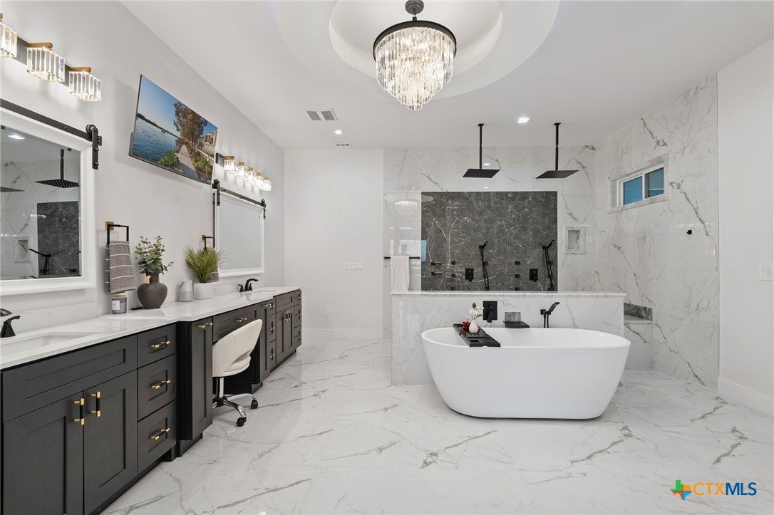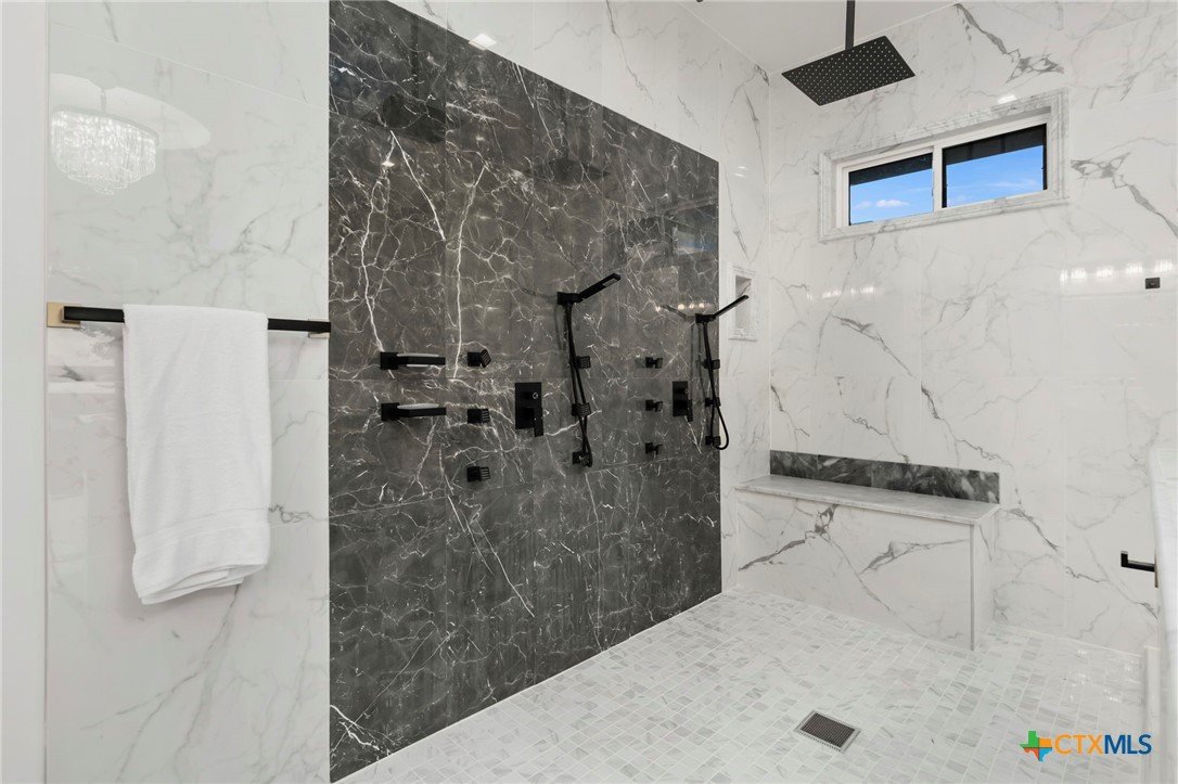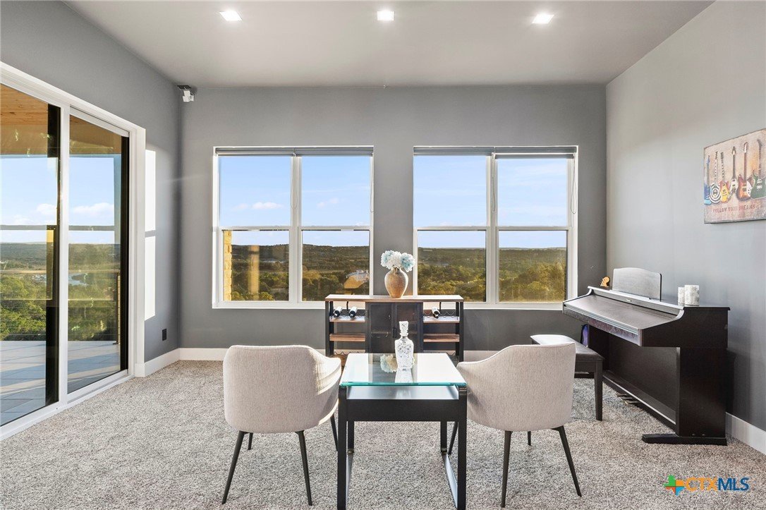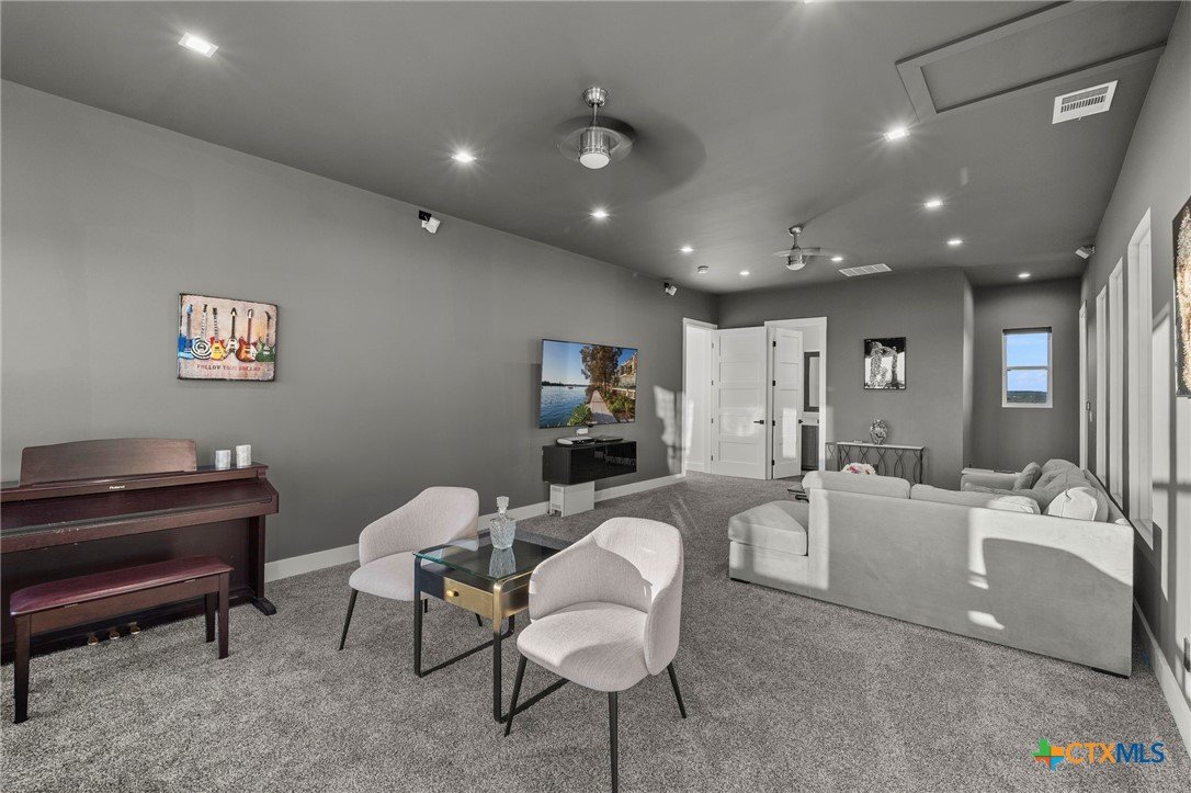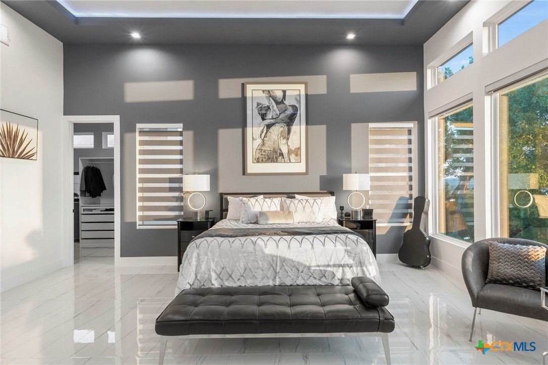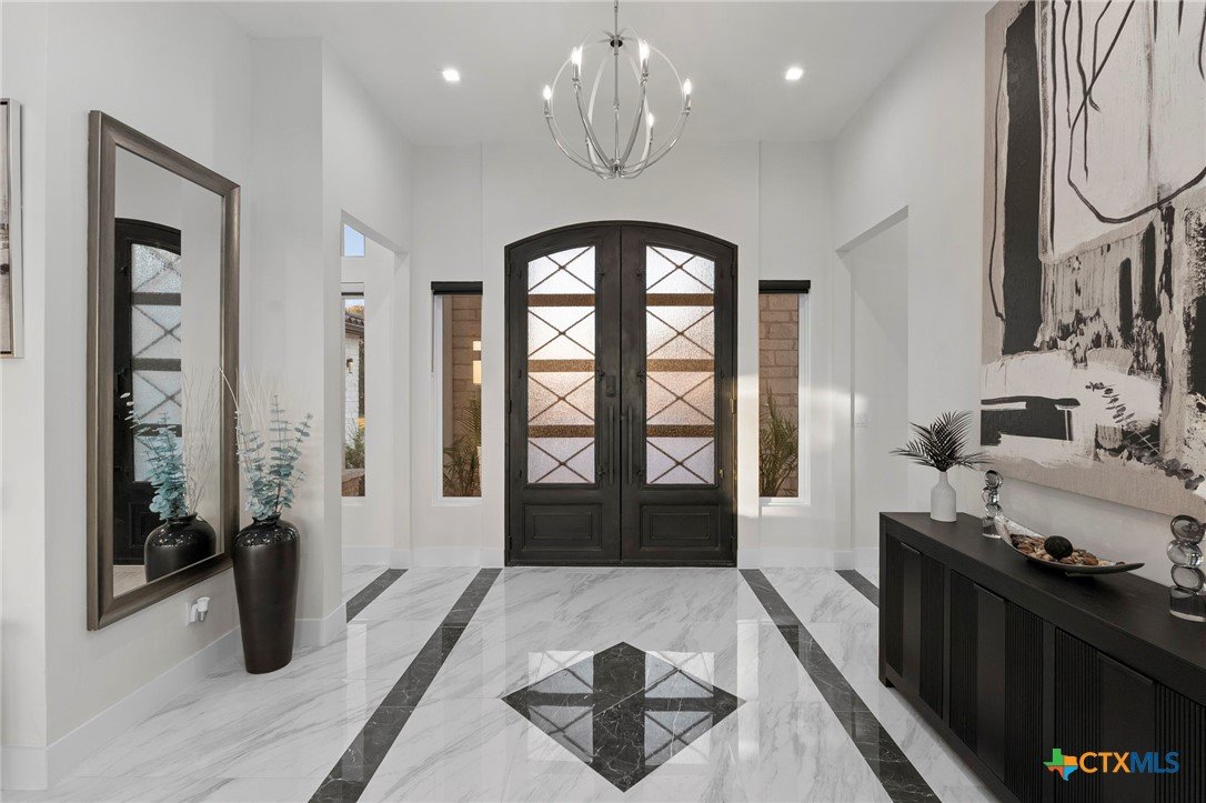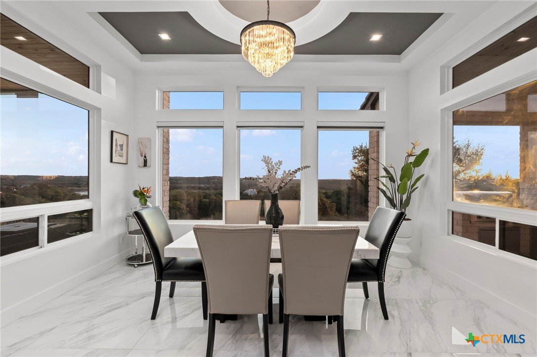 Experience the pinnacle of Hill Country luxury in this breathtaking custom residence, located in the prestigious gated community of The Peninsula at Mystic Shores. Set atop a private 3.62-acre hilltop lot, this immaculate two-story home offers stunning panoramic views of the Hill Country and Guadalupe River. Step through a grand 9-foot double iron door into an open-concept floor plan designed to impress. The living room features a striking 22 foot floor-to-ceiling porcelain tile fireplace, adding a sleek and sophisticated focal point to the heart of the home. Custom ceiling designs throughout the home further elevate the architectural detail and aesthetic appeal. Perfect for entertaining, the gourmet kitchen boasts a massive center island, high-end Thermador stainless steel appliances-including a professional gas cooktop and vent hood-custom cabinetry with ample storage, quartz countertops, a large pantry, and an undermount sink. The luxurious primary suite offers oversized picture windows that frame daily sunsets and breathtaking views. The en-suite bathroom features an expansive walk-in shower with dual rain showerheads, 12 body jets, floor-to-ceiling porcelain tile, and a stand-alone soaking tub separated by a tiled pony wall. Dual vanities, a dedicated makeup station, and a generous walk-in closet complete this elegant retreat. Four additional bedrooms each include walk-in closets and private en-suite bathrooms. A dedicated office space opens to the patio via a sleek sliding glass door, while the upstairs loft and media room provide additional room for relaxation or entertainment. Enjoy outdoor living with both a covered patio and upper balcony offering uninterrupted Hill Country views. The full outdoor kitchen is ideal for dining and entertaining. Additional features include a spacious 3-car garage, high-end water softener system, a WiFi-controlled irrigation system, and tankless water heater providing endless hot water.