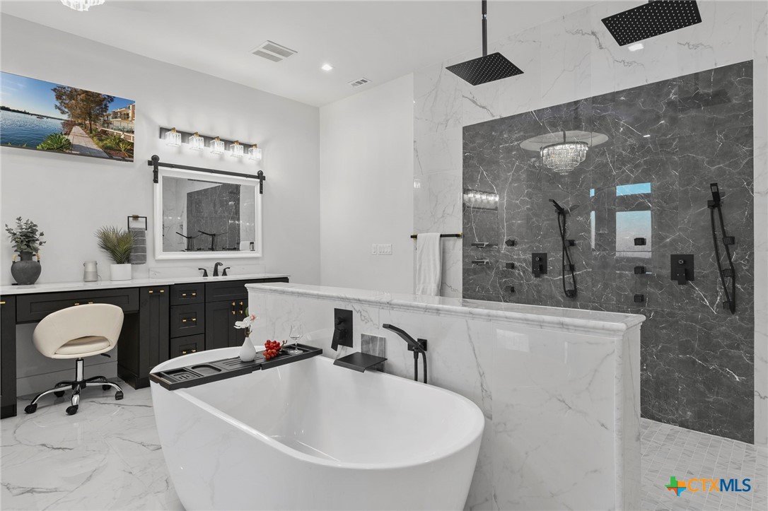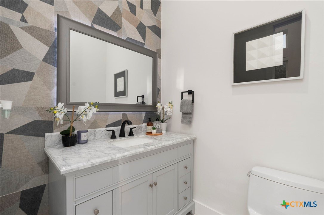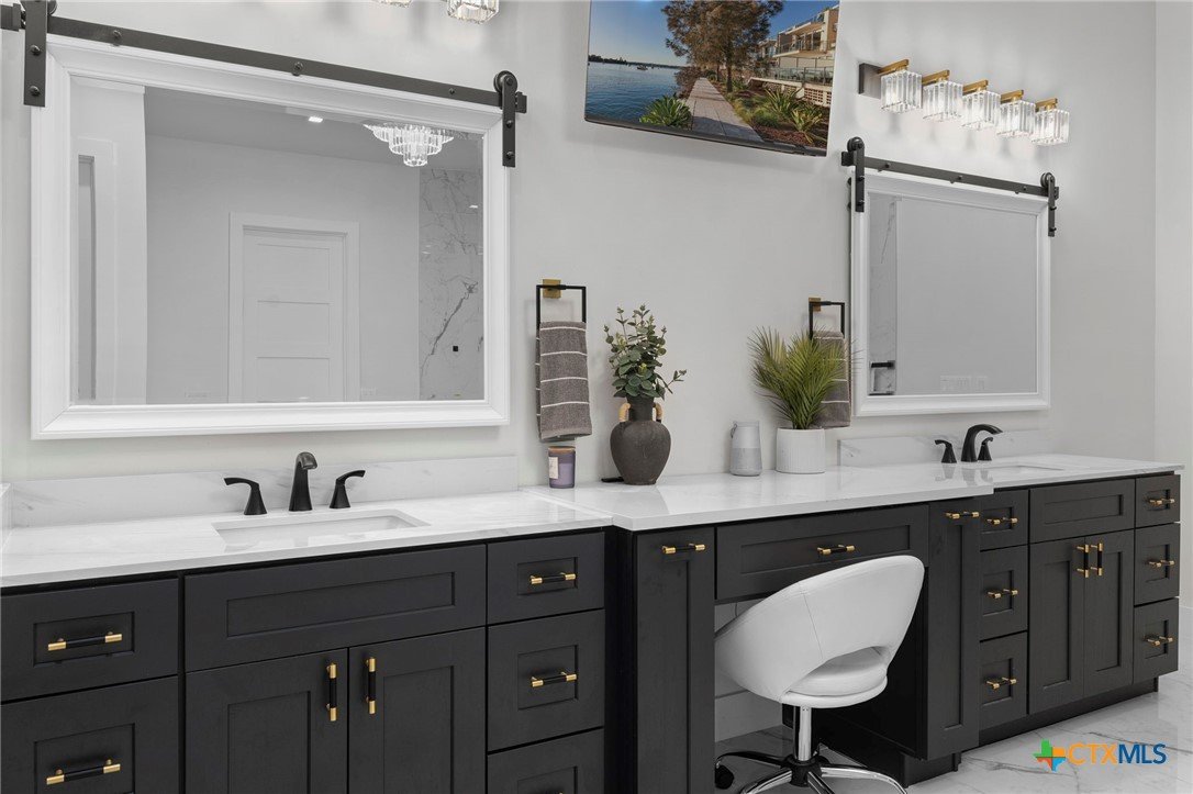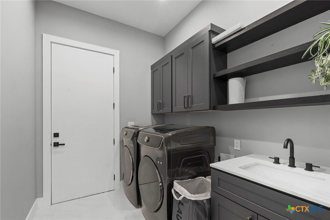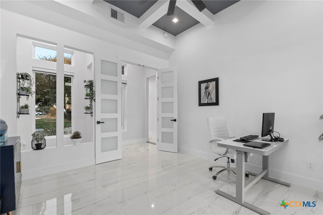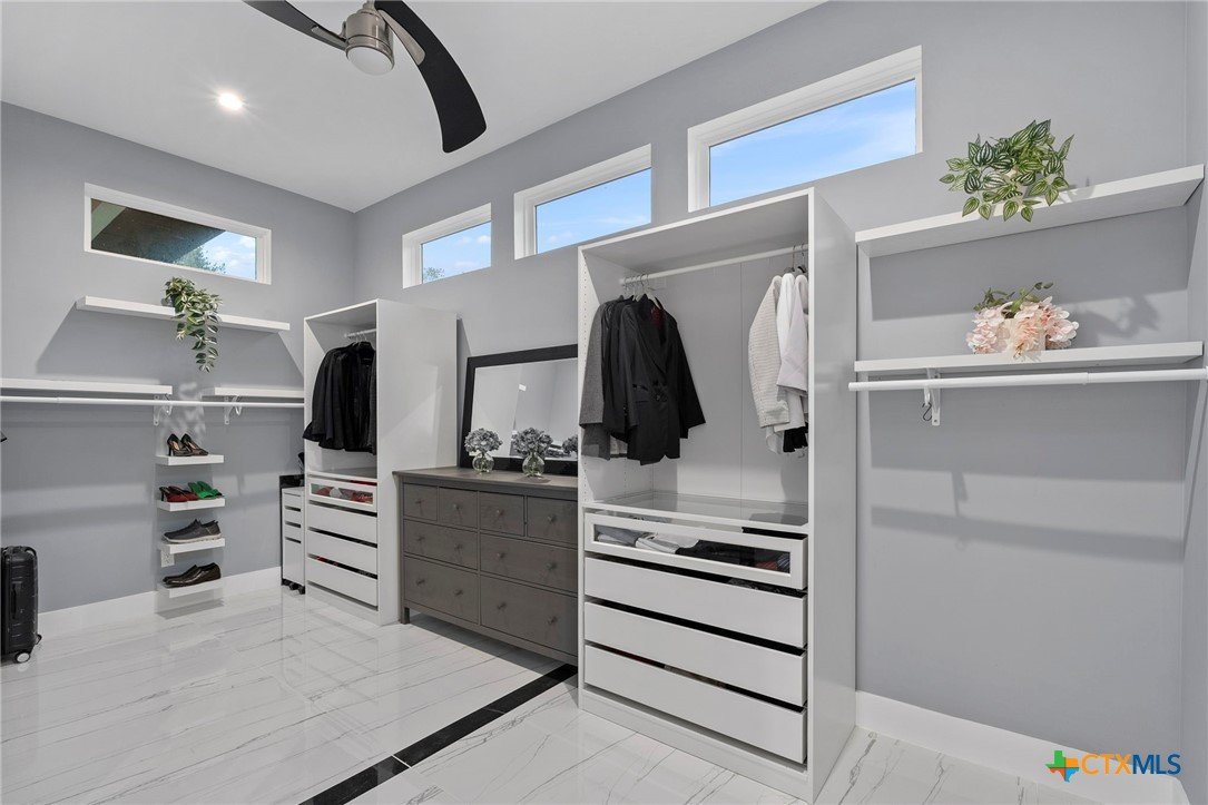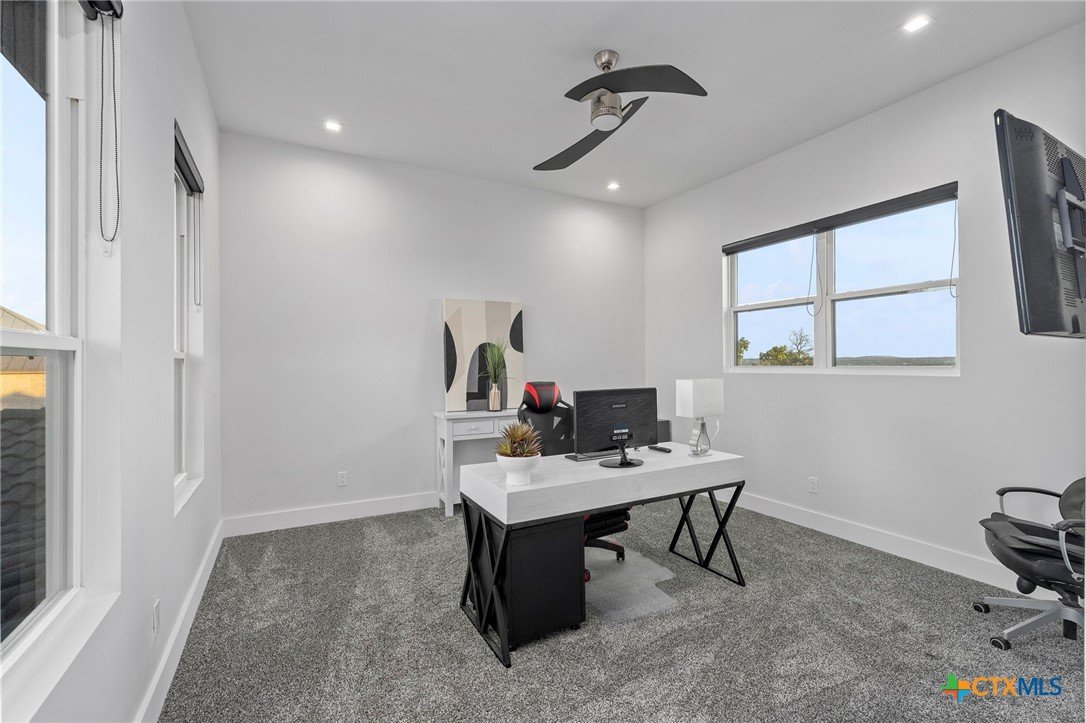 Experience the pinnacle of Hill Country luxury in this breathtaking custom residence, located in the prestigious gated community of The Peninsula at Mystic Shores. Set atop a private 3.62-acre hilltop lot, this immaculate two-story home offers stunning panoramic views of the Hill Country and Guadalupe River. Step through a grand 9-foot double iron door into an open-concept floor plan designed to impress. The living room features a striking 22 foot floor-to-ceiling porcelain tile fireplace, adding a sleek and sophisticated focal point to the heart of the home. Custom ceiling designs throughout the home further elevate the architectural detail and aesthetic appeal. Perfect for entertaining, the gourmet kitchen boasts a massive center island, high-end Thermador stainless steel appliances-including a professional gas cooktop and vent hood-custom cabinetry with ample storage, quartz countertops, a large pantry, and an undermount sink. The luxurious primary suite offers oversized picture windows that frame daily sunsets and breathtaking views. The en-suite bathroom features an expansive walk-in shower with dual rain showerheads, 12 body jets, floor-to-ceiling porcelain tile, and a stand-alone soaking tub separated by a tiled pony wall. Dual vanities, a dedicated makeup station, and a generous walk-in closet complete this elegant retreat. Four additional bedrooms each include walk-in closets and private en-suite bathrooms. A dedicated office space opens to the patio via a sleek sliding glass door, while the upstairs loft and media room provide additional room for relaxation or entertainment. Enjoy outdoor living with both a covered patio and upper balcony offering uninterrupted Hill Country views. The full outdoor kitchen is ideal for dining and entertaining. Additional features include a spacious 3-car garage, high-end water softener system, a WiFi-controlled irrigation system, and tankless water heater providing endless hot water.