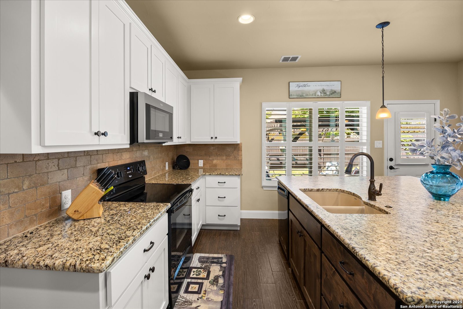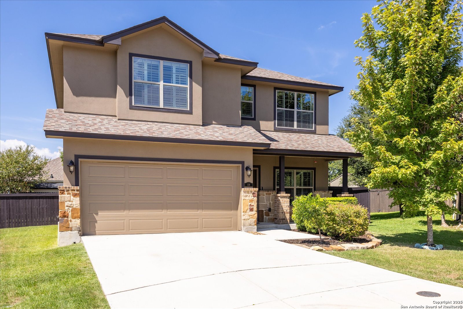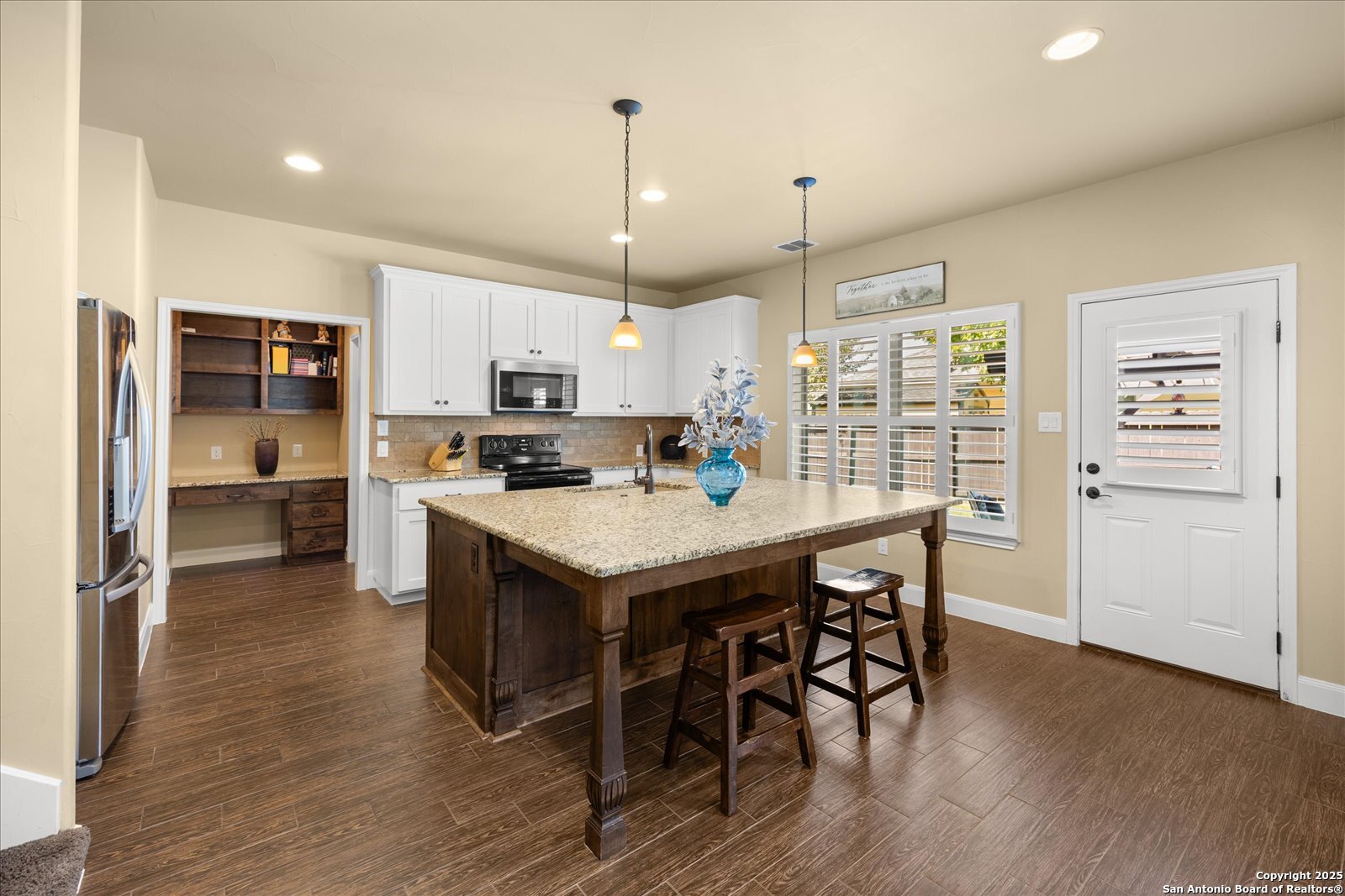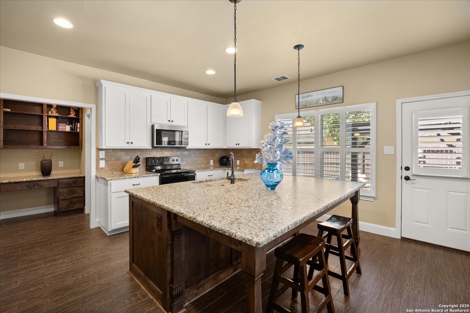 Welcome to this beautifully maintained, spacious home offering the perfect blend of comfort and style. Featuring two generous living areas, this home provides plenty of room to relax, entertain, and create lasting memories. The heart of the home is the gorgeous kitchen, highlighting a striking 7x7 granite island that's perfect for gatherings, cooking, and casual dining. Plantation shutters grace every window, bathing the space in soft, natural light while adding timeless elegance throughout. Stay organized and inspired with two built-in desk areas complete with ample storage-ideal for remote work, homework, or creative projects. Situated on a quiet cul-de-sac, this home offers a serene retreat away from the hustle and bustle. Step outside to a spacious backyard, equipped with a full sprinkler system to keep your lawn lush and green year-round. Whether you're hosting summer barbecues or enjoying peaceful evenings under the stars, unleash your imagination in this highly versatile space. The family-friendly neighborhood features scenic trails and a playground, perfect for kids and nature lovers alike. Enjoy unparalleled convenience with HEB, Walmart and St Peters just under 3 miles away, and Boerne High School only 1 mile from your doorstep. This is more than a house-it's your next chapter.