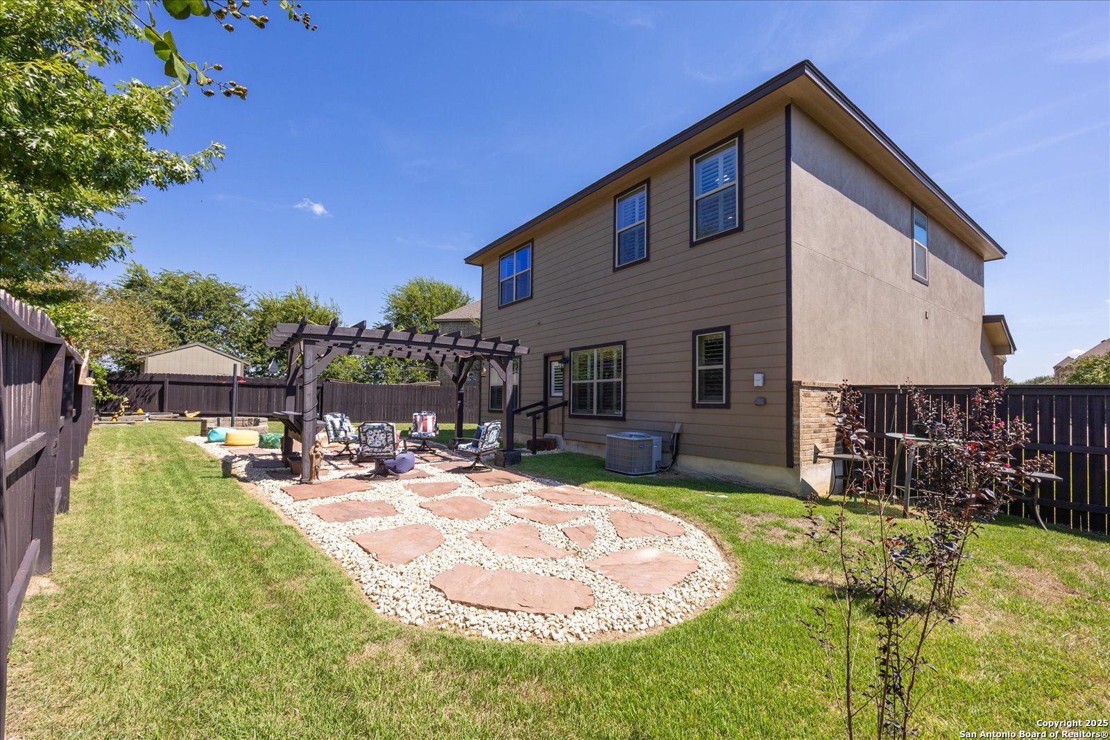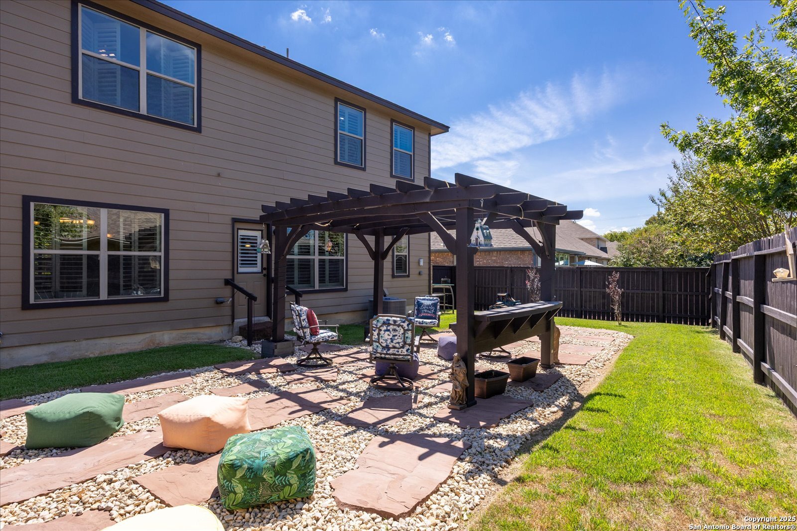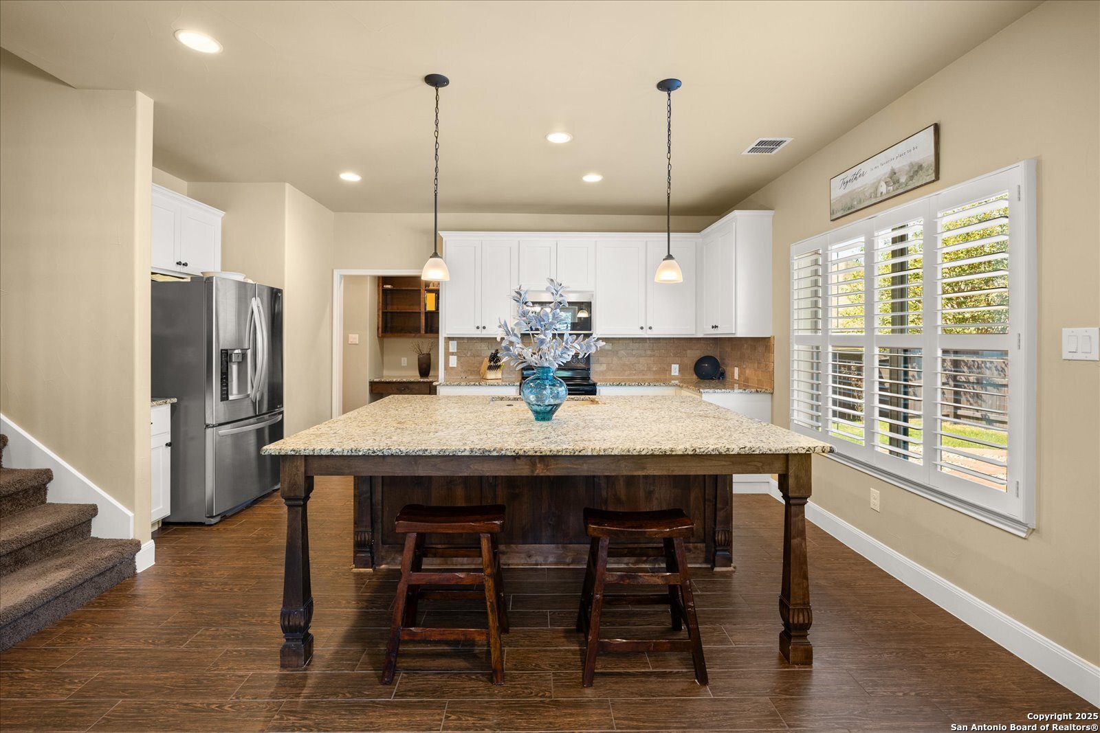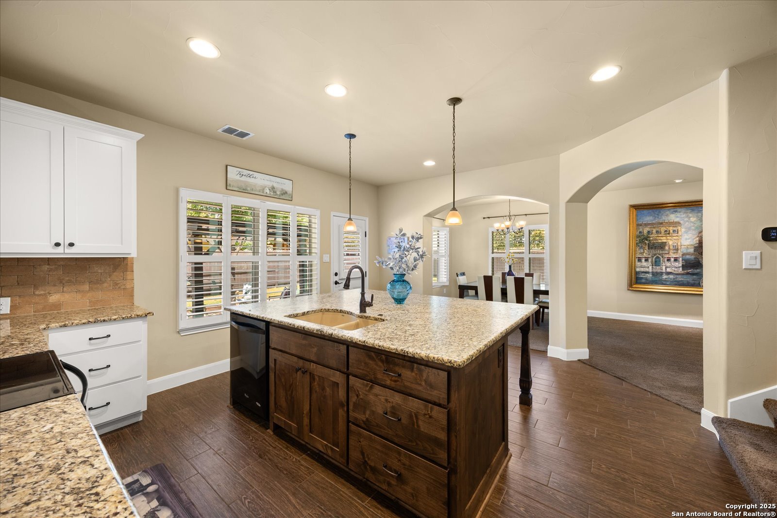 Welcome to this beautifully maintained, spacious home offering the perfect blend of comfort and style. Featuring two generous living areas, this home provides plenty of room to relax, entertain, and create lasting memories. The heart of the home is the gorgeous kitchen, highlighting a striking 7x7 granite island that's perfect for gatherings, cooking, and casual dining. Plantation shutters grace every window, bathing the space in soft, natural light while adding timeless elegance throughout. Stay organized and inspired with two built-in desk areas complete with ample storage-ideal for remote work, homework, or creative projects. Situated on a quiet cul-de-sac, this home offers a serene retreat away from the hustle and bustle. Step outside to a spacious backyard, equipped with a full sprinkler system to keep your lawn lush and green year-round. Whether you're hosting summer barbecues or enjoying peaceful evenings under the stars, unleash your imagination in this highly versatile space. The family-friendly neighborhood features scenic trails and a playground, perfect for kids and nature lovers alike. Enjoy unparalleled convenience with HEB, Walmart and St Peters just under 3 miles away, and Boerne High School only 1 mile from your doorstep. This is more than a house-it's your next chapter.