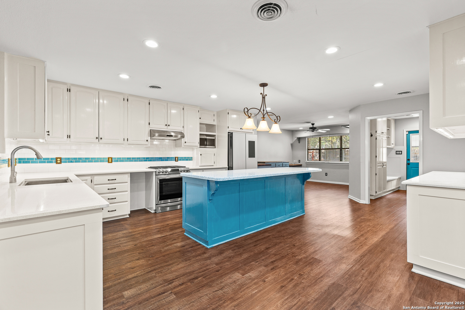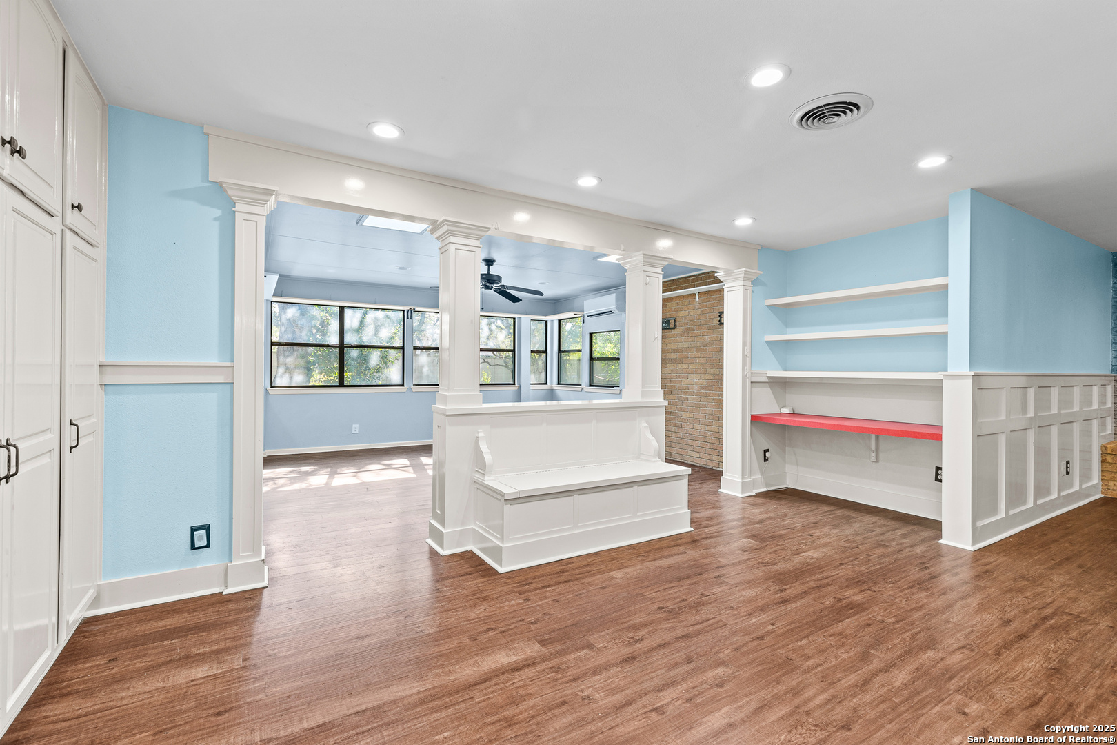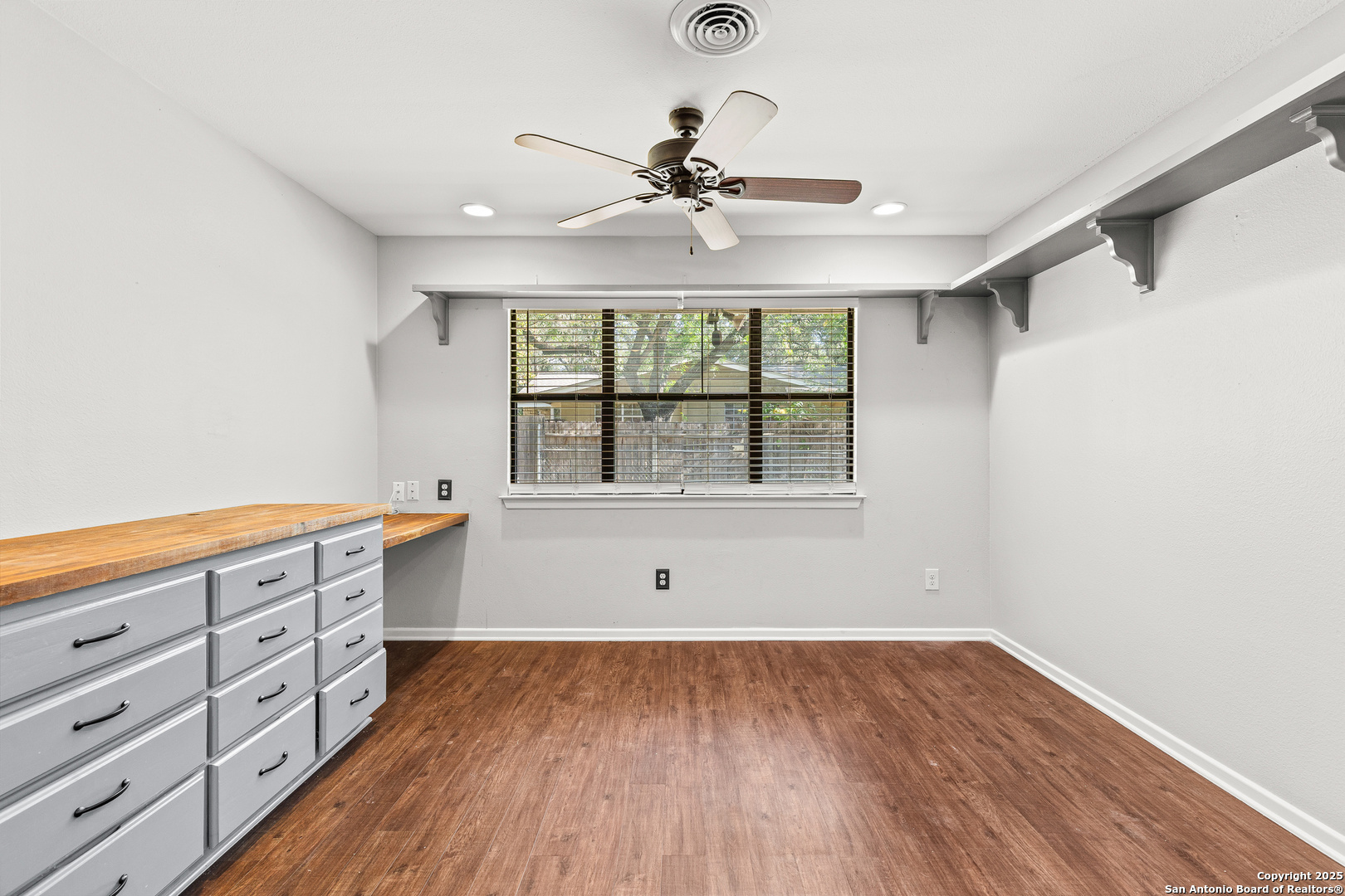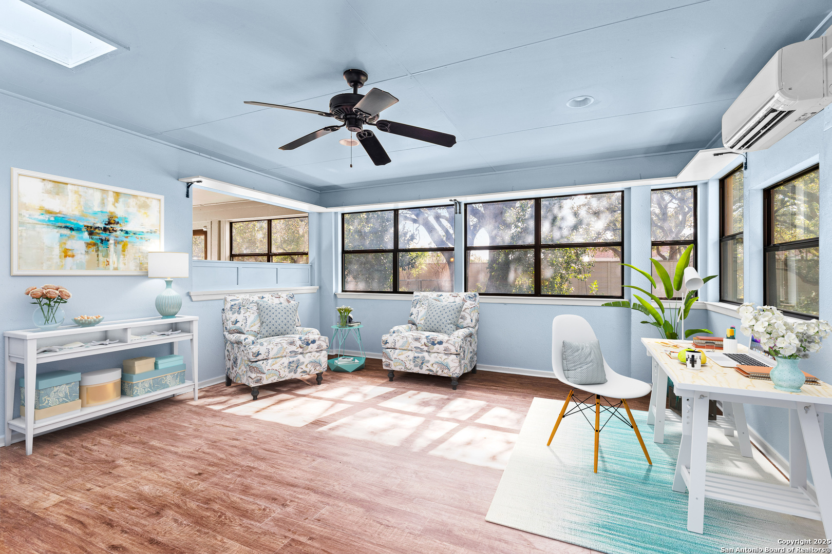 Looking for a home with space for your home office, playroom, yoga studio, workout room, or creative retreat for your hobbies? This approximately 3,400-SF home offers abundant flexibility to enhance every stage of life, as well as an assumable low-rate VA loan. Along with multiple versatile areas, you'll find exceptional storage for crafts, tools, and more, keeping everything organized and within easy reach. The heart of the home is a spacious open-plan living area anchored by the wood-burning fireplace, seamlessly connected to the island kitchen. Here, acres of quartz counters, custom cabinetry, stainless-steel appliances, and under-mount lighting make cooking, entertaining, and everyday living a joy. The dining area, walk-in pantry, utility room, and bright sunroom/family room flow easily from the kitchen, creating a functional and inviting layout. The private bedroom wing includes a serene primary bedroom with en-suite bath, along with comfortable guest bedrooms, all featuring brand-new, plush carpeting. Tucked away from the main living areas, the bedrooms provide peace and quiet when it's time to unwind. Step outside to the fenced back yard shaded by oak trees and with plenty of open space for kids and pets to play. Park your RV on the pad behind the gate and store your gear in the mudroom. The office and workshop have easy-clean formica walls, sinks, and storage cabinets. This home combines generous square footage, thoughtful design, and a warm, welcoming atmosphere, ready to complement your lifestyle. Hollywood Park has its own police and fire departments, and a voluntary homeowners association. There is a clubhouse, a shaded pavilion with outdoor grills, three swimming pools, a splash pad, a playground, two tennis courts, a regulation basketball court, and a volleyball court. Residents also enjoy year-round community events that make it easy to connect with neighbors and kids, such as visits from Santa and Mrs. Claus, safe Halloween outdoor trails, parades, and Easter egg hunts.
