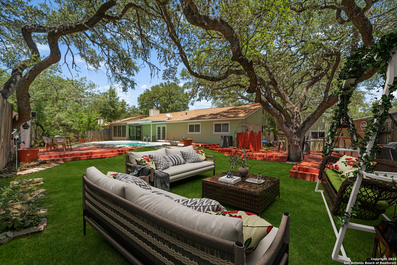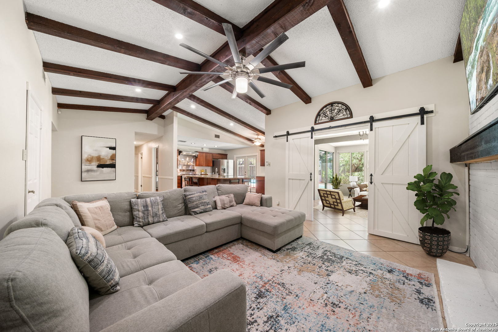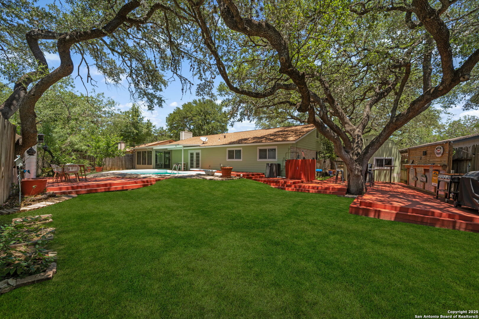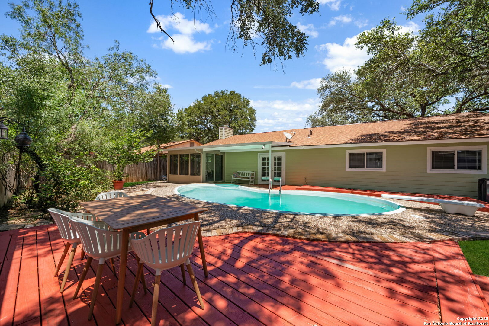 Come tour this beautiful, well maintained home that is tucked away in a culdesac in Tanglewood located off I-10 and De Zavala. Rare find of a 1/4-acre lot that has the perfect blend of charm, space, and convenience. Step inside to find soaring vaulted ceilings with rich wood beams, a large living area with custom barn doors, and a seamless open layout perfect for entertaining. The chef's kitchen is a true showstopper-boasting granite countertops, stainless steel appliances, a gas range, wine fridge, and an oversized island with seating. Whether you're cooking for family or hosting guests, this space delivers. Step outside to your private backyard oasis complete with mature oaks, an expansive deck, and a sparkling in-ground pool-ideal for summer lounging and weekend gatherings. This home offers the rare opportunity to own a spacious, character-filled property with modern touches in one of the most convenient areas of Northwest San Antonio. **ADDITIONAL 200 SF from sunroom not included in BCAD SF**