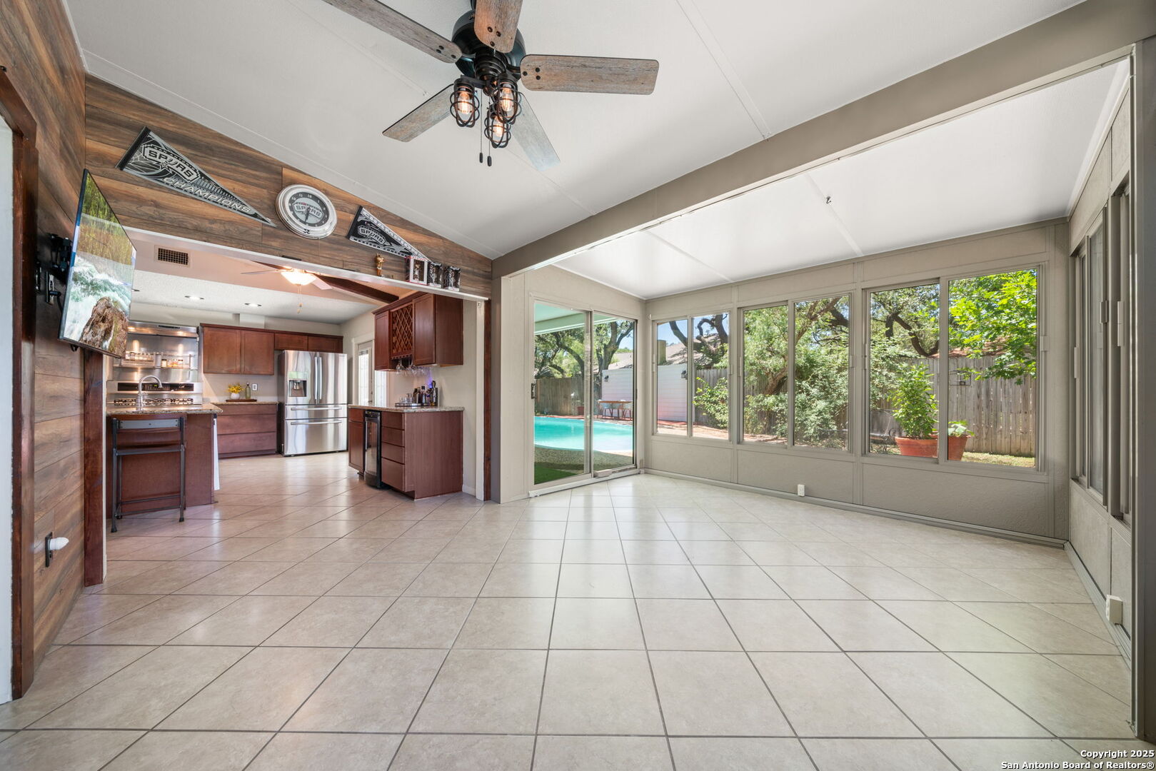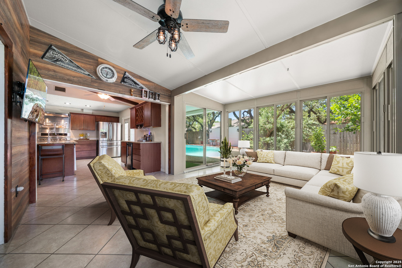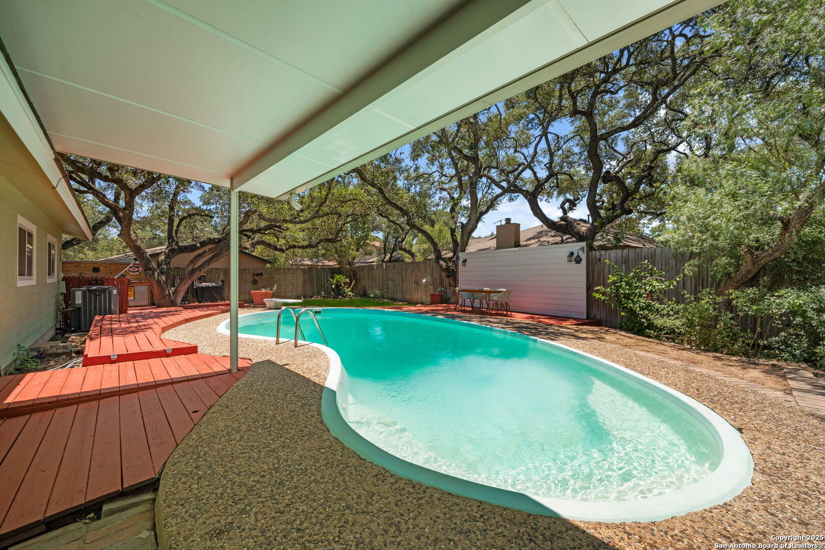 Come tour this beautiful, well maintained home that is tucked away in a culdesac in Tanglewood located off I-10 and De Zavala. Rare find of a 1/4-acre lot that has the perfect blend of charm, space, and convenience. Step inside to find soaring vaulted ceilings with rich wood beams, a large living area with custom barn doors, and a seamless open layout perfect for entertaining. The chef's kitchen is a true showstopper-boasting granite countertops, stainless steel appliances, a gas range, wine fridge, and an oversized island with seating. Whether you're cooking for family or hosting guests, this space delivers. Step outside to your private backyard oasis complete with mature oaks, an expansive deck, and a sparkling in-ground pool-ideal for summer lounging and weekend gatherings. This home offers the rare opportunity to own a spacious, character-filled property with modern touches in one of the most convenient areas of Northwest San Antonio. **ADDITIONAL 200 SF from sunroom not included in BCAD SF**