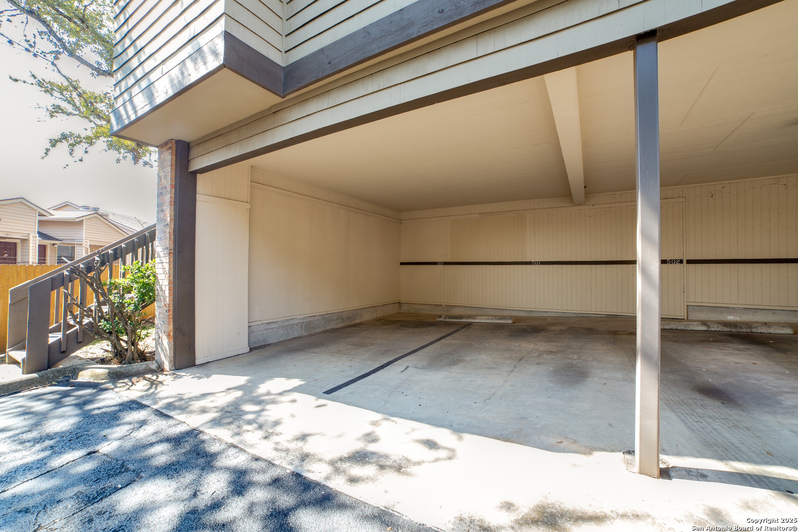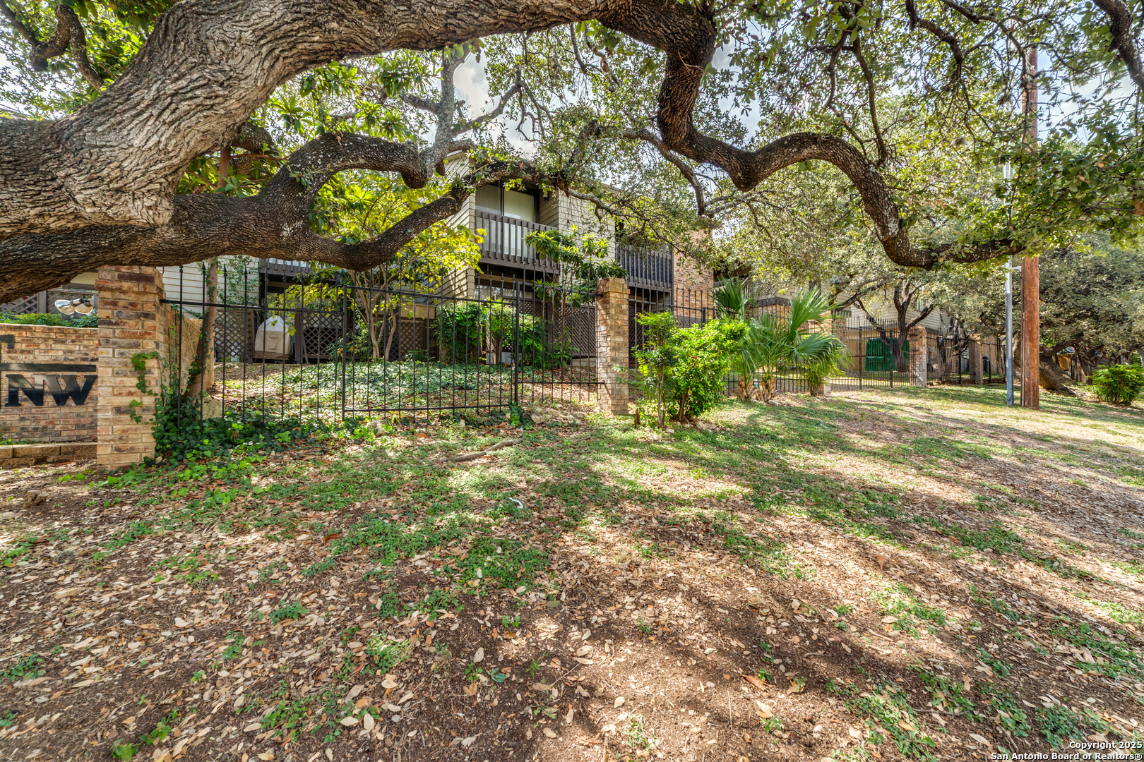 Nestled in the conveniently located and popular, gated community of Edgecliff NW is this great condo with more privacy than most, and mature trees throughout the neighborhood. Building E, Unit #501 is near the pool, but not so close that you're in the splash zone. This updated 2 bedroom, 2.5 bath home is flooded with light and features tile floors on the main floor and laminate flooring in the bedrooms, hall, and stairs. No smelly carpet here. There is a wood-burning FRPL in the step-down living room and pretty wood built-ins. The kitchen has warm granite counters, a large basin sink w/pull down faucet, lots of cabinets, a smooth cooktop stove, microwave, and a window box for growing plants or herbs. For casual dining, sit at the breakfast bar or enjoy the window view in the dining room with updated lighting. Upstairs features a skylight, vaulted ceilings, a cozy, covered balcony off the primary bedroom w/2 closets, and a large window seat in the secondary. Unique to this home compared to others, both upstairs bedrooms have en-suite bathrooms for comfort and extra privacy. There is a large storage closet under the stairs and an additional storage unit outside for all your extra holiday treasures. The HVAC and water heater have been replaced in recent years, and all appliances are included. The backyard features a partially covered patio, trees, and more privacy. Unit #501 includes a one-car carport/garage near the home's entrance. The monthly condo fees include water, sewer, trash, pest control & more. Edgecliff NW is conveniently located on Vance Jackson, near I10, Huebner Rd., Medical Center, USAA, shopping, restaurants, bus route transportation, and more. Lovely home with a great floor plan and style, ready for someone with an eye for design to make it their own. Seller will also consider assisting with closing costs.