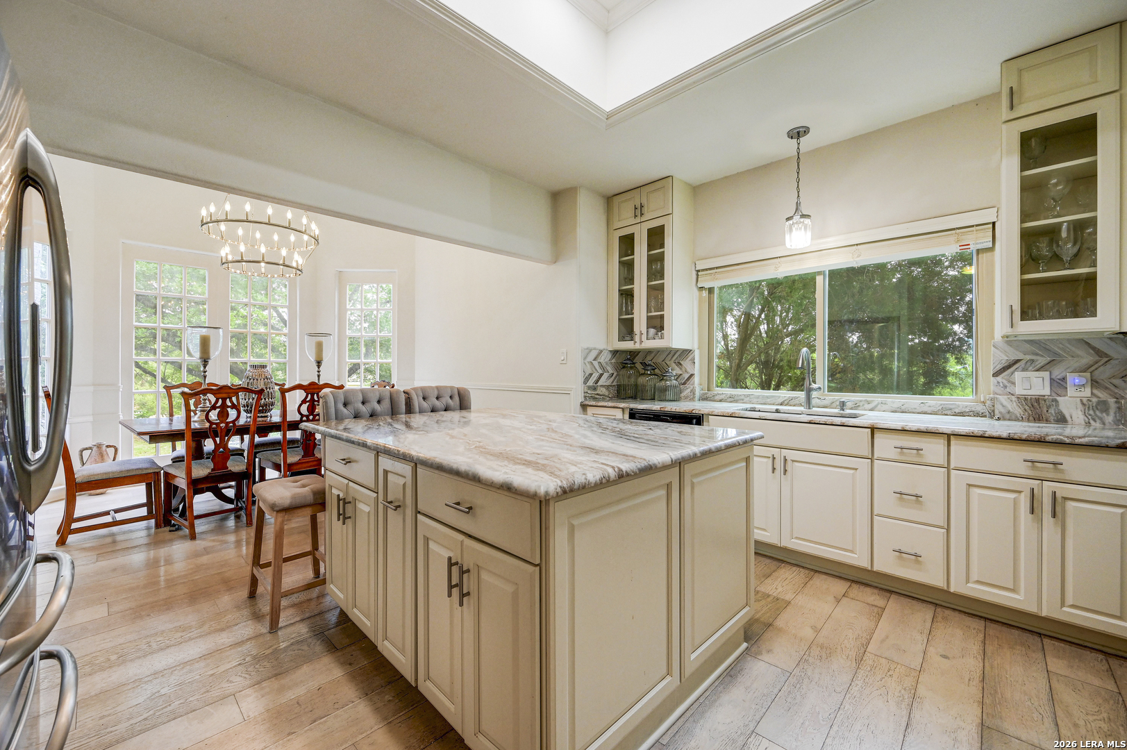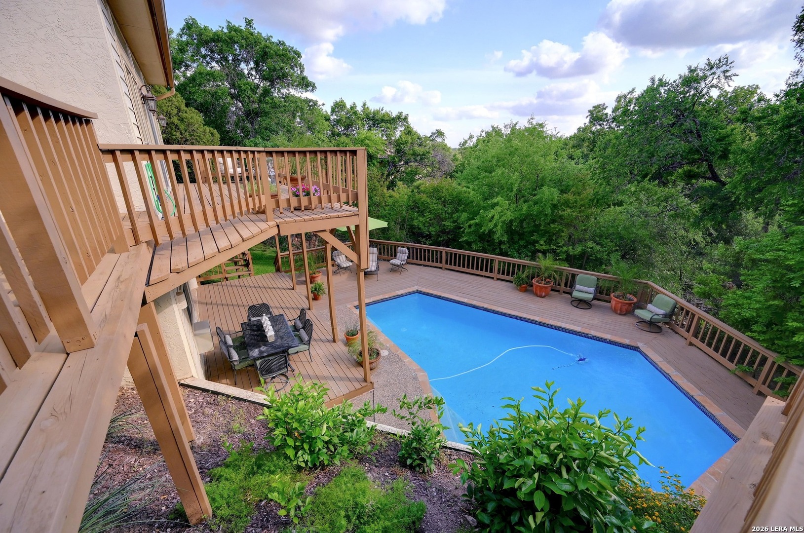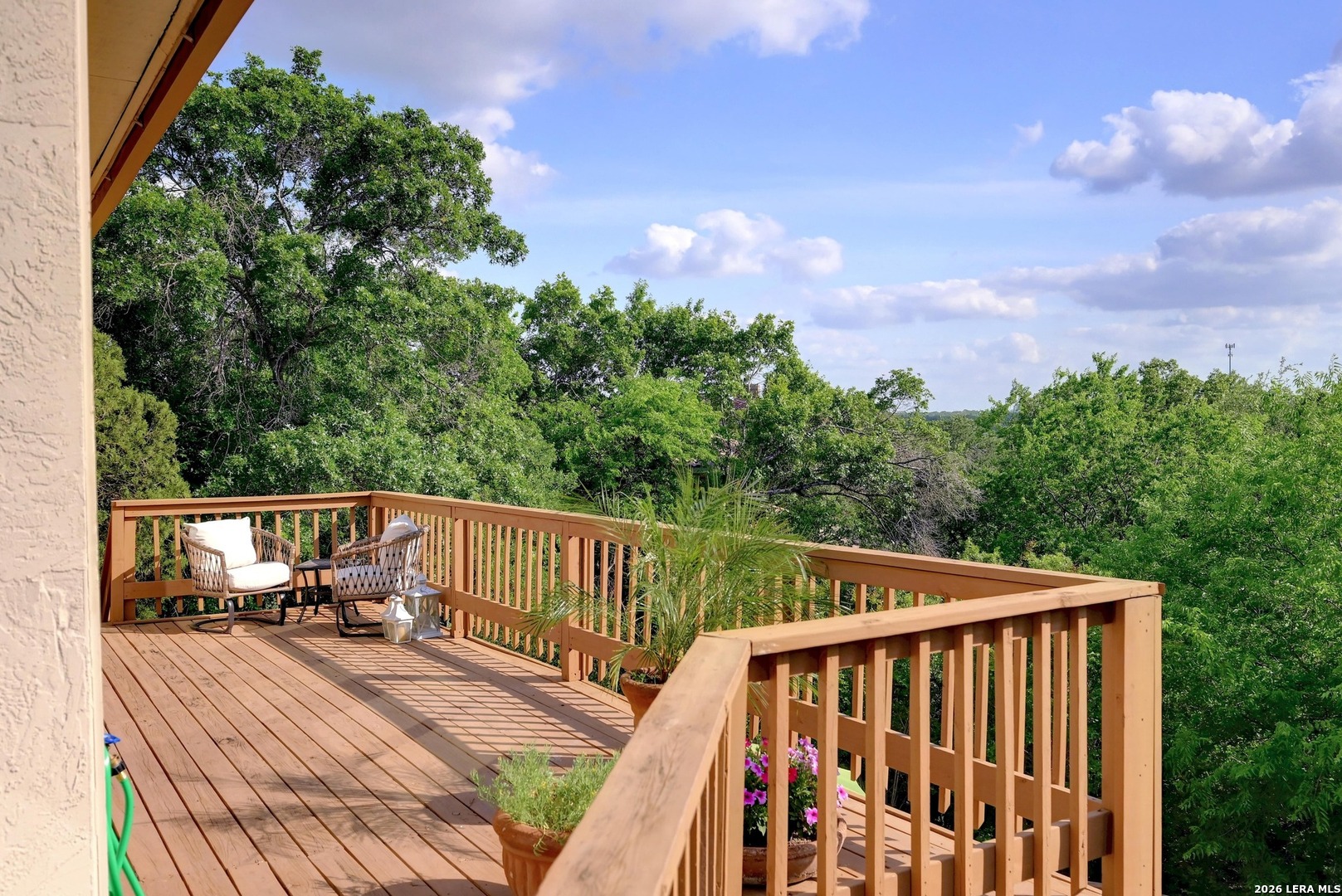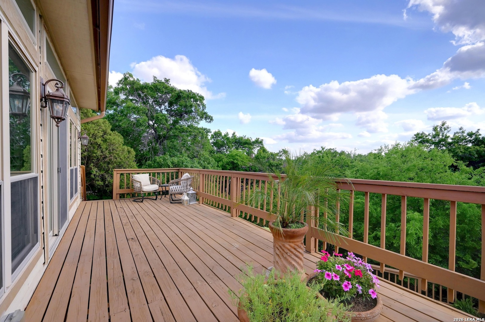 Tucked away on a quiet cul-de-sac in the prestigious Elm Creek community, this beautifully updated residence offers the perfect blend of luxury, privacy, and natural beauty. Situated on a hill and backing to a lush greenbelt, this property provides exceptional privacy-you'll truly feel like you're living in your own secluded retreat. Step inside to discover stunning modern hardwood floors flowing throughout the main level. The formal living and dining areas offer elegant spaces for entertaining, seamlessly connecting to a scenic balcony where you can enjoy peaceful tree-top views and breathtaking sunsets. The chef's kitchen is a true centerpiece, featuring beautiful quartzite countertops, custom cabinetry, and a light-filled breakfast nook surrounded by windows. It's the perfect combination of style and functionality for both everyday living and hosting. The primary suite, conveniently located on the main floor, offers a private escape with direct access to a hot tub and serene views of the sparkling pool and lush surroundings. The fully renovated primary bathroom showcases quartz countertops, custom cabinetry, a modern freestanding soaking tub, and an oversized walk-in shower. Upstairs, you'll find three bedrooms and a versatile loft ideal for a second living area, playroom, or creative workspace. One bedroom, highlighted by rich wood paneling, makes for an exceptional home office. A Jack-and-Jill bathroom connects two of the bedrooms, while both upstairs baths have been thoughtfully updated with granite countertops, new tile, and modern fixtures. The lower level opens to an inviting outdoor living space complete with a pool, outdoor kitchen, and a generously sized pool bath-perfect for effortless entertaining and convenience during warm Texas days. The backyard is truly a private oasis-lush, peaceful, and designed for both relaxation and gatherings. Whether you're enjoying a swim, hosting guests, or unwinding in the hot tub under the stars, this home offers a lifestyle that is both elevated and serene.
