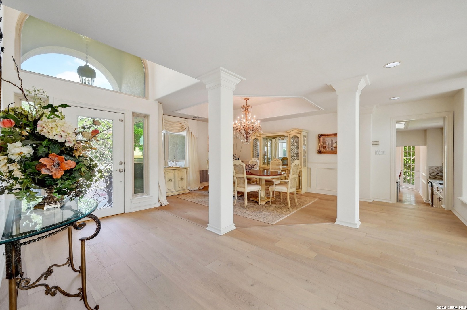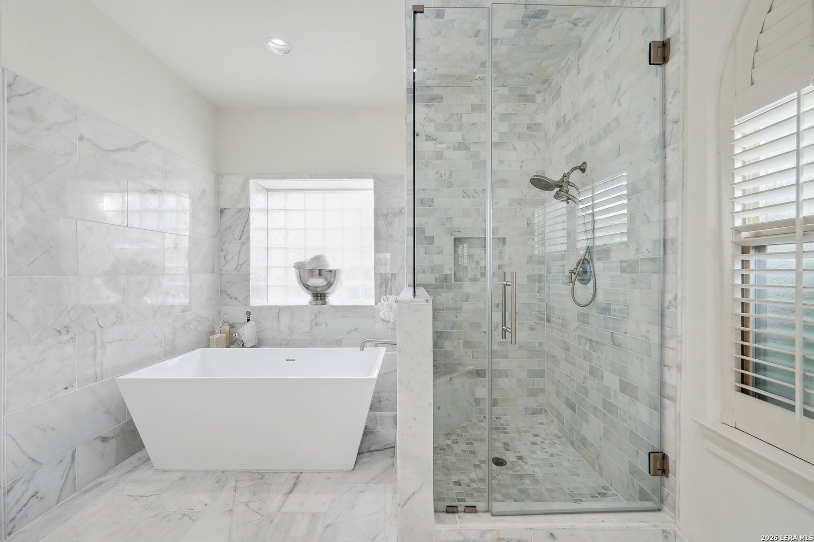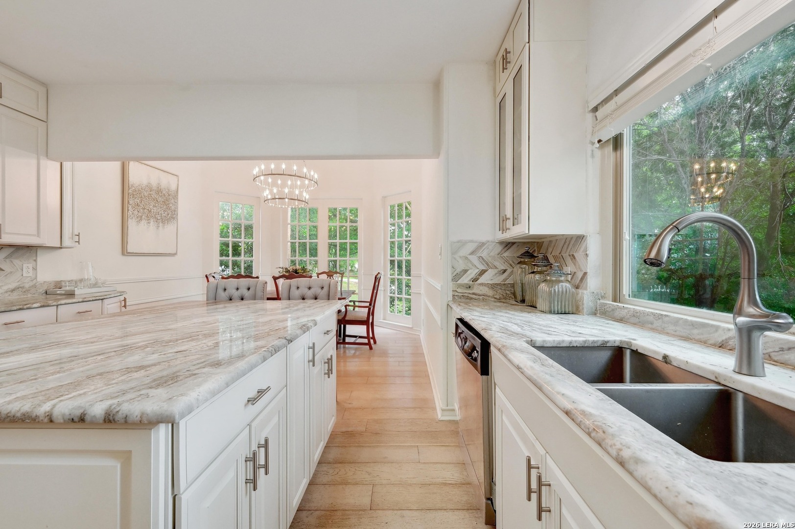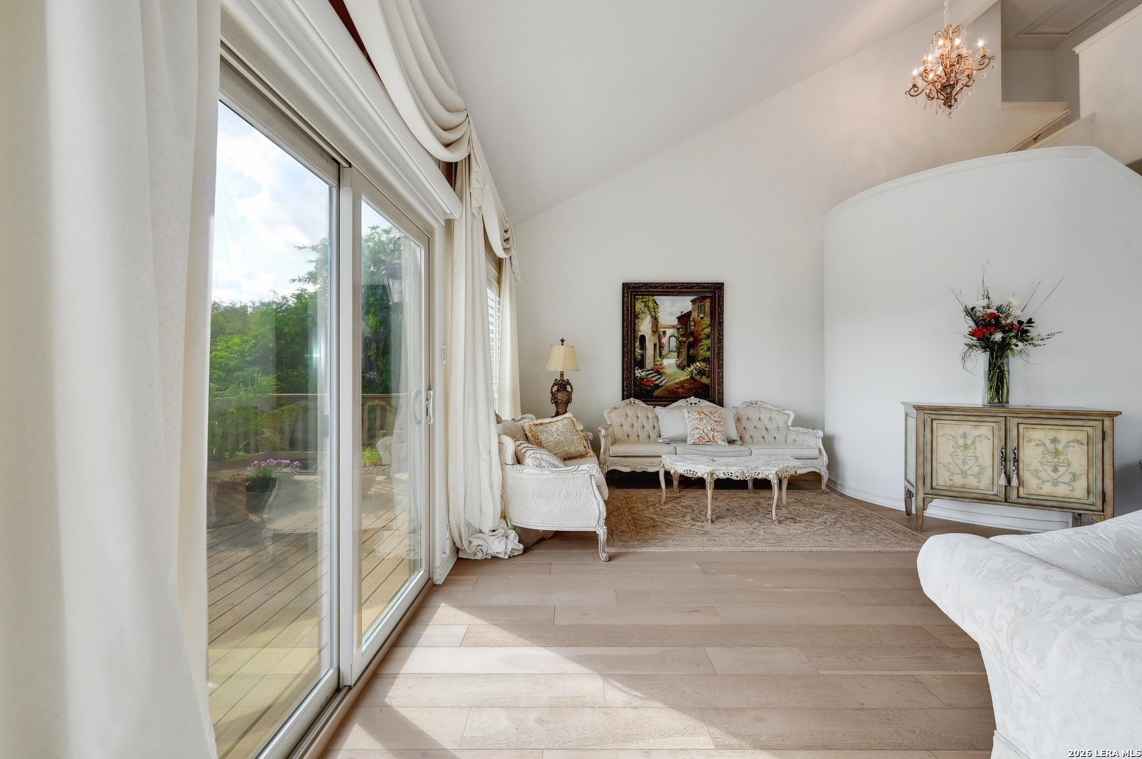Tucked away on a quiet cul-de-sac in the prestigious Elm Creek community, this beautifully updated residence offers the perfect blend of luxury, privacy, and natural beauty. Situated on a hill and backing to a lush greenbelt, this property provides exceptional privacy-you'll truly feel like you're living in your own secluded retreat. Step inside to discover stunning modern hardwood floors flowing throughout the main level. The formal living and dining areas offer elegant spaces for entertaining, seamlessly connecting to a scenic balcony where you can enjoy peaceful tree-top views and breathtaking sunsets. The chef's kitchen is a true centerpiece, featuring beautiful quartzite countertops, custom cabinetry, and a light-filled breakfast nook surrounded by windows. It's the perfect combination of style and functionality for both everyday living and hosting. The primary suite, conveniently located on the main floor, offers a private escape with direct access to a hot tub and serene views of the sparkling pool and lush surroundings. The fully renovated primary bathroom showcases quartz countertops, custom cabinetry, a modern freestanding soaking tub, and an oversized walk-in shower. Upstairs, you'll find three bedrooms and a versatile loft ideal for a second living area, playroom, or creative workspace. One bedroom, highlighted by rich wood paneling, makes for an exceptional home office. A Jack-and-Jill bathroom connects two of the bedrooms, while both upstairs baths have been thoughtfully updated with granite countertops, new tile, and modern fixtures. The lower level opens to an inviting outdoor living space complete with a pool, outdoor kitchen, and a generously sized pool bath-perfect for effortless entertaining and convenience during warm Texas days. The backyard is truly a private oasis-lush, peaceful, and designed for both relaxation and gatherings. Whether you're enjoying a swim, hosting guests, or unwinding in the hot tub under the stars, this home offers a lifestyle that is both elevated and serene.