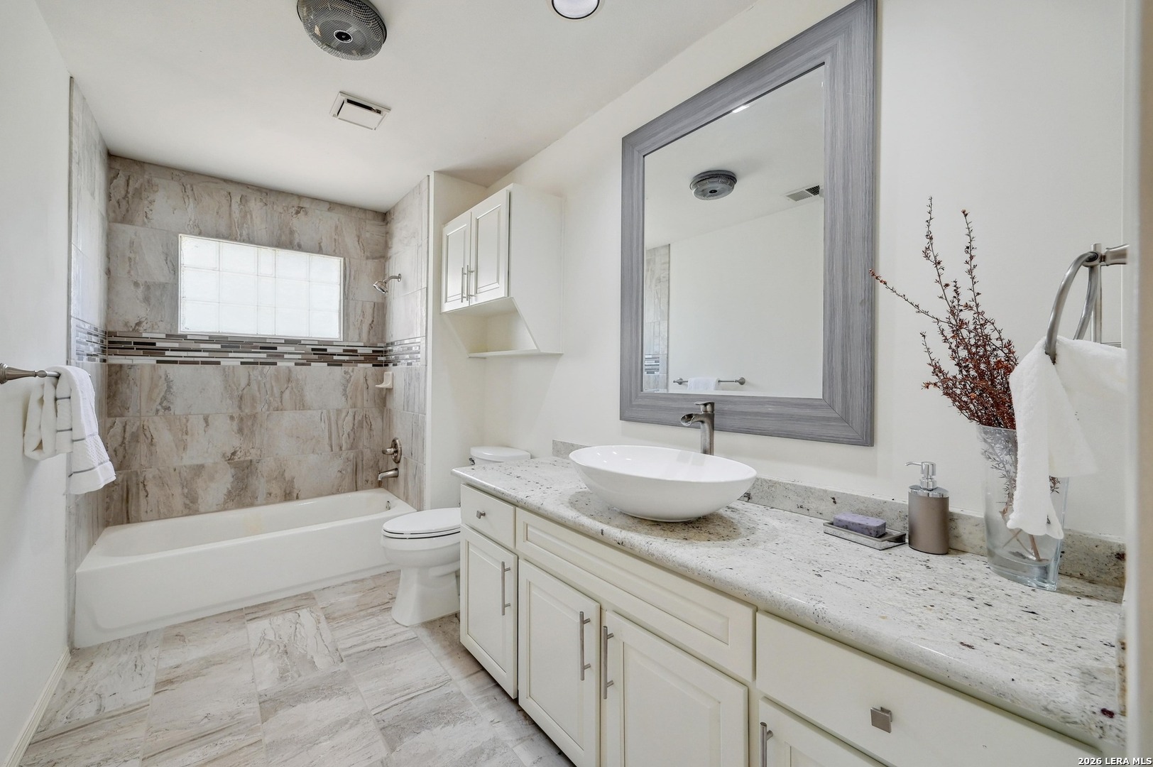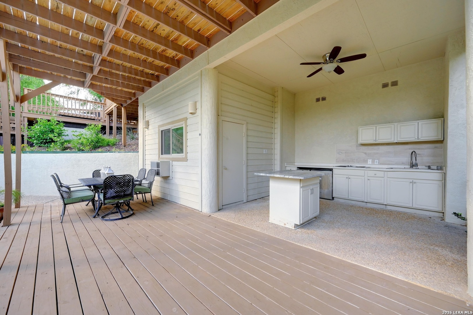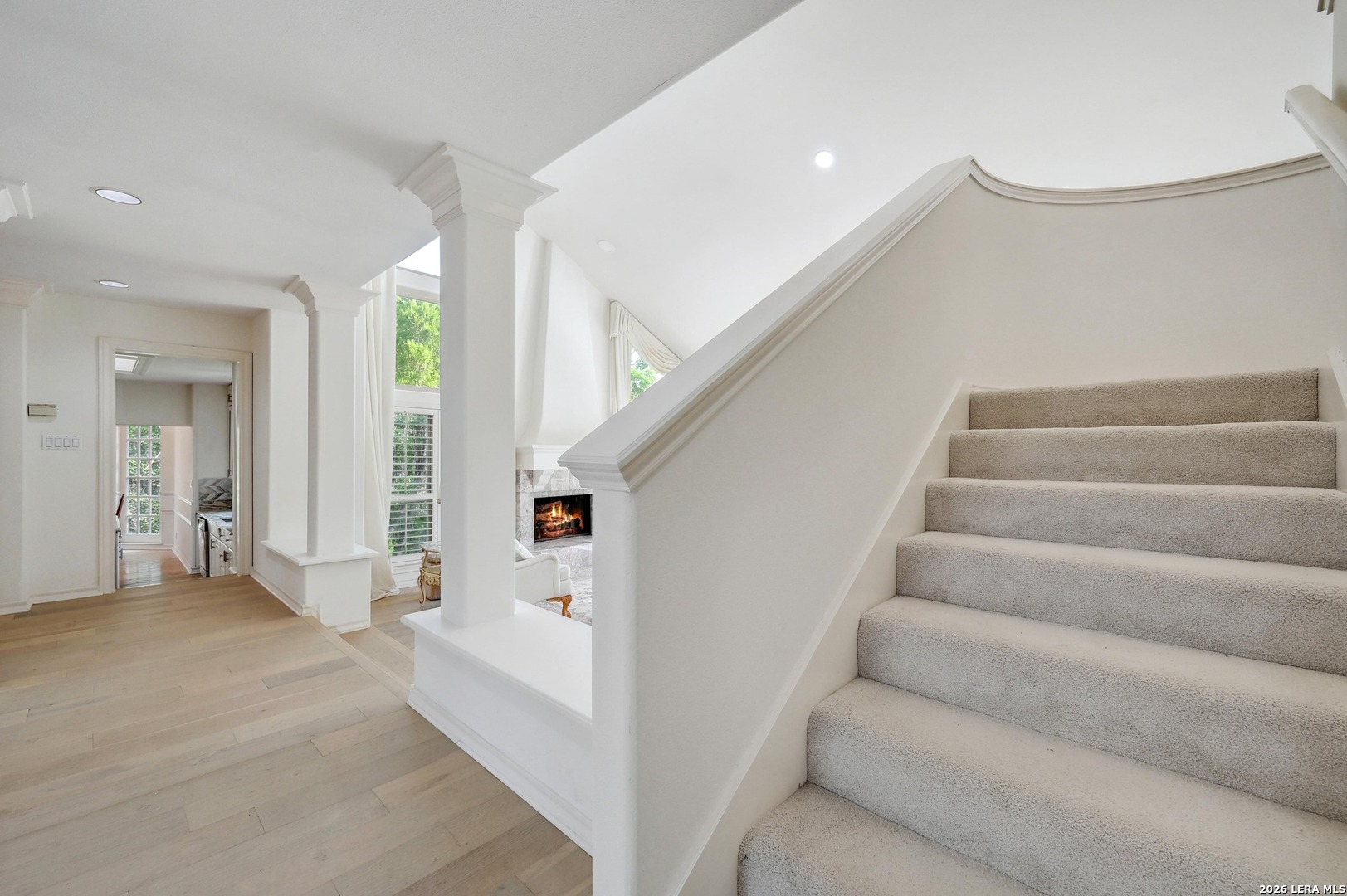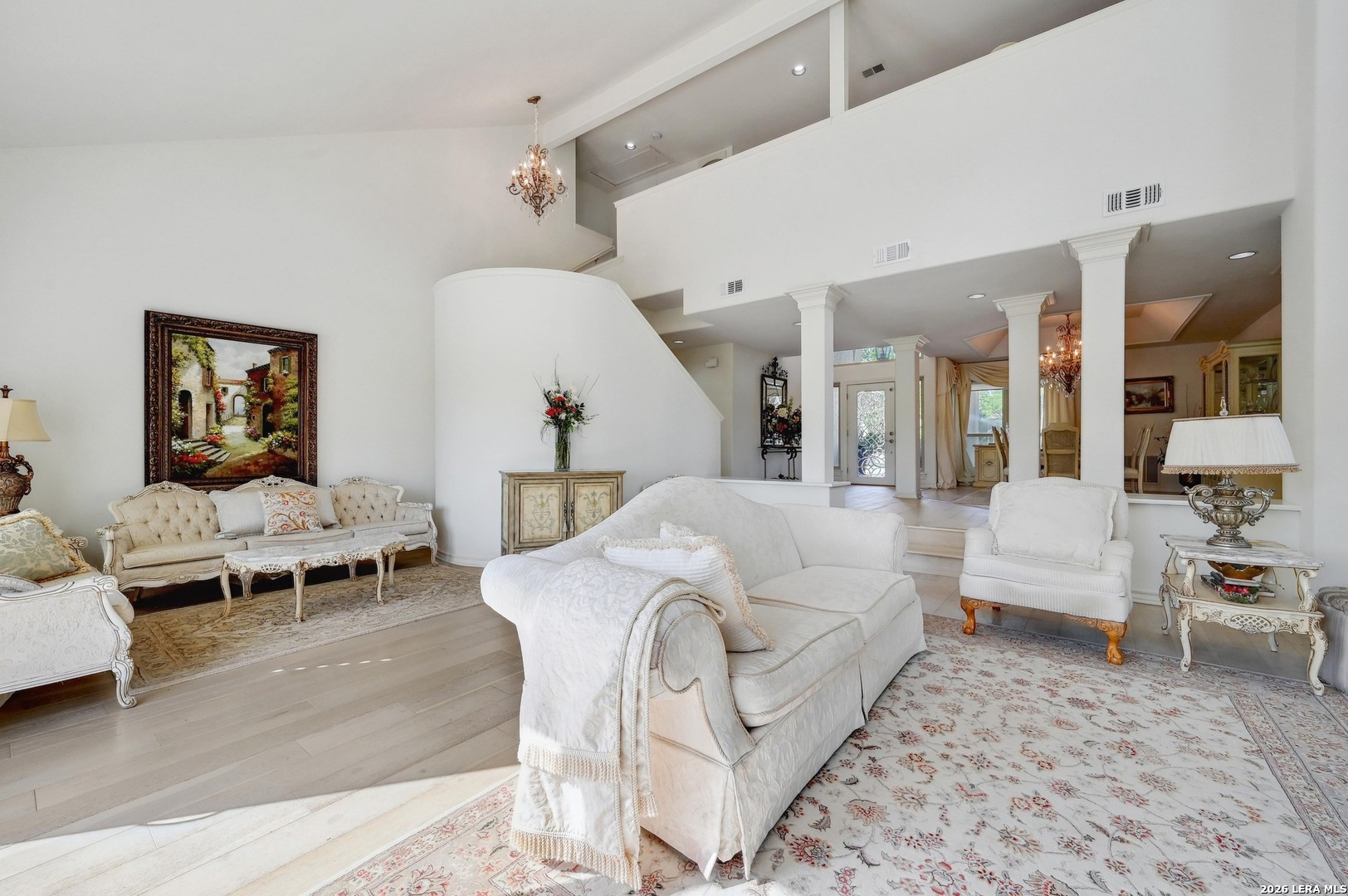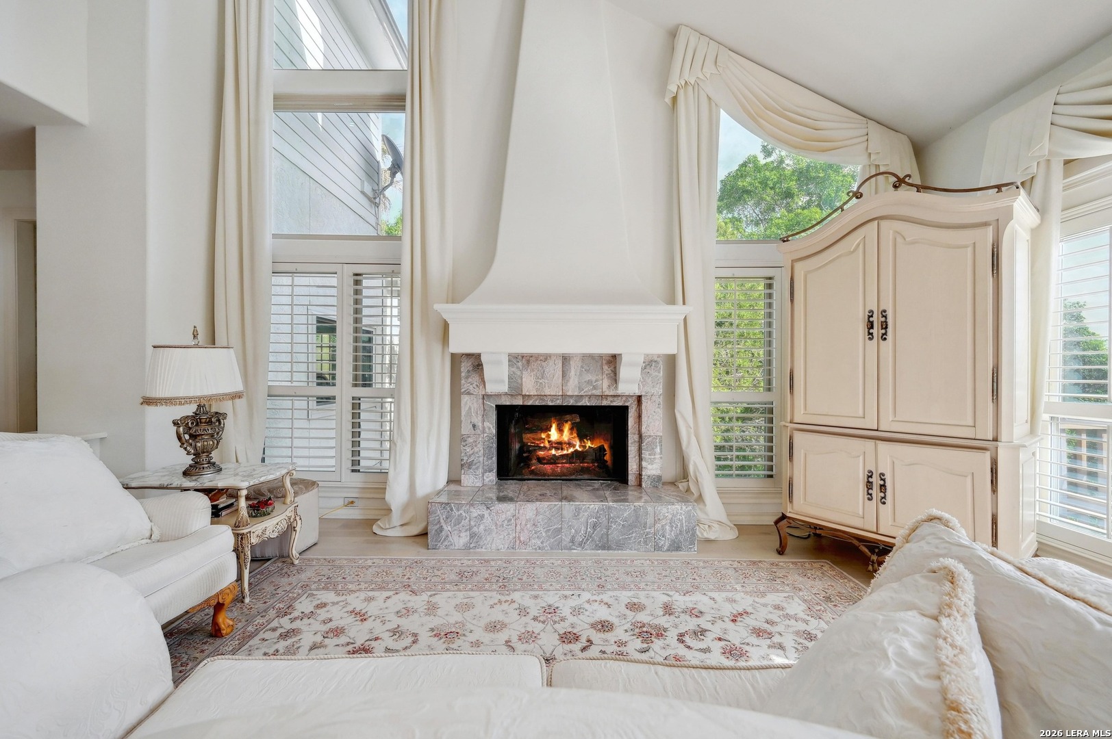 Tucked away on a quiet cul-de-sac in the prestigious Elm Creek community, this beautifully updated residence offers the perfect blend of luxury, privacy, and natural beauty. Situated on a hill and backing to a lush greenbelt, this property provides exceptional privacy-you'll truly feel like you're living in your own secluded retreat. Step inside to discover stunning modern hardwood floors flowing throughout the main level. The formal living and dining areas offer elegant spaces for entertaining, seamlessly connecting to a scenic balcony where you can enjoy peaceful tree-top views and breathtaking sunsets. The chef's kitchen is a true centerpiece, featuring beautiful quartzite countertops, custom cabinetry, and a light-filled breakfast nook surrounded by windows. It's the perfect combination of style and functionality for both everyday living and hosting. The primary suite, conveniently located on the main floor, offers a private escape with direct access to a hot tub and serene views of the sparkling pool and lush surroundings. The fully renovated primary bathroom showcases quartz countertops, custom cabinetry, a modern freestanding soaking tub, and an oversized walk-in shower. Upstairs, you'll find three bedrooms and a versatile loft ideal for a second living area, playroom, or creative workspace. One bedroom, highlighted by rich wood paneling, makes for an exceptional home office. A Jack-and-Jill bathroom connects two of the bedrooms, while both upstairs baths have been thoughtfully updated with granite countertops, new tile, and modern fixtures. The lower level opens to an inviting outdoor living space complete with a pool, outdoor kitchen, and a generously sized pool bath-perfect for effortless entertaining and convenience during warm Texas days. The backyard is truly a private oasis-lush, peaceful, and designed for both relaxation and gatherings. Whether you're enjoying a swim, hosting guests, or unwinding in the hot tub under the stars, this home offers a lifestyle that is both elevated and serene.