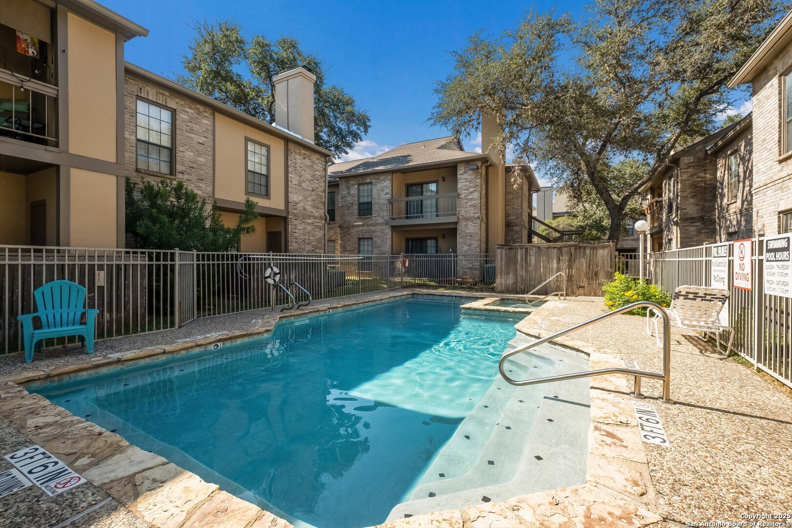 With an incredible North Central San Antonio location, come enjoy this lovely ground-floor 2 bedroom, 2 bath condo located in the desirable gated community of Calais Villas! The open floorplan greets you with a cozy fireplace in the family room, an abundance of natural light, generous dining room, covered patio overlooking the pool, separate area with stacked washer/dryer, entry closet, ceiling fans throughout and an oversized one-car garage with built-in storage shelves. Chef's kitchen includes Saltillo tile flooring, lots of cabinetry, huge pantry, built-in microwave, breakfast bar and electric cooking. Private primary suite features its own sitting area, large walk-in closet and ensuite bathroom with shower/soaking tub combo. Don't miss out on this quiet community with beautifully maintained grounds, mature trees throughout the complex and community amenities including 3 pools, park and entertainment area with BBQ grill. A short drive to dining, shopping, entertainment, medical facilities, culture and more! Just minutes from Alon Town Center, Phil Hardberger Park, Wurzbach Parkway and San Antonio International Airport. Amazing NEISD schools!