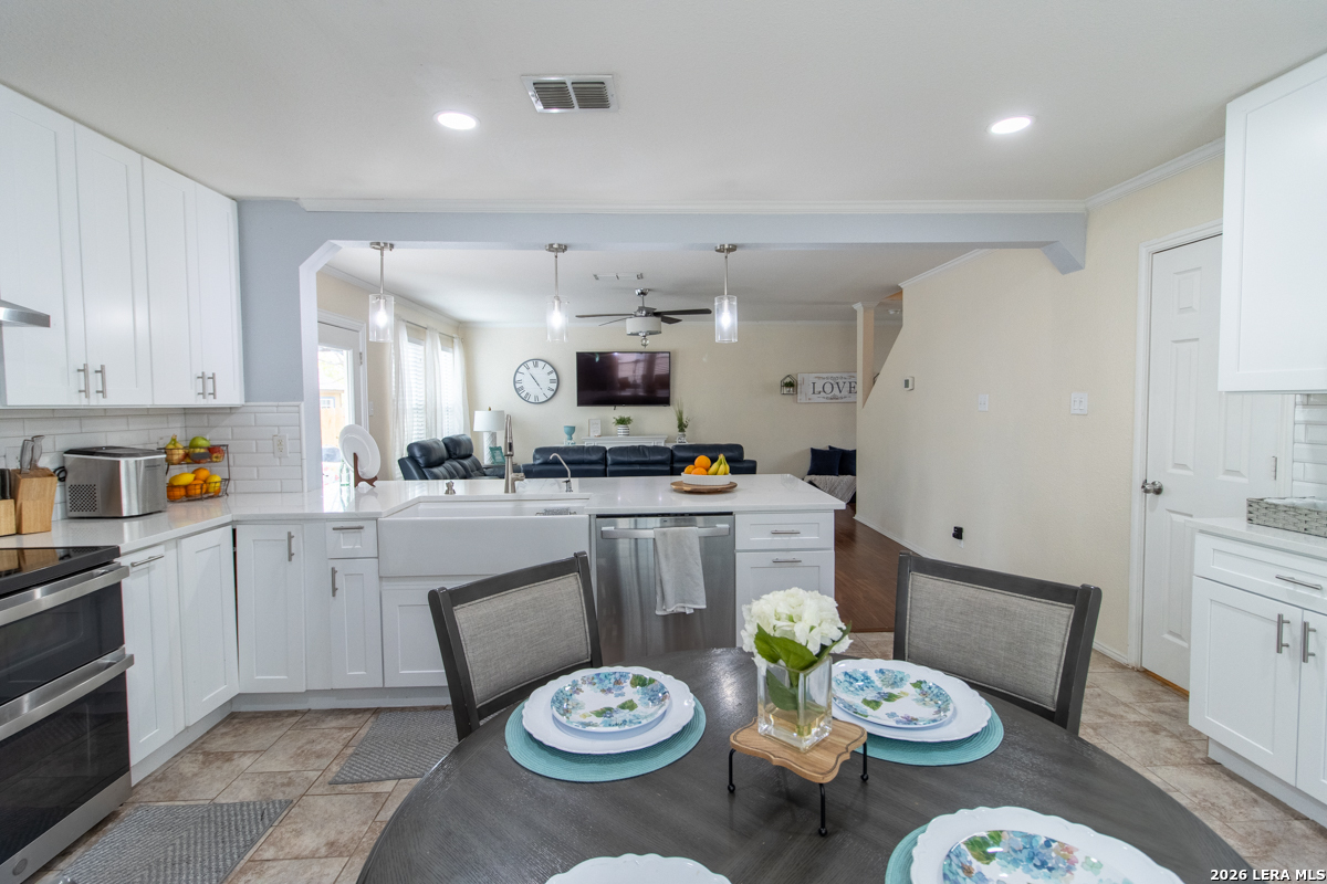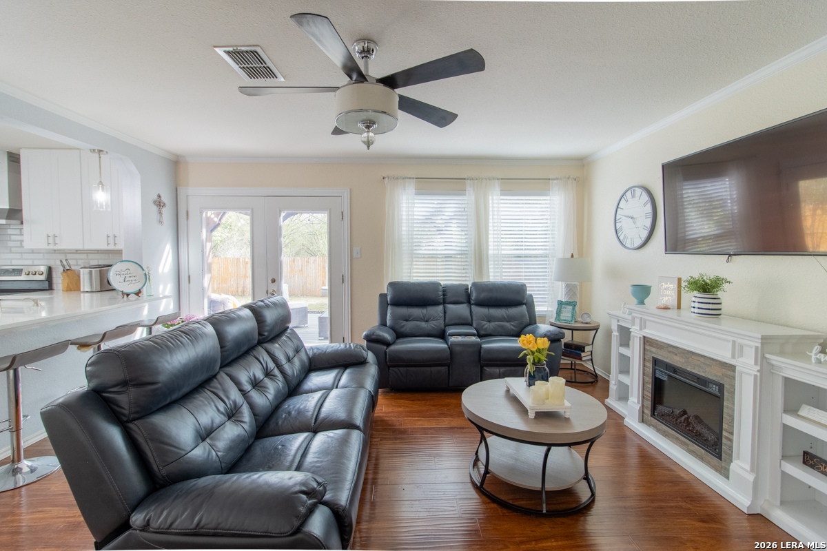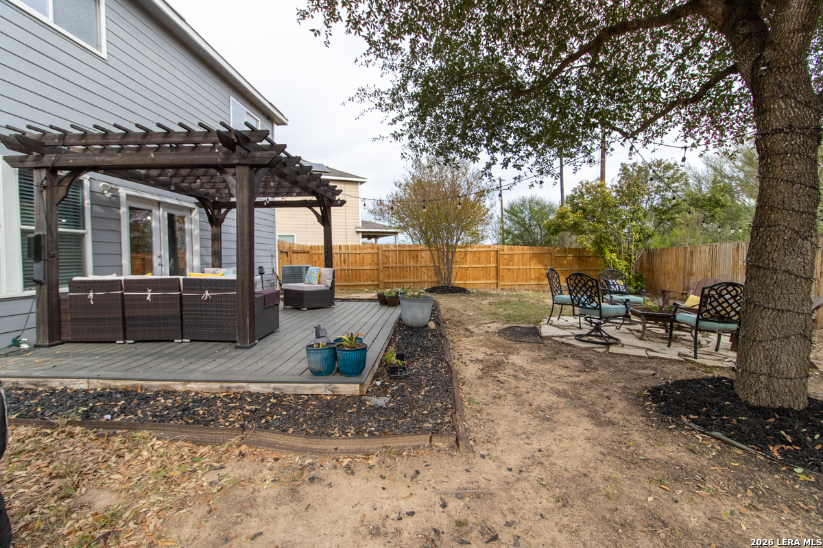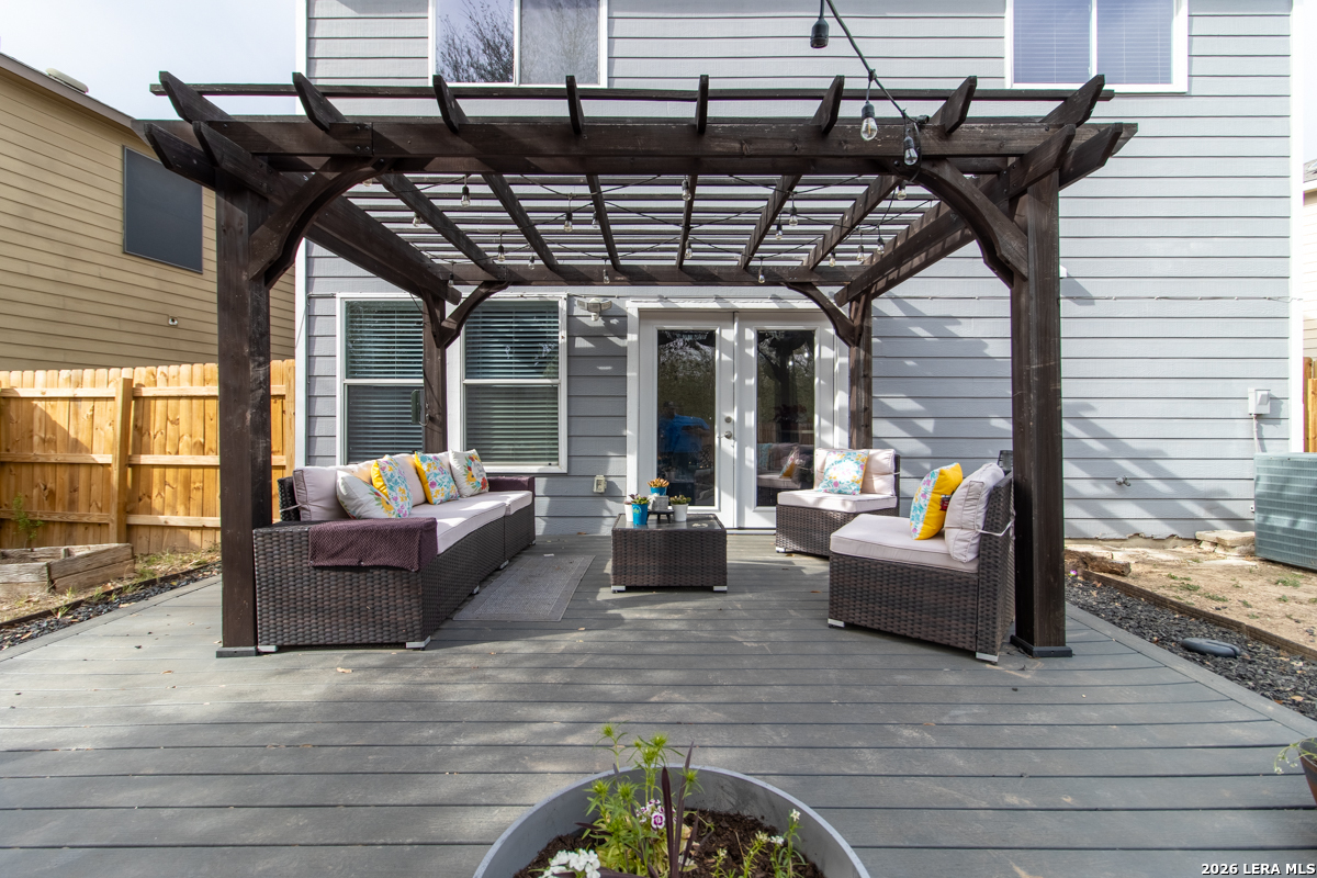 Honey, STOP the car! This stunning, tastefully updated home backs to a GREENBELT and delivers the modern upgrades buyers have been waiting for in Silver Oaks. Step inside to a fully refreshed interior featuring laminate and tile flooring, fresh designer paint, updated plumbing fixtures, crown molding, and new lighting throughout. The heart of the home is a true showpiece kitchen with white shaker cabinets, quartz countertops, tile backsplash, stainless steel appliances, porcelain farmhouse sink, tile flooring, and a custom breakfast & coffee bar that elevates your morning routine. Both bathrooms have been upgraded with new vanities, flooring, sinks, faucets, and toilets, giving the home a clean, modern feel from top to bottom. The bright, open layout offers comfortable living spaces perfect for entertaining or relaxing. Step outside thru your French doors to your private backyard oasis - no rear neighbors, just peaceful greenbelt views. Enjoy evenings on your composite deck with pergola, ideal for grilling, gatherings, or quiet unwinding. Attractive front yard landscaping and shade trees add curb appeal from the moment you arrive. Located near top-rated schools, shopping, Government Canyon State Park, and major commuter routes, this home delivers the upgrades buyers want at a value that's hard to beat. Homes with these extra finishing touches do not last. Schedule your showing today! Thank you for looking!