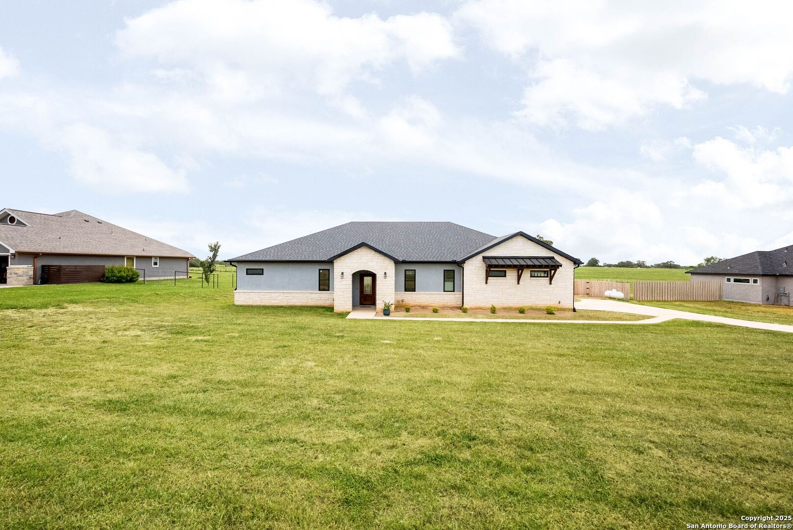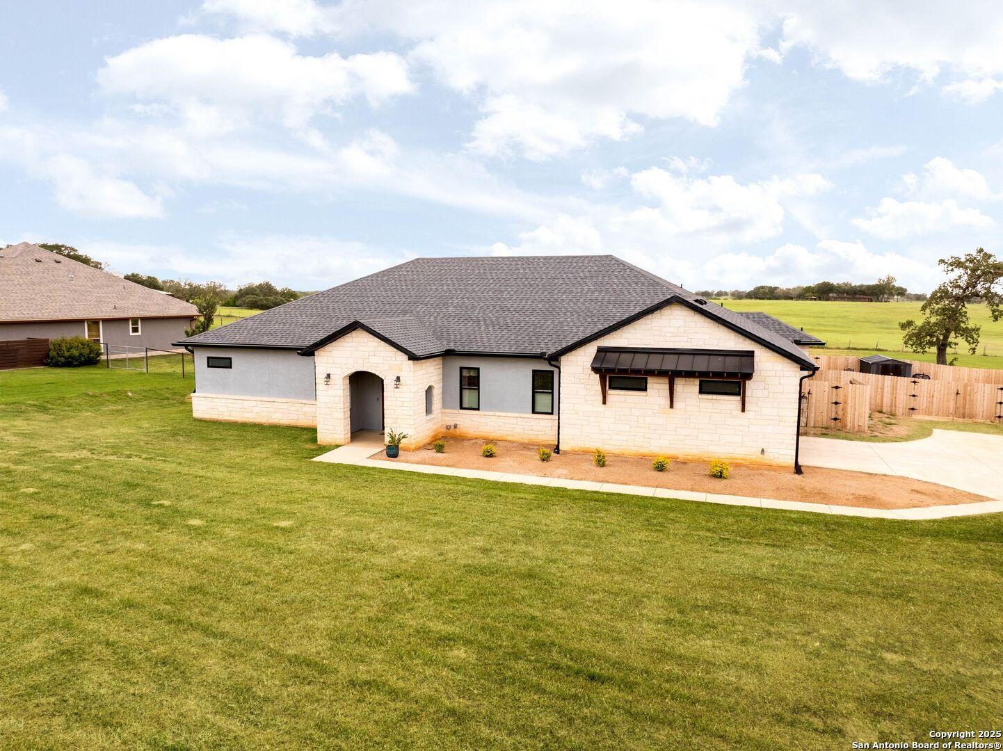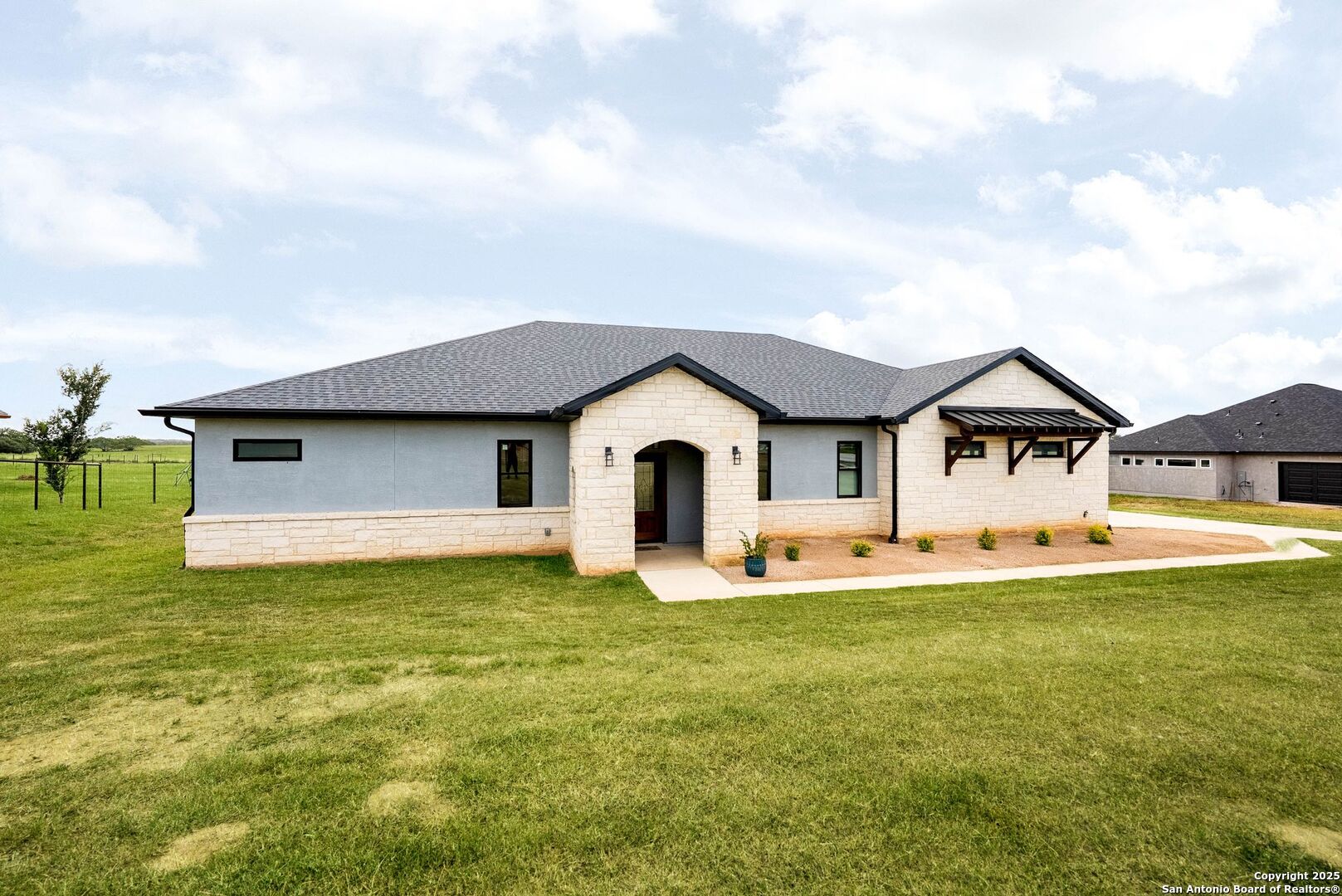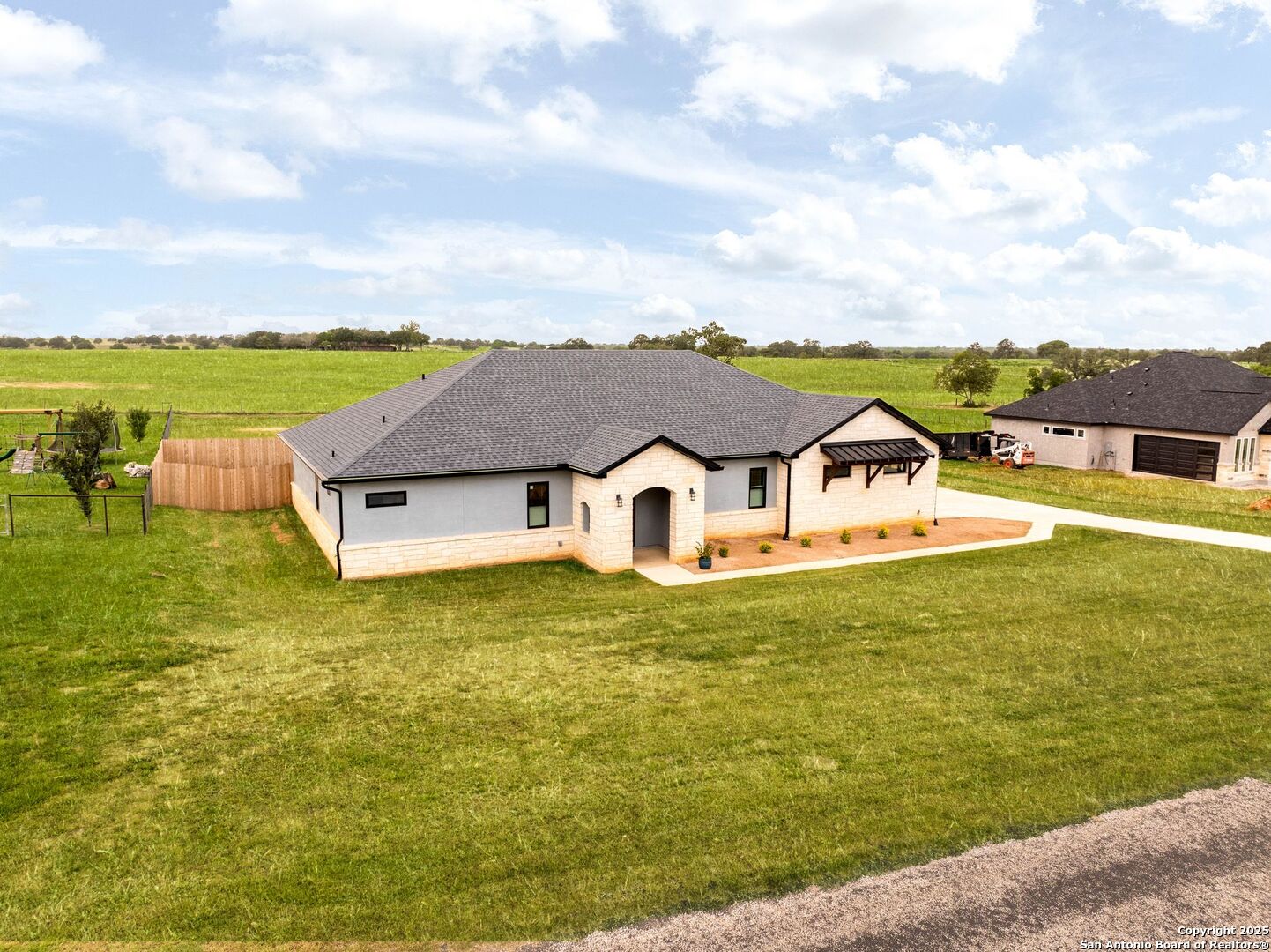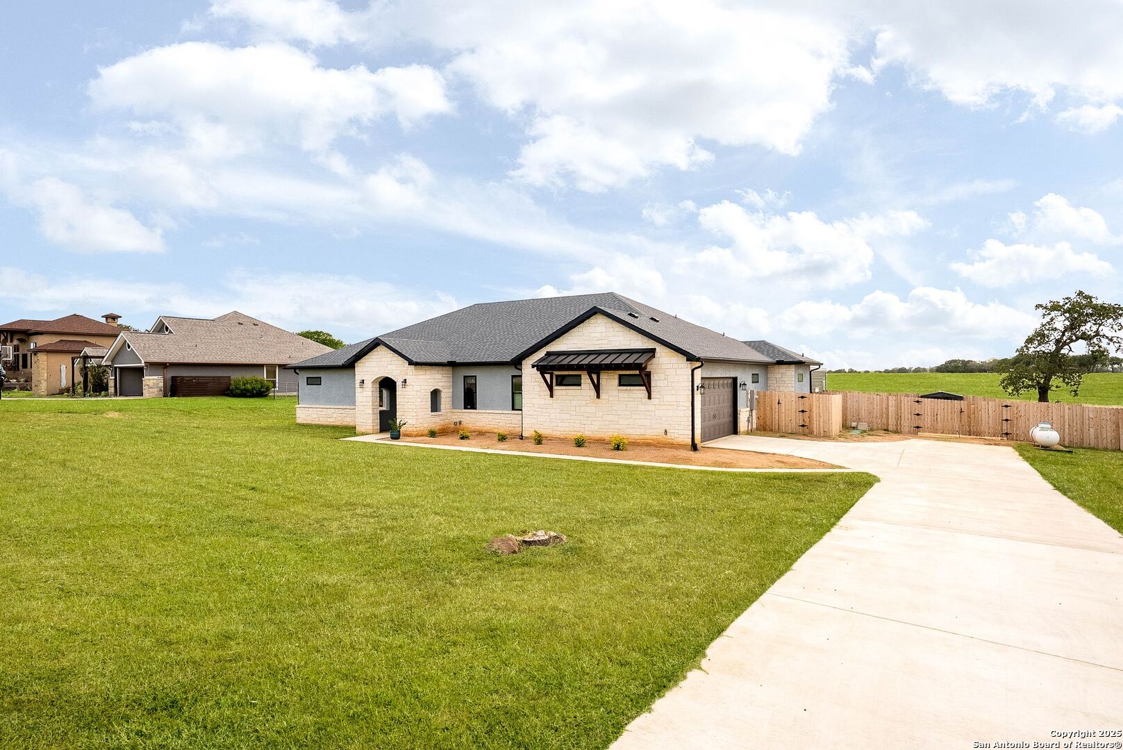 This stunning single-story custom home offers 4 bedrooms, 3.5 bathrooms, and sits on a spacious 1.11-acre lot with no city taxes. Thoughtfully designed, each bedroom includes its own private bathroom, ensuring comfort and privacy for all. The open floor plan is filled with natural light and showcases exceptional craftsmanship, featuring solid walnut custom cabinetry, quartz countertops, and a chef's kitchen tailored for culinary enthusiasts. Warm wood flooring flows throughout the living spaces, adding timeless charm. The home is built with 2x6 studs and spray foam insulation for superior energy efficiency. A gas fireplace brings cozy ambiance to the living area. The 600-square-foot climate-controlled shop includes its own bathroom, making it perfect for a gym, workshop, or creative studio. Additional features include a water softener and iron filter system. While the main roof is a heavy composition material rated for durability, a metal shed-style roof provides architectural interest and shade over the front windows. With 2,700 square feet of living space and high-performance finishes, this fully custom home offers refined South Texas living with lasting quality and comfort.