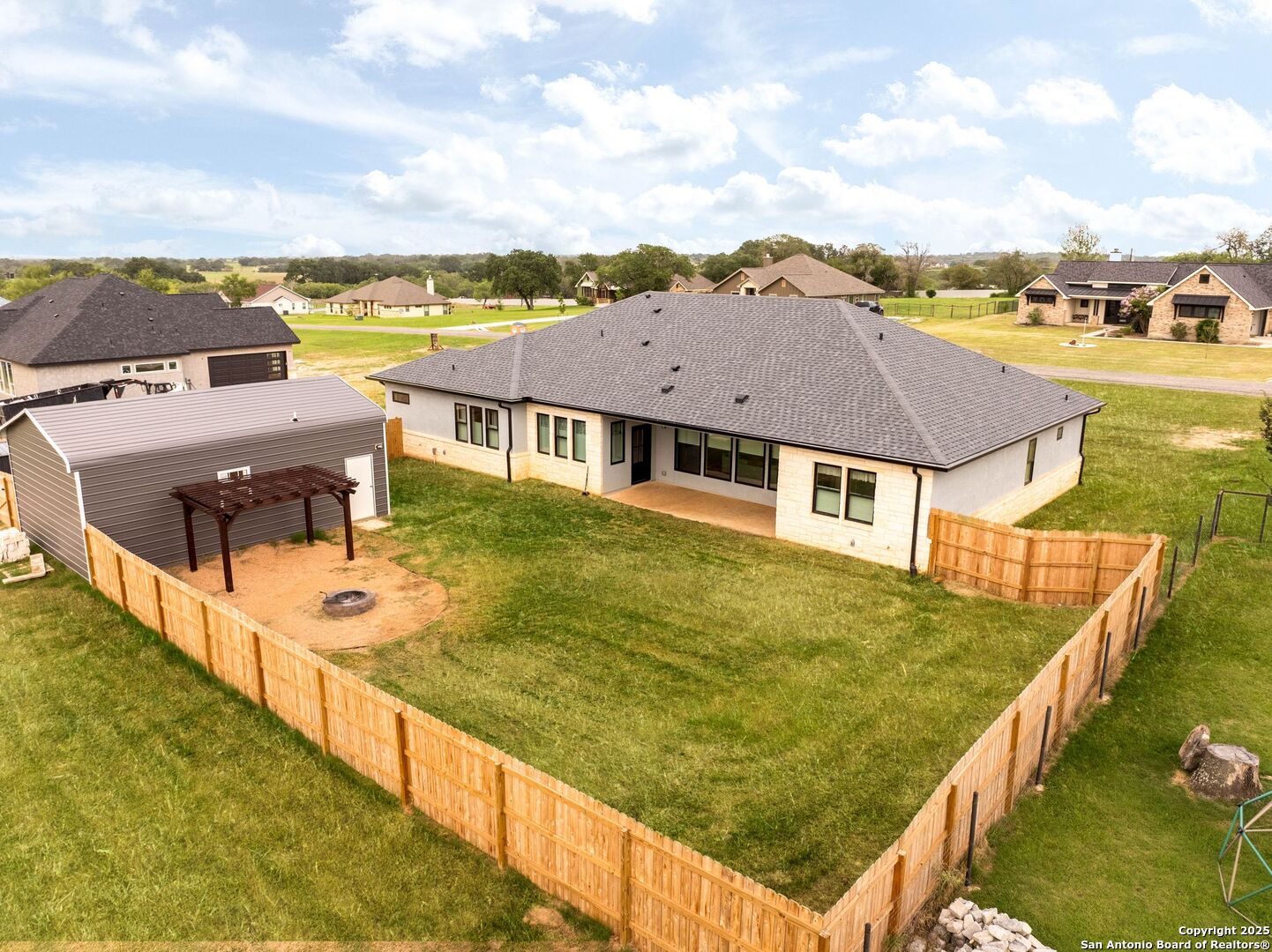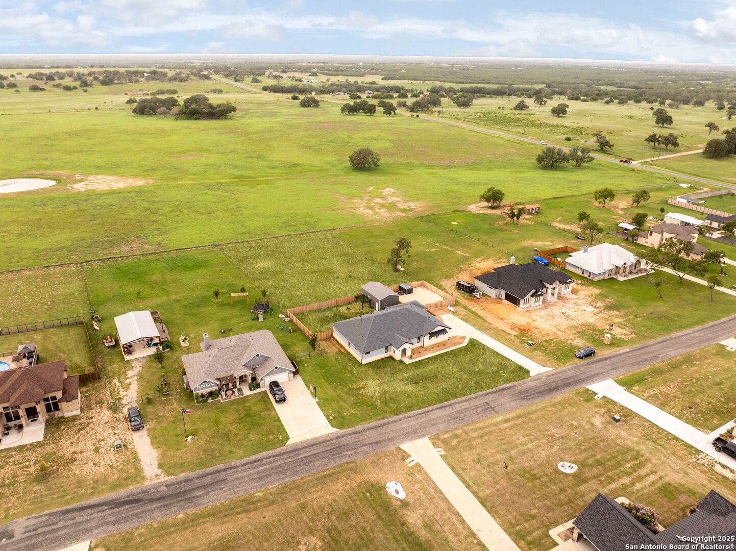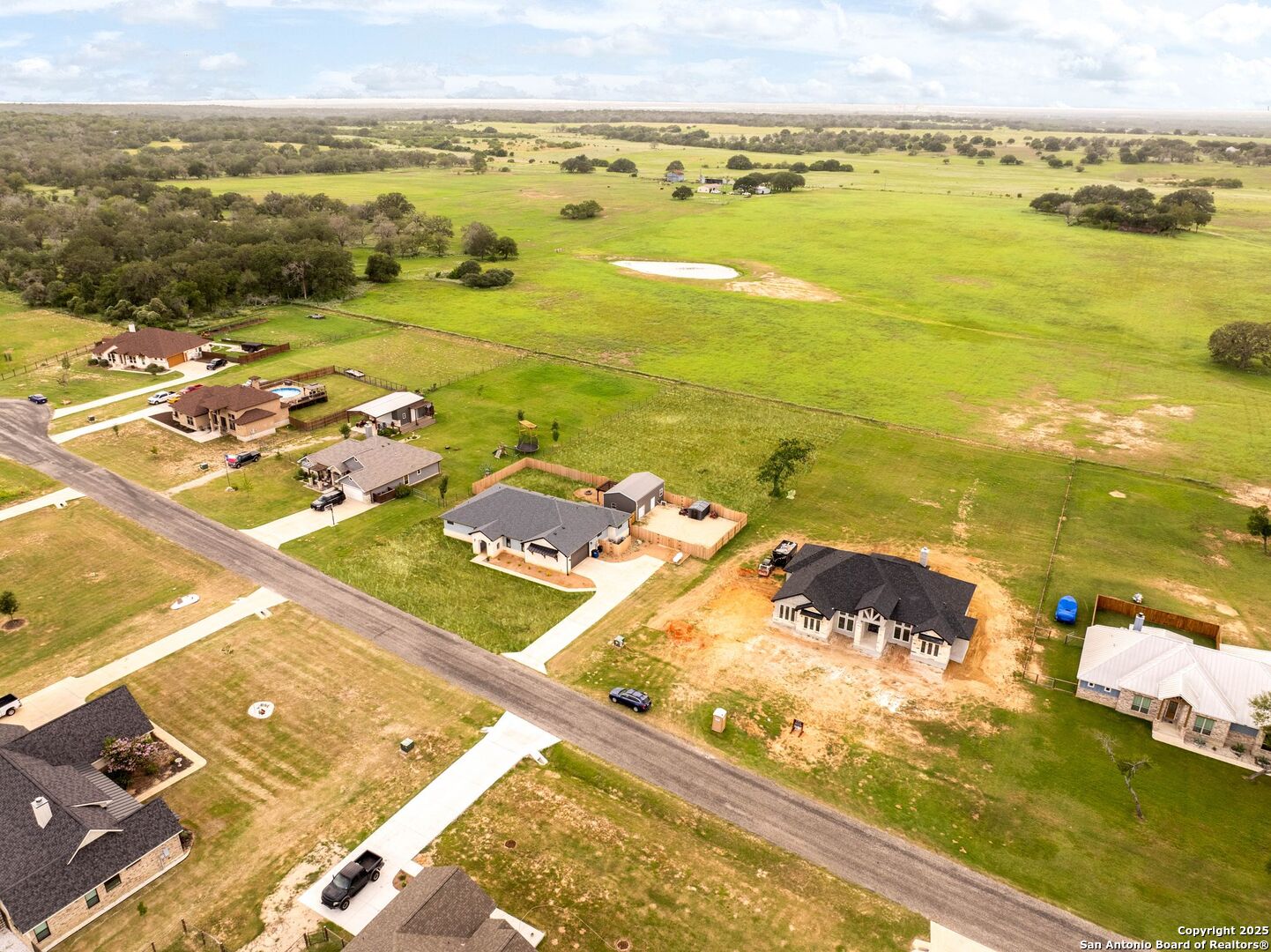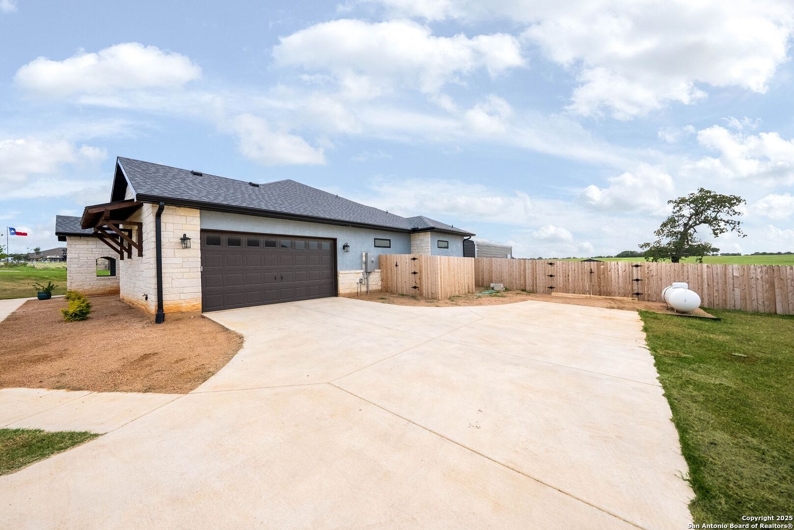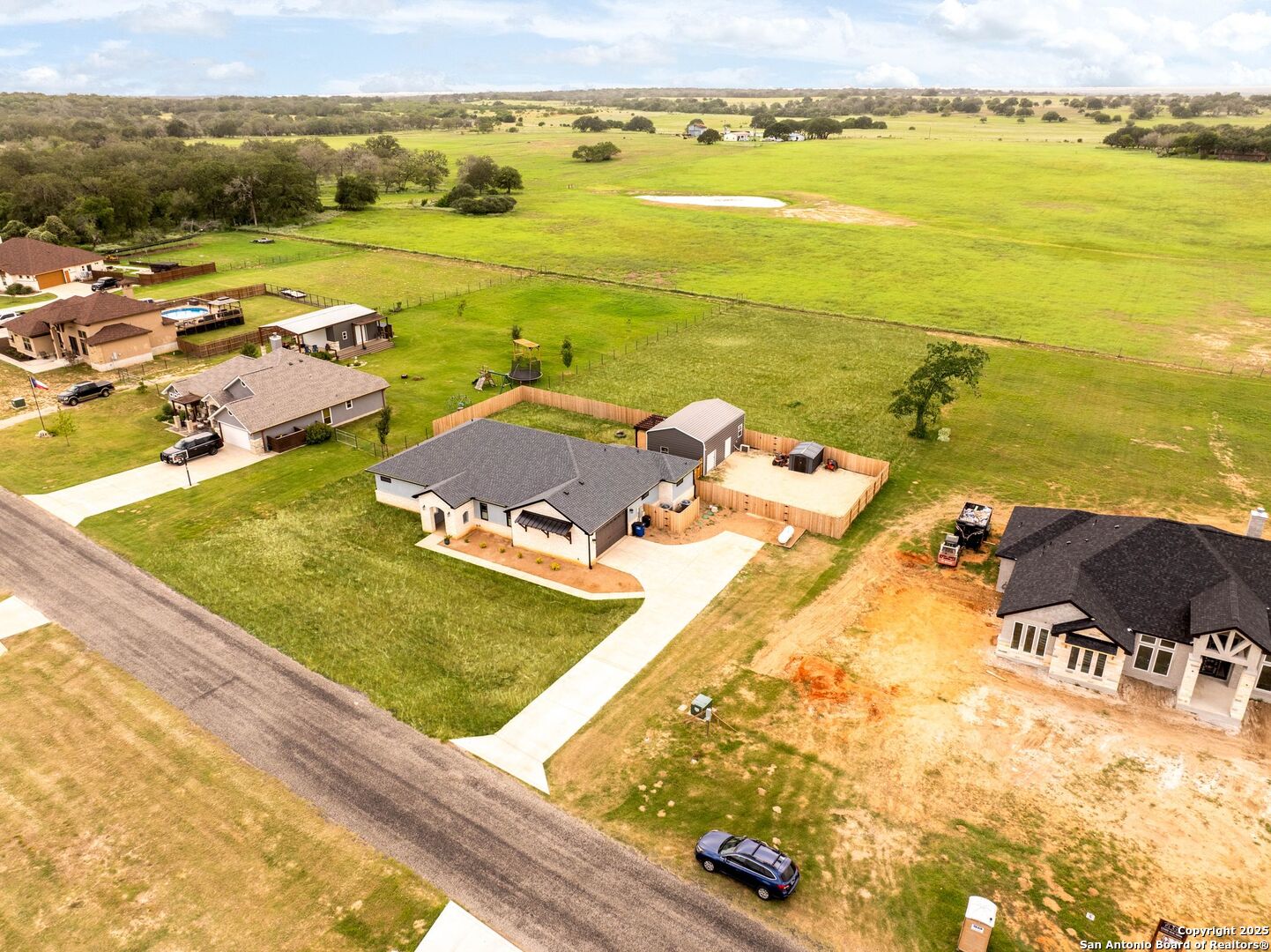 This stunning single-story custom home offers 4 bedrooms, 3.5 bathrooms, and sits on a spacious 1.11-acre lot with no city taxes. Thoughtfully designed, each bedroom includes its own private bathroom, ensuring comfort and privacy for all. The open floor plan is filled with natural light and showcases exceptional craftsmanship, featuring solid walnut custom cabinetry, quartz countertops, and a chef's kitchen tailored for culinary enthusiasts. Warm wood flooring flows throughout the living spaces, adding timeless charm. The home is built with 2x6 studs and spray foam insulation for superior energy efficiency. A gas fireplace brings cozy ambiance to the living area. The 600-square-foot climate-controlled shop includes its own bathroom, making it perfect for a gym, workshop, or creative studio. Additional features include a water softener and iron filter system. While the main roof is a heavy composition material rated for durability, a metal shed-style roof provides architectural interest and shade over the front windows. With 2,700 square feet of living space and high-performance finishes, this fully custom home offers refined South Texas living with lasting quality and comfort.
