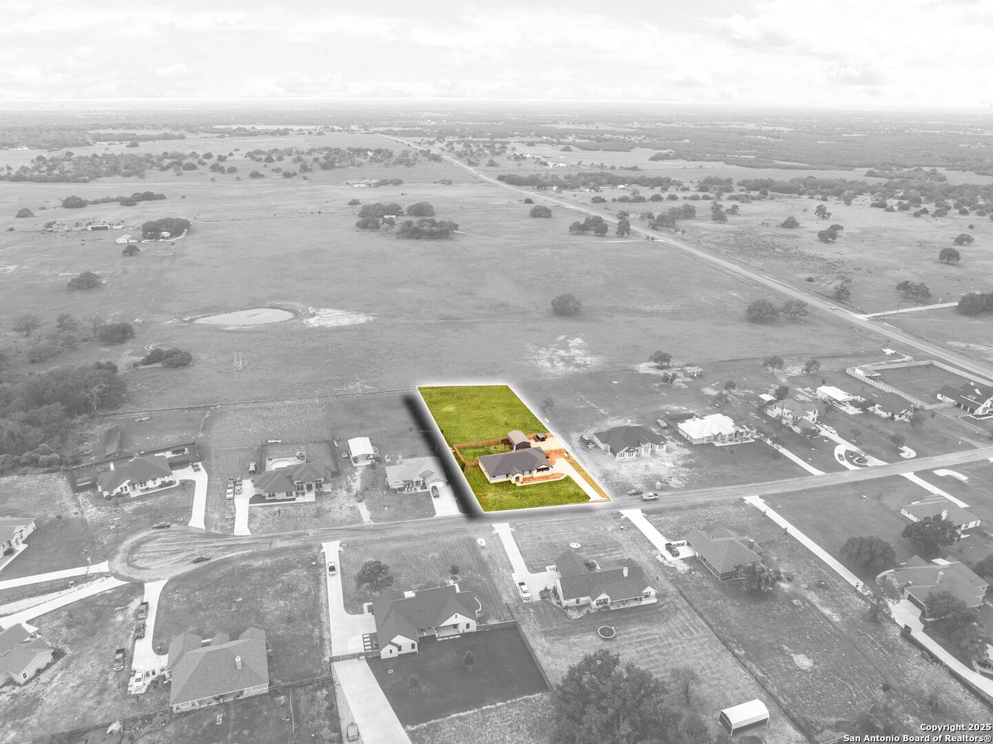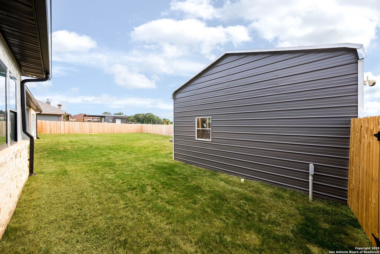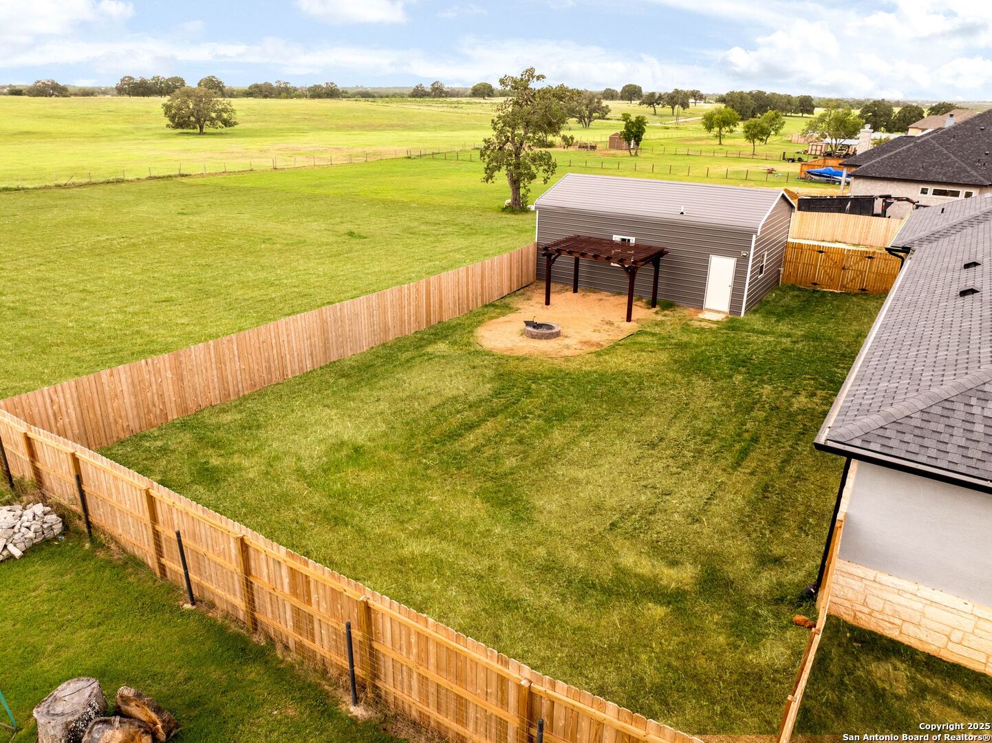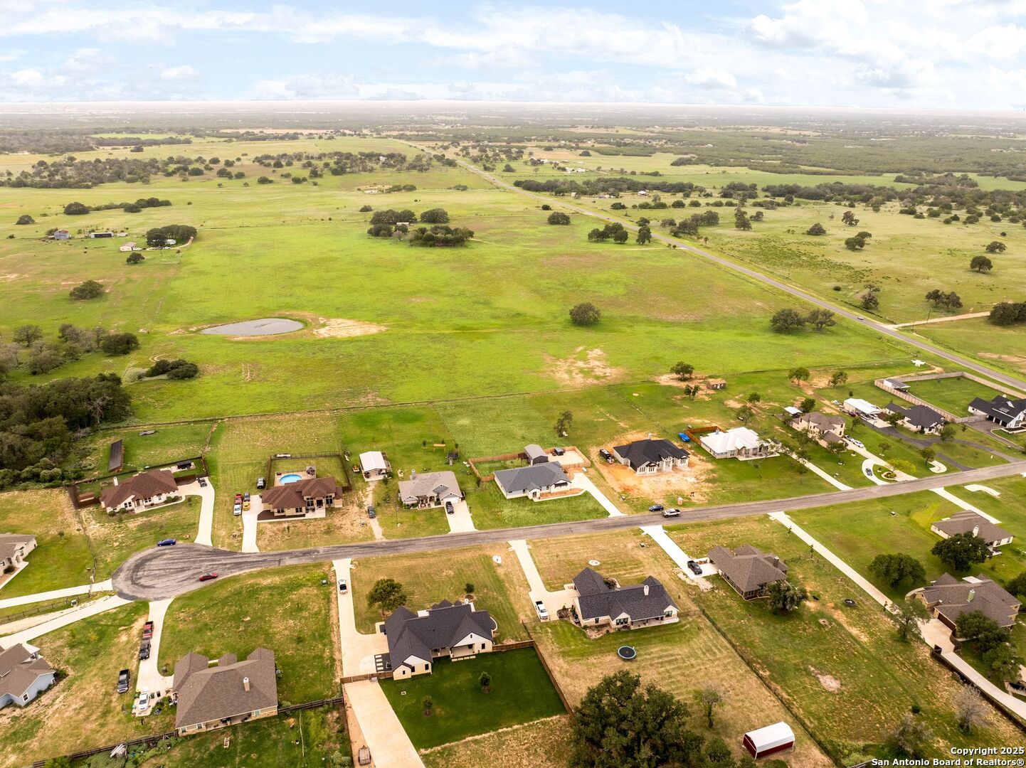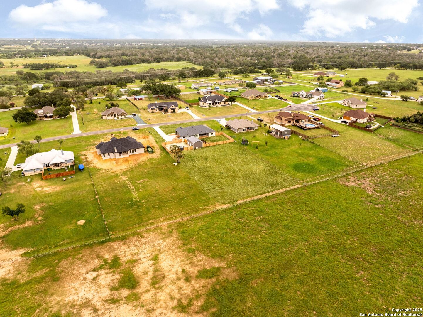 This stunning single-story custom home offers 4 bedrooms, 3.5 bathrooms, and sits on a spacious 1.11-acre lot with no city taxes. Thoughtfully designed, each bedroom includes its own private bathroom, ensuring comfort and privacy for all. The open floor plan is filled with natural light and showcases exceptional craftsmanship, featuring solid walnut custom cabinetry, quartz countertops, and a chef's kitchen tailored for culinary enthusiasts. Warm wood flooring flows throughout the living spaces, adding timeless charm. The home is built with 2x6 studs and spray foam insulation for superior energy efficiency. A gas fireplace brings cozy ambiance to the living area. The 600-square-foot climate-controlled shop includes its own bathroom, making it perfect for a gym, workshop, or creative studio. Additional features include a water softener and iron filter system. While the main roof is a heavy composition material rated for durability, a metal shed-style roof provides architectural interest and shade over the front windows. With 2,700 square feet of living space and high-performance finishes, this fully custom home offers refined South Texas living with lasting quality and comfort.