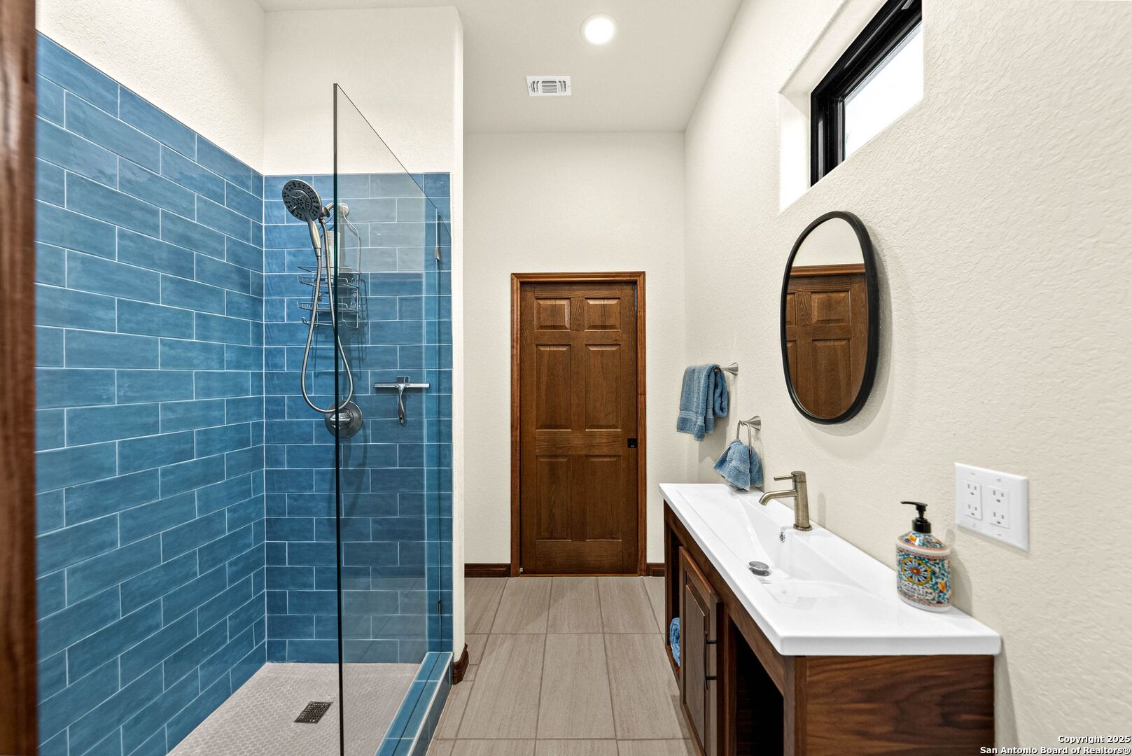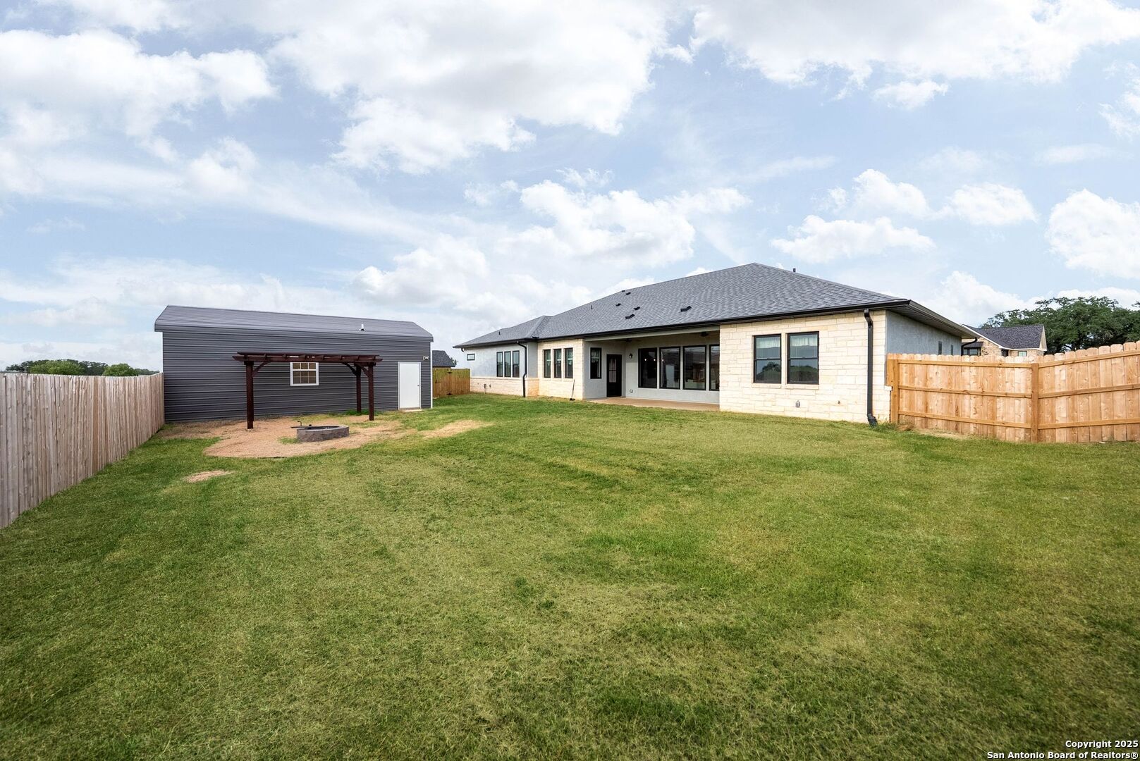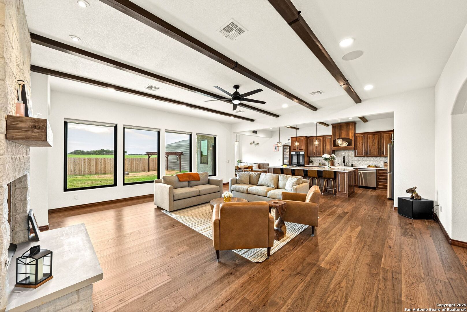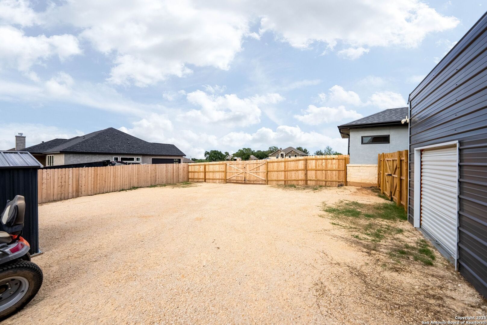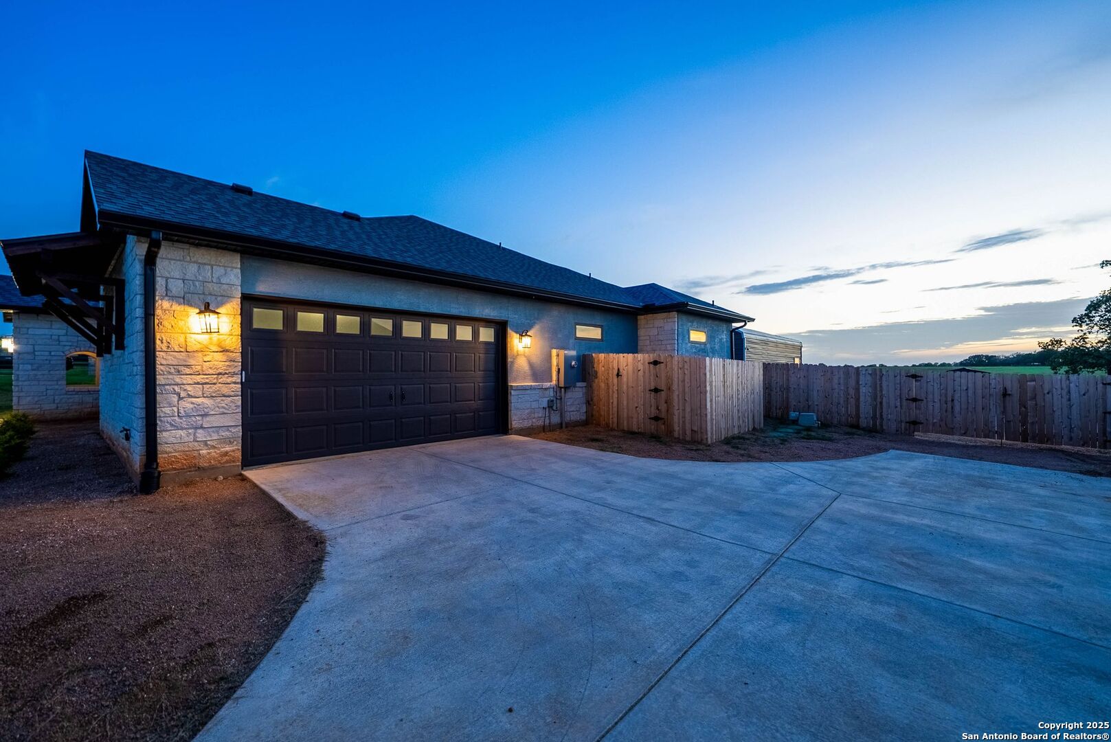 This stunning single-story custom home offers 4 bedrooms, 3.5 bathrooms, and sits on a spacious 1.11-acre lot with no city taxes. Thoughtfully designed, each bedroom includes its own private bathroom, ensuring comfort and privacy for all. The open floor plan is filled with natural light and showcases exceptional craftsmanship, featuring solid walnut custom cabinetry, quartz countertops, and a chef's kitchen tailored for culinary enthusiasts. Warm wood flooring flows throughout the living spaces, adding timeless charm. The home is built with 2x6 studs and spray foam insulation for superior energy efficiency. A gas fireplace brings cozy ambiance to the living area. The 600-square-foot climate-controlled shop includes its own bathroom, making it perfect for a gym, workshop, or creative studio. Additional features include a water softener and iron filter system. While the main roof is a heavy composition material rated for durability, a metal shed-style roof provides architectural interest and shade over the front windows. With 2,700 square feet of living space and high-performance finishes, this fully custom home offers refined South Texas living with lasting quality and comfort.