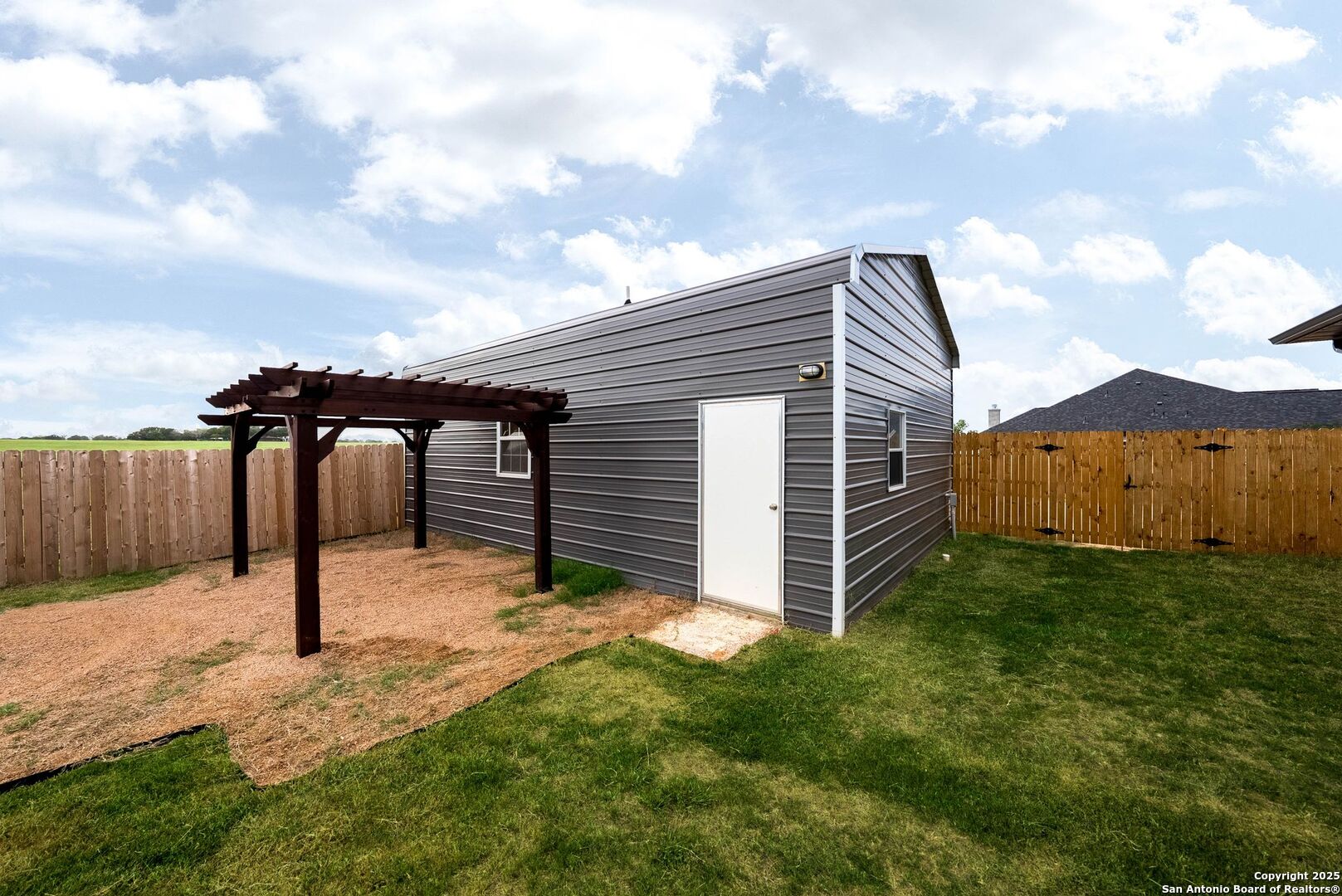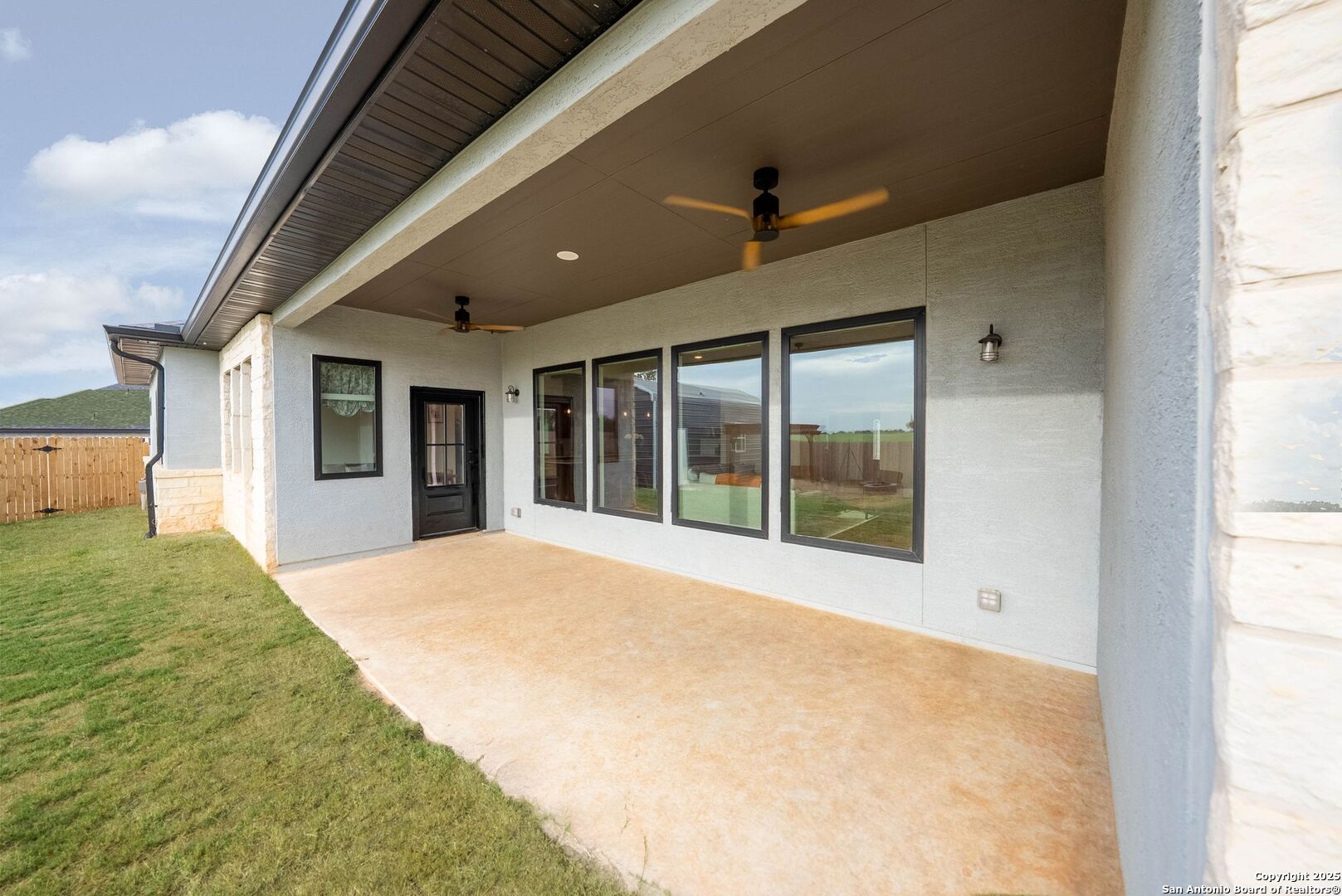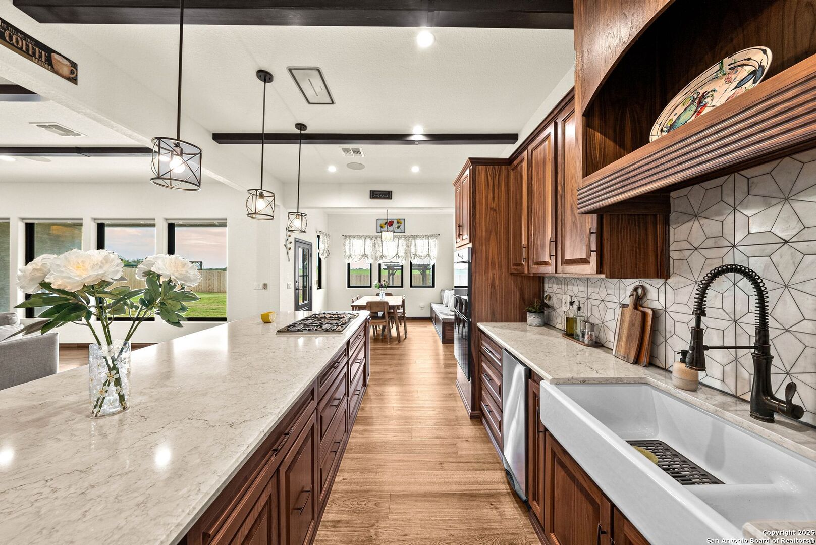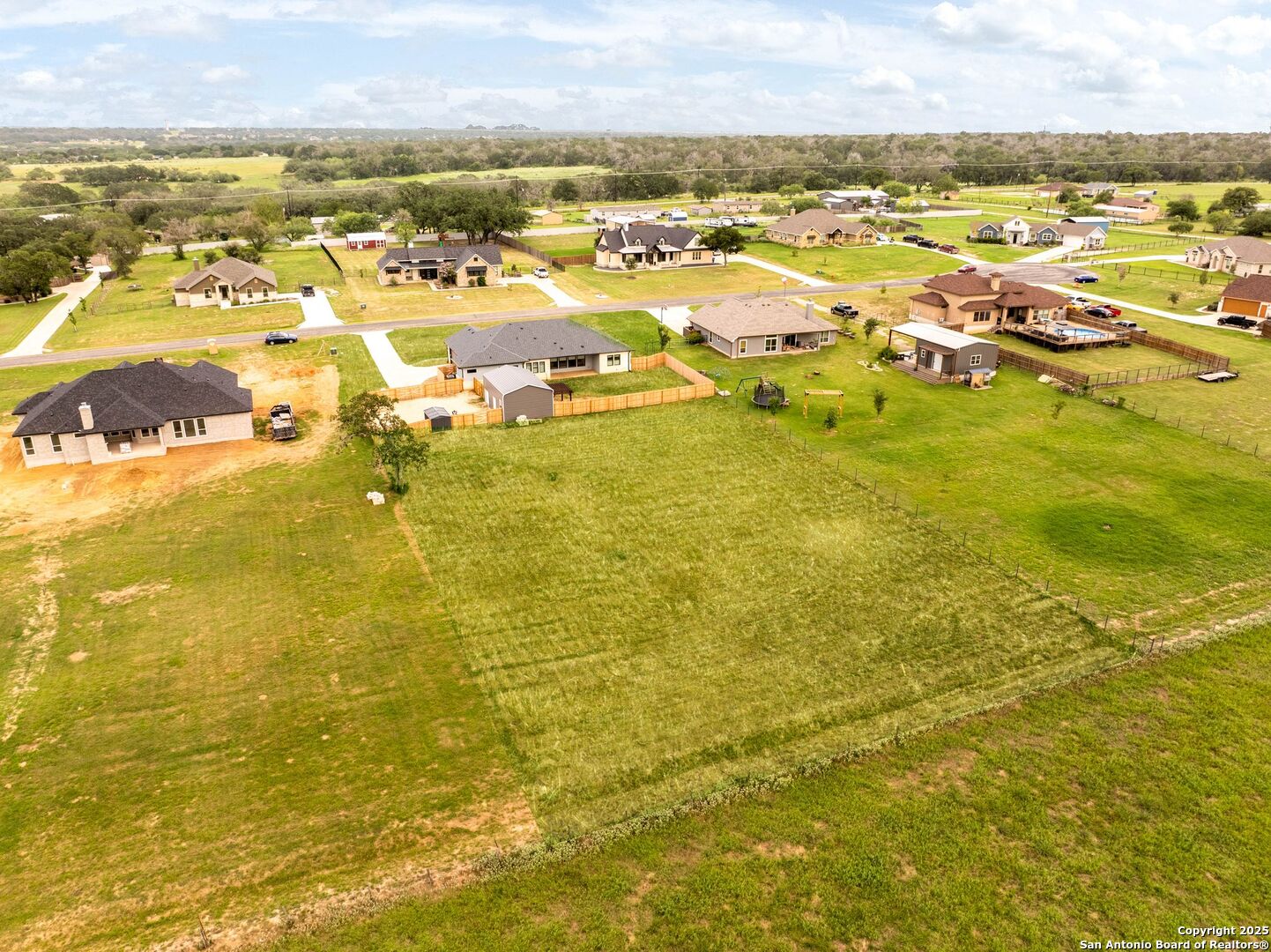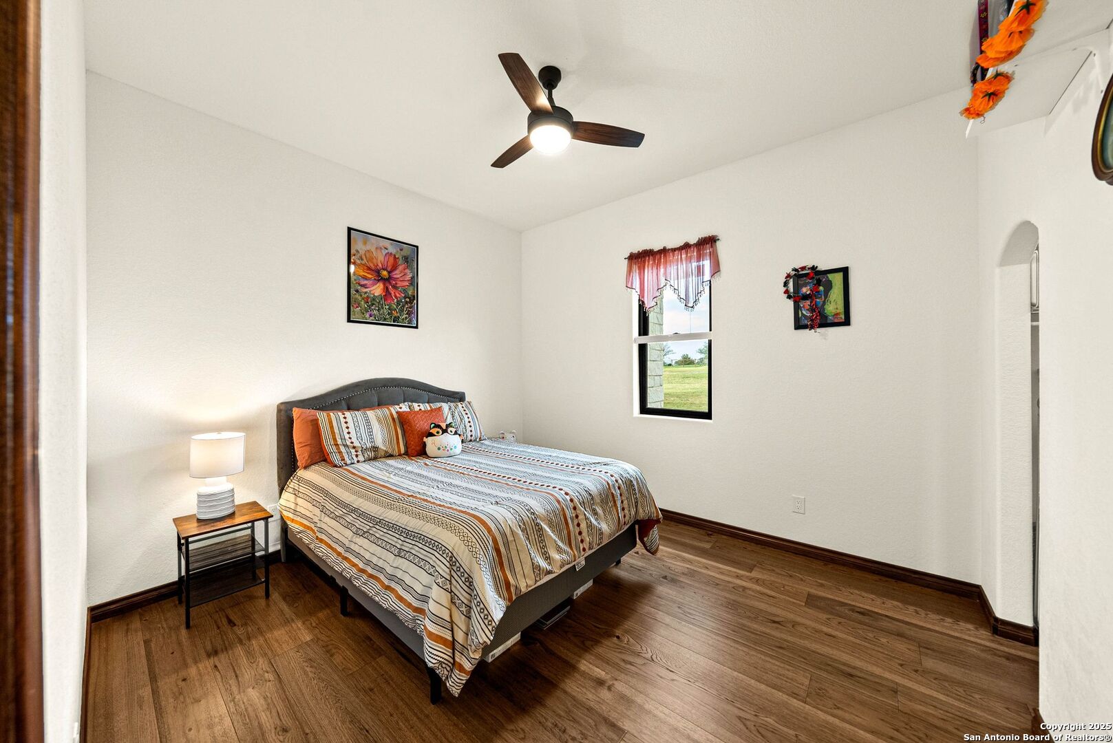 This stunning single-story custom home offers 4 bedrooms, 3.5 bathrooms, and sits on a spacious 1.11-acre lot with no city taxes. Thoughtfully designed, each bedroom includes its own private bathroom, ensuring comfort and privacy for all. The open floor plan is filled with natural light and showcases exceptional craftsmanship, featuring solid walnut custom cabinetry, quartz countertops, and a chef's kitchen tailored for culinary enthusiasts. Warm wood flooring flows throughout the living spaces, adding timeless charm. The home is built with 2x6 studs and spray foam insulation for superior energy efficiency. A gas fireplace brings cozy ambiance to the living area. The 600-square-foot climate-controlled shop includes its own bathroom, making it perfect for a gym, workshop, or creative studio. Additional features include a water softener and iron filter system. While the main roof is a heavy composition material rated for durability, a metal shed-style roof provides architectural interest and shade over the front windows. With 2,700 square feet of living space and high-performance finishes, this fully custom home offers refined South Texas living with lasting quality and comfort.