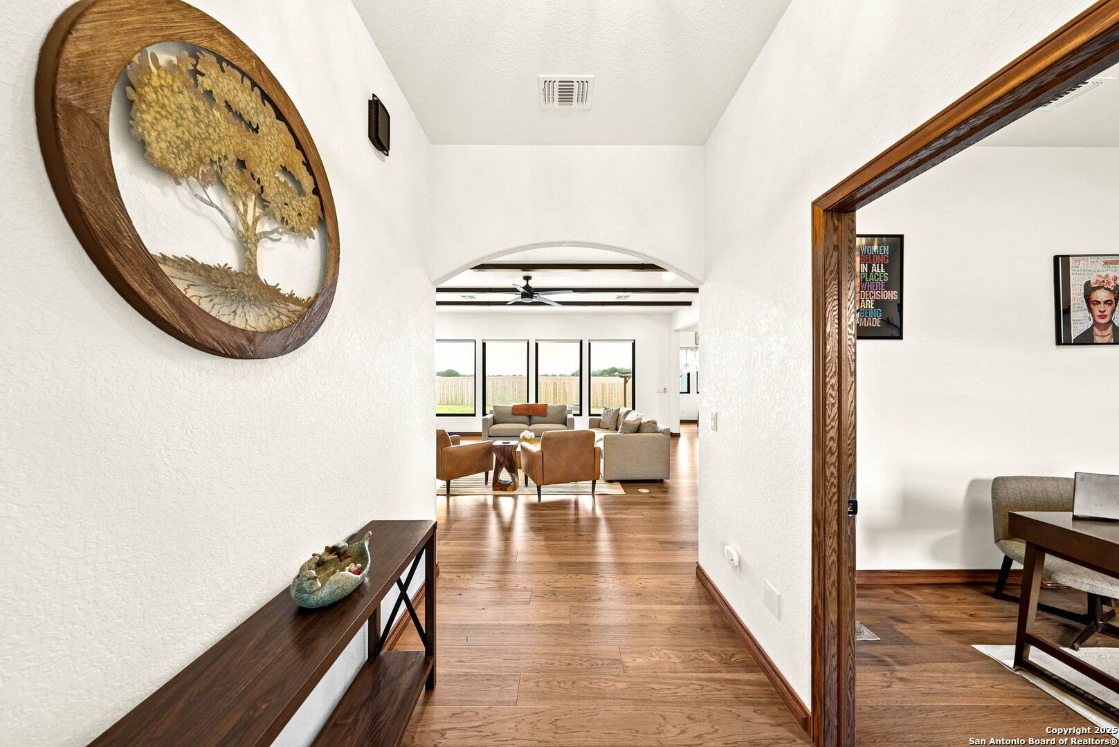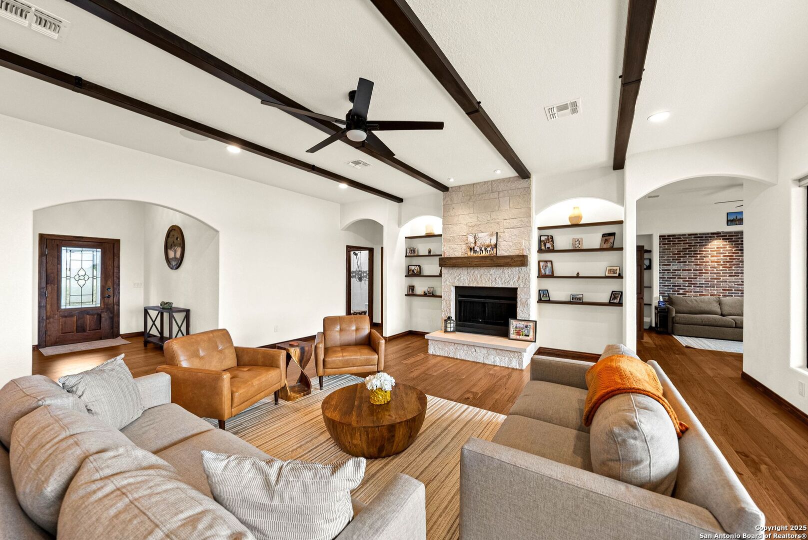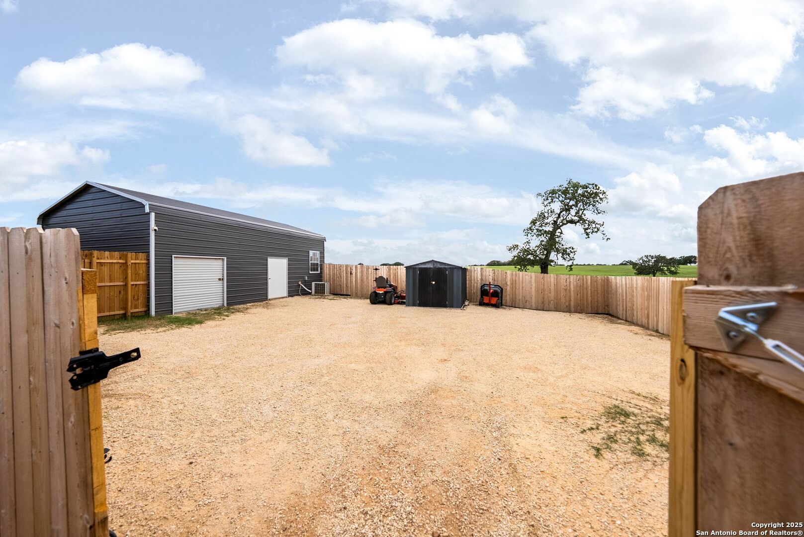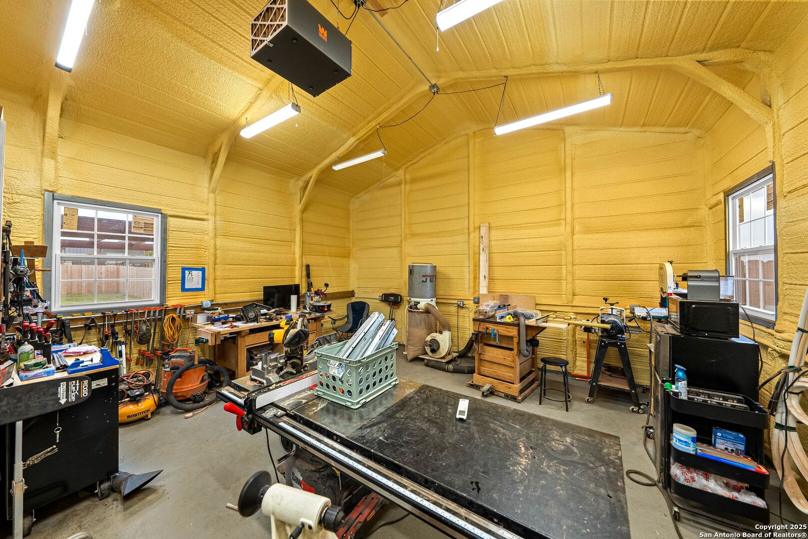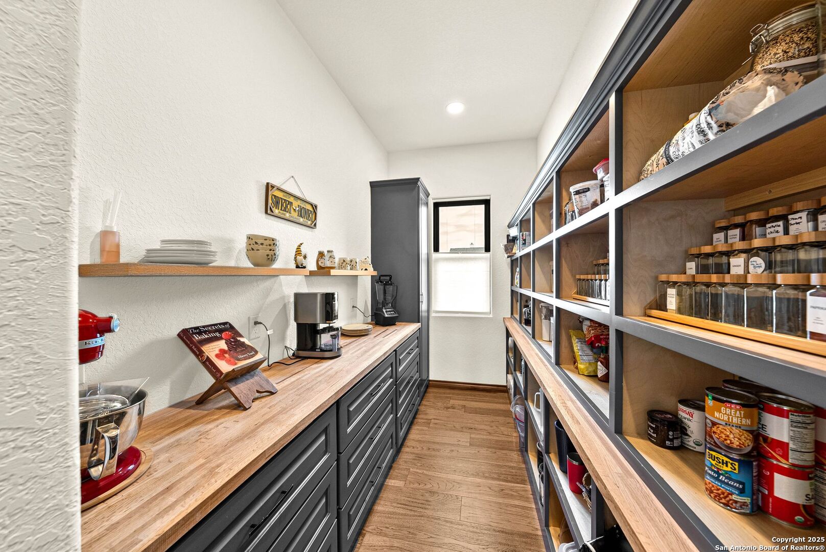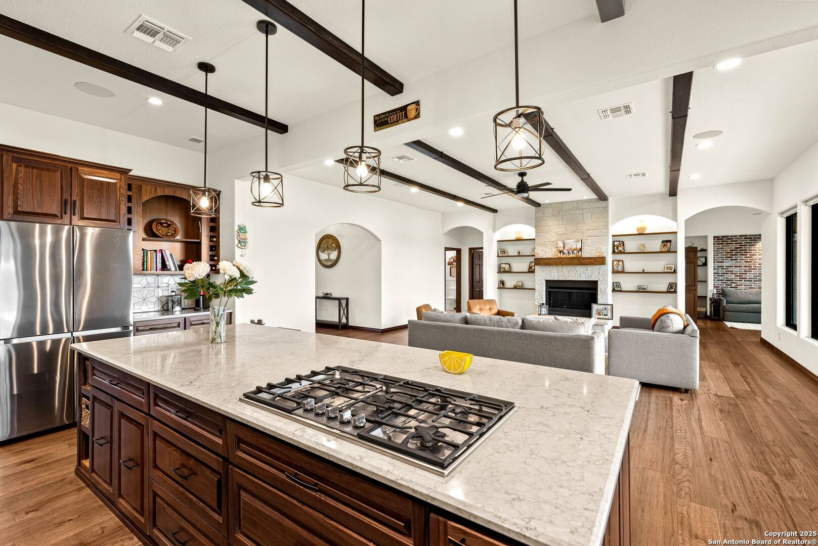 This stunning single-story custom home offers 4 bedrooms, 3.5 bathrooms, and sits on a spacious 1.11-acre lot with no city taxes. Thoughtfully designed, each bedroom includes its own private bathroom, ensuring comfort and privacy for all. The open floor plan is filled with natural light and showcases exceptional craftsmanship, featuring solid walnut custom cabinetry, quartz countertops, and a chef's kitchen tailored for culinary enthusiasts. Warm wood flooring flows throughout the living spaces, adding timeless charm. The home is built with 2x6 studs and spray foam insulation for superior energy efficiency. A gas fireplace brings cozy ambiance to the living area. The 600-square-foot climate-controlled shop includes its own bathroom, making it perfect for a gym, workshop, or creative studio. Additional features include a water softener and iron filter system. While the main roof is a heavy composition material rated for durability, a metal shed-style roof provides architectural interest and shade over the front windows. With 2,700 square feet of living space and high-performance finishes, this fully custom home offers refined South Texas living with lasting quality and comfort.