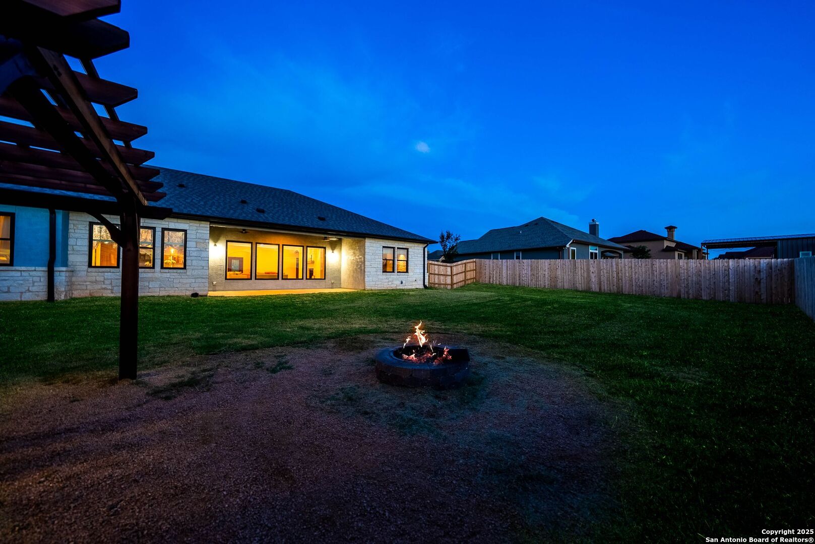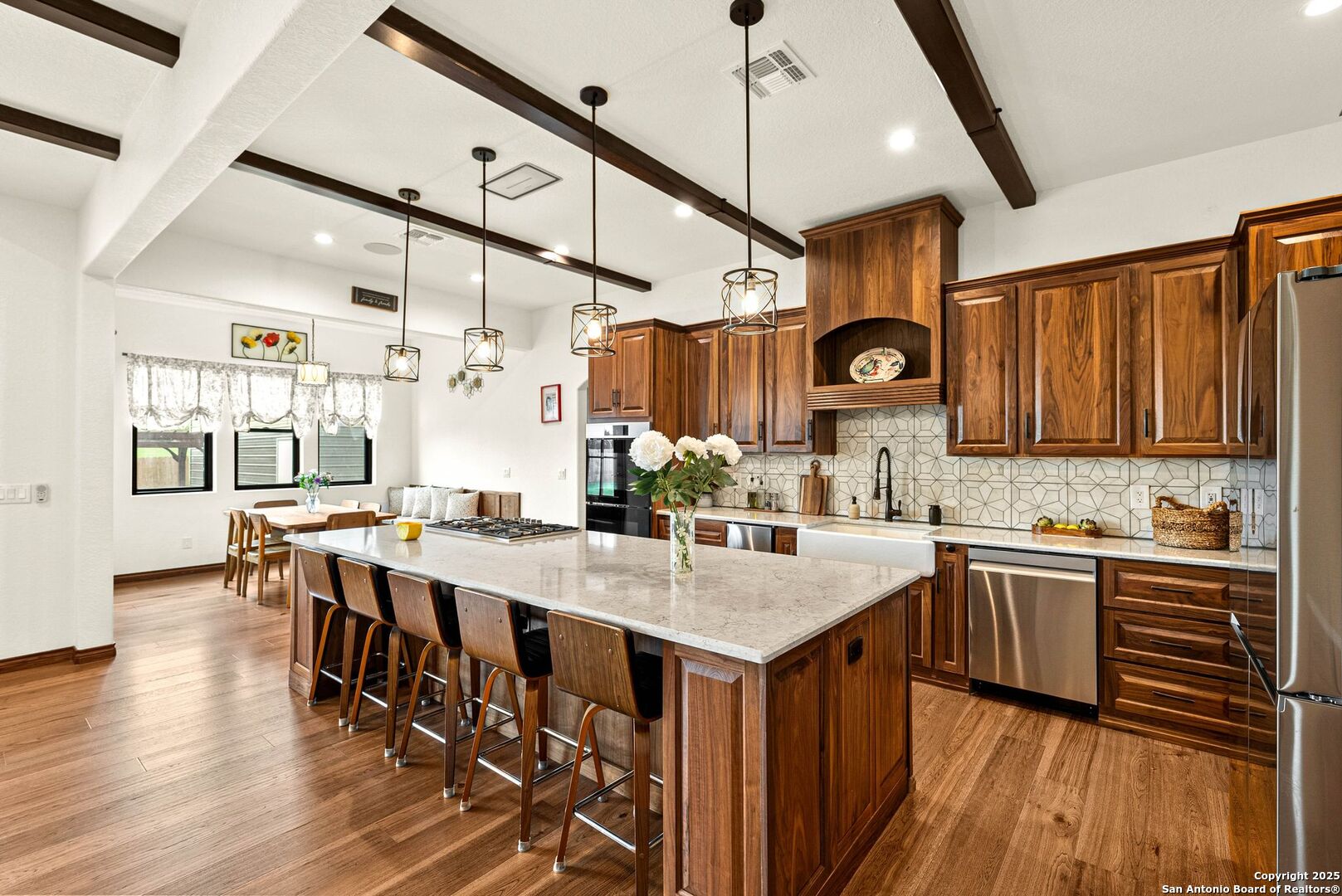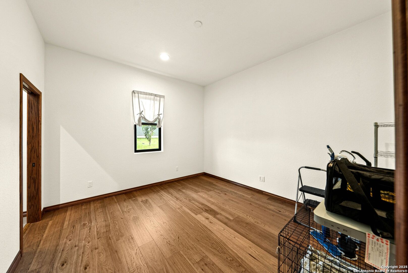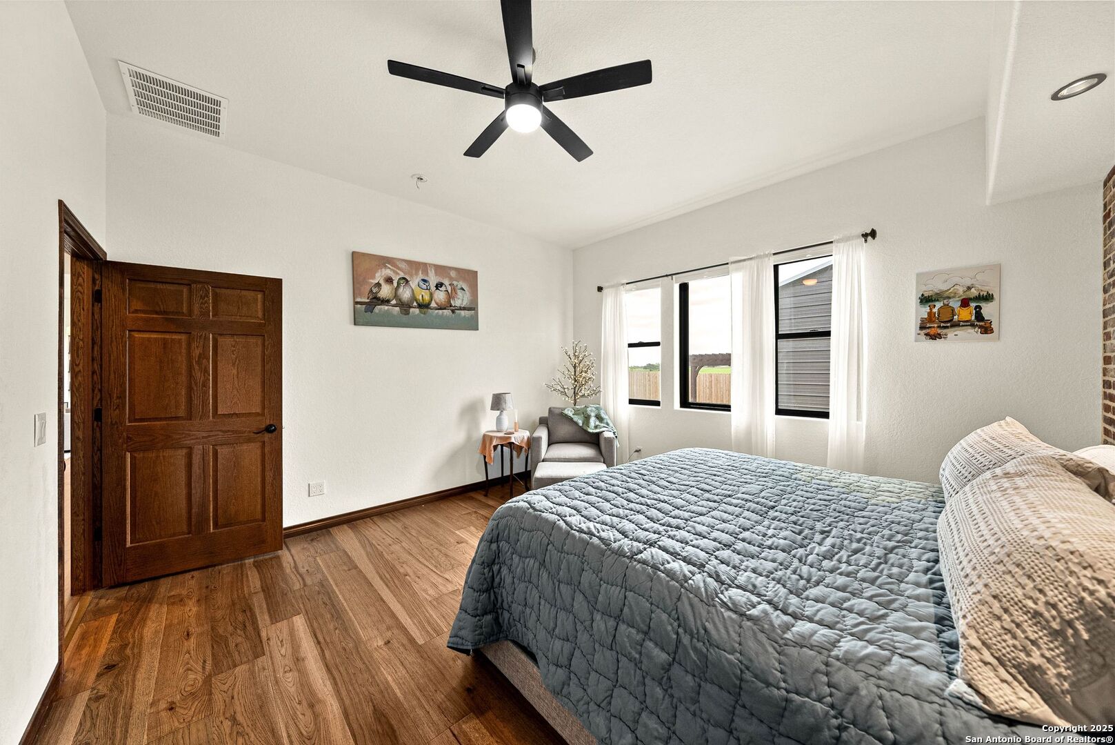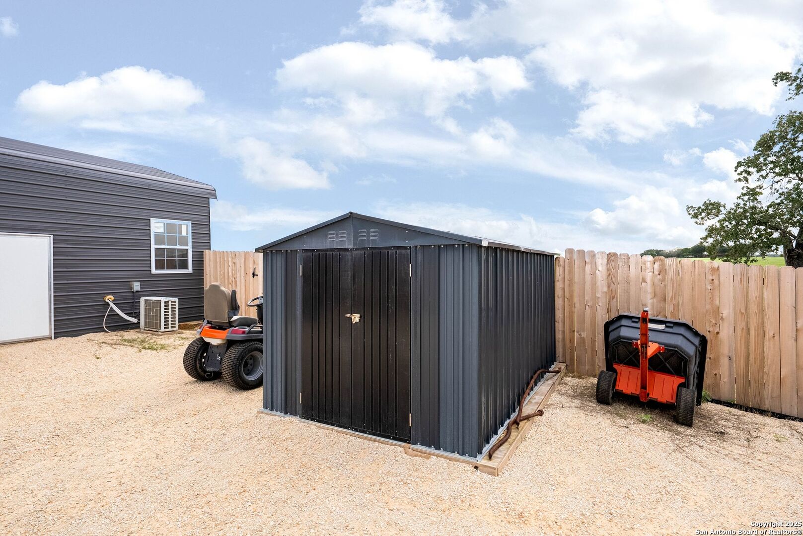 This stunning single-story custom home offers 4 bedrooms, 3.5 bathrooms, and sits on a spacious 1.11-acre lot with no city taxes. Thoughtfully designed, each bedroom includes its own private bathroom, ensuring comfort and privacy for all. The open floor plan is filled with natural light and showcases exceptional craftsmanship, featuring solid walnut custom cabinetry, quartz countertops, and a chef's kitchen tailored for culinary enthusiasts. Warm wood flooring flows throughout the living spaces, adding timeless charm. The home is built with 2x6 studs and spray foam insulation for superior energy efficiency. A gas fireplace brings cozy ambiance to the living area. The 600-square-foot climate-controlled shop includes its own bathroom, making it perfect for a gym, workshop, or creative studio. Additional features include a water softener and iron filter system. While the main roof is a heavy composition material rated for durability, a metal shed-style roof provides architectural interest and shade over the front windows. With 2,700 square feet of living space and high-performance finishes, this fully custom home offers refined South Texas living with lasting quality and comfort.