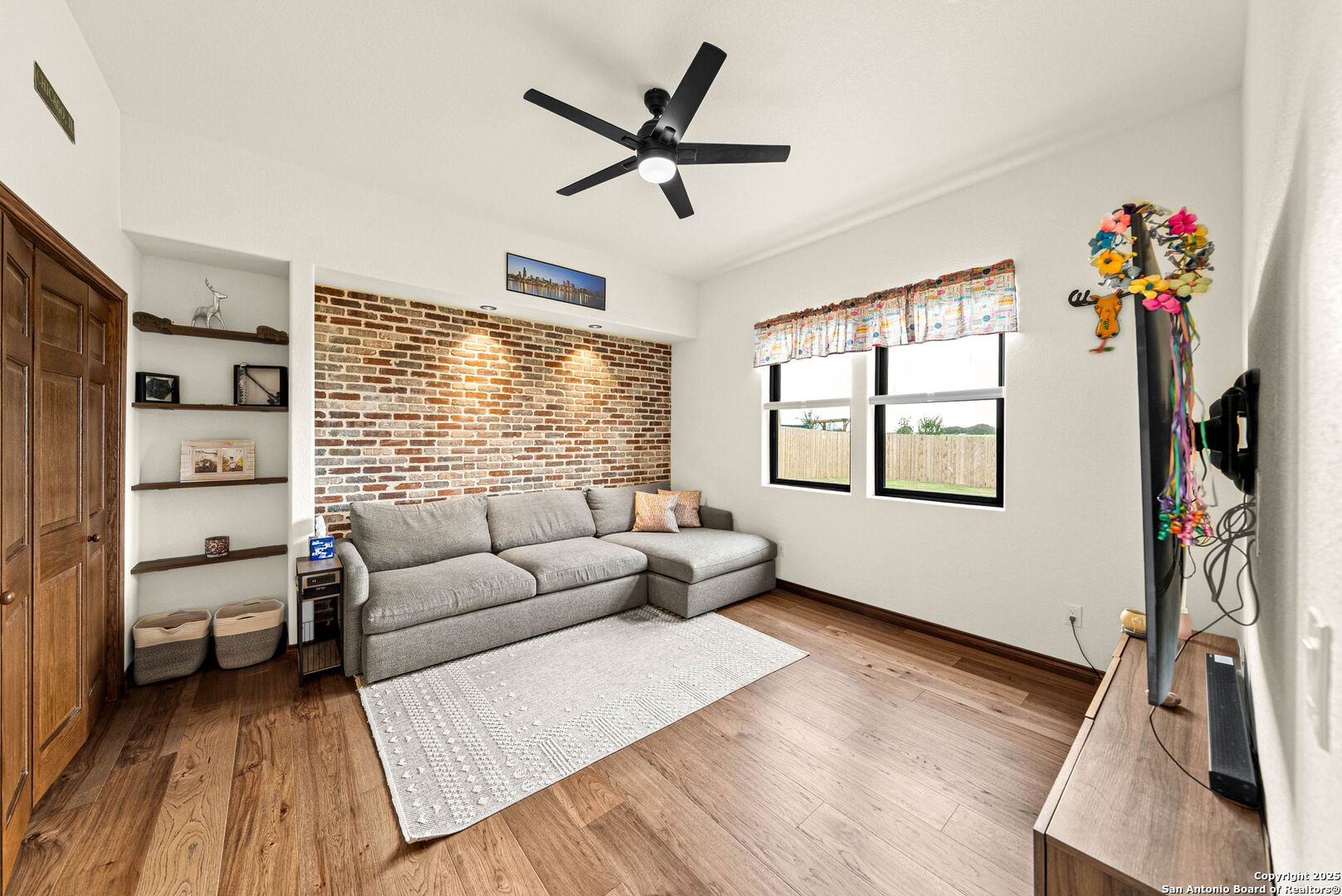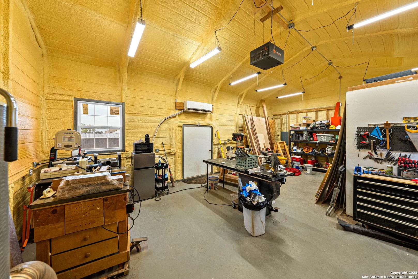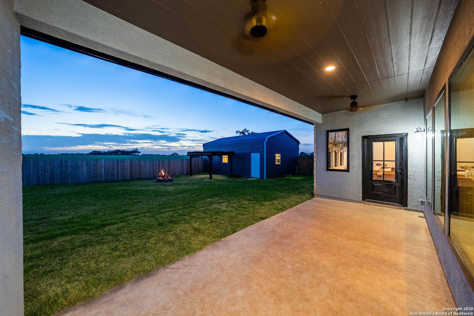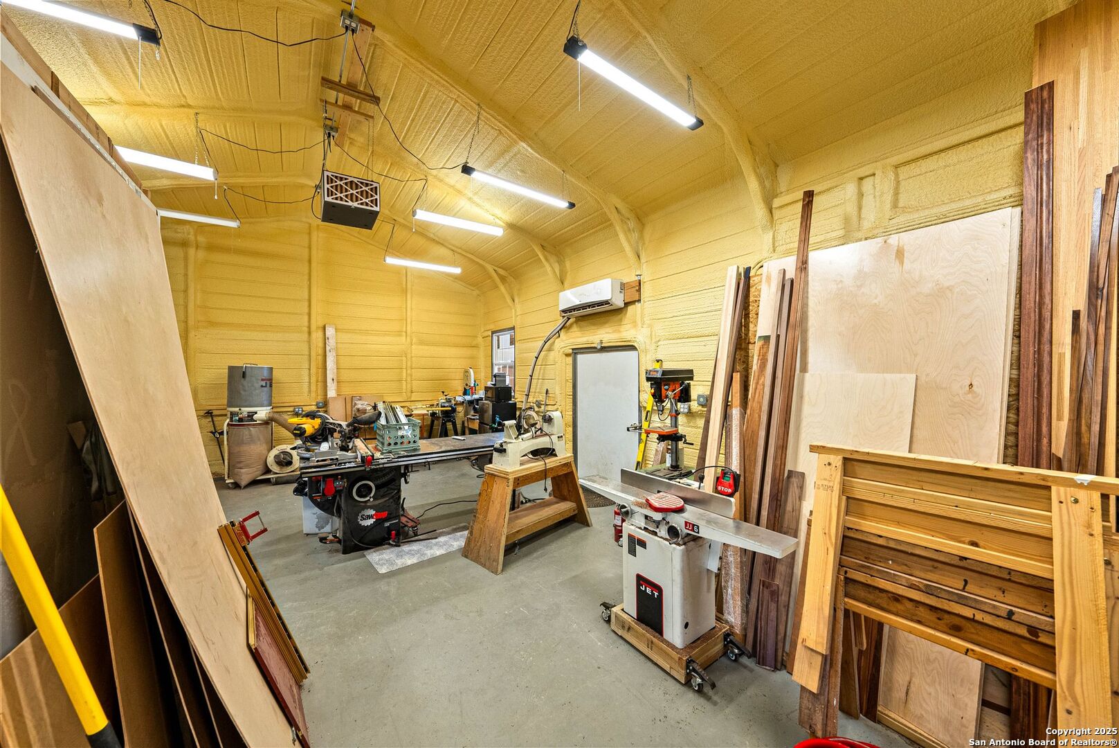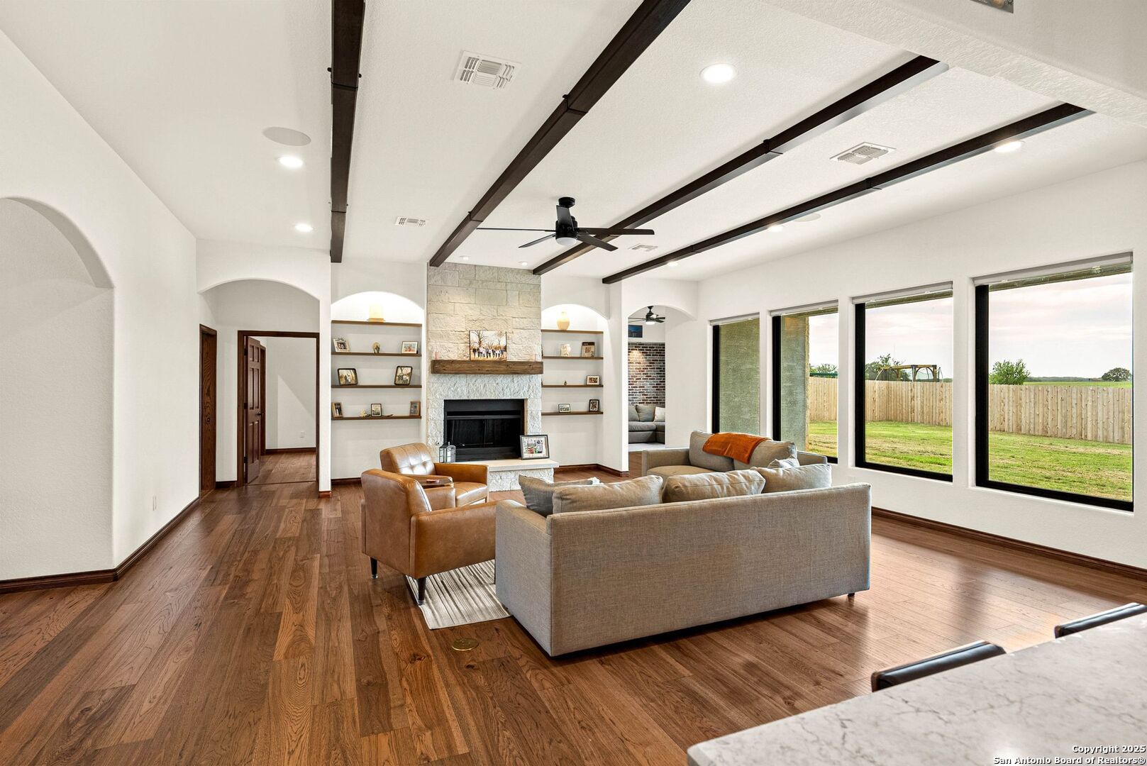 This stunning single-story custom home offers 4 bedrooms, 3.5 bathrooms, and sits on a spacious 1.11-acre lot with no city taxes. Thoughtfully designed, each bedroom includes its own private bathroom, ensuring comfort and privacy for all. The open floor plan is filled with natural light and showcases exceptional craftsmanship, featuring solid walnut custom cabinetry, quartz countertops, and a chef's kitchen tailored for culinary enthusiasts. Warm wood flooring flows throughout the living spaces, adding timeless charm. The home is built with 2x6 studs and spray foam insulation for superior energy efficiency. A gas fireplace brings cozy ambiance to the living area. The 600-square-foot climate-controlled shop includes its own bathroom, making it perfect for a gym, workshop, or creative studio. Additional features include a water softener and iron filter system. While the main roof is a heavy composition material rated for durability, a metal shed-style roof provides architectural interest and shade over the front windows. With 2,700 square feet of living space and high-performance finishes, this fully custom home offers refined South Texas living with lasting quality and comfort.