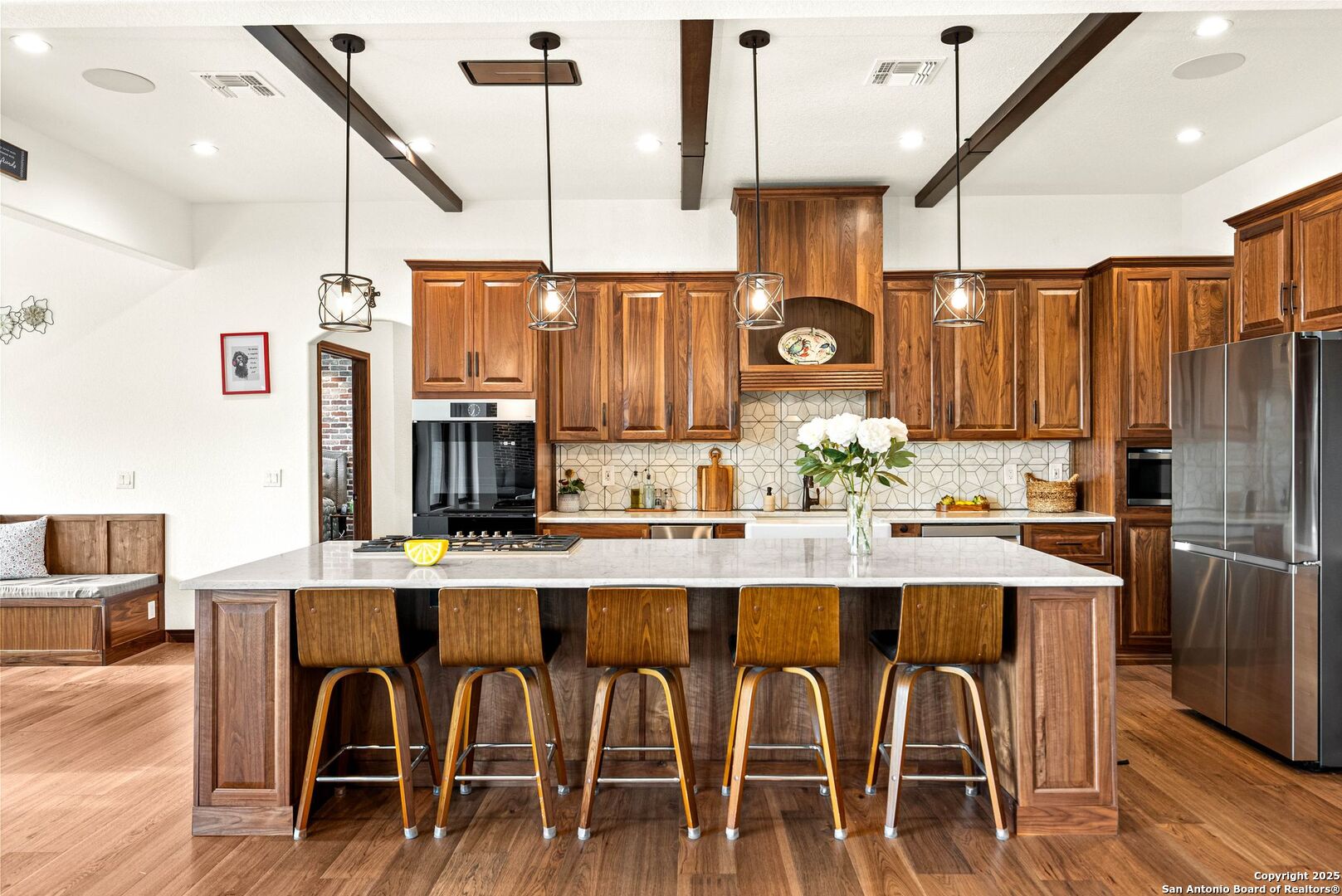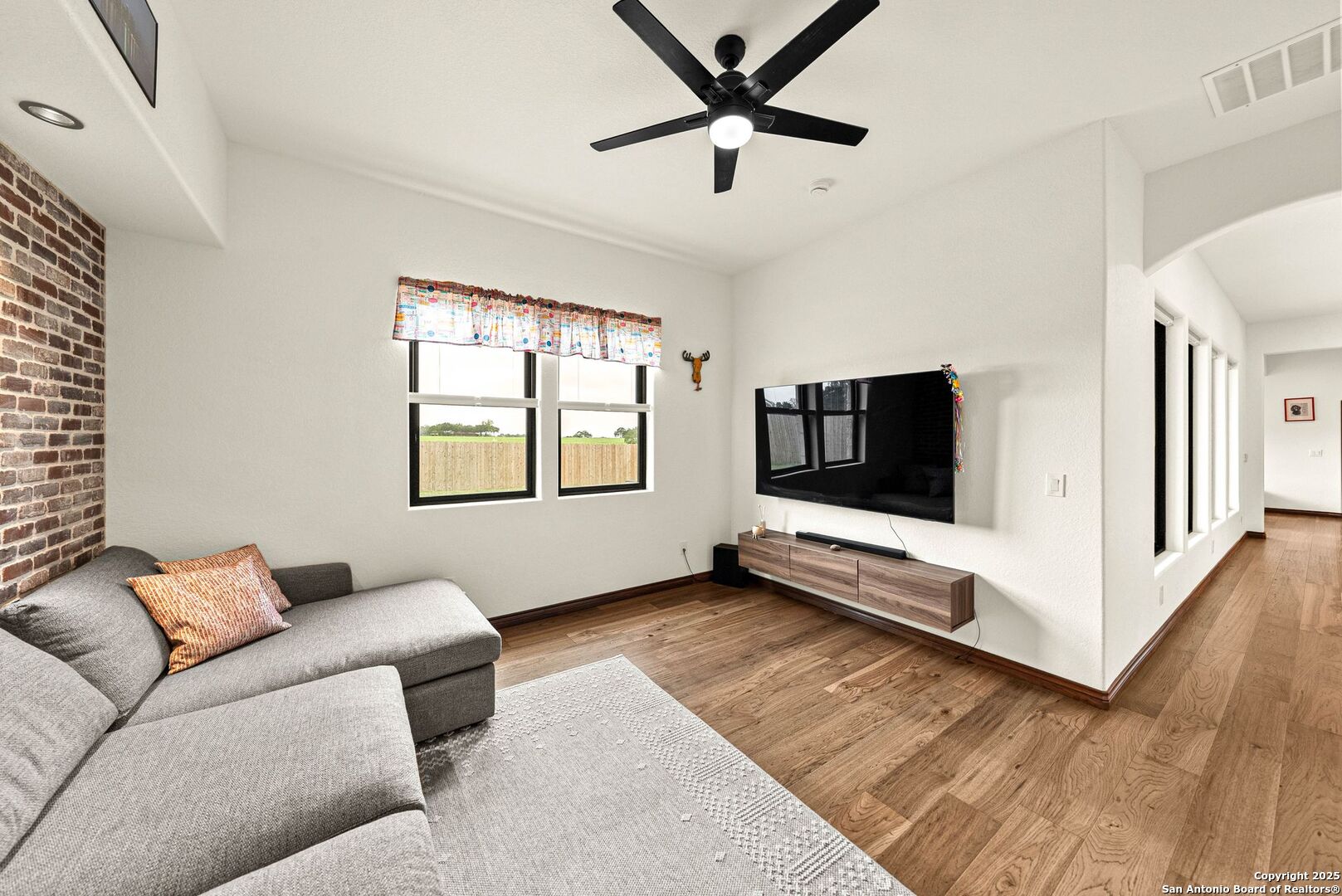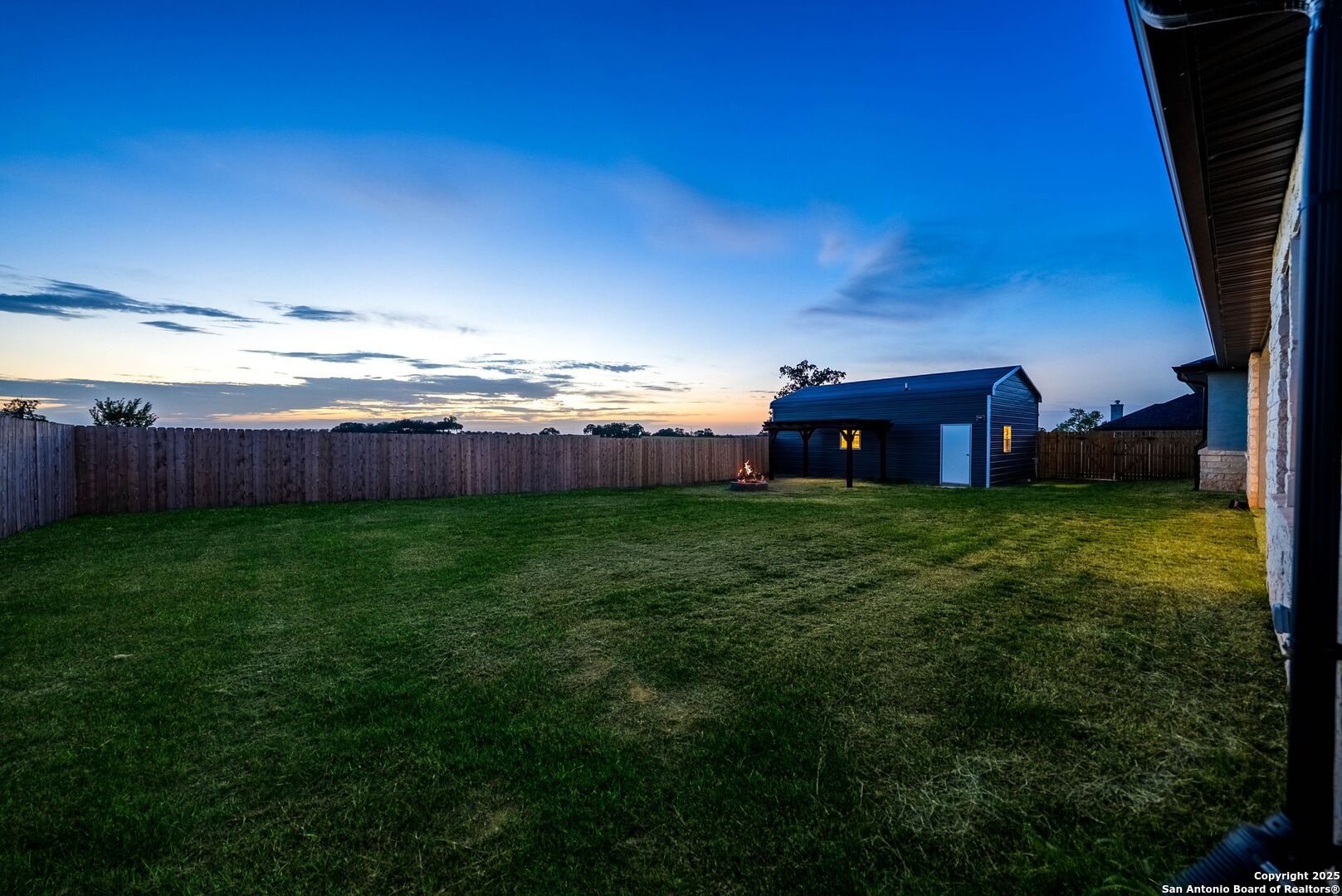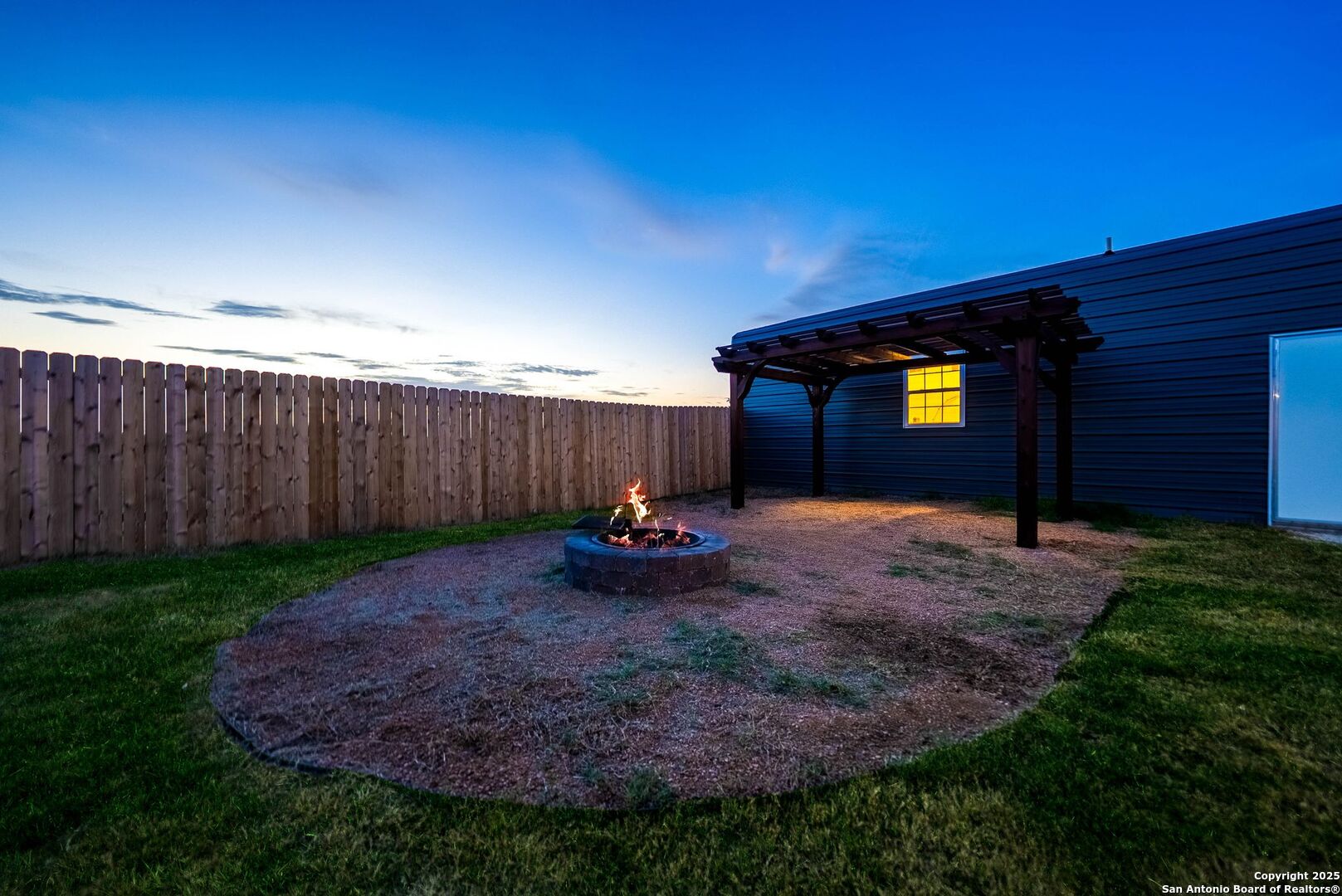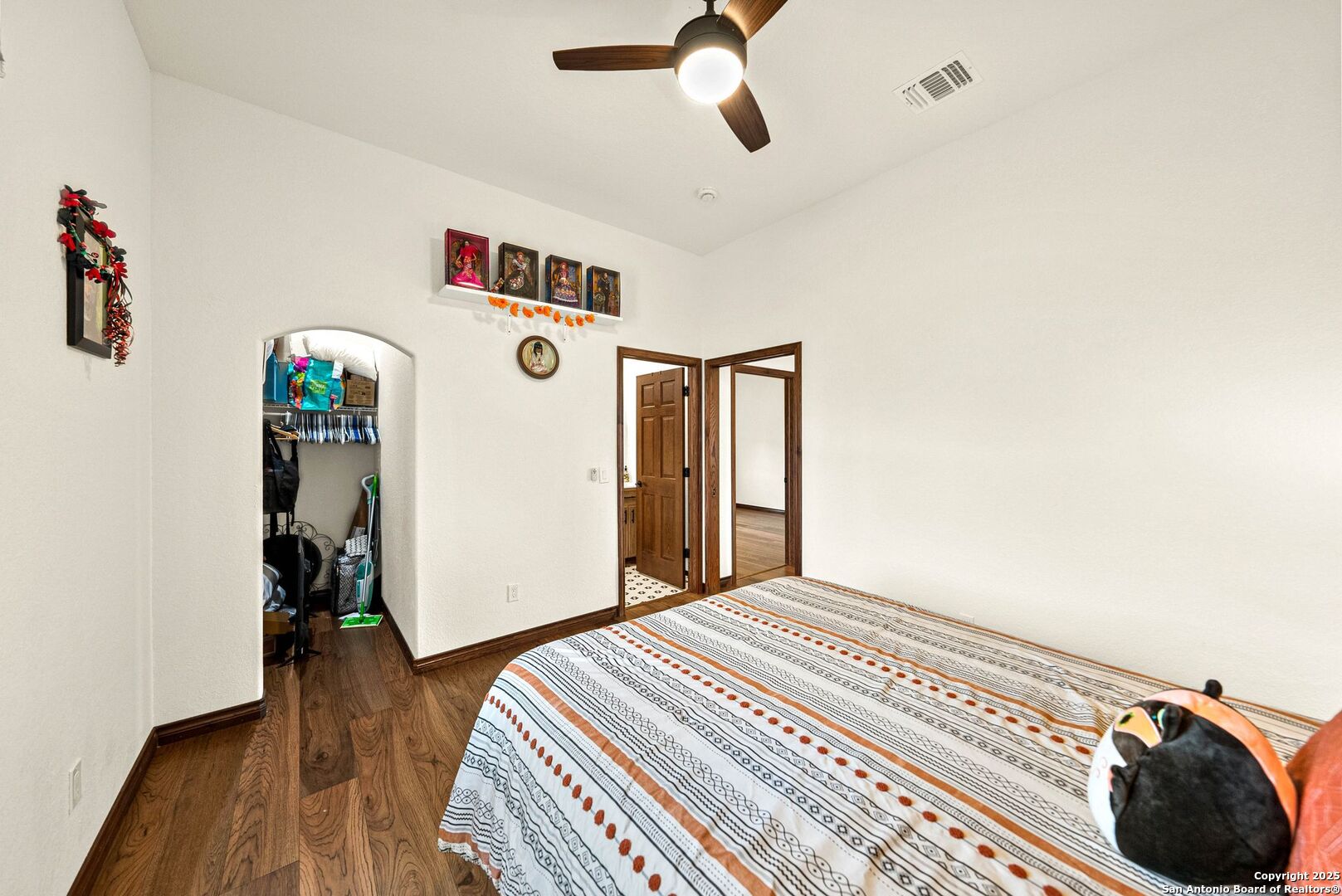 This stunning single-story custom home offers 4 bedrooms, 3.5 bathrooms, and sits on a spacious 1.11-acre lot with no city taxes. Thoughtfully designed, each bedroom includes its own private bathroom, ensuring comfort and privacy for all. The open floor plan is filled with natural light and showcases exceptional craftsmanship, featuring solid walnut custom cabinetry, quartz countertops, and a chef's kitchen tailored for culinary enthusiasts. Warm wood flooring flows throughout the living spaces, adding timeless charm. The home is built with 2x6 studs and spray foam insulation for superior energy efficiency. A gas fireplace brings cozy ambiance to the living area. The 600-square-foot climate-controlled shop includes its own bathroom, making it perfect for a gym, workshop, or creative studio. Additional features include a water softener and iron filter system. While the main roof is a heavy composition material rated for durability, a metal shed-style roof provides architectural interest and shade over the front windows. With 2,700 square feet of living space and high-performance finishes, this fully custom home offers refined South Texas living with lasting quality and comfort.