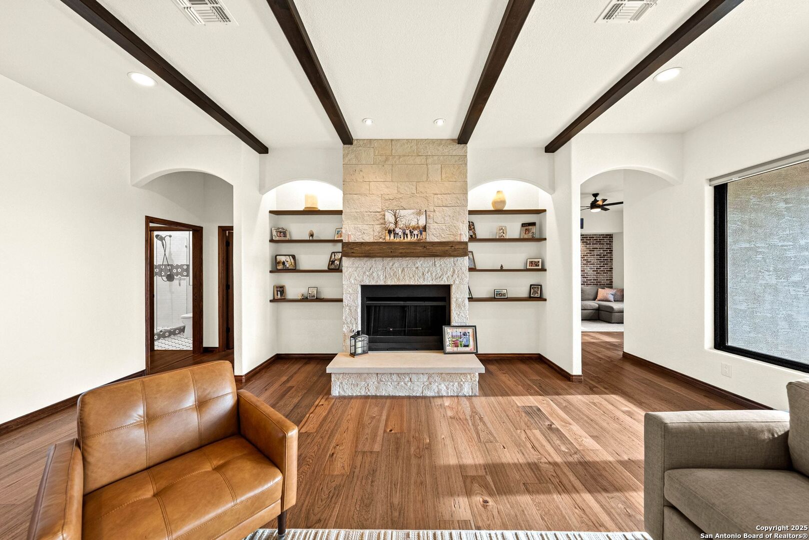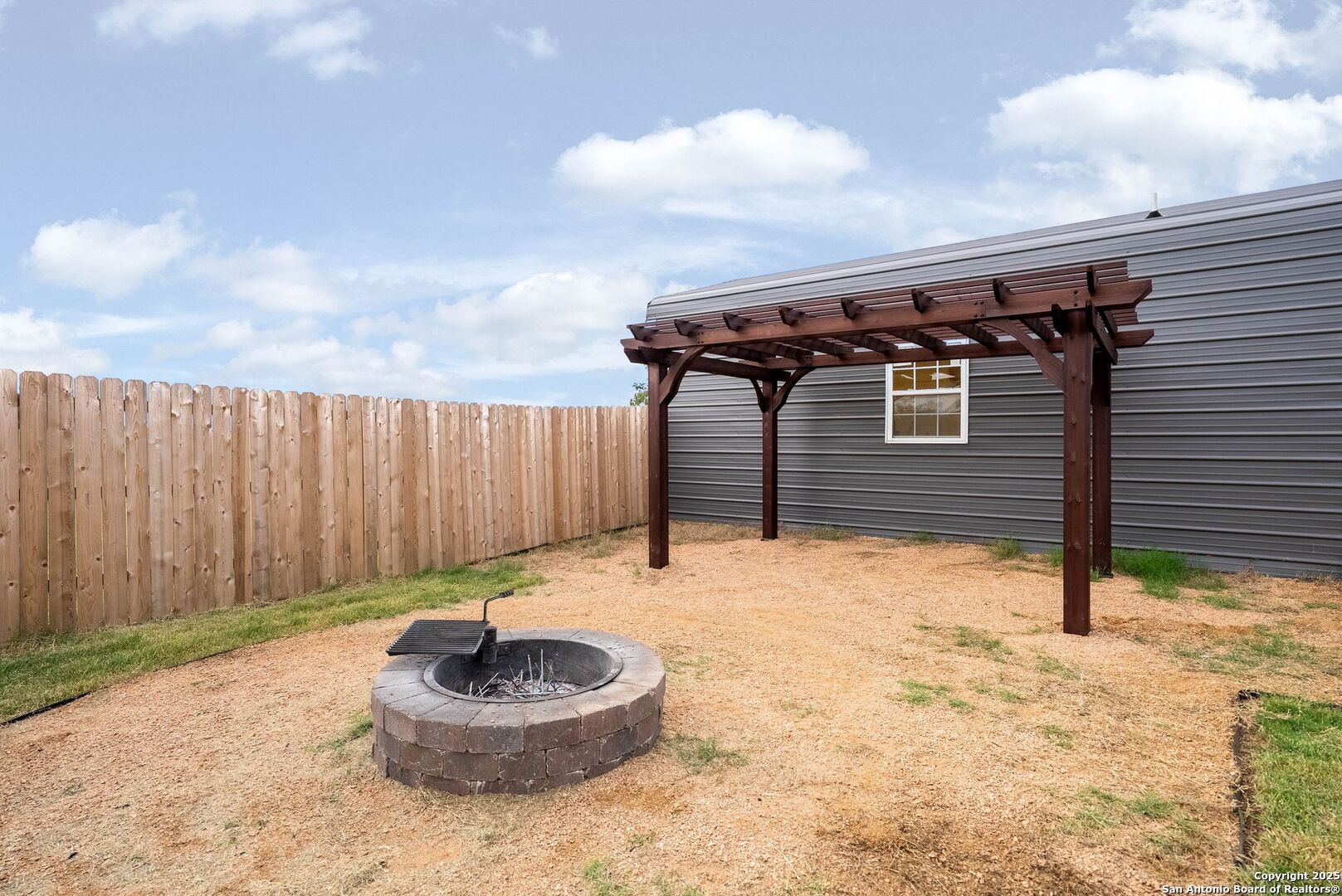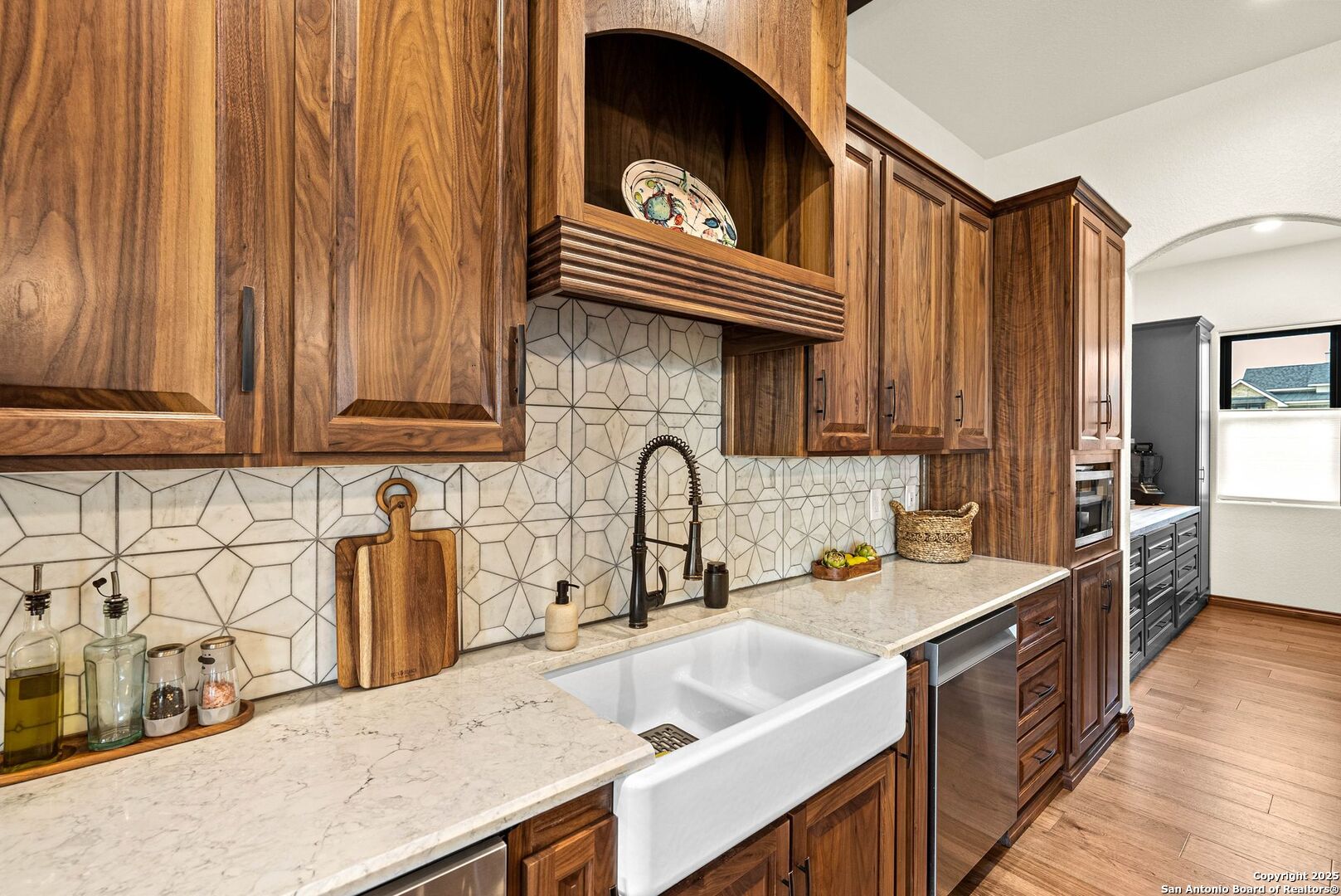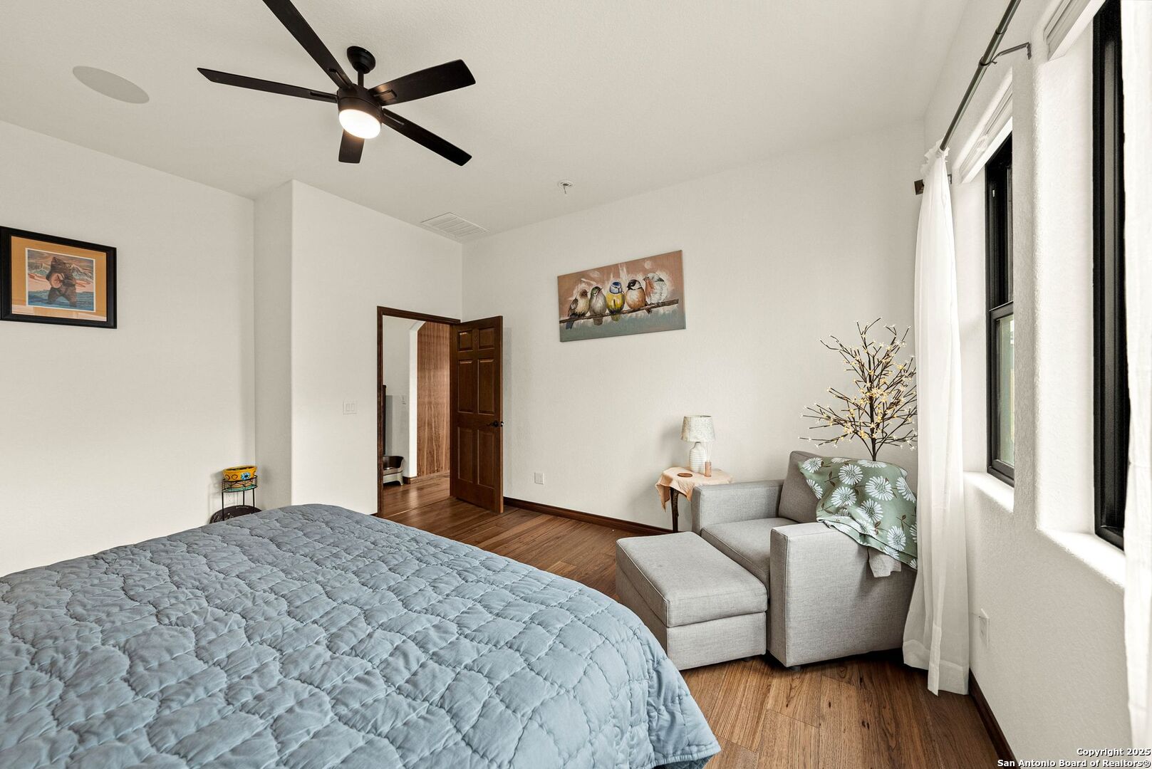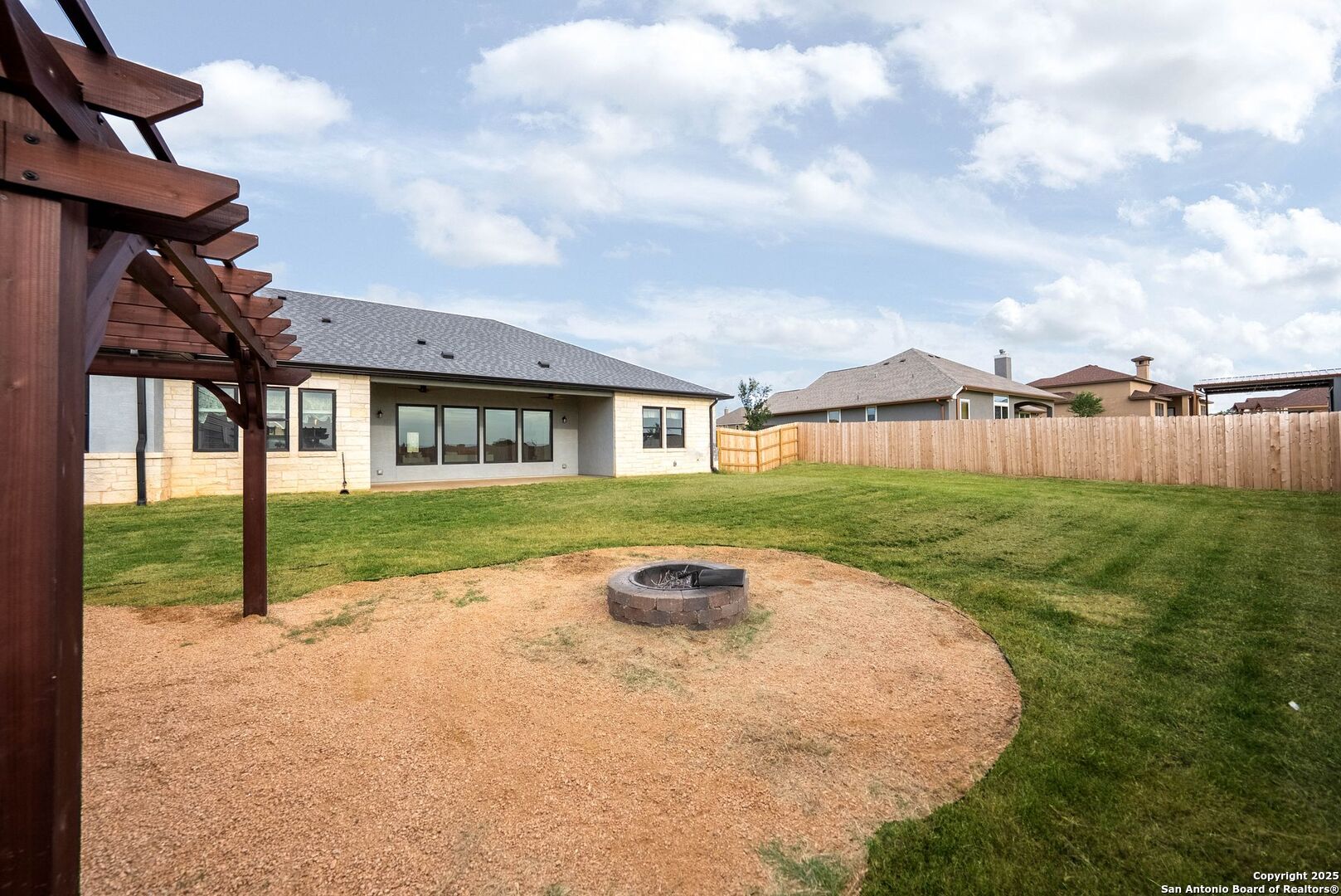 This stunning single-story custom home offers 4 bedrooms, 3.5 bathrooms, and sits on a spacious 1.11-acre lot with no city taxes. Thoughtfully designed, each bedroom includes its own private bathroom, ensuring comfort and privacy for all. The open floor plan is filled with natural light and showcases exceptional craftsmanship, featuring solid walnut custom cabinetry, quartz countertops, and a chef's kitchen tailored for culinary enthusiasts. Warm wood flooring flows throughout the living spaces, adding timeless charm. The home is built with 2x6 studs and spray foam insulation for superior energy efficiency. A gas fireplace brings cozy ambiance to the living area. The 600-square-foot climate-controlled shop includes its own bathroom, making it perfect for a gym, workshop, or creative studio. Additional features include a water softener and iron filter system. While the main roof is a heavy composition material rated for durability, a metal shed-style roof provides architectural interest and shade over the front windows. With 2,700 square feet of living space and high-performance finishes, this fully custom home offers refined South Texas living with lasting quality and comfort.