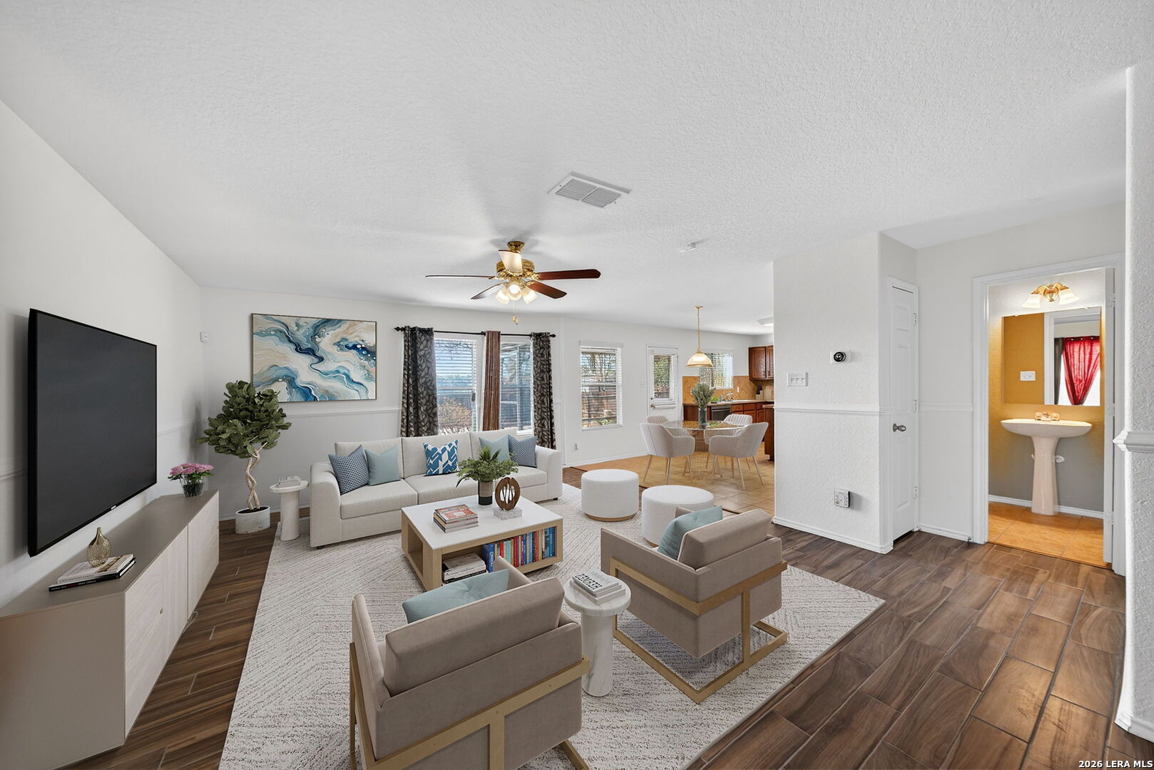 Located at 12010 Dove Ranch in San Antonio, this 4 bedroom, 2.5 bathroom home offers a thoughtfully designed open-concept layout ideal for everyday living and entertaining. The foyer leads into a spacious living, dining, and kitchen area where natural flow creates a comfortable gathering space. The kitchen provides abundant counter space, a center island, and a walk-in pantry for added storage and functionality. The primary suite features a recessed ceiling detail that adds architectural interest, along with an attached bathroom complete with dual vanities, a soaking tub, and a separate standing shower. A large walk-in closet enhances the suite's practical appeal. Secondary bedrooms offer comfortable space for guests, household members, or a home office. Outdoors, the enclosed covered patio extends the living space and provides a versatile area for year-round enjoyment. Mature trees add shade and character, while cobbled backyard pathways create a low-maintenance landscape with visual charm. Situated in San Antonio, this residential property combines functional design with inviting indoor and outdoor spaces. Enjoy the green space behind, one year old HVAC with 10 year transferrable warranty and paid off solar panels. Fresh paint throughout the home. Schedule your private showing to see how this home can fit your lifestyle.