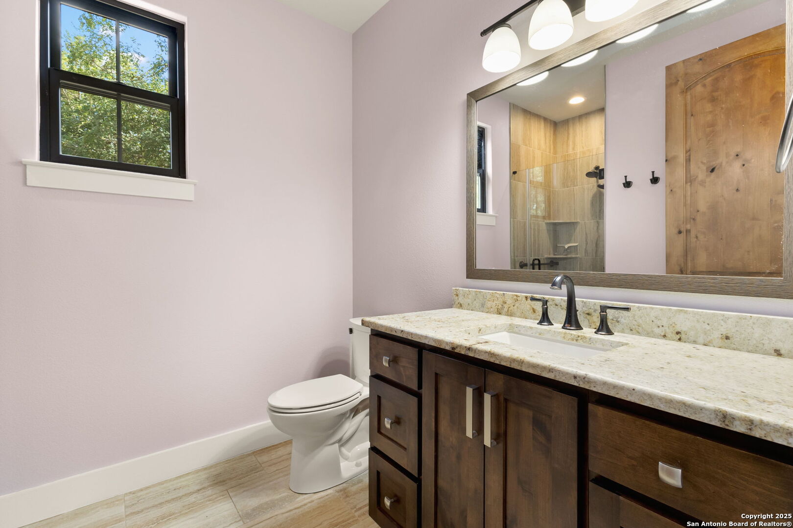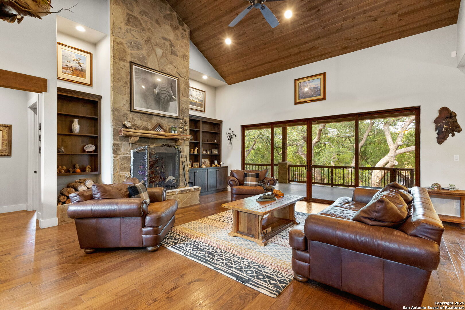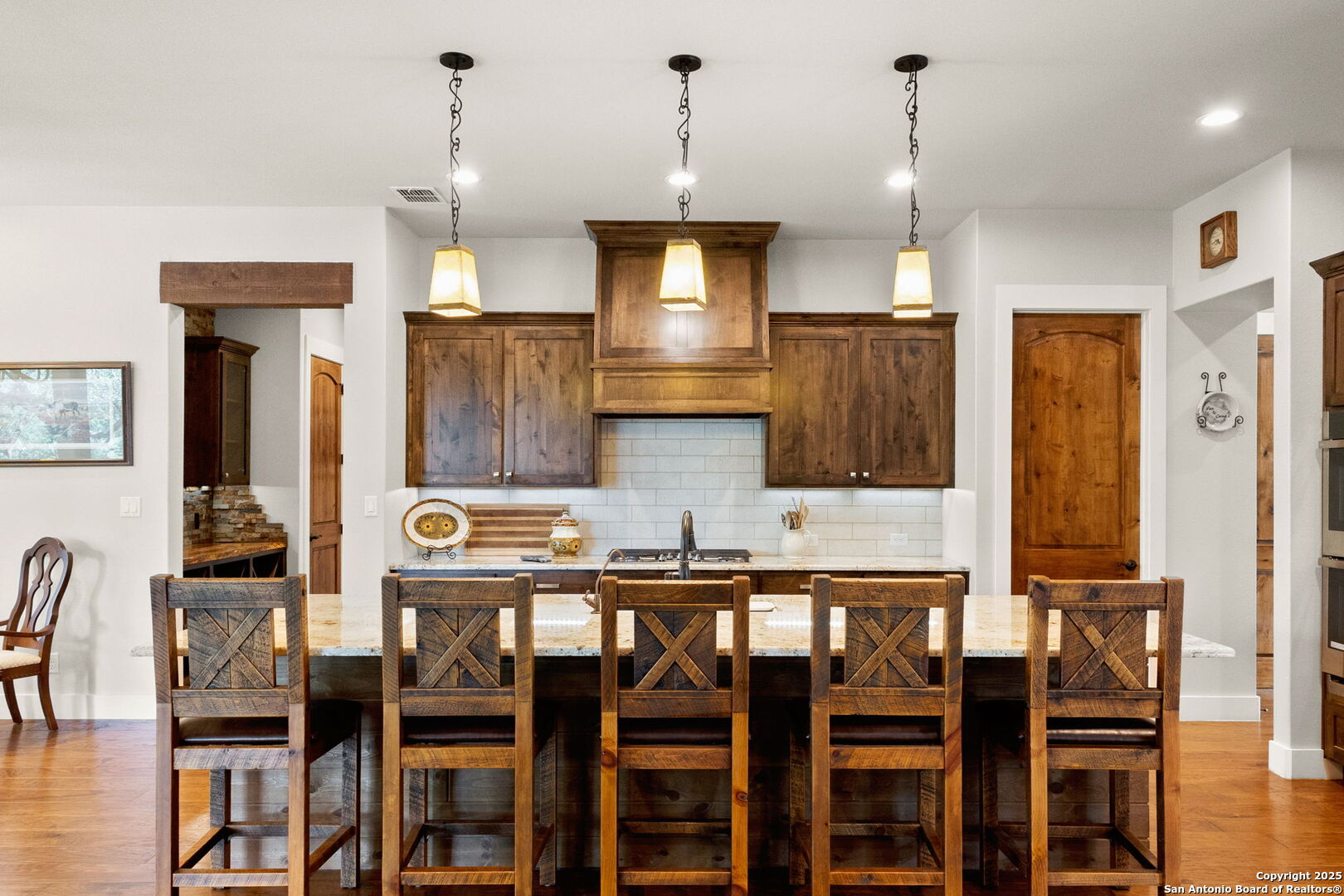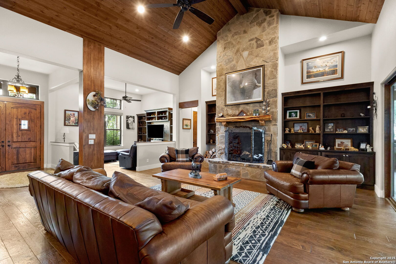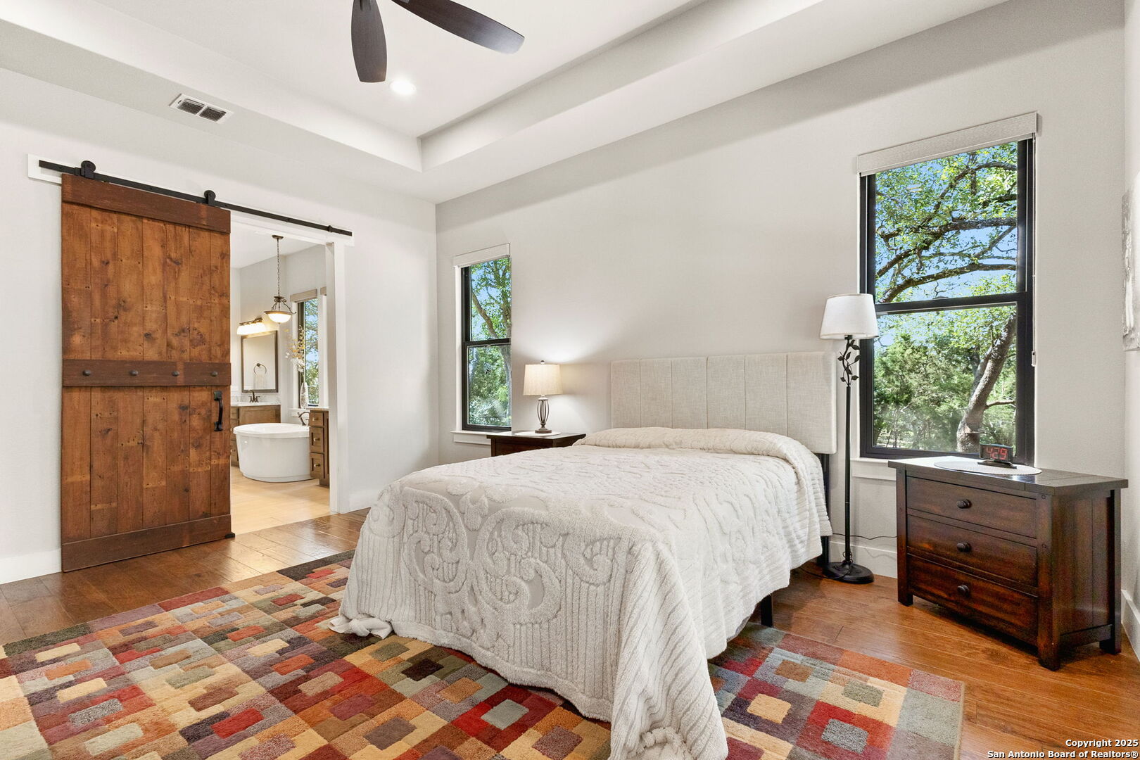 Poised on a breathtaking 2.28-acre estate rich with towering oaks and unmatched serenity, this luxury lodge-style residence is a rare opportunity in the coveted, resort-inspired community of Vintage Oaks. Designed and custom built by renowned luxury builder G. Morris, every detail of this home exudes timeless craftsmanship, natural beauty, and refined Hill Country elegance. The main residence spans 2,843 sq ft, with three spacious bedrooms, each offering its own en suite bathroom for ultimate comfort and privacy. Rich wood flooring flows throughout the home, complemented by solid wood doors, creating a warm, sophisticated ambiance. The heart of the home showcases lodge-inspired architecture with natural textures, expansive windows framing the wooded landscape, and seamless indoor-outdoor living. A stylish powder bath and an oversized 3-car garage complete the main home. Adding even more versatility and charm, the 600 sq ft guest house offers a private escape with a wood-burning stove, full bath, and walk-in closet-perfect for guests, extended family, or a home office retreat. Surrounded by nature and set far back from the road, this property offers a true sense of escape, where the sounds of the breeze and birdsong take the place of city noise. Yet, you'll still enjoy the world-class amenities of Vintage Oaks, including a resort-style pool complex, fitness center, lazy river, sports courts, miles of hiking trails, and more. 1204 Salt Lick Drive is more than a home-it's a luxurious and secluded sanctuary, where the natural beauty of the Texas Hill Country meets masterful craftsmanship and elevated living.