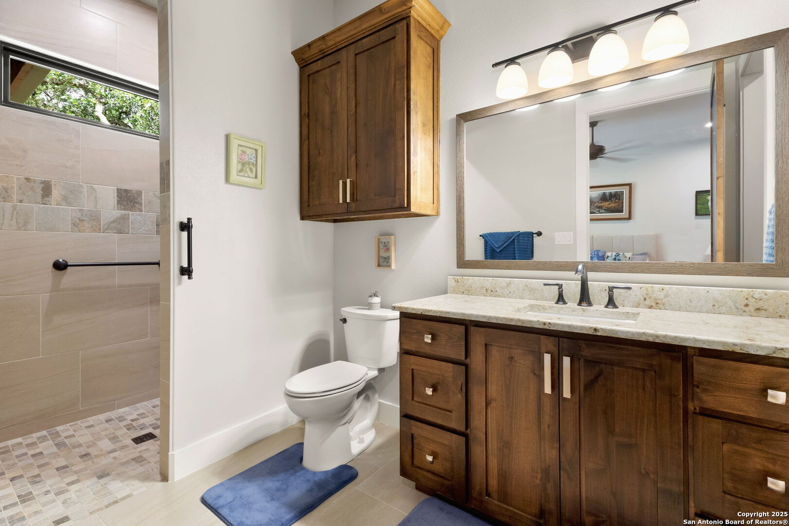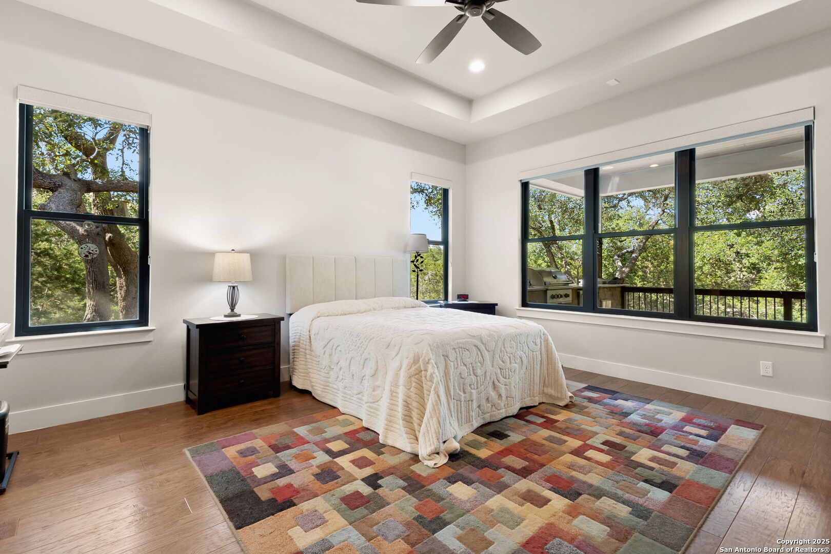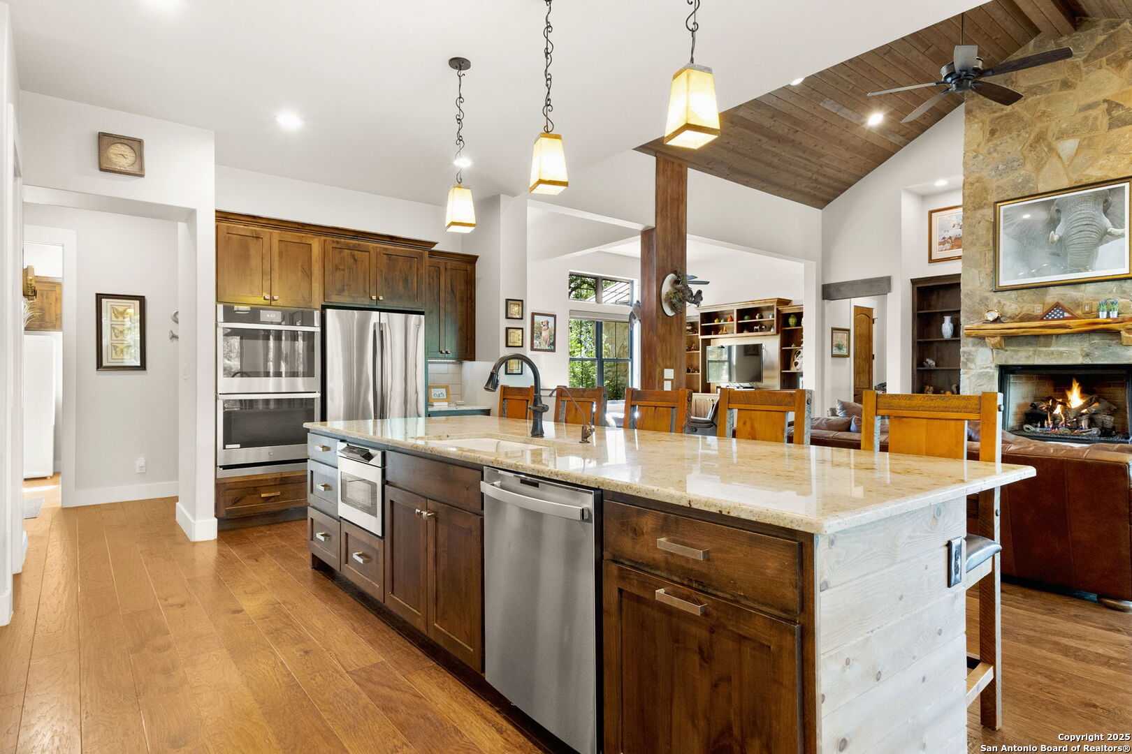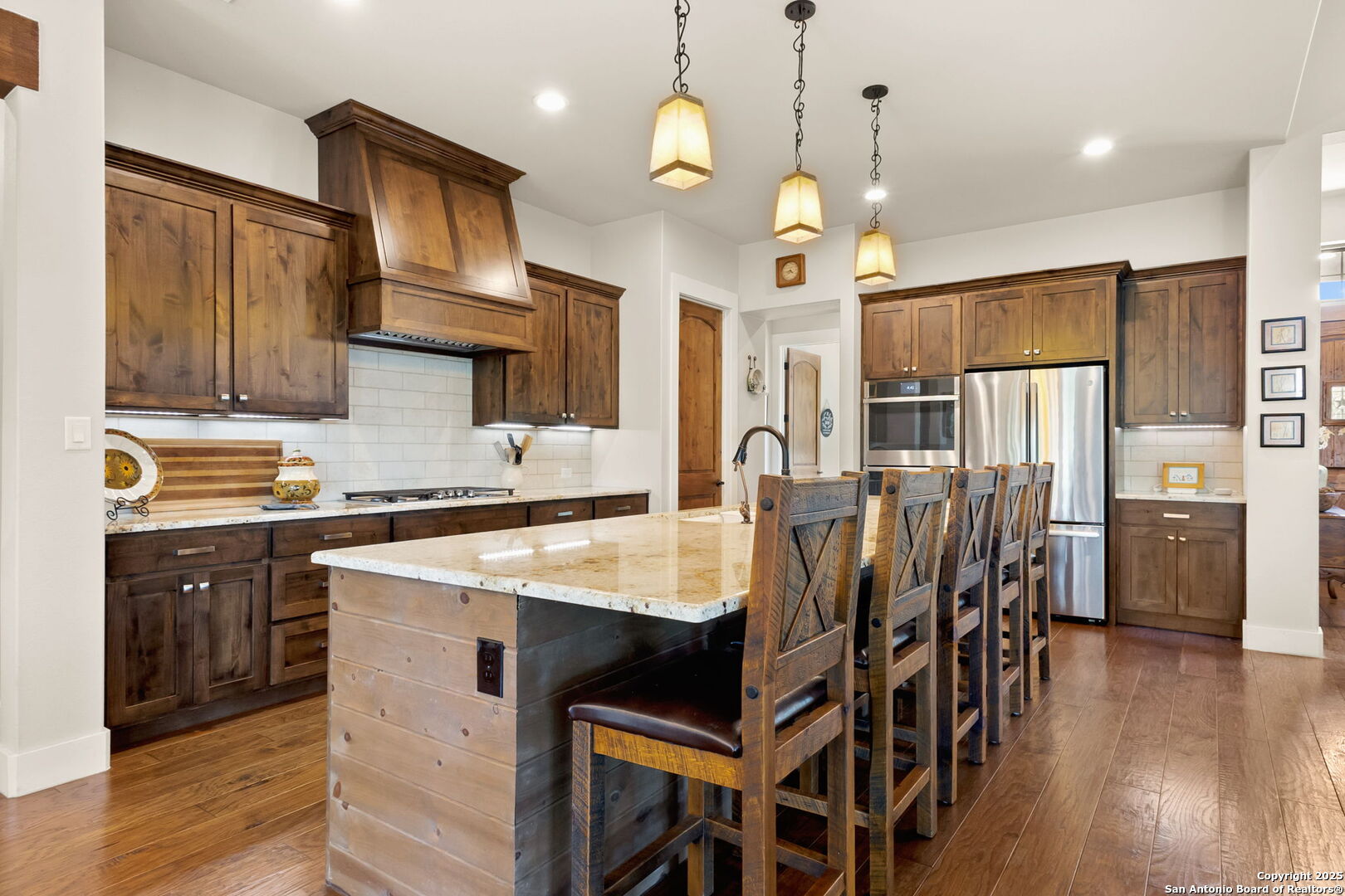 Poised on a breathtaking 2.28-acre estate rich with towering oaks and unmatched serenity, this luxury lodge-style residence is a rare opportunity in the coveted, resort-inspired community of Vintage Oaks. Designed and custom built by renowned luxury builder G. Morris, every detail of this home exudes timeless craftsmanship, natural beauty, and refined Hill Country elegance. The main residence spans 2,843 sq ft, with three spacious bedrooms, each offering its own en suite bathroom for ultimate comfort and privacy. Rich wood flooring flows throughout the home, complemented by solid wood doors, creating a warm, sophisticated ambiance. The heart of the home showcases lodge-inspired architecture with natural textures, expansive windows framing the wooded landscape, and seamless indoor-outdoor living. A stylish powder bath and an oversized 3-car garage complete the main home. Adding even more versatility and charm, the 600 sq ft guest house offers a private escape with a wood-burning stove, full bath, and walk-in closet-perfect for guests, extended family, or a home office retreat. Surrounded by nature and set far back from the road, this property offers a true sense of escape, where the sounds of the breeze and birdsong take the place of city noise. Yet, you'll still enjoy the world-class amenities of Vintage Oaks, including a resort-style pool complex, fitness center, lazy river, sports courts, miles of hiking trails, and more. 1204 Salt Lick Drive is more than a home-it's a luxurious and secluded sanctuary, where the natural beauty of the Texas Hill Country meets masterful craftsmanship and elevated living.