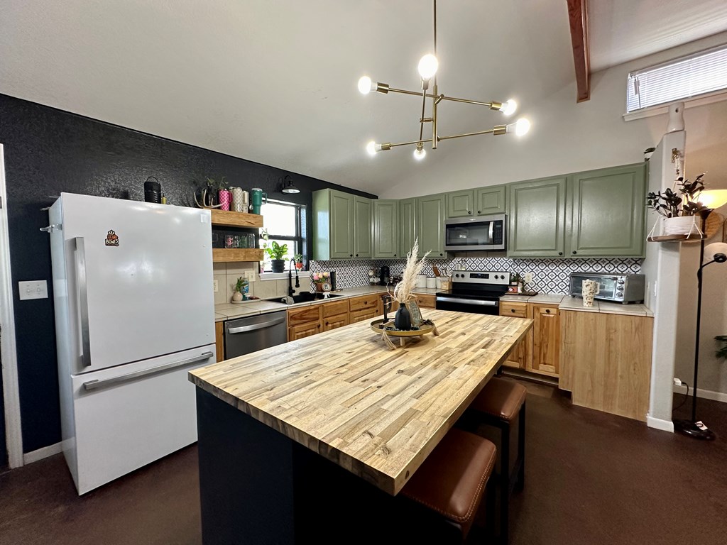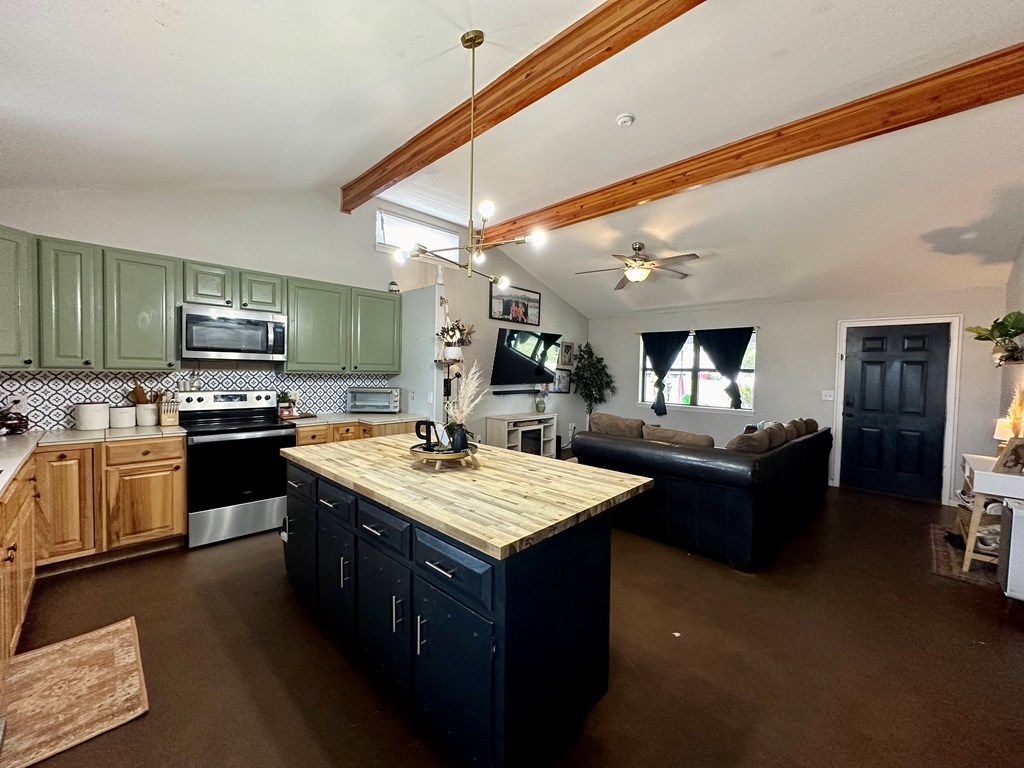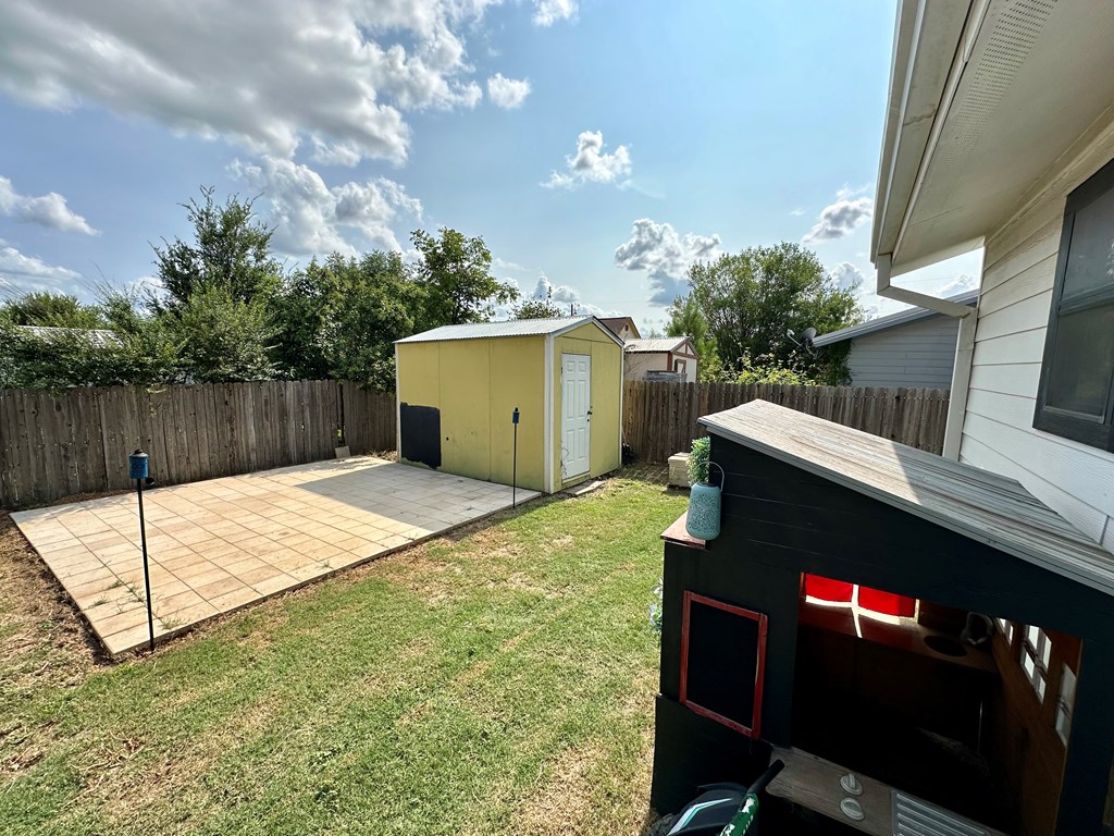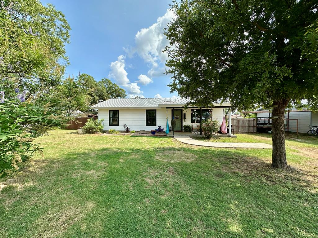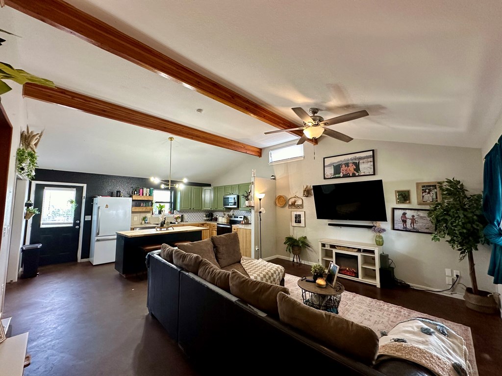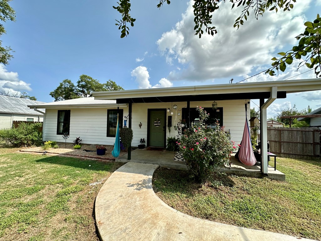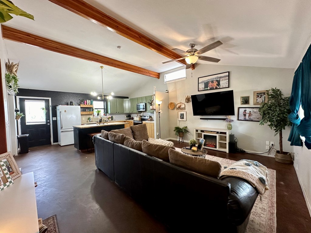 Charming 3-Bedroom Home in Mason, TX - 1209 Loving St. Discover the perfect blend of comfort and style at 1209 Loving St., Mason, TX. This well-cared-for, energy-efficient home spans 1,092 sq ft and offers city amenities with a cozy, small-town feel. Step inside to an inviting open living area with a vaulted ceiling, complete with two exposed beams that add a touch of rustic charm, and a skylight. The living space seamlessly flows into the modern kitchen, making it ideal for entertaining. Stained concrete floors run throughout the home, providing durability and a contemporary look. The primary bedroom features a unique small office space tucked away in the closet, offering a convenient and private workspace. With three bedrooms and two bathrooms, this home is perfect for families or those needing extra space. The home's exterior is equally impressive with a metal roof, a small privacy-fenced yard, and a stone patio perfect for outdoor gatherings. Additional storage is available in the backyard storage building. The small front porch, adorned with foundation xeriscaping, provides a welcoming entrance and low-maintenance landscaping.