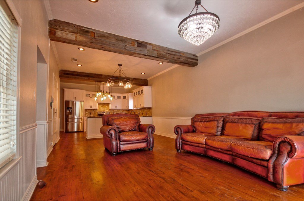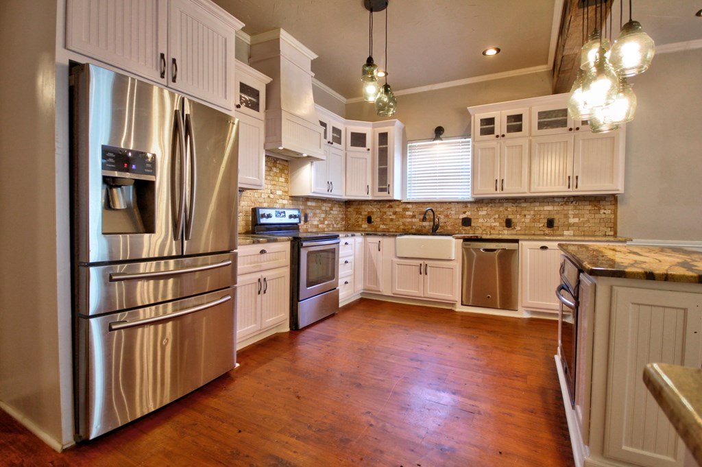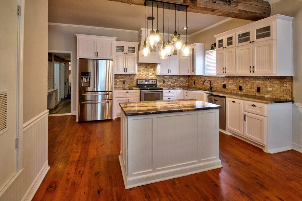 Just a few blocks from Llano's town square, Main Street, and the Llano River, this 4-bedroom, 3-bath home offers the perfect balance of history, character, and modern updates. A stunning custom kitchen features granite countertops, travertine backsplash, stainless steel appliances, and a wine bar with fridge. Original hardwood floors, high ceilings and impressive wooden beams create a warm, inviting atmosphere throughout. Set on nearly half an acre, the expansive backyard is shaded by mature trees and fully privacy-fenced, with a large site-built two-room workshop, newer storage building, and a separate pet enclosure. Close to shopping, Llano Memorial Hospital, and Llano schools. With a little love and effort this property will really be a fantastic place to call home. Property is serviced by city utilities and a private water well. Approx. 90 minutes to Austin or San Antonio—this is small-town Texas living at its best.